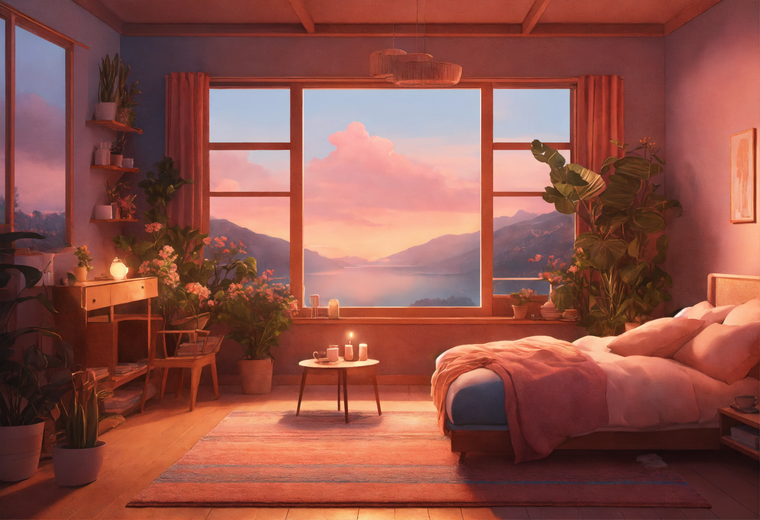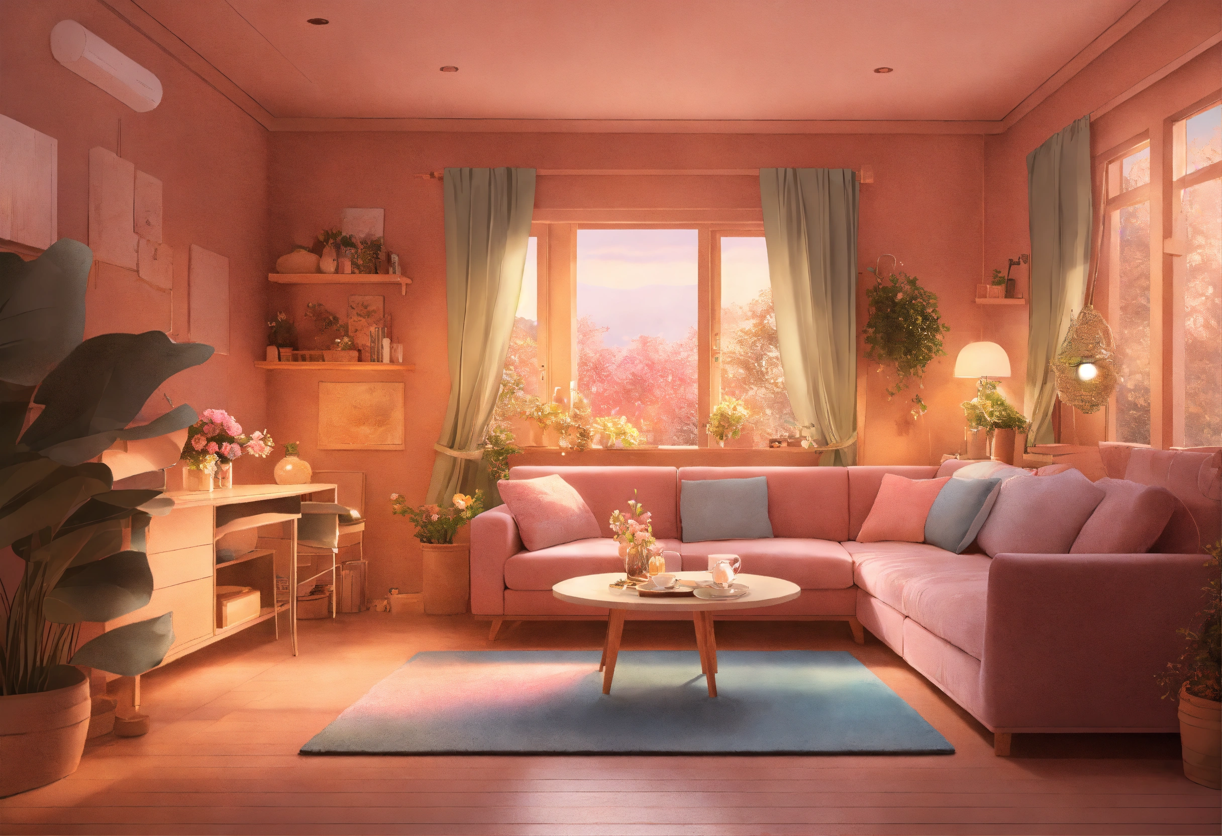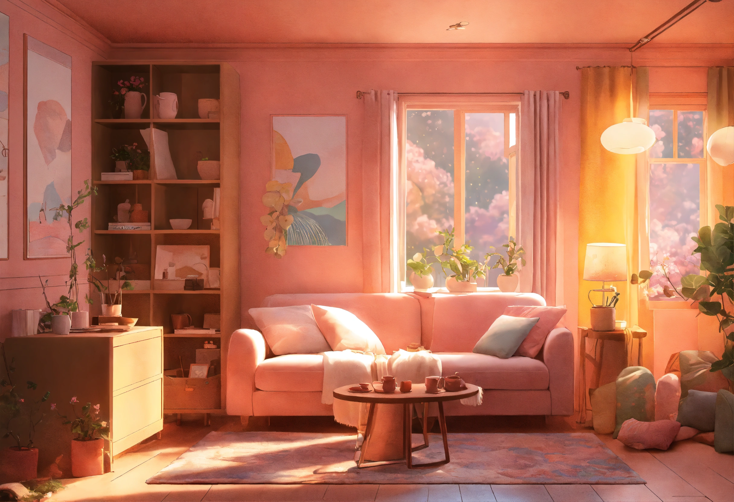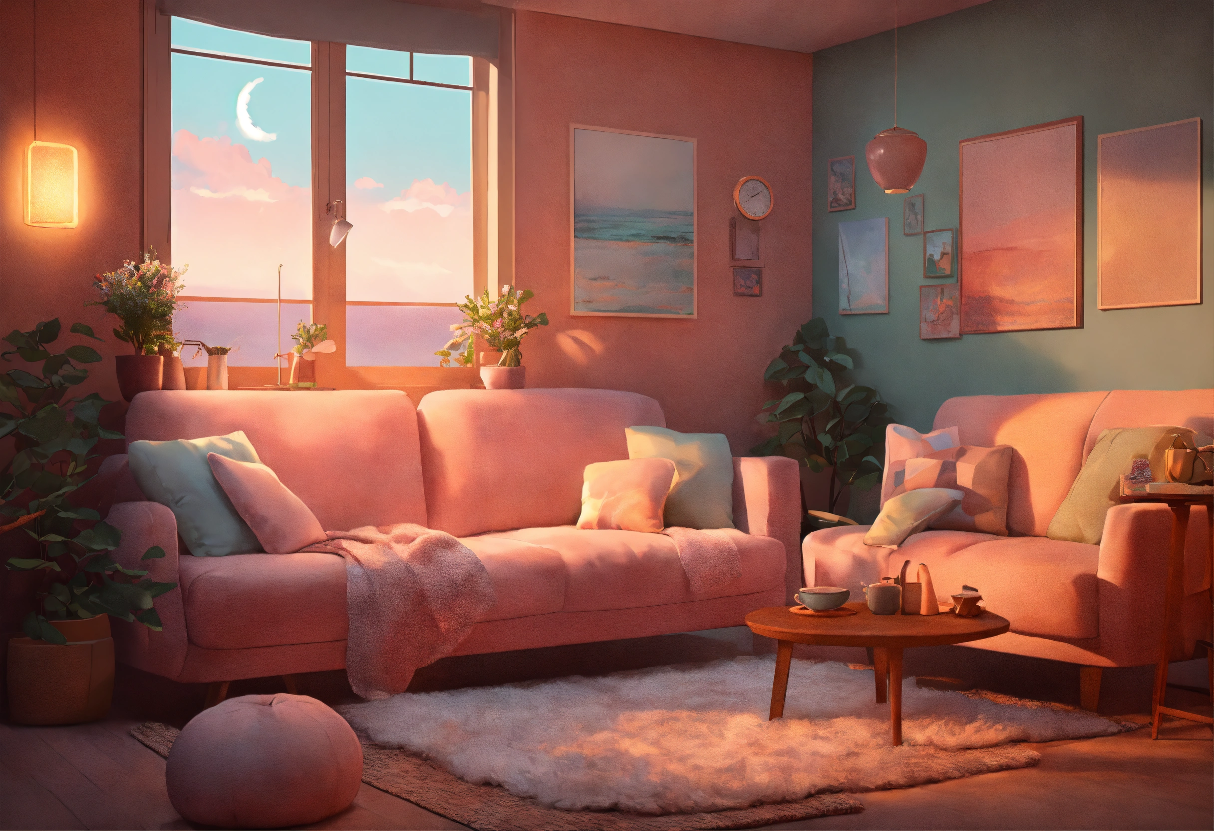 "generate an image with a pastel color palette that radiates a sense of warmth and coziness, perfect for a lofi music video. picture a scene where soft, inviting pastel colors dominate the ambiance. you can include elements like comfy cushions, warm blankets, and perhaps a steaming cup of tea or coffee. the lighting should be gentle and warm, creating a soothing atmosphere. this image should evoke a feeling of relaxation and tranquility, inviting viewers to immerse themselves in the comforting world of lofi music. capture the essence of a cozy retreat and make it visually appealing and inviting."