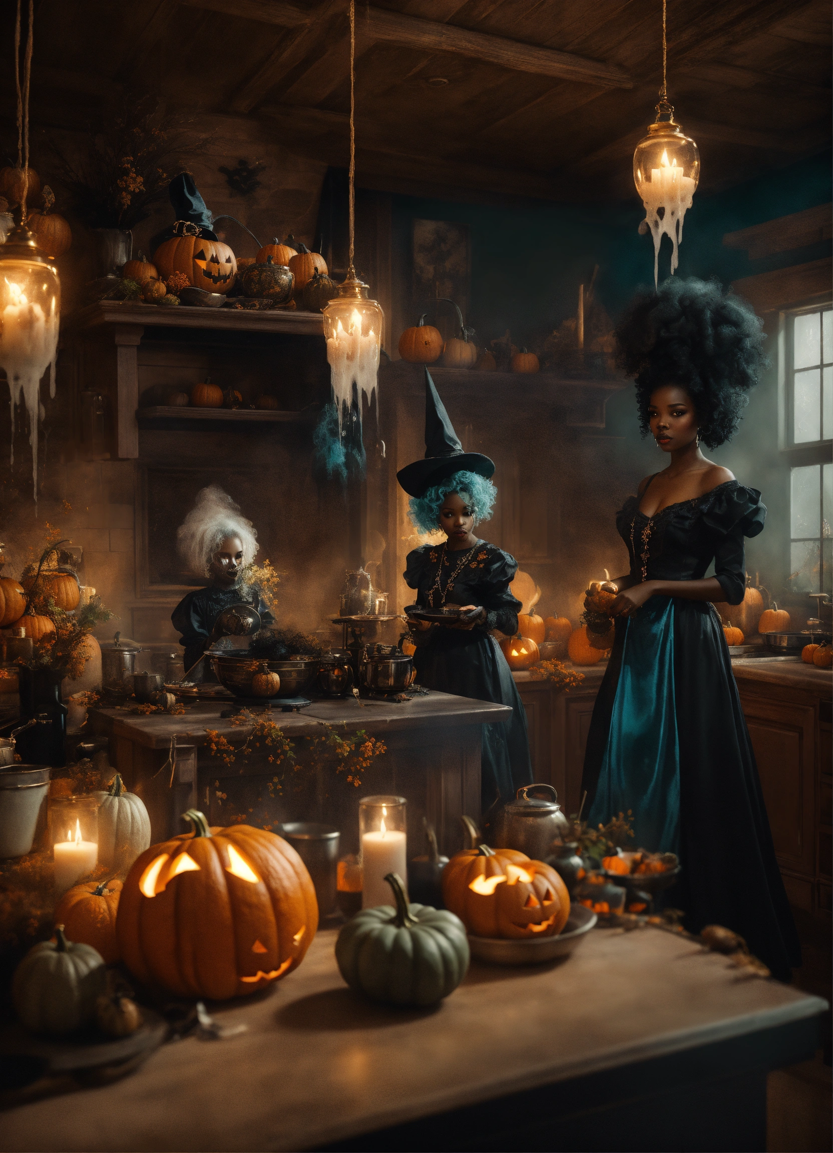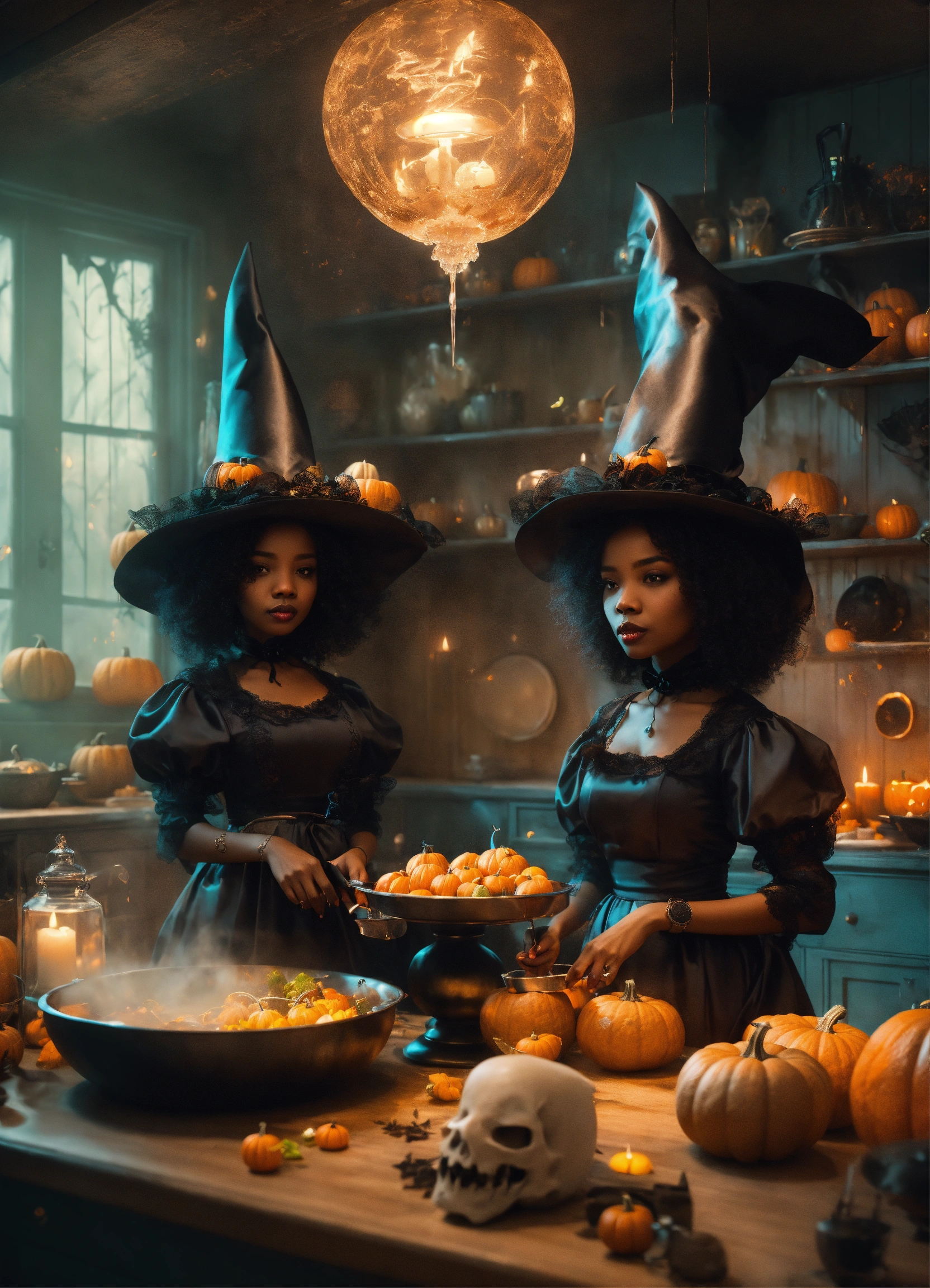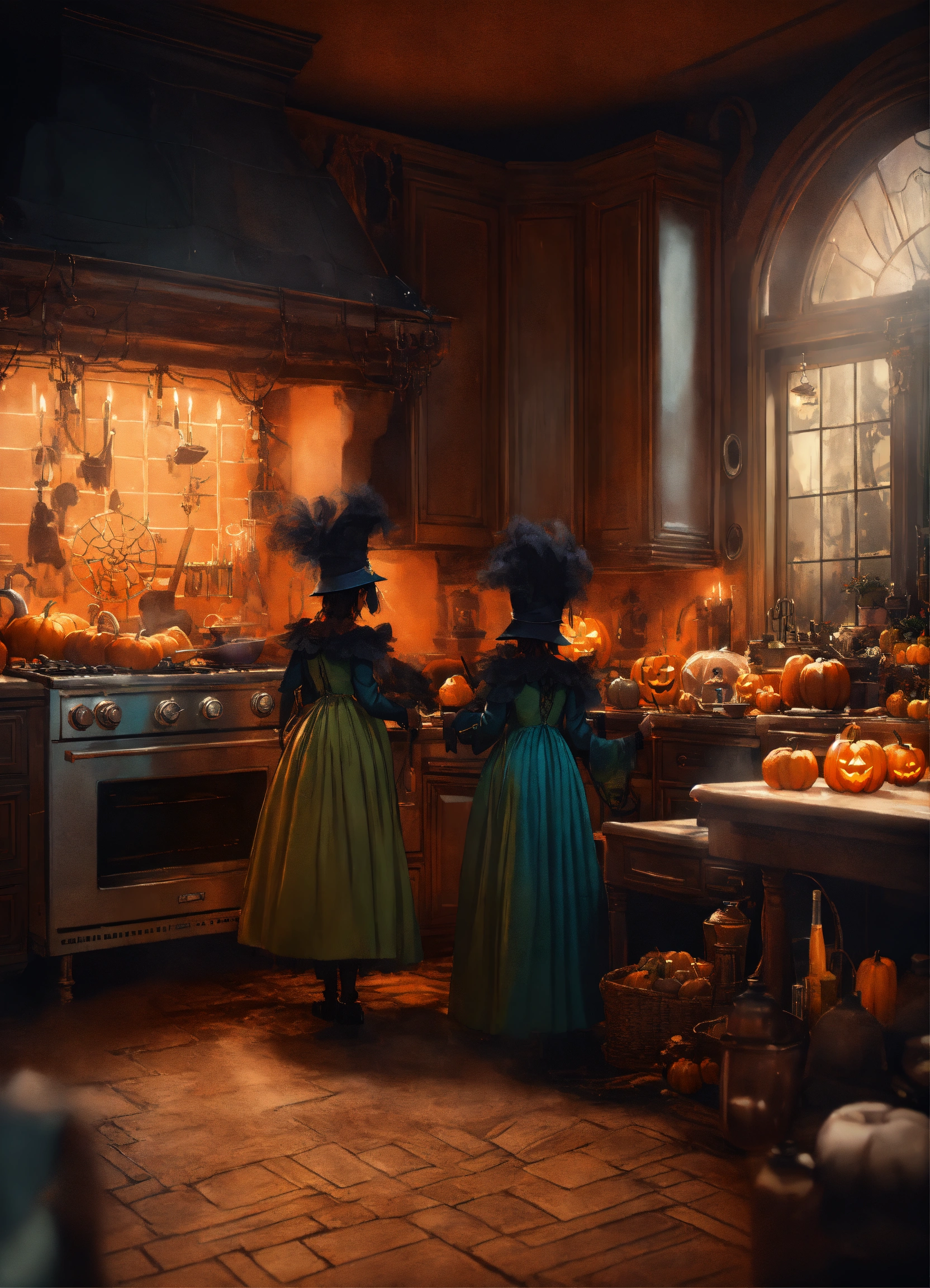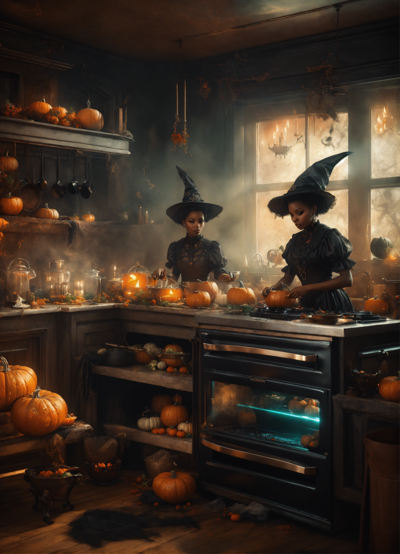 Two beautiful black witchs in spooky kitchen with transparent wispy ghosts preparing for a halloween party appliances. mark ryden style detailed matte painting, deep color, fantastical, intricate detail, splash screen, complementary colors, fantasy concept art, 8k resolution trending on artstation unreal engine 5
