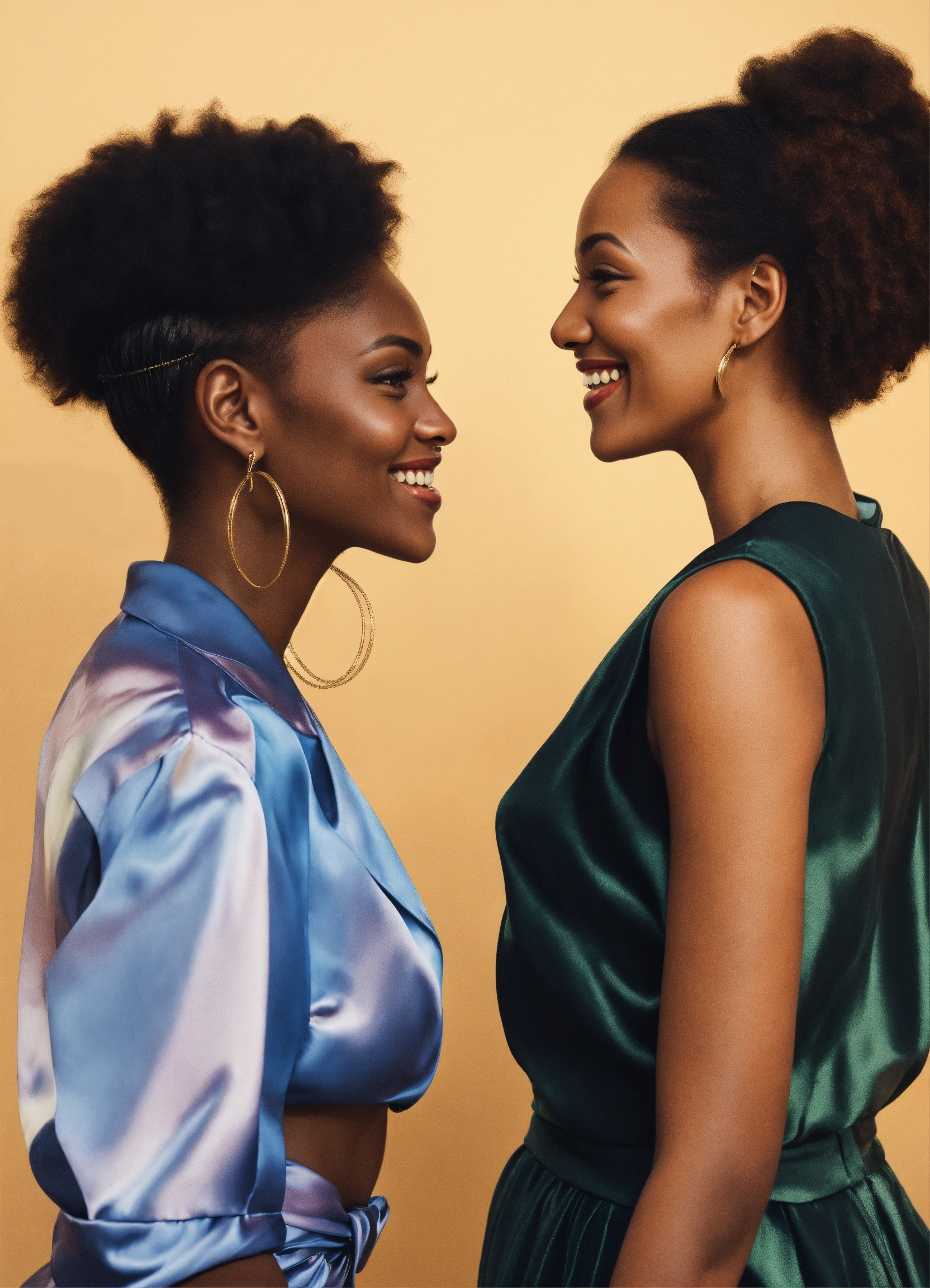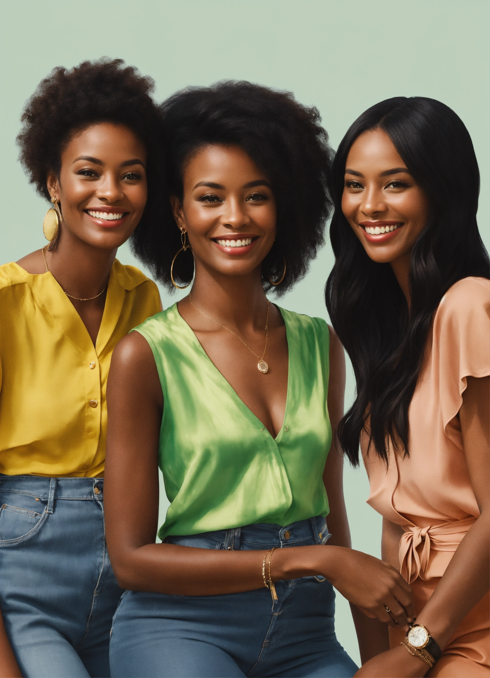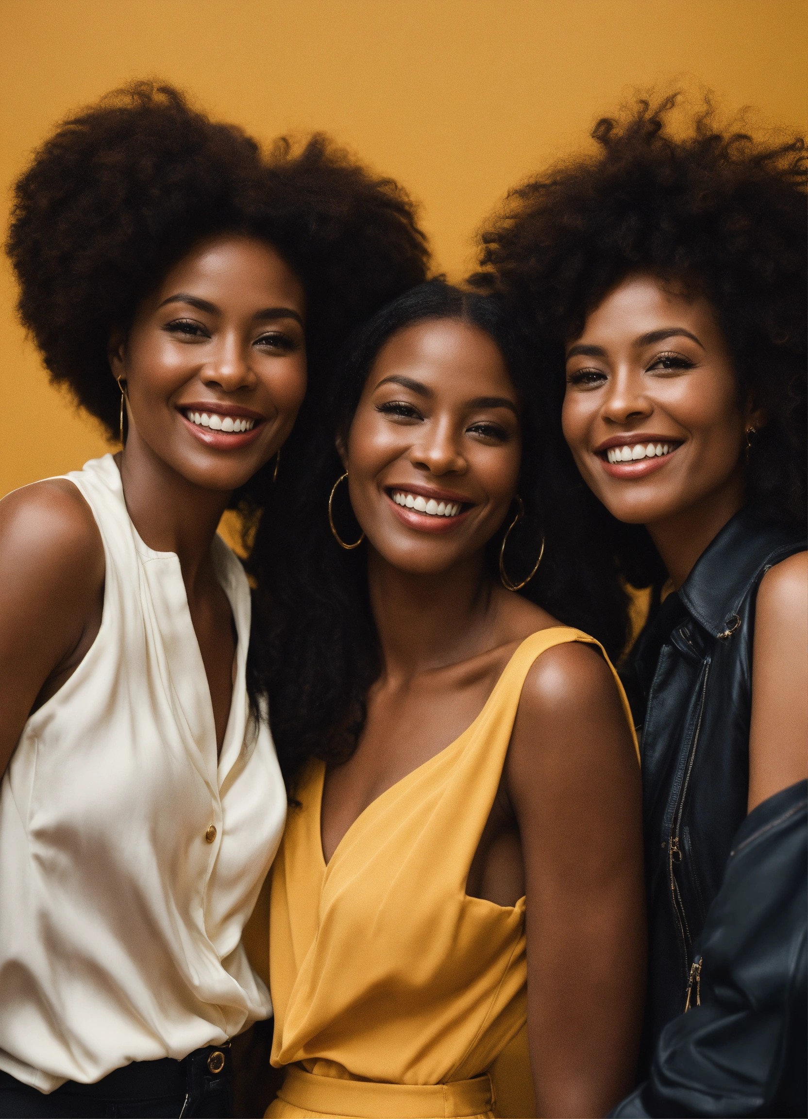 Photorealistic image of three fashionable black, thirty-eight-year-old, women friends, who look very different from one another, one smiling, in conversation