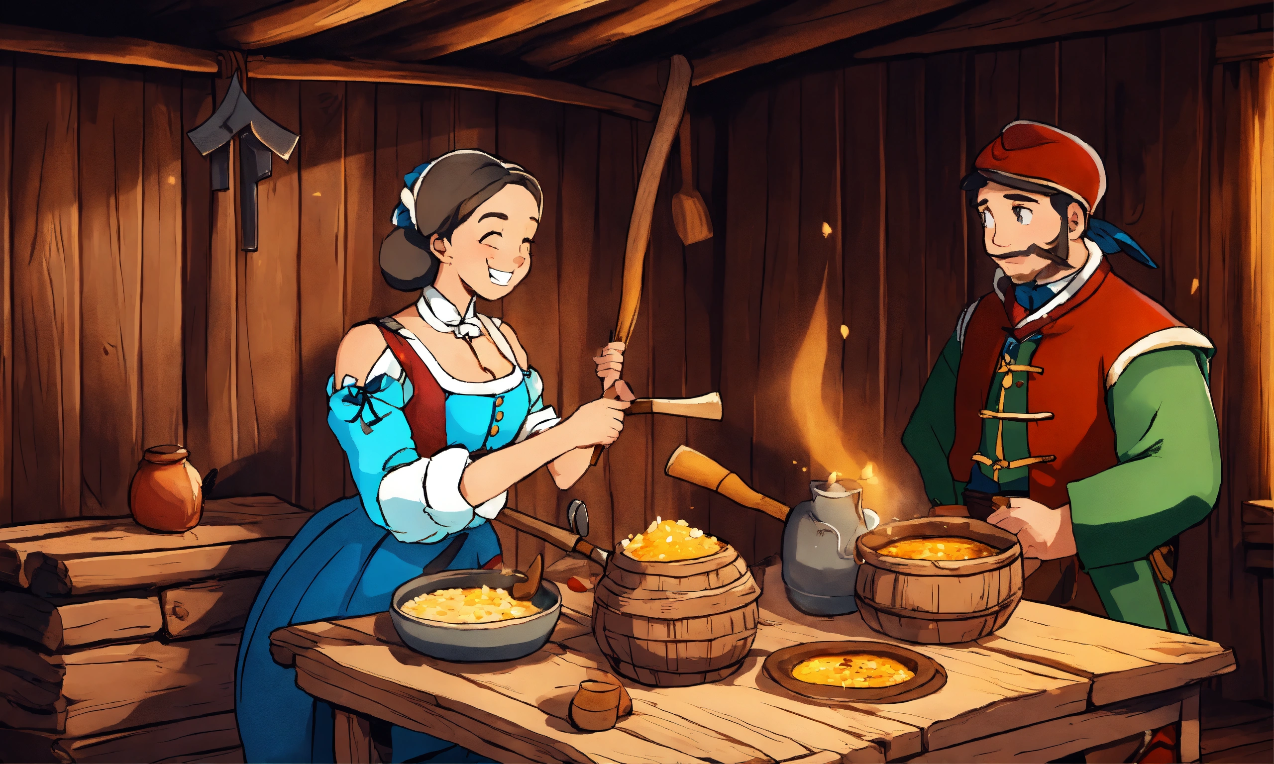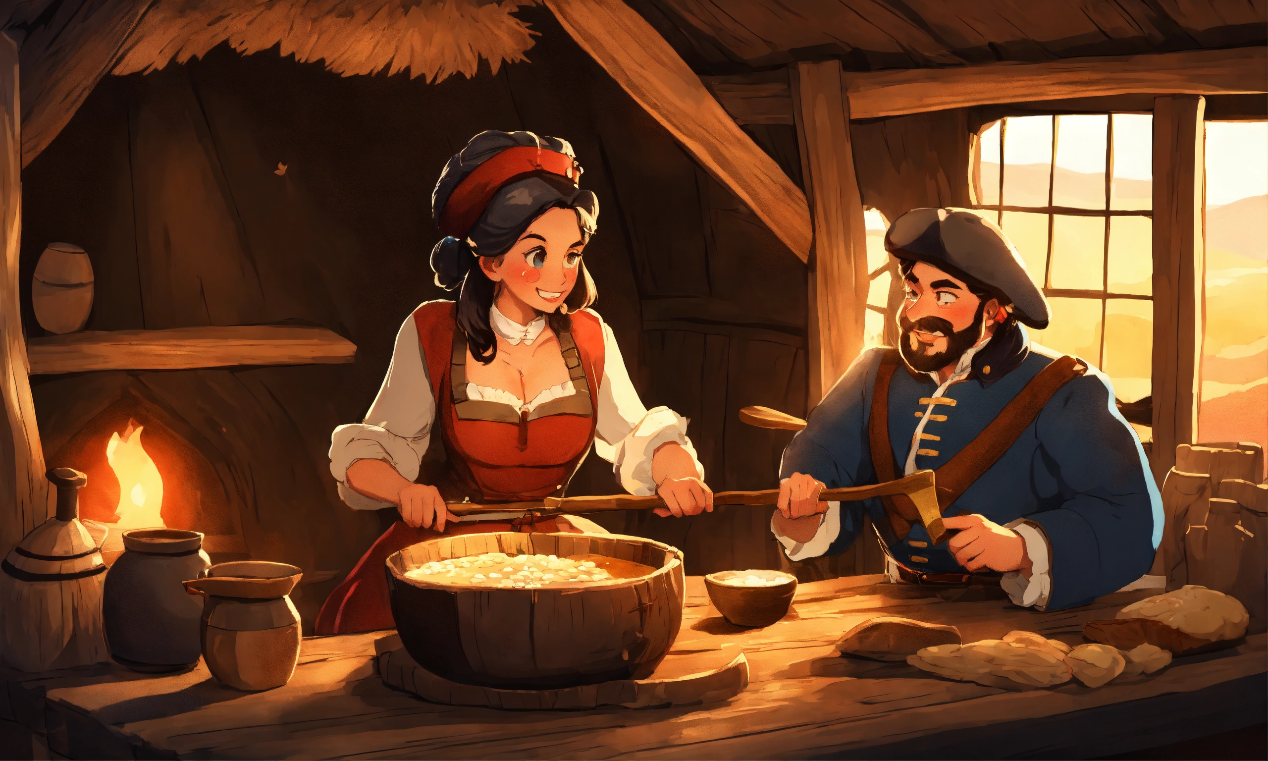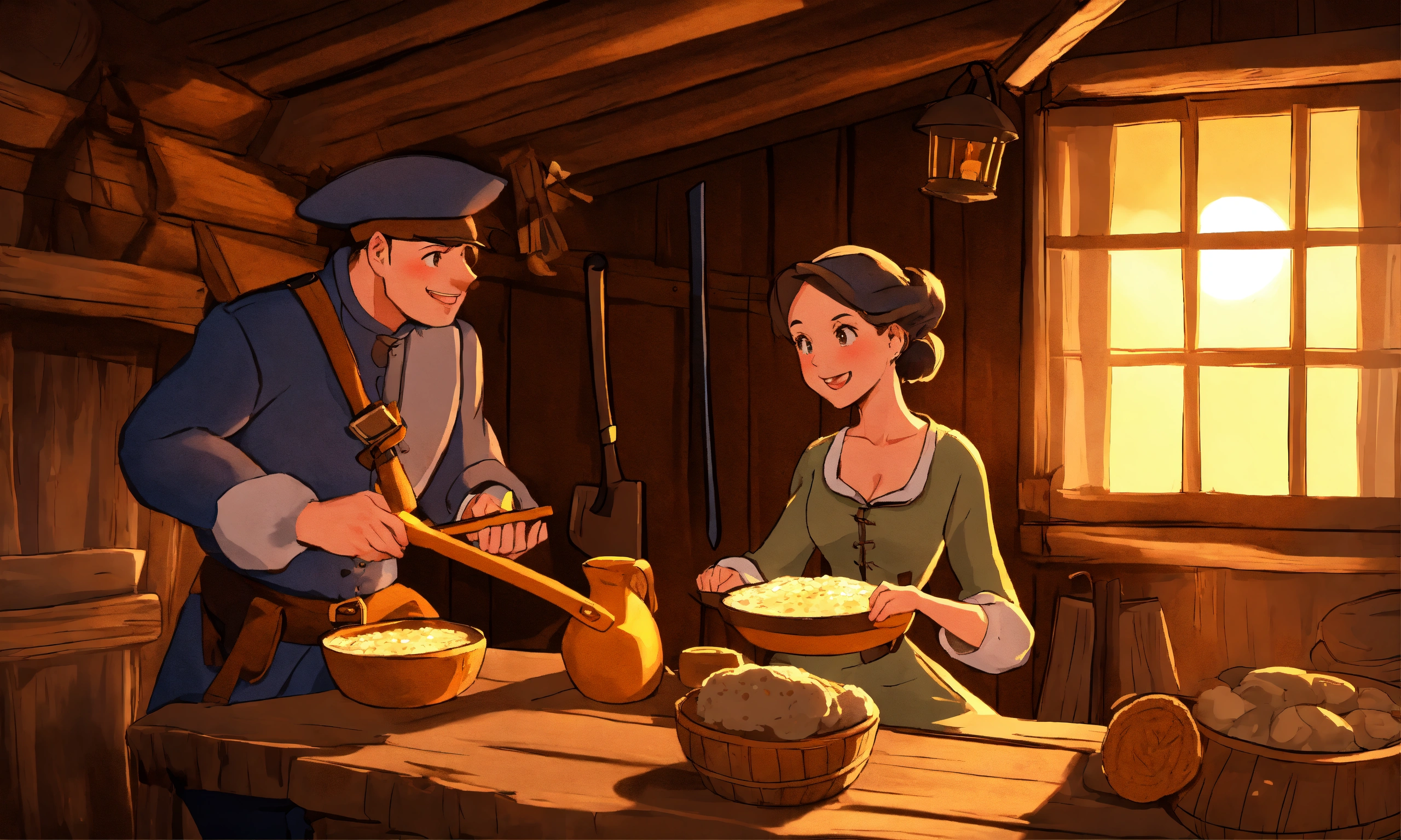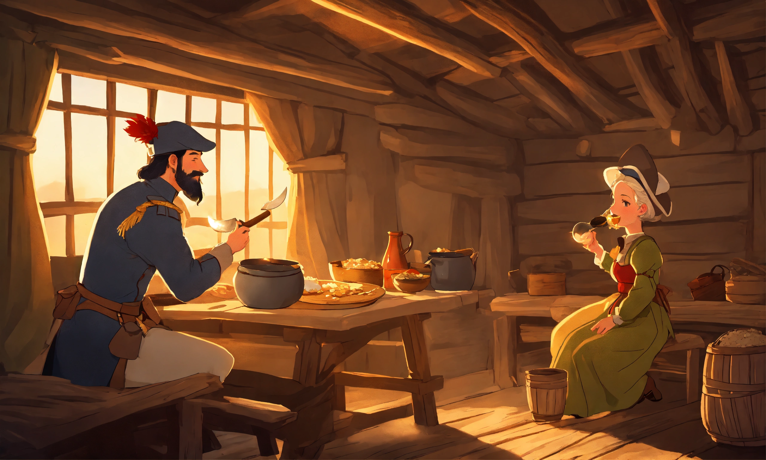 Cartoon style a thin 18th century soldier and a woman eat delicious porridge with an axe at a wooden table in a cozy hut