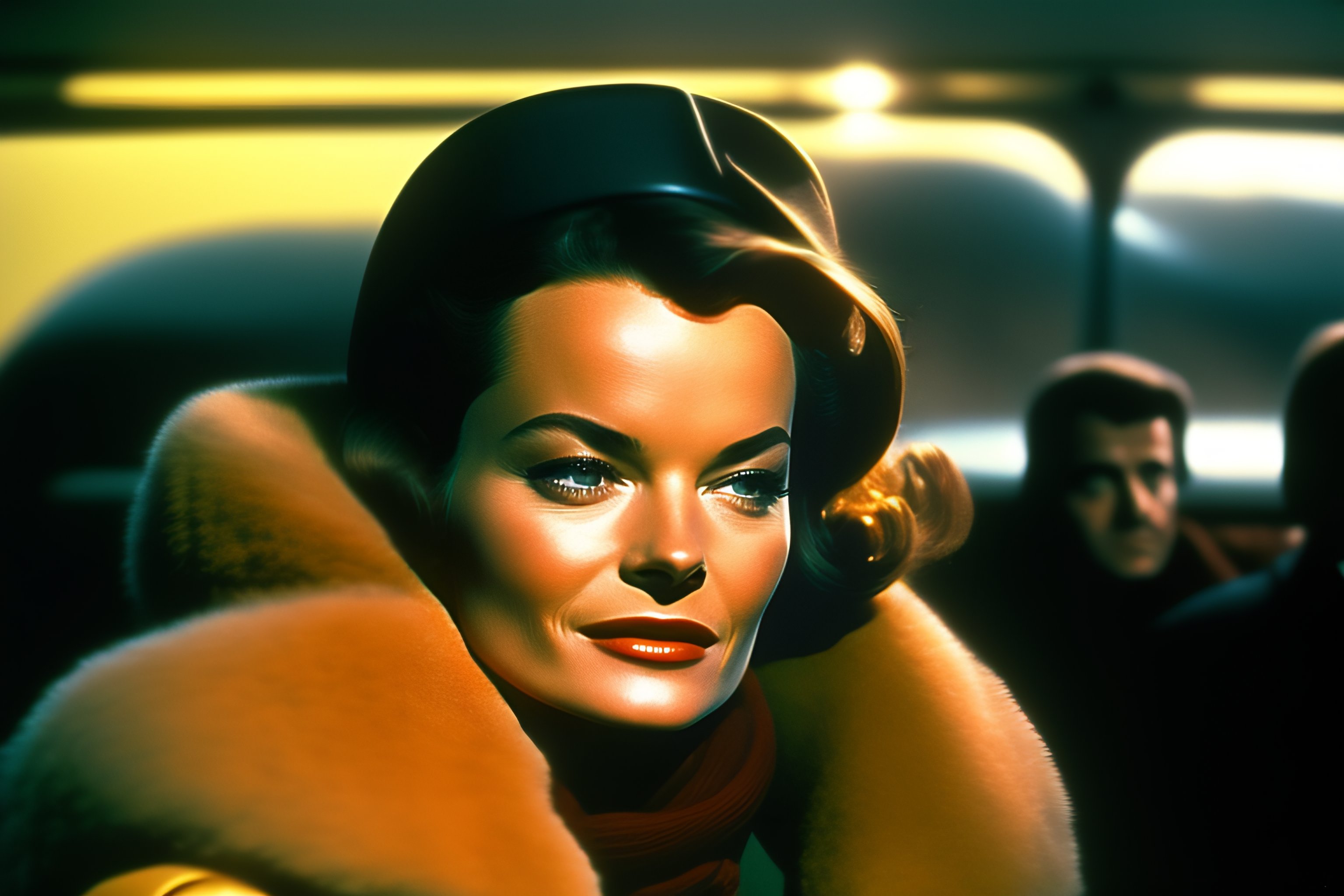 Film still, airplane scene with young romy schneider playing lead in french movie classic „emmanuelle“ from 1974, night, film by just jaeckin