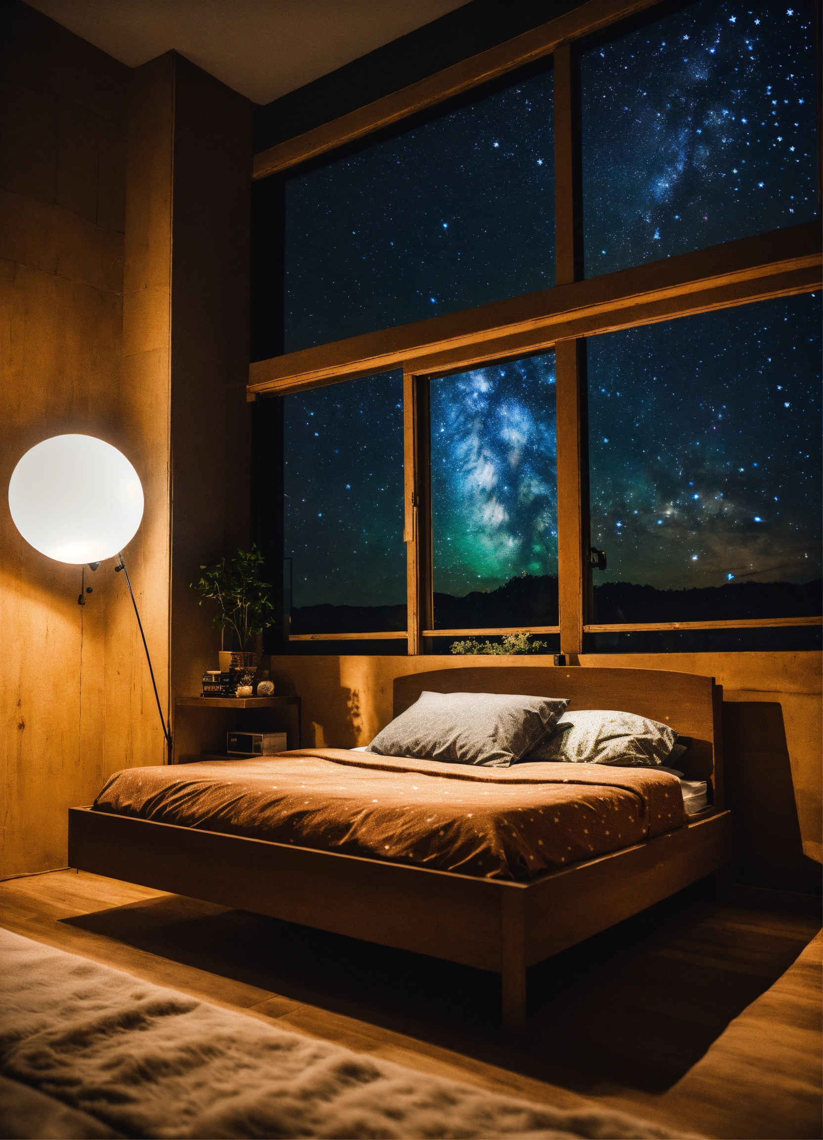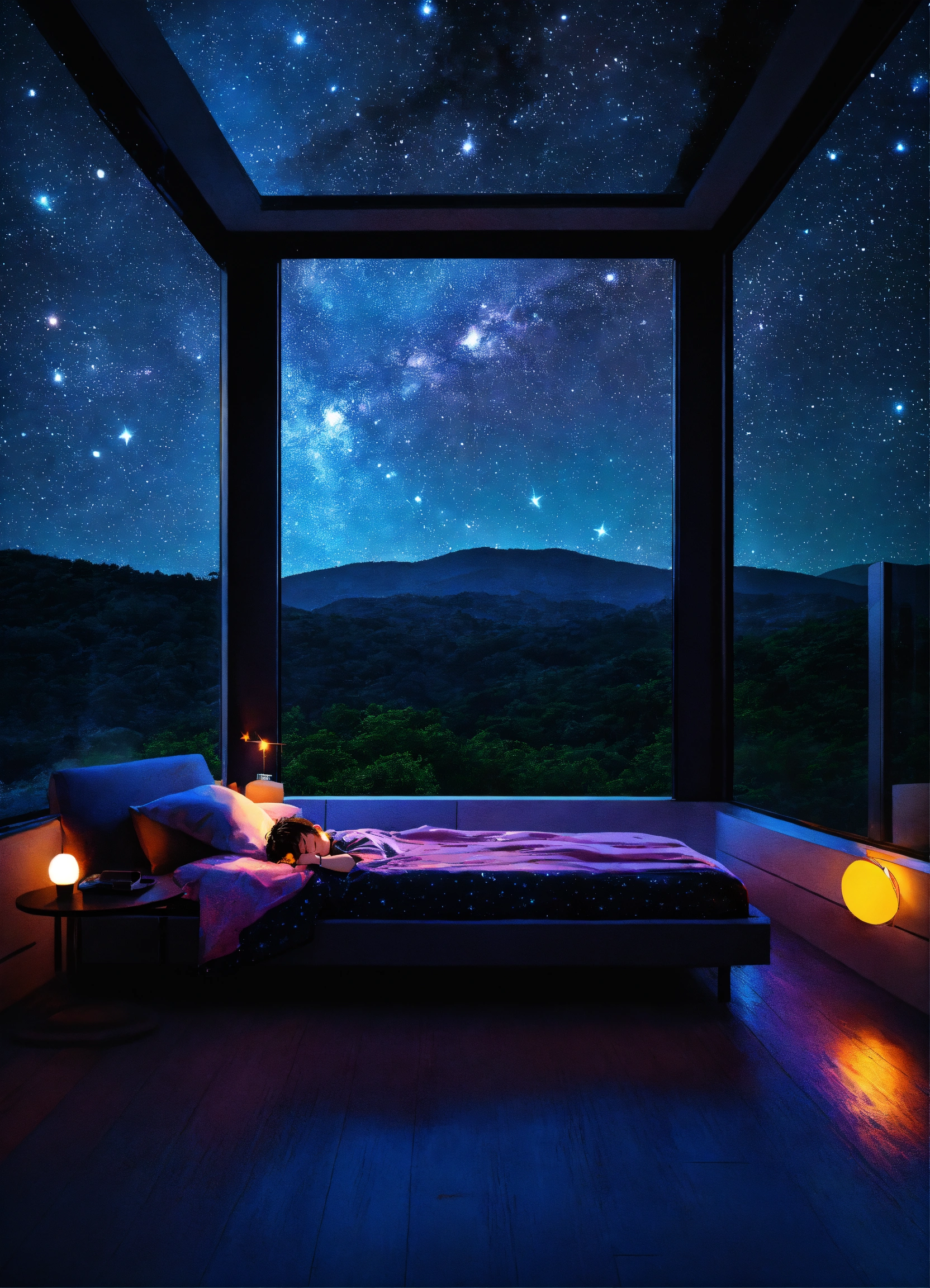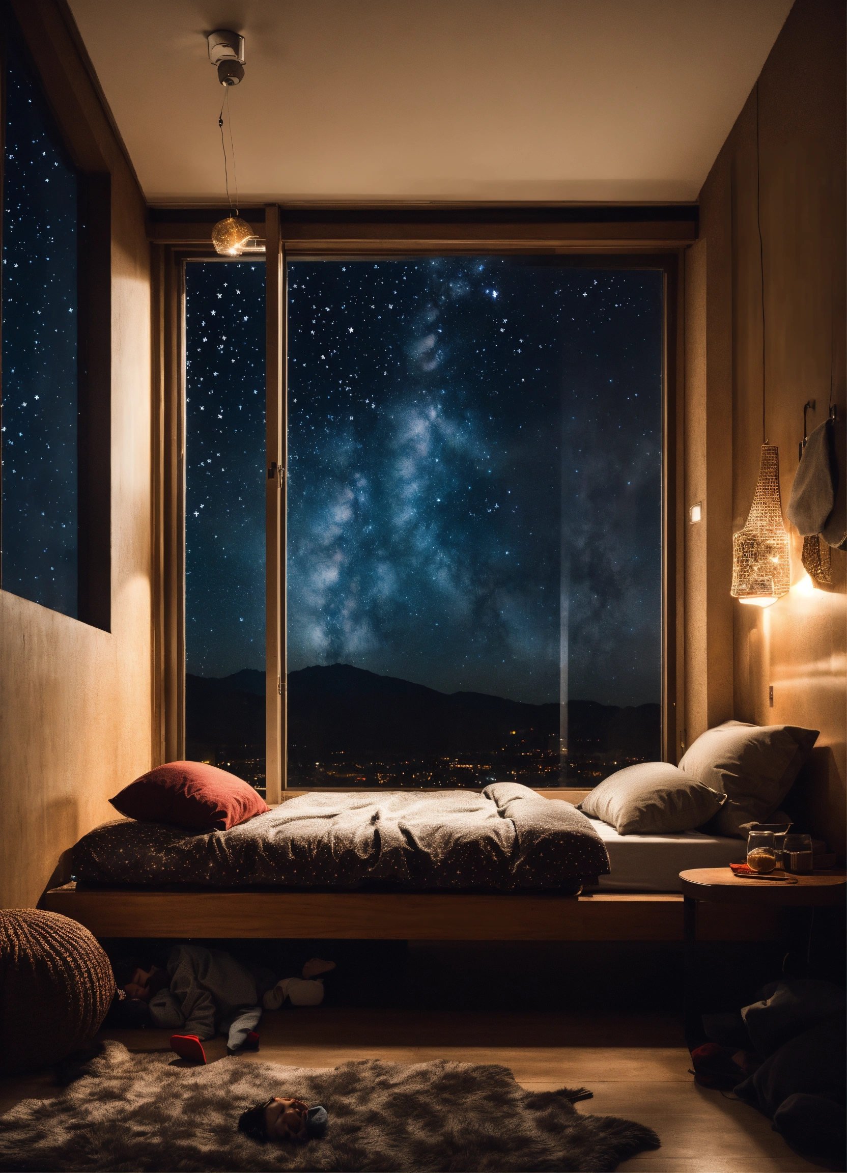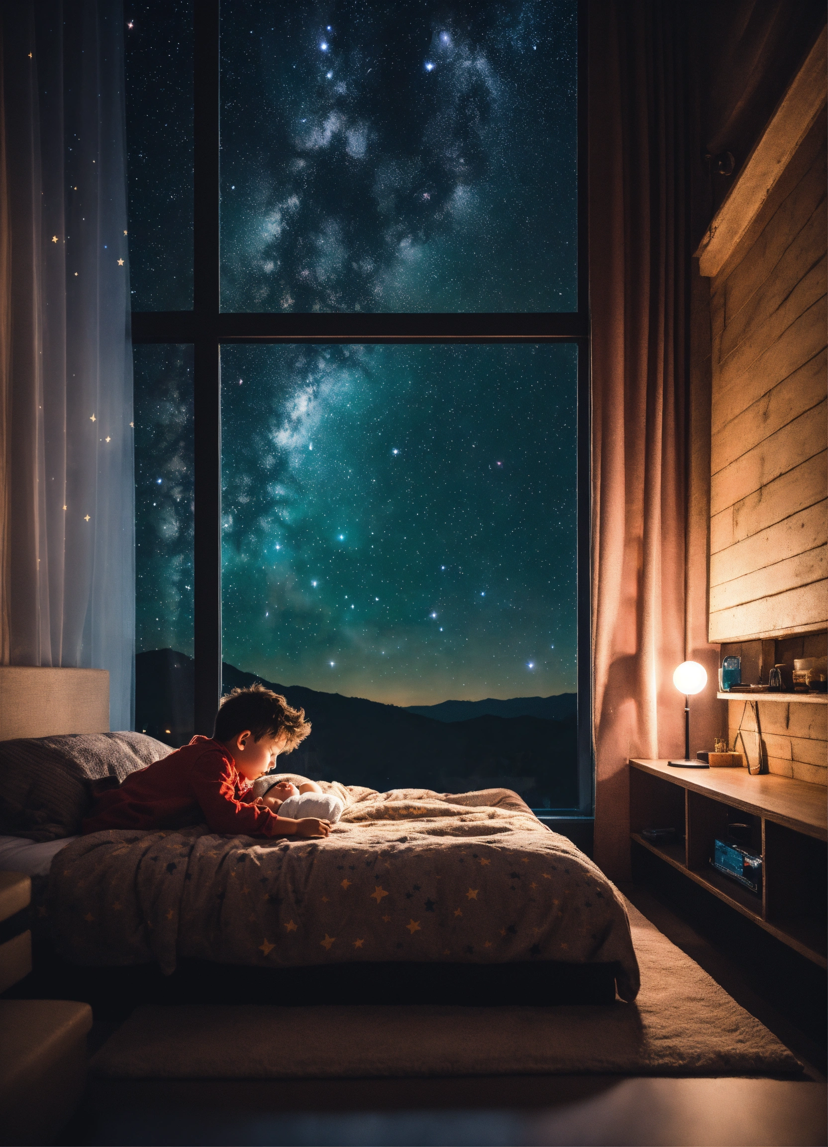 A photography of a kid sleeping in ultra modern room, night sky fill with stars view window, dark ambiance