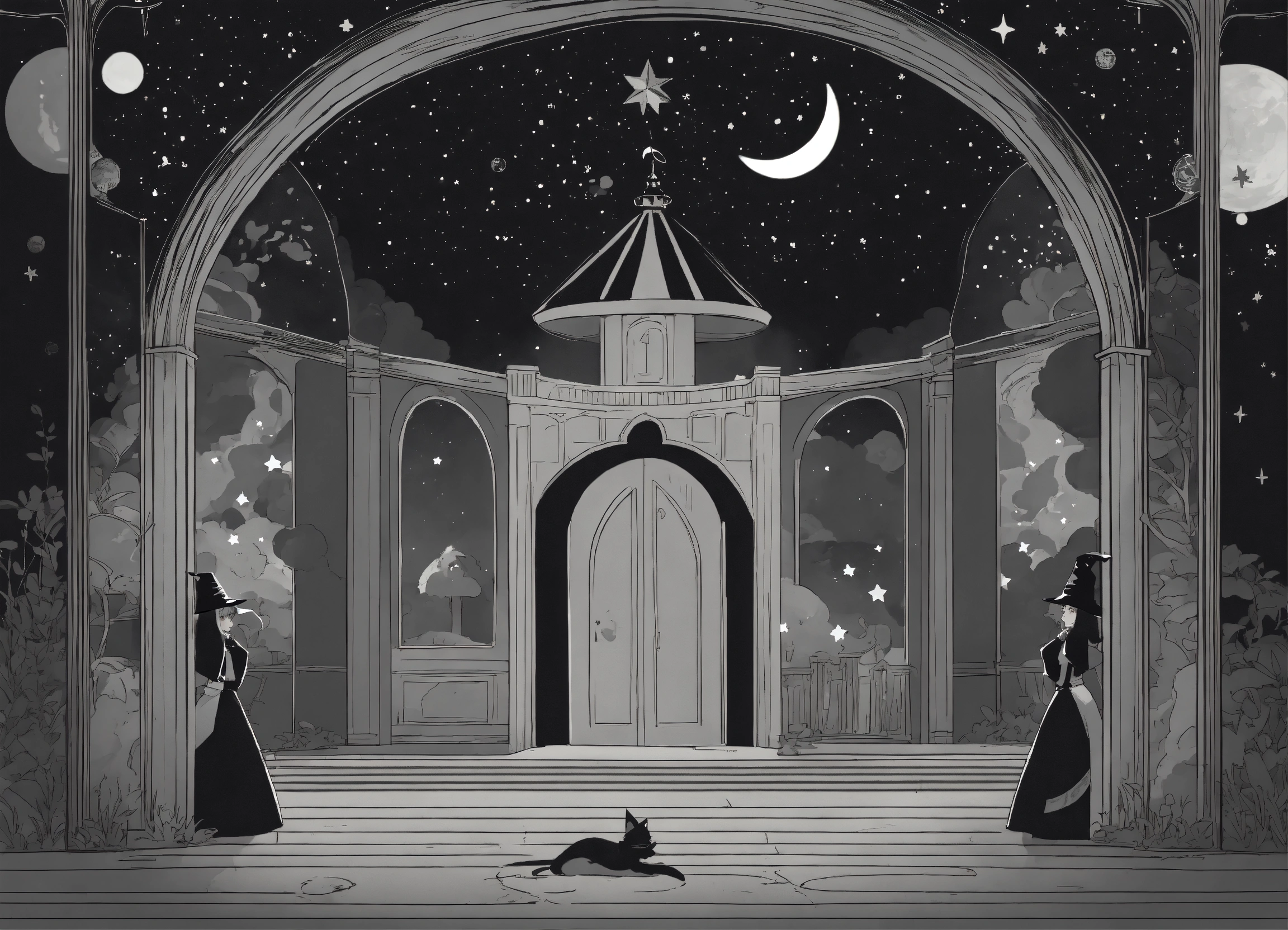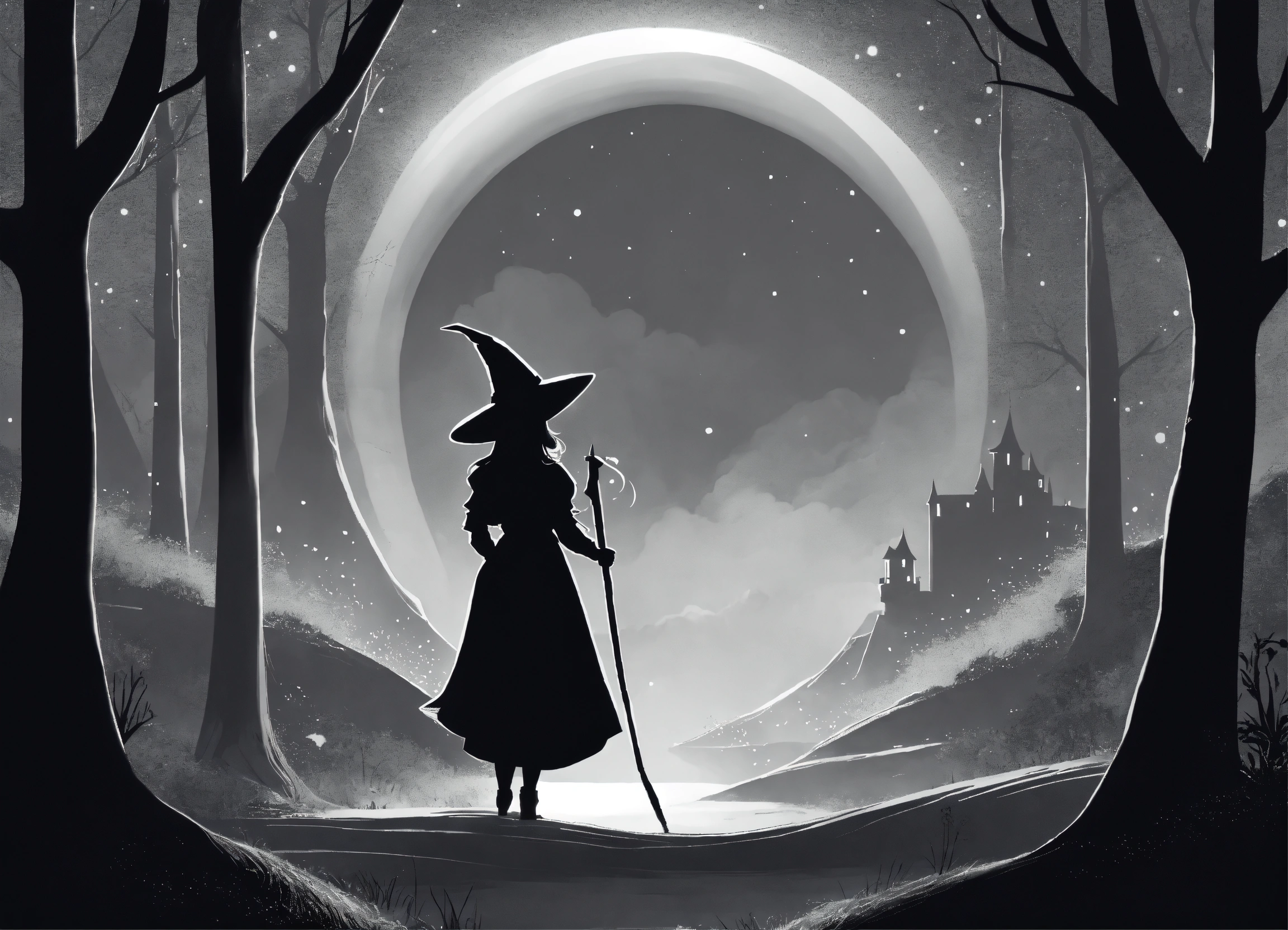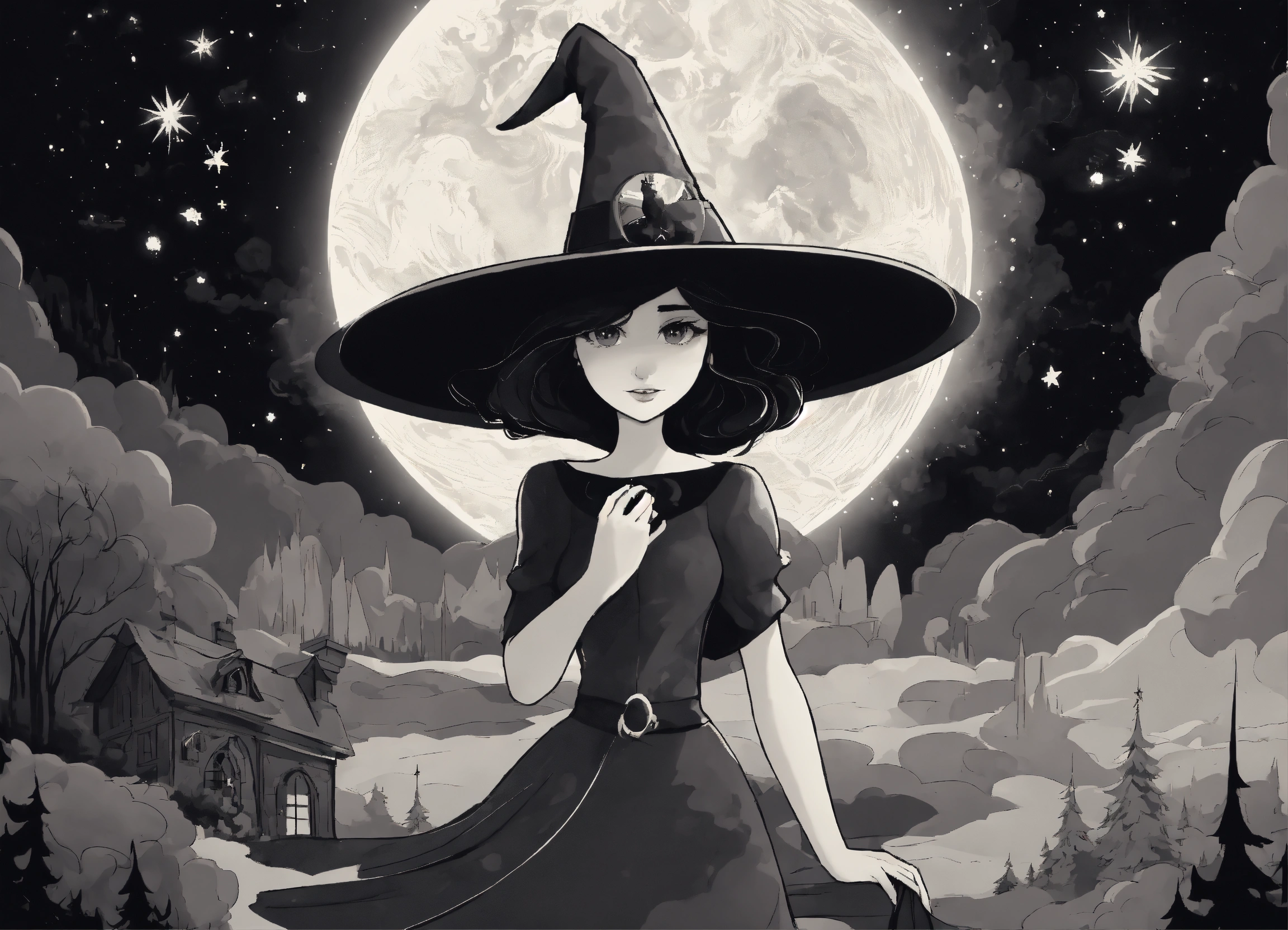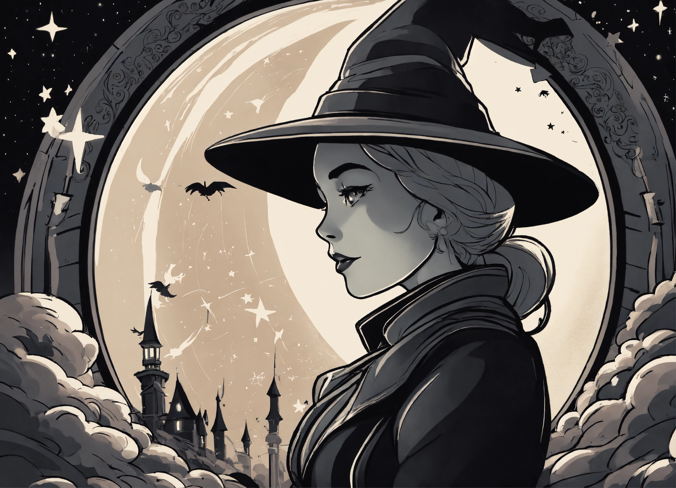 Create a monochrome, cartoon-style poster that encapsulates a retro, silent film era charm, presenting a vast cosmic void filled with shades of grey, black and white nebulous mists and twinkling stars reminiscent of old-school animation. in the midst, a petite witch with a whimsical, oversized pointy hat occupies the center stage, striking a playful pose of bewilderment. surrounding her, a series of stylized portals swirl with various shades of grey, each framing a doorway to a different, magical cartoon dimension, evoking a sense of enchantment and nostalgia
