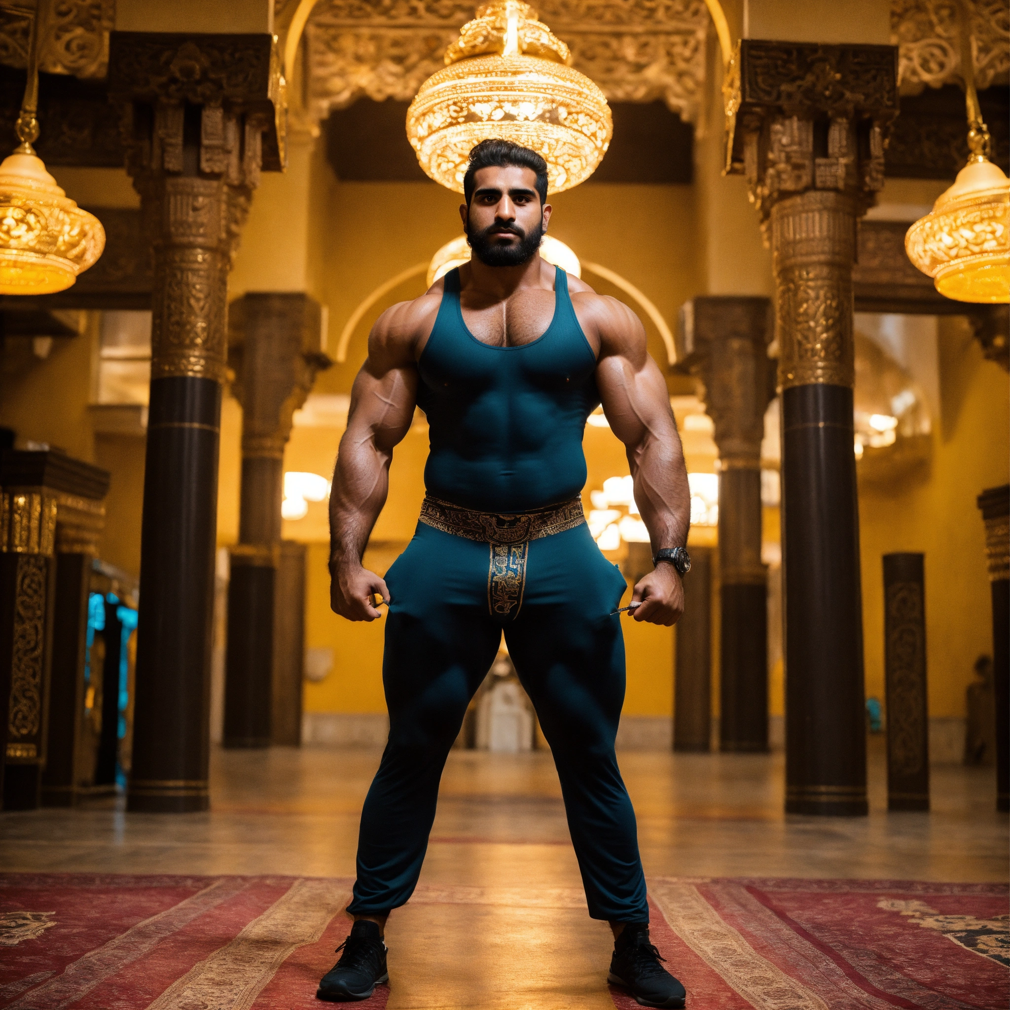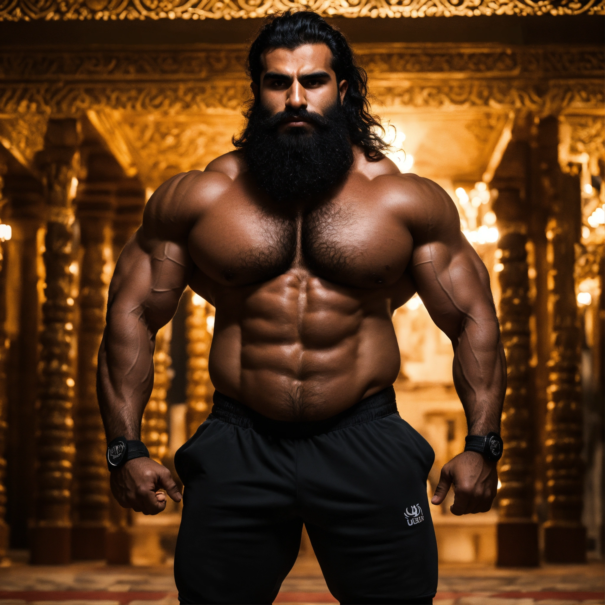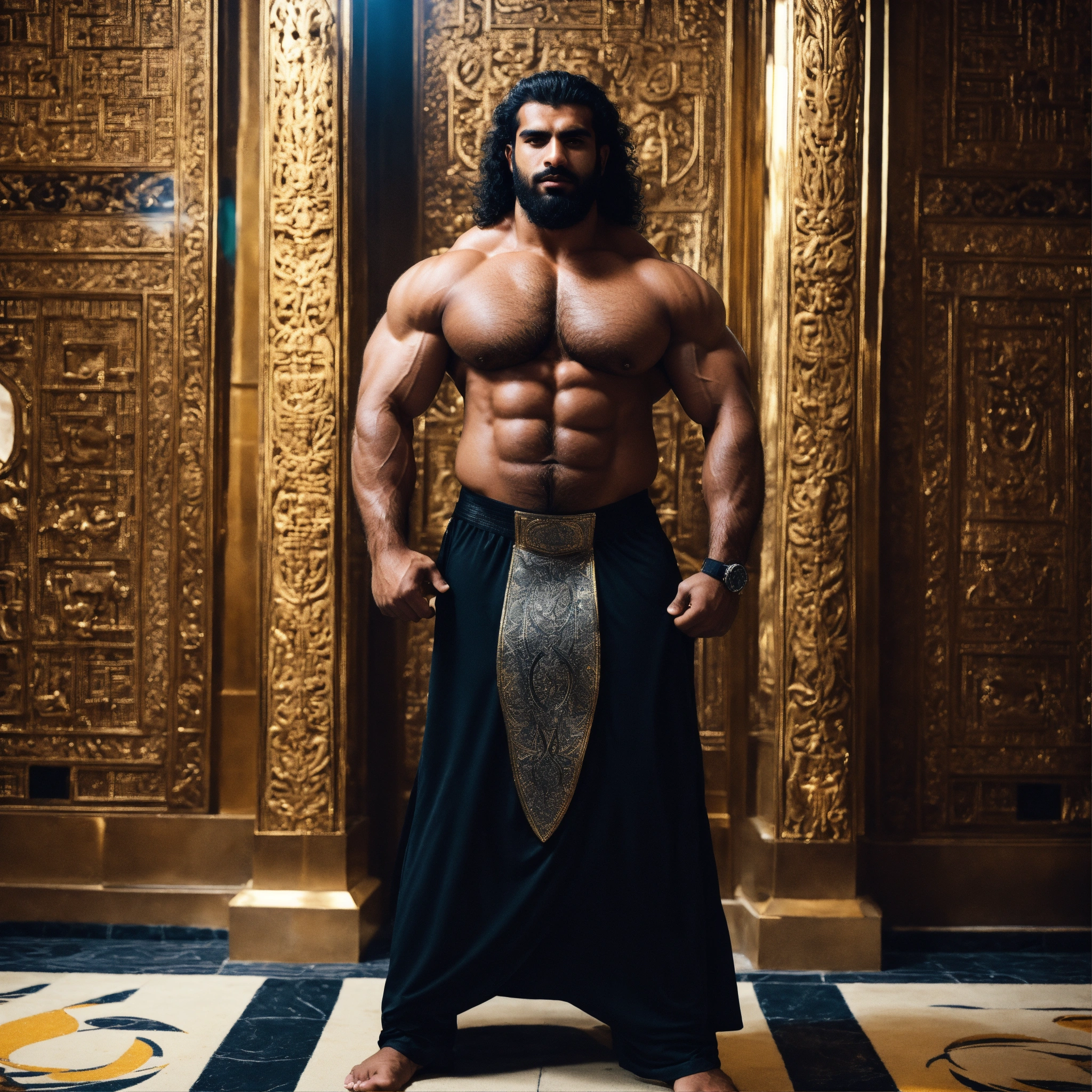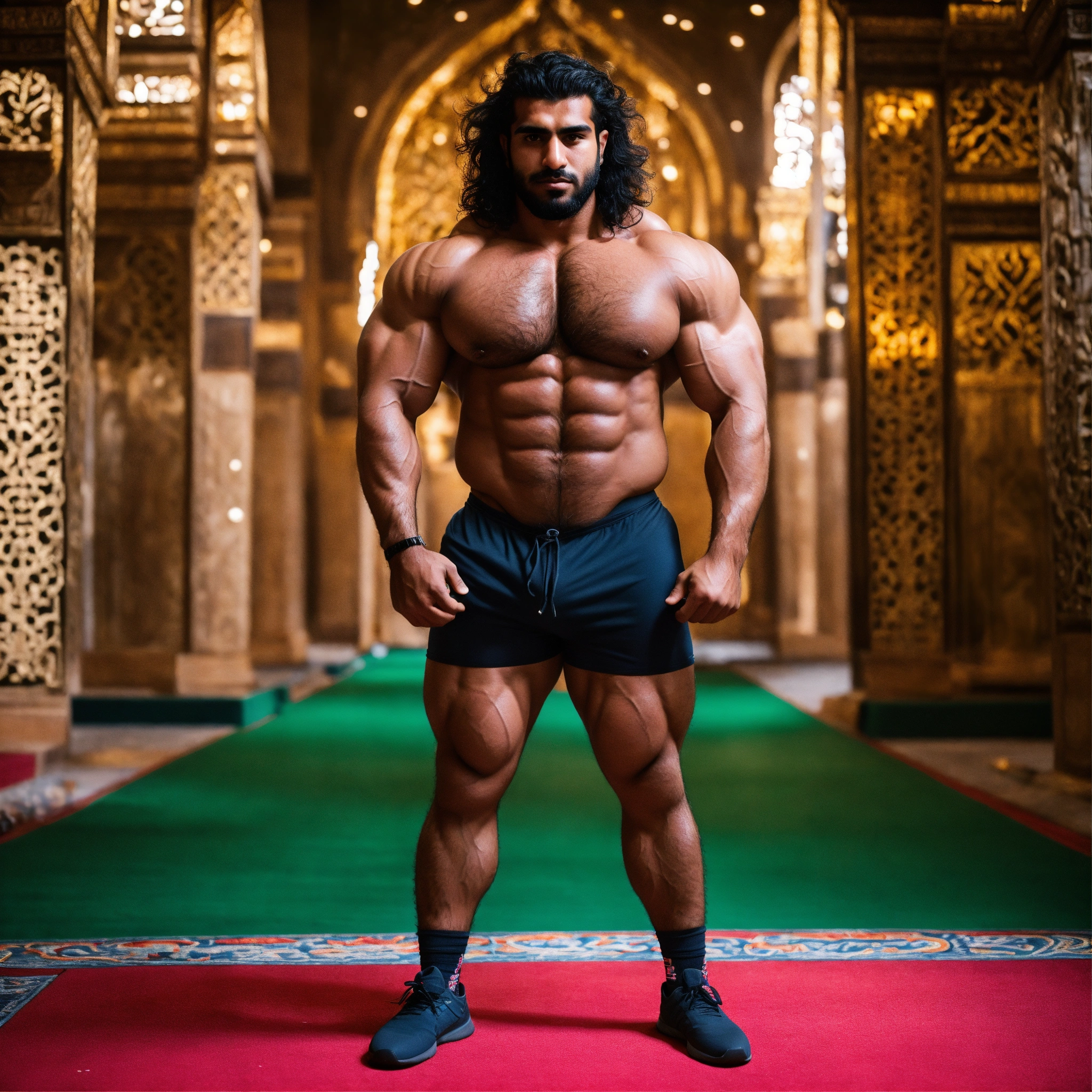 30-year-old hairy saudi man with big muscles, big bodybuilder, body like a wrestler, fierce, in a temple