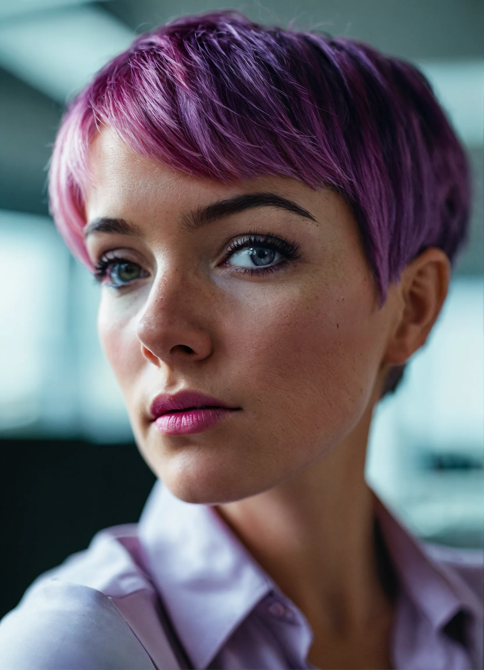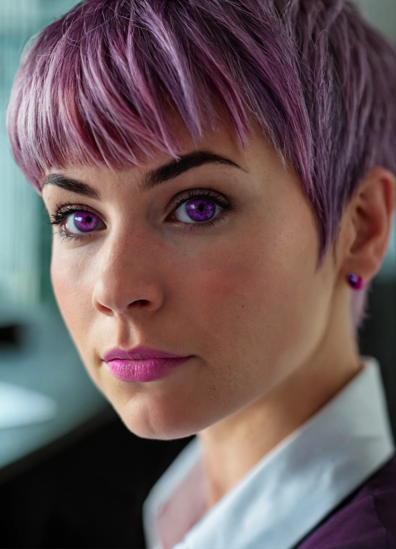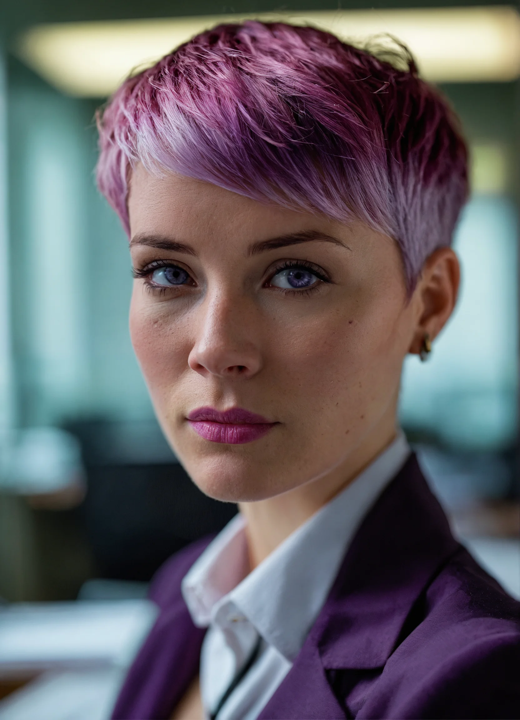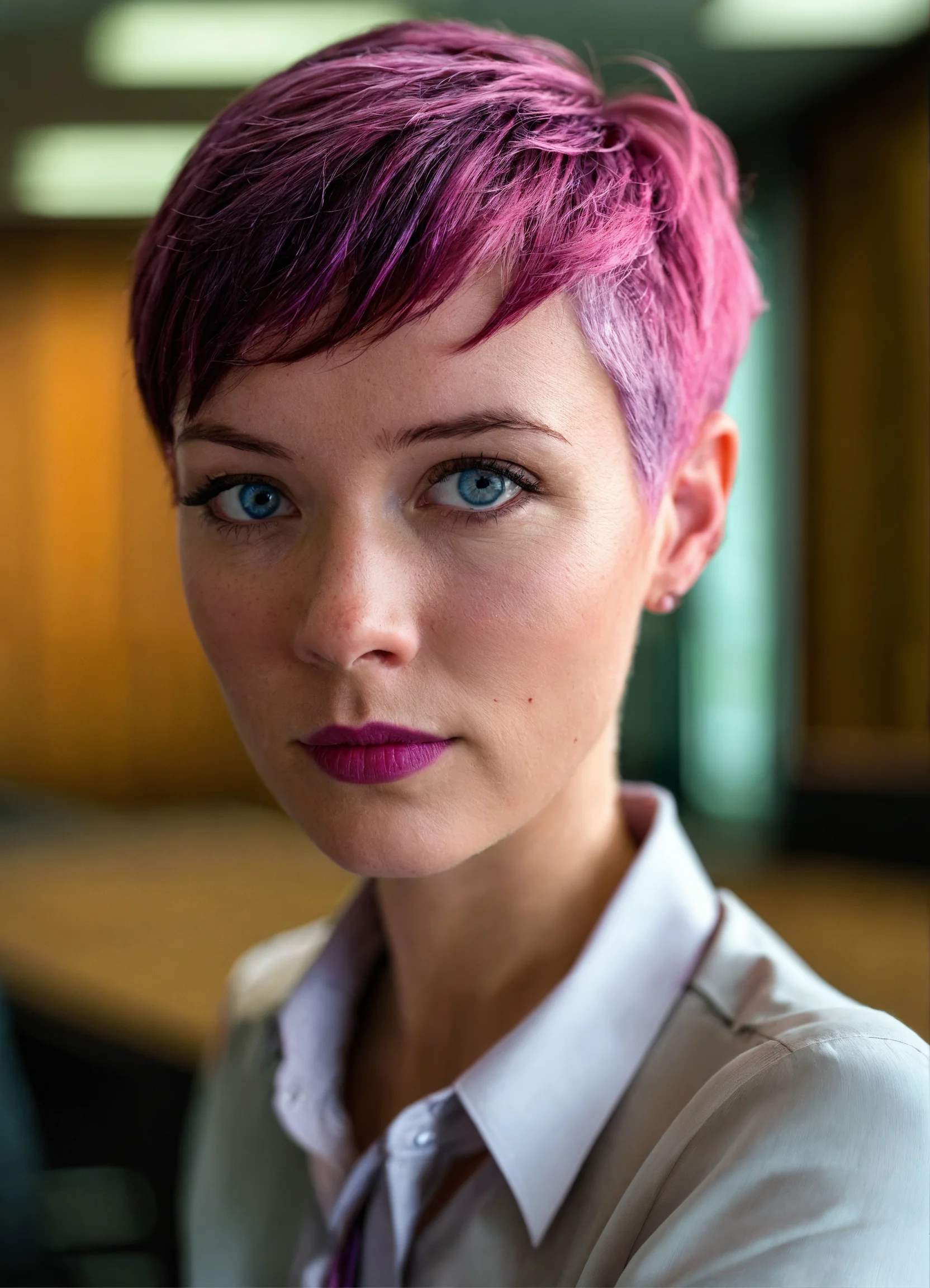 Medium close-up of a female office worker with short pink hair and purple eyes, shot against a professional-looking boardroom background