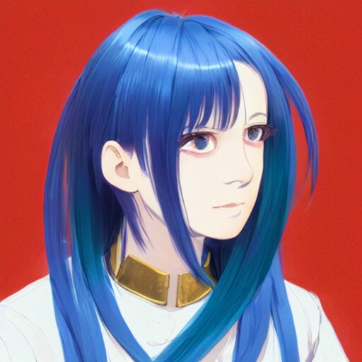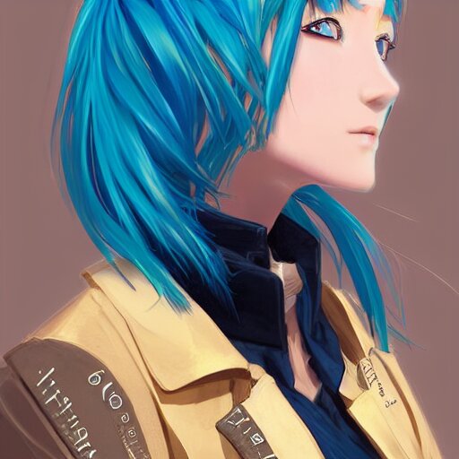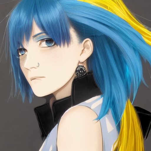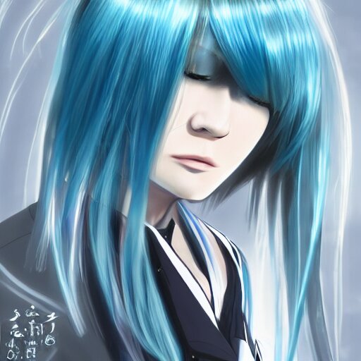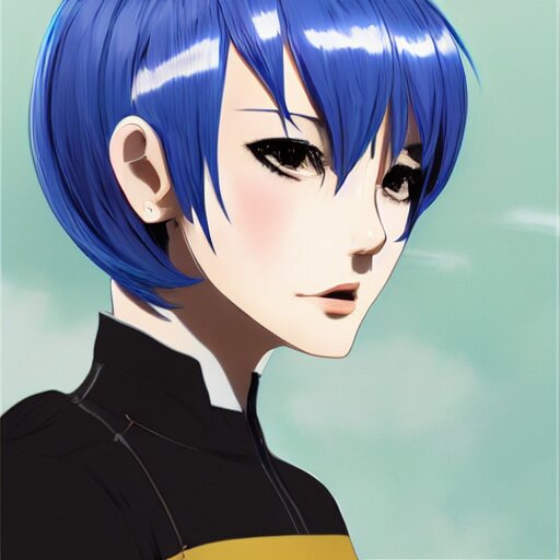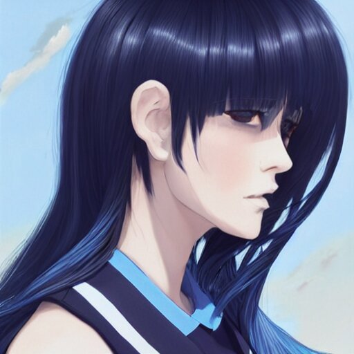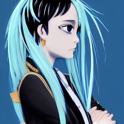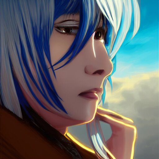Side profile of rimuru tempest with sky blue hair, ponytail, long bangs, gold eyes, black jacket with white stripes and a high collar, detailed face | highly detailed, roman city | professional digital art, concept art, award winning photography, cinematic, wlop | art by pixiv art, ilya kuvshinov, greg rutkowski, yoshitaka amano