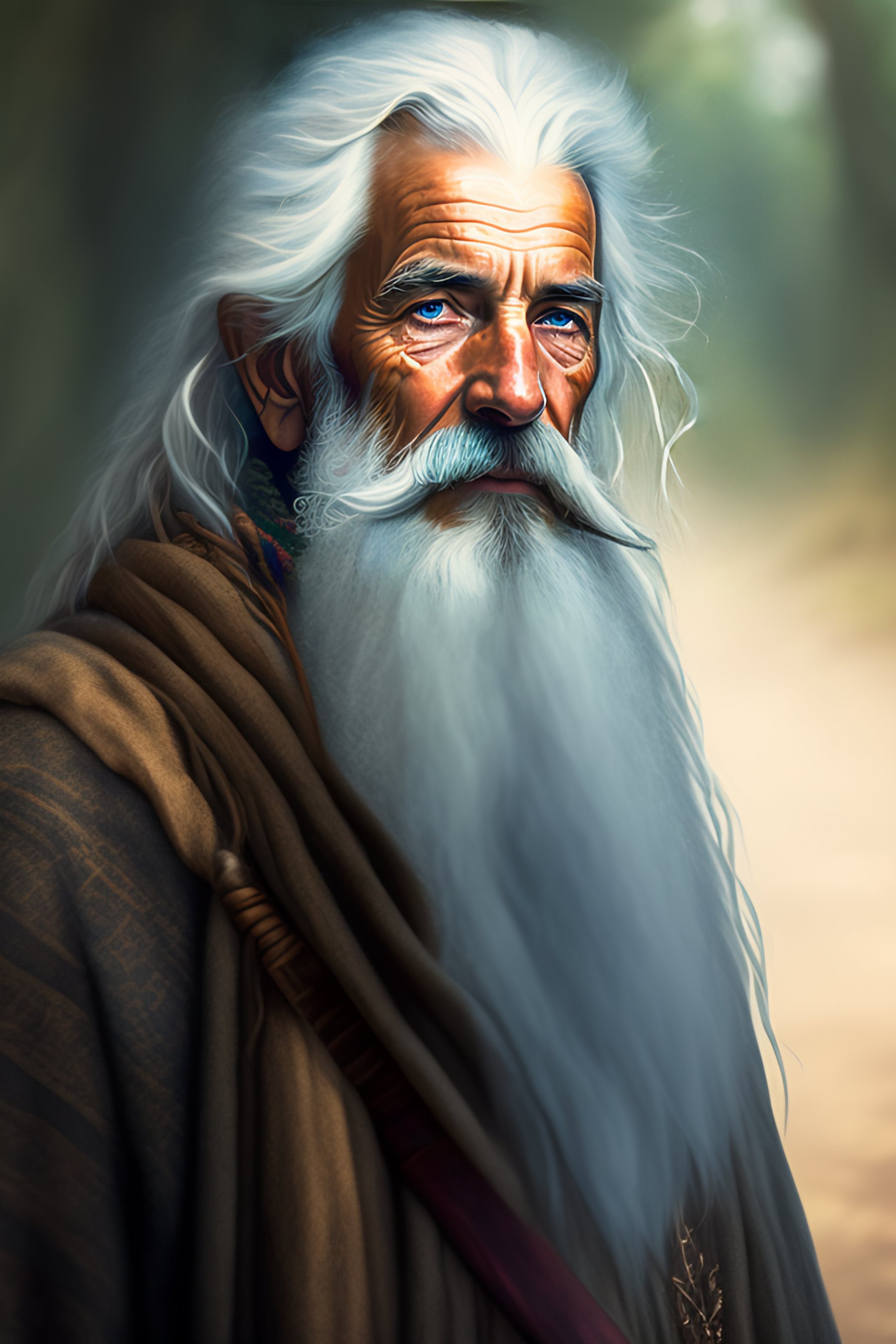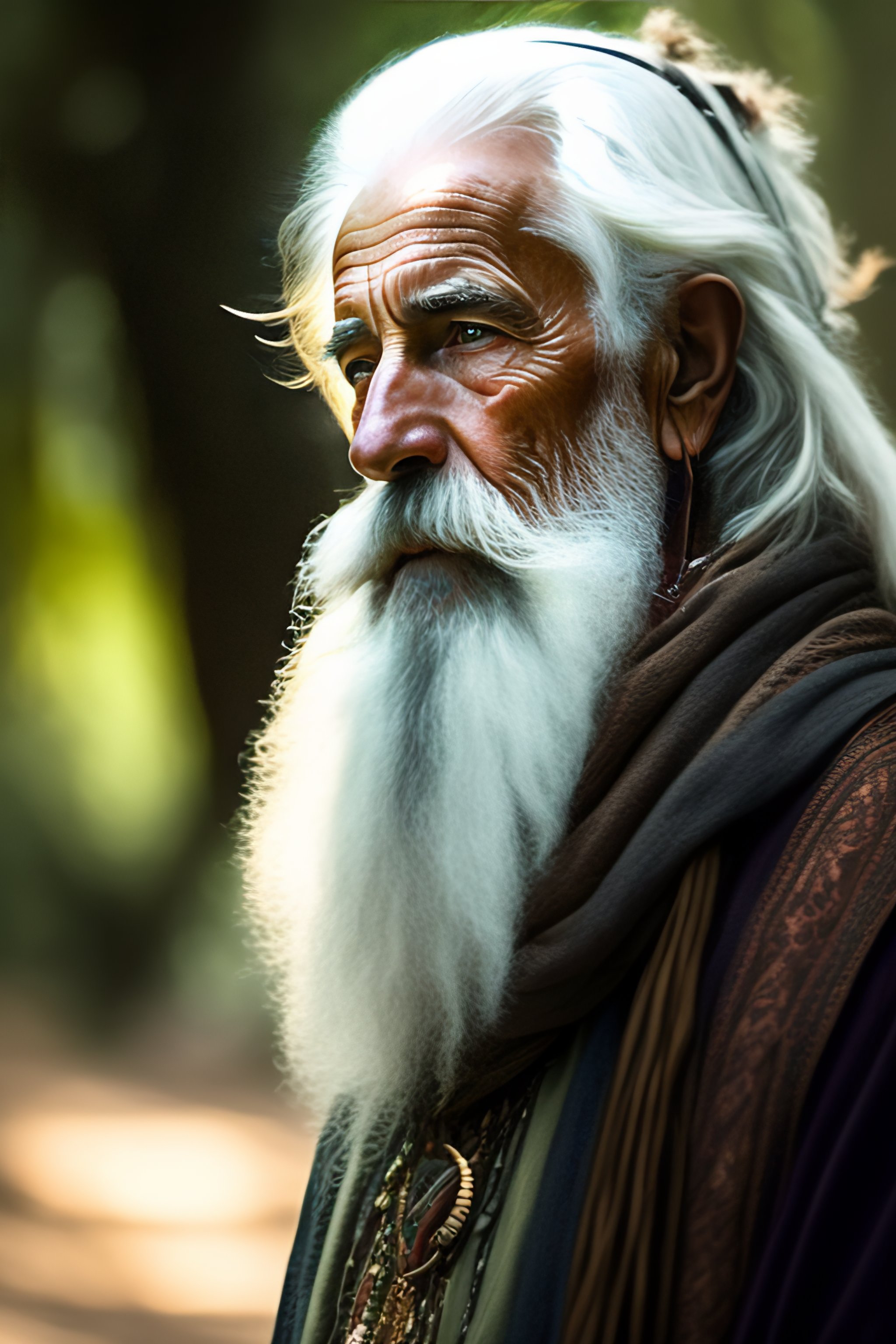 Portrait of scruffy skinny very old male druid in rags with gnarly staff and white unattended beard and leafs and branches stuck in his white hair, one blind eye