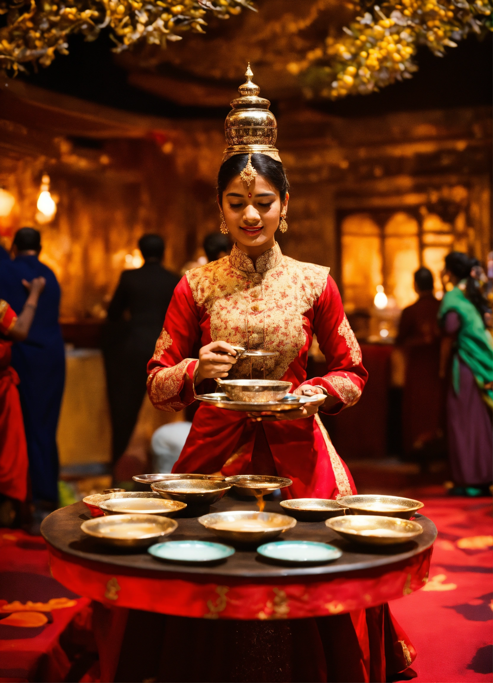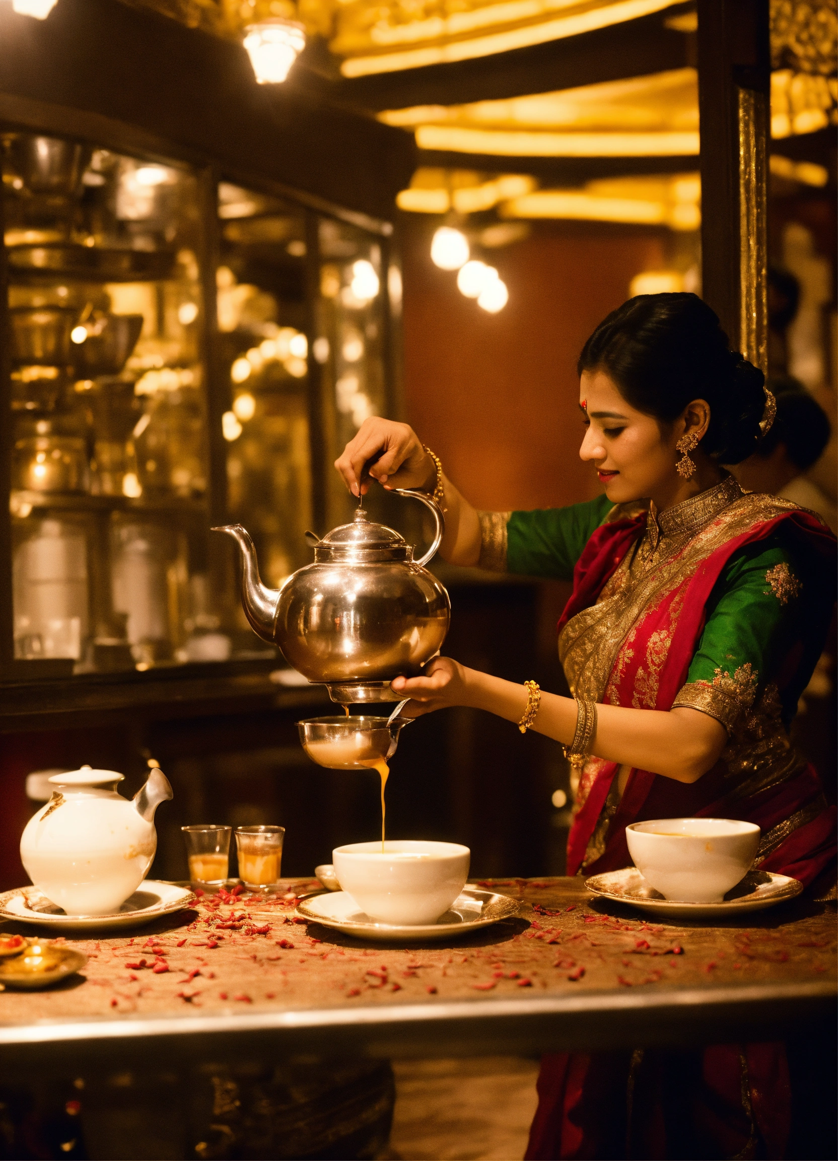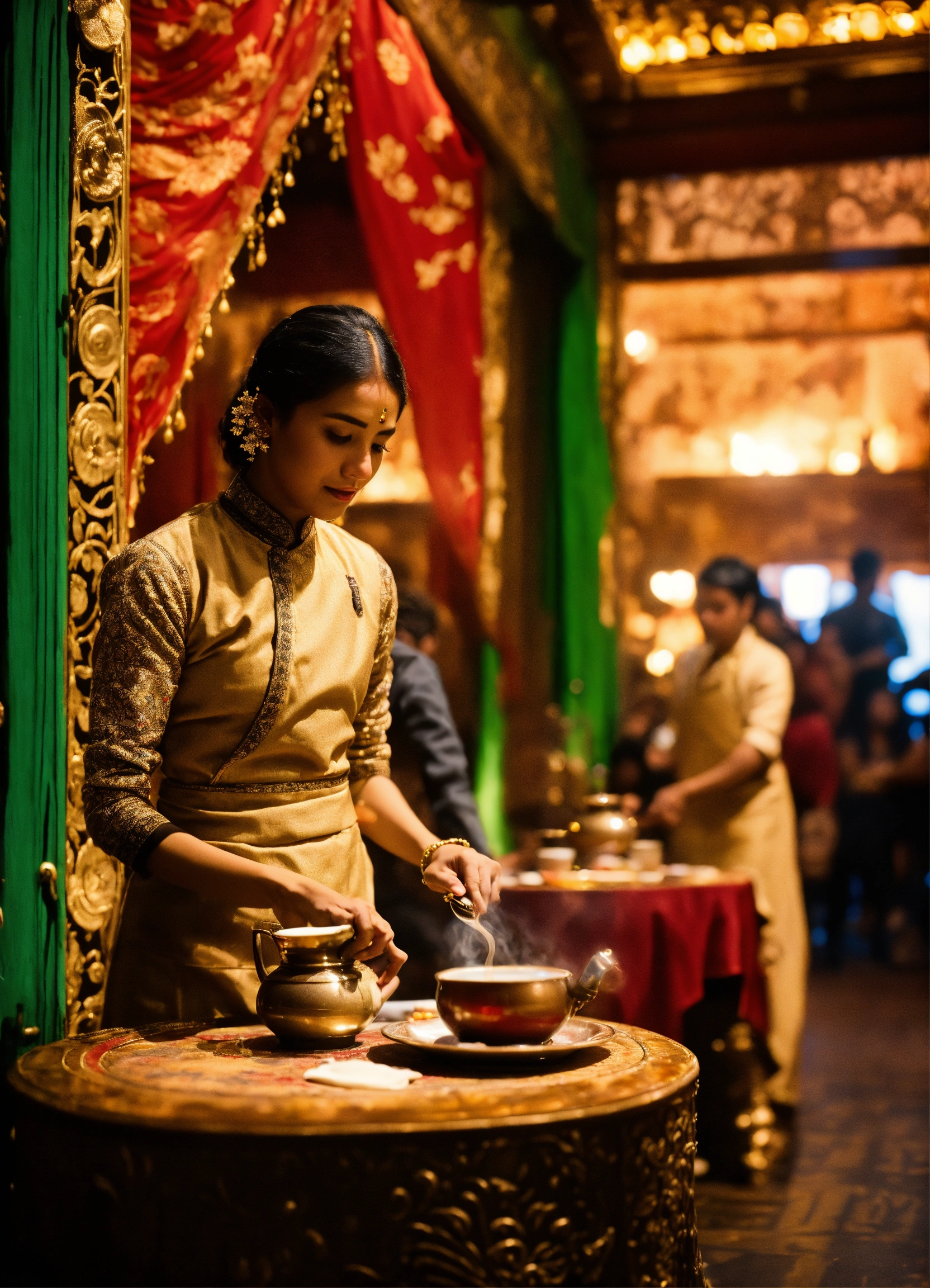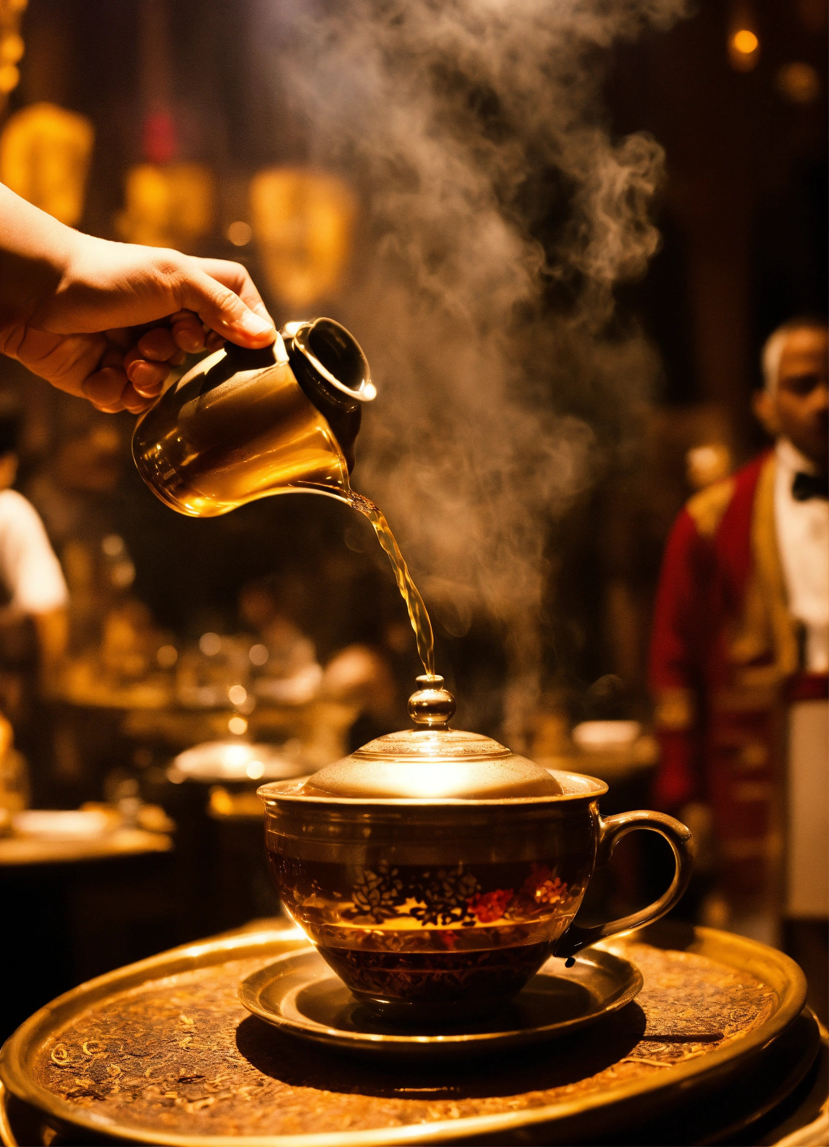 Skilled servers pour chai tea from one cup to another in a theatrical manner, offering a mesmerizing show for diners.