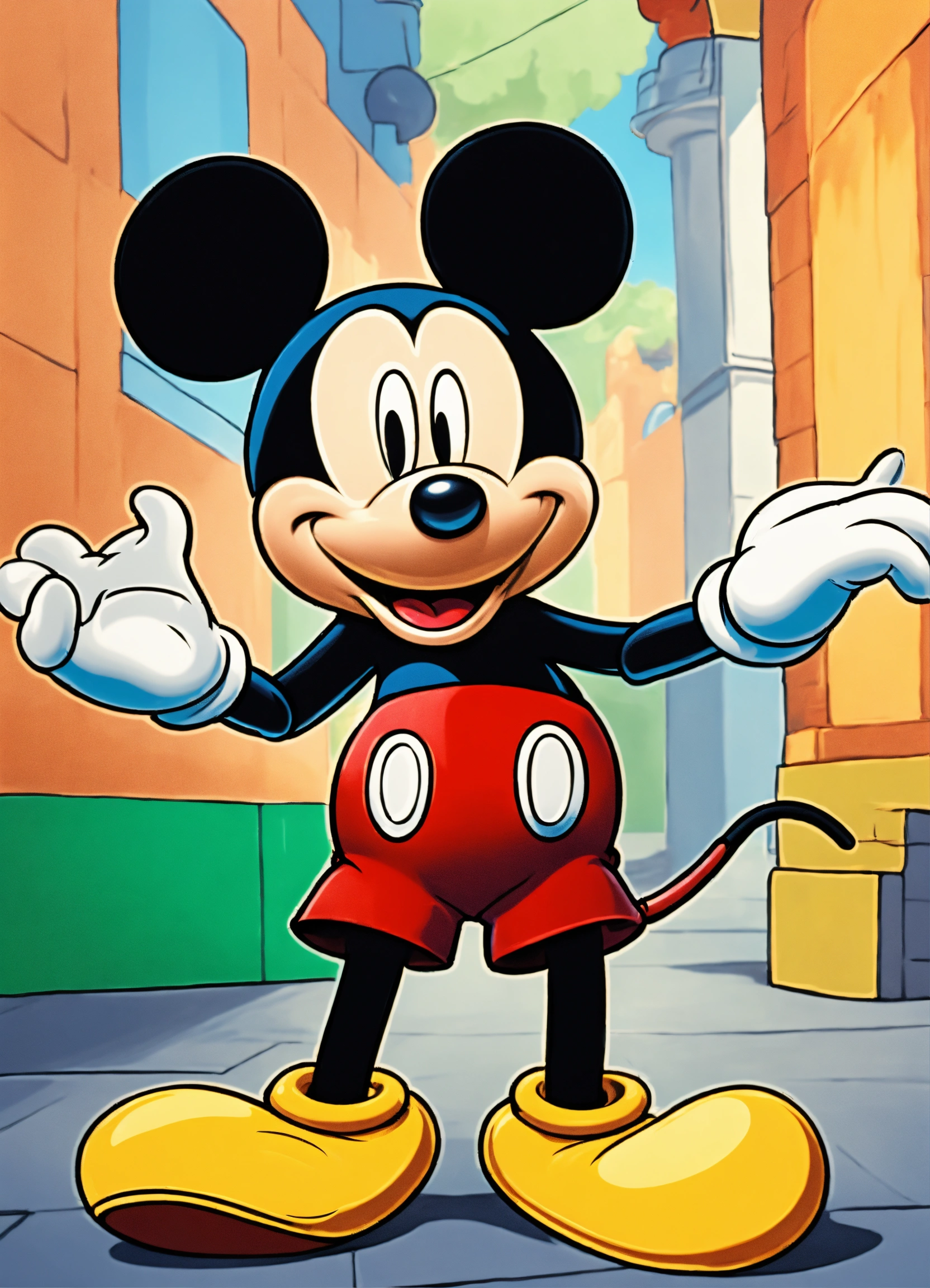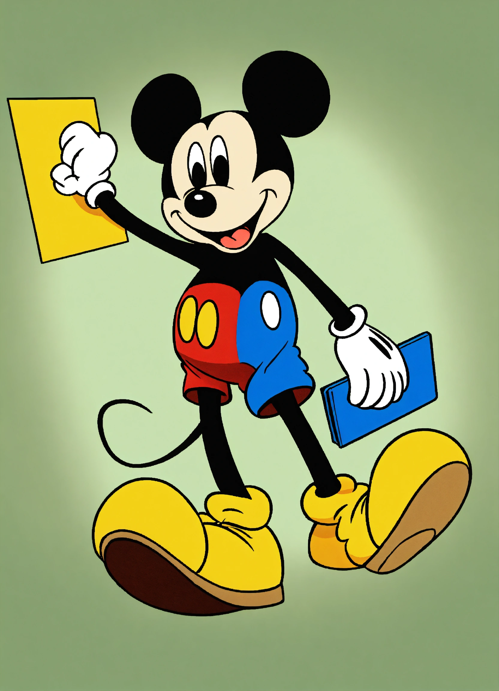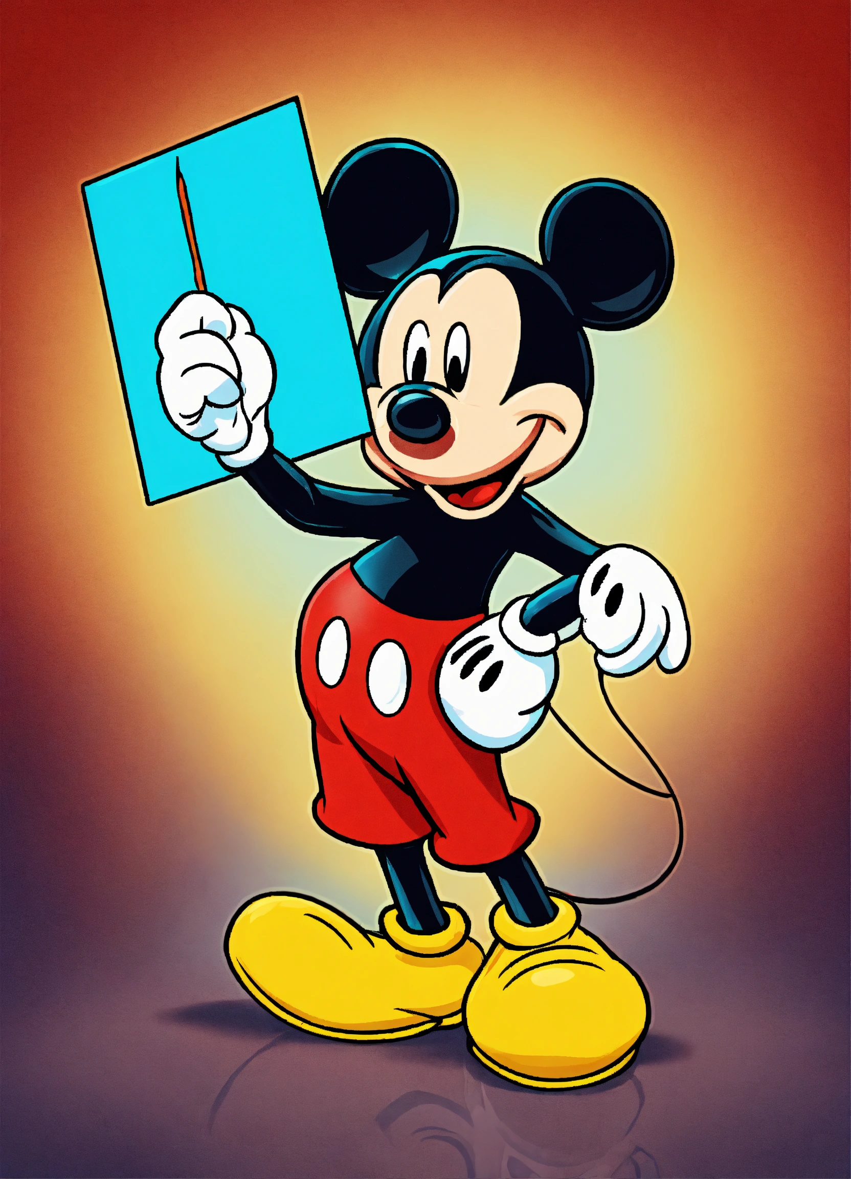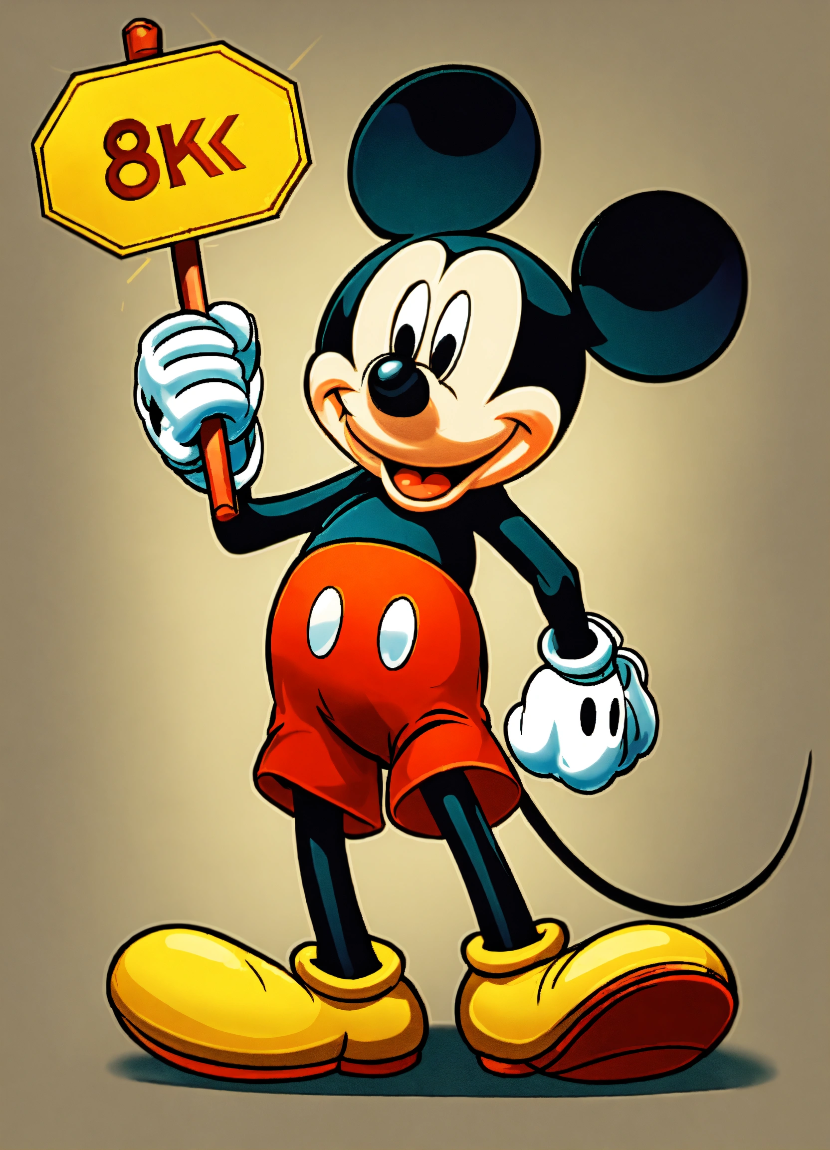 2d mickey mouse holding a sign in his hands, 8 k, high detail. full length. background colored colors simple