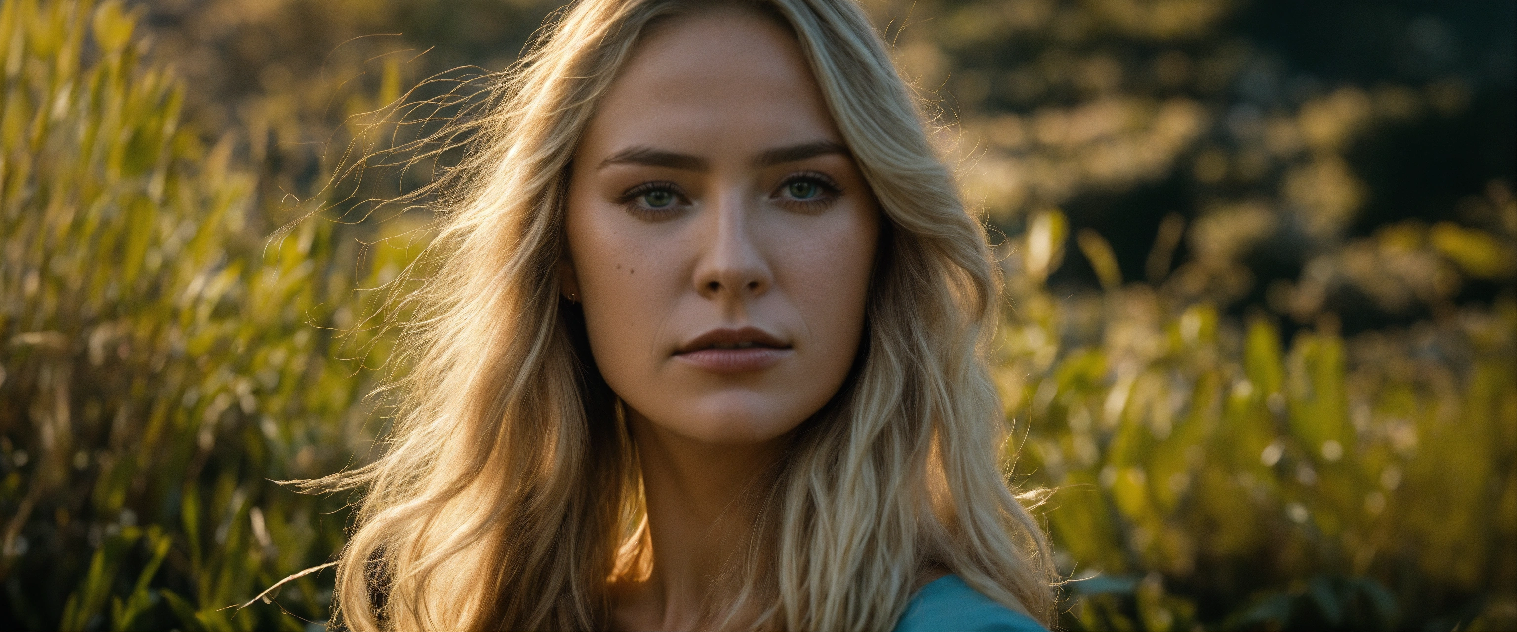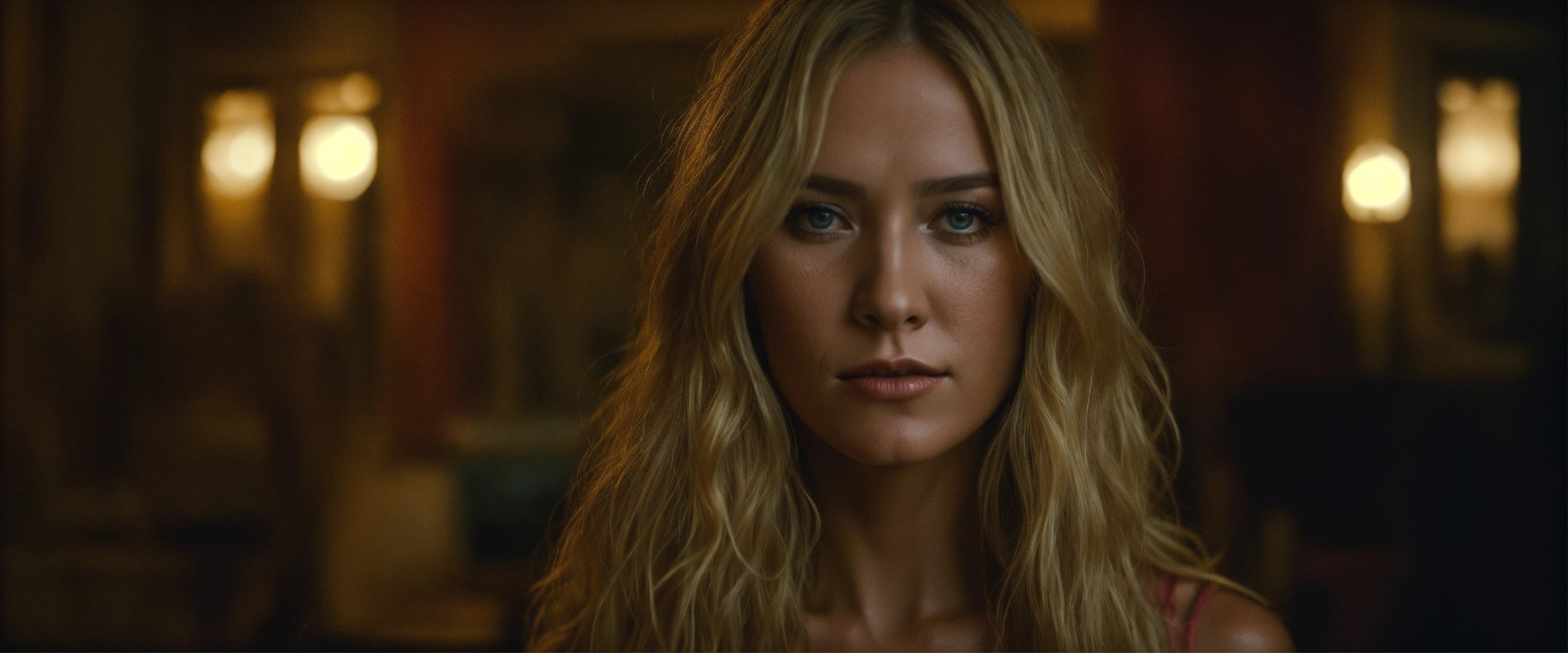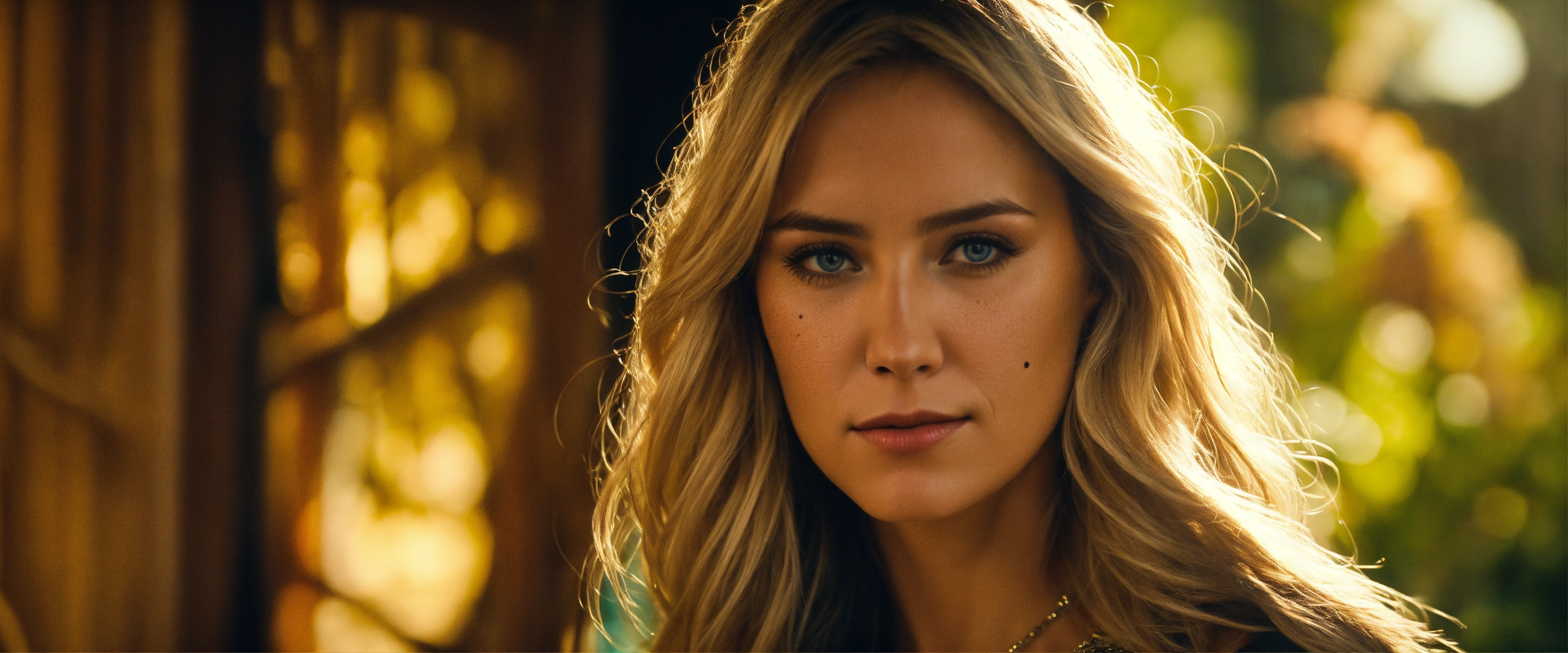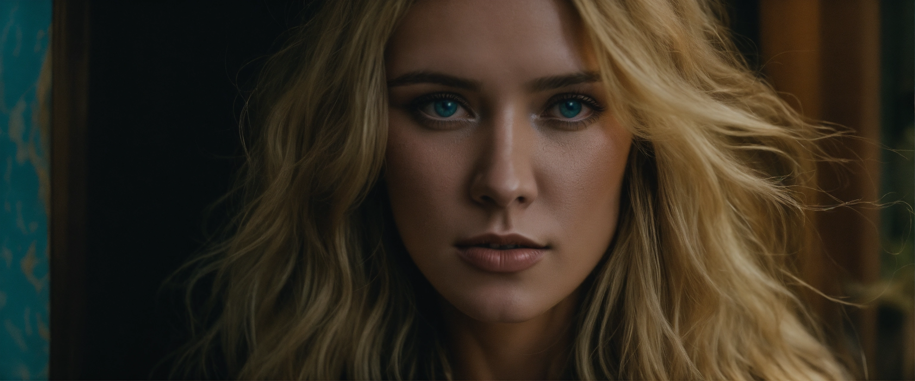 Ultra-realistic 16k photo, portrait of a 45-year-old woman, disheveled, wild look, with long blond hair, with 1 mole, with skin detail, fashion photography, with bohemian look, with framing face in the center, high definition, harcourt studio style, ambiance cinematic, ultra-realistic, with a black background and a palette inspired by the variant of the film "blue lagoon". composition shot with a canon eos-1d