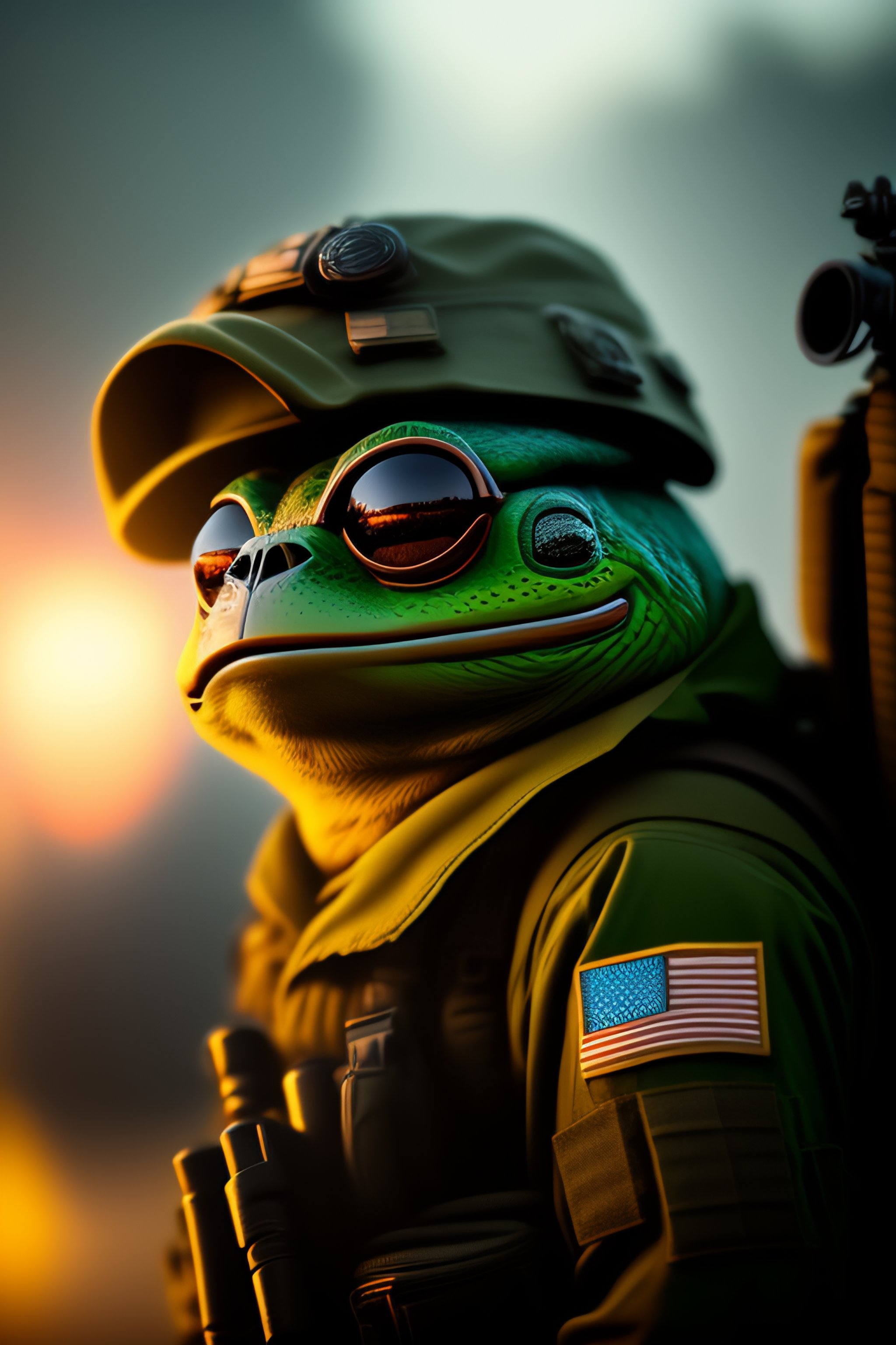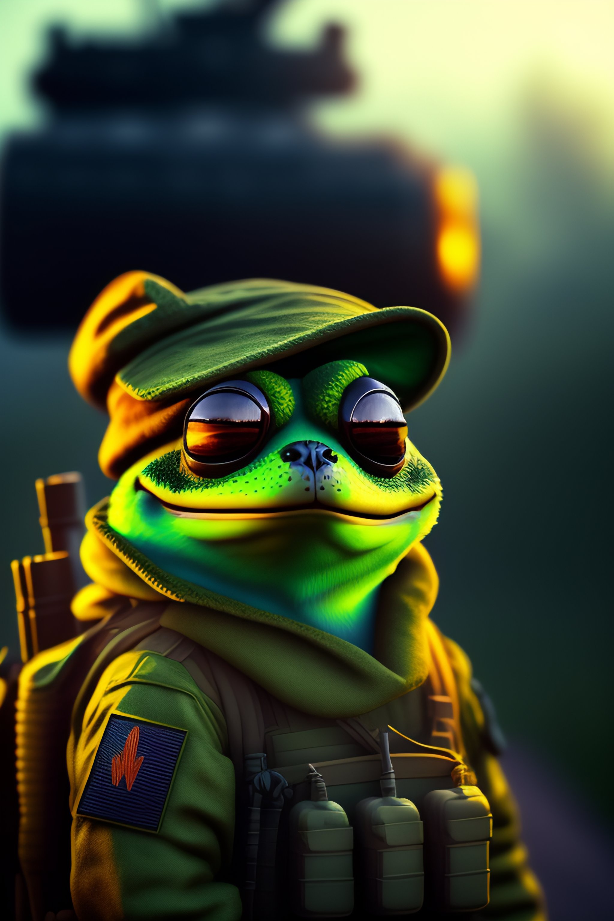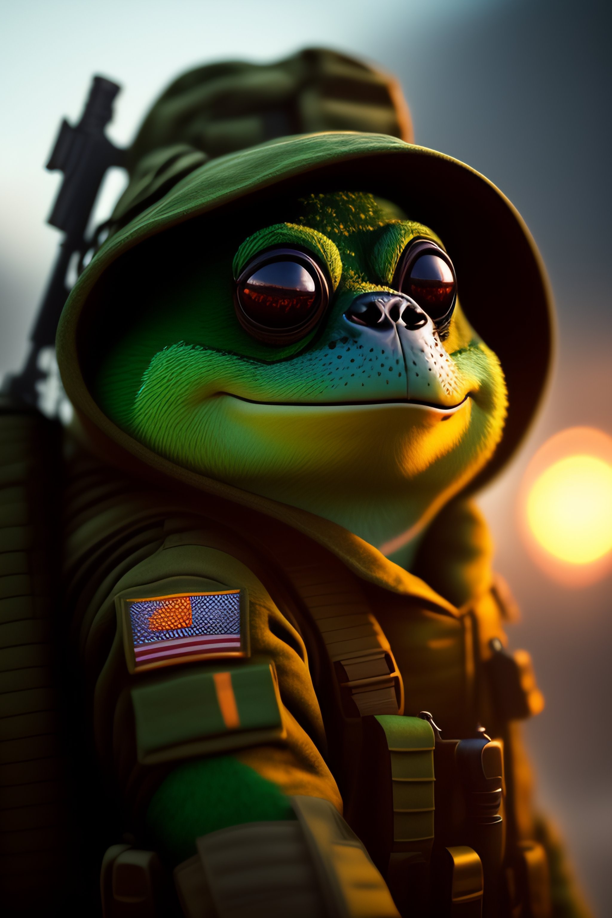 An exhausted pepe the frog at the frontlines in the army at night with his platoon fighting, key lighting, soft lights, foggy, 8 k render, detailed, cute cartoon style, warhammer 40k