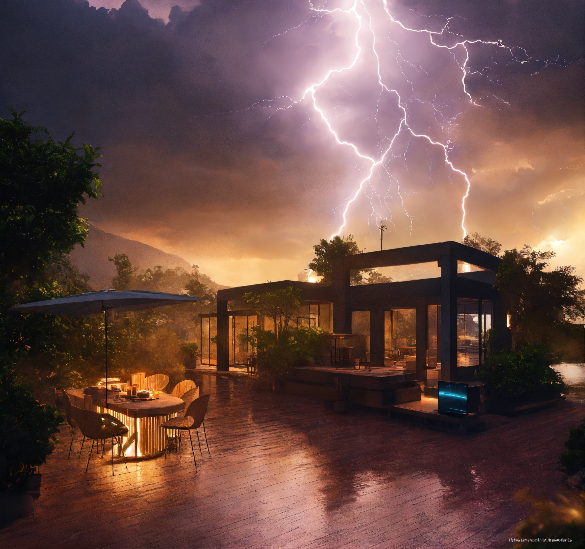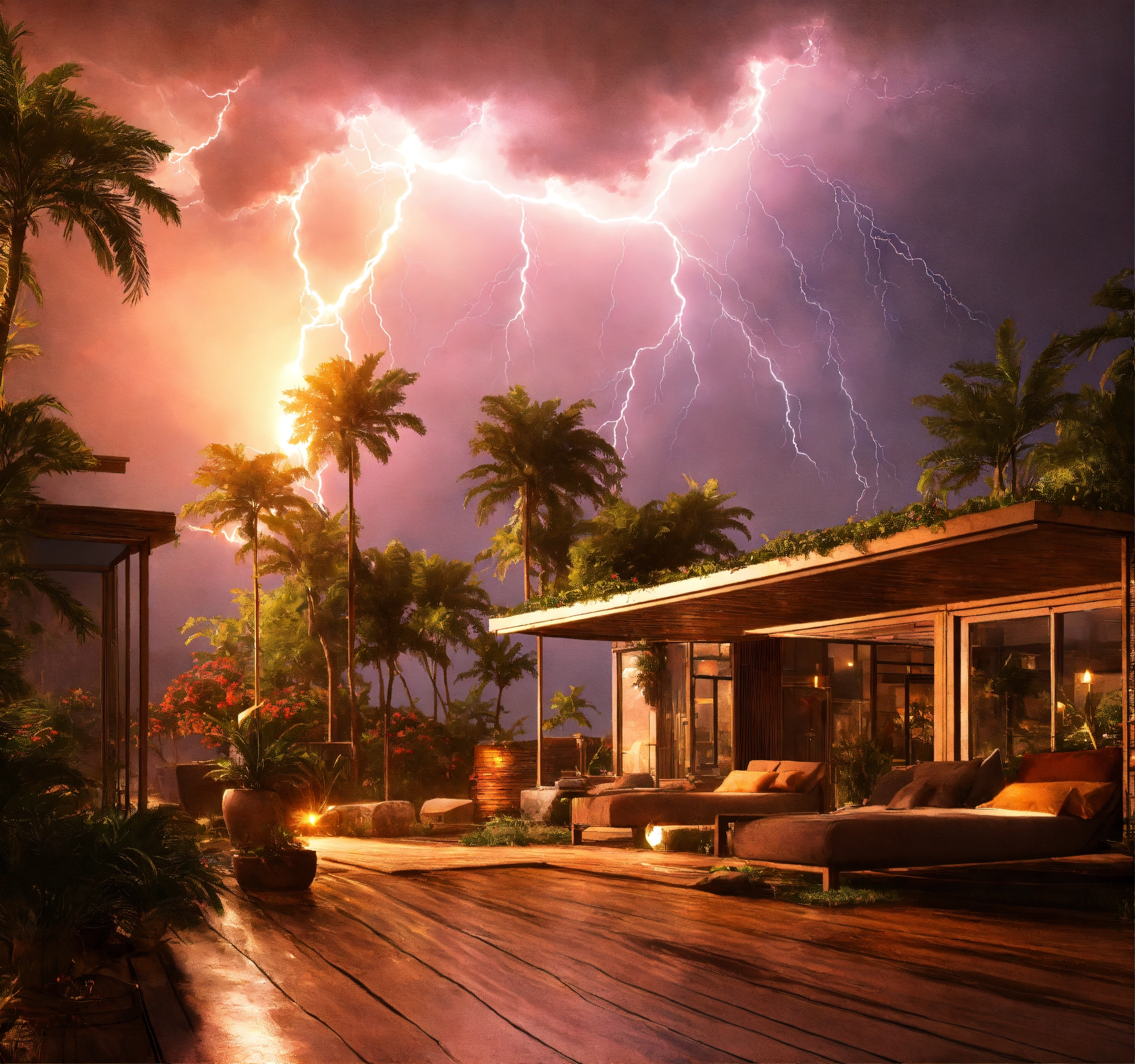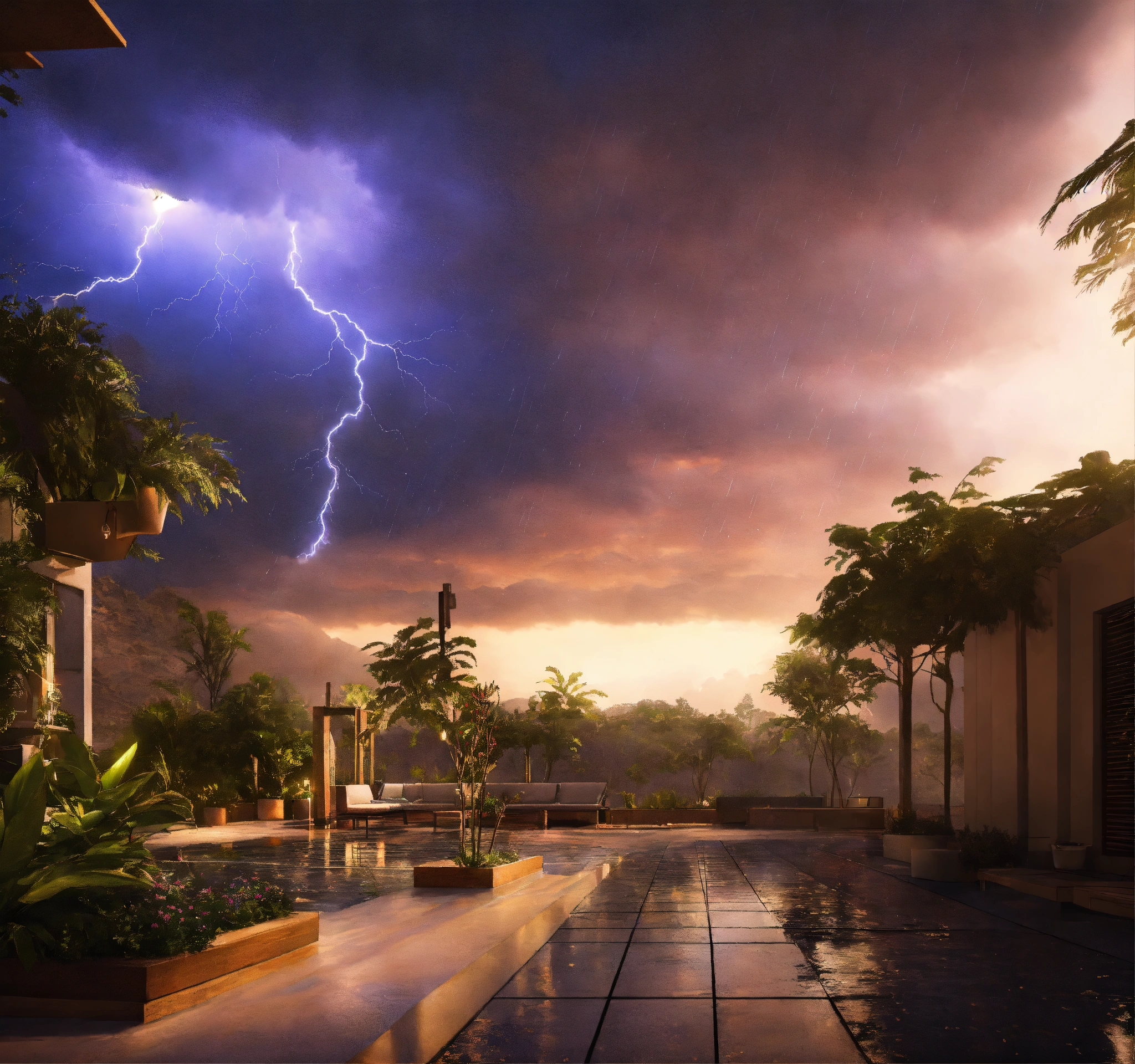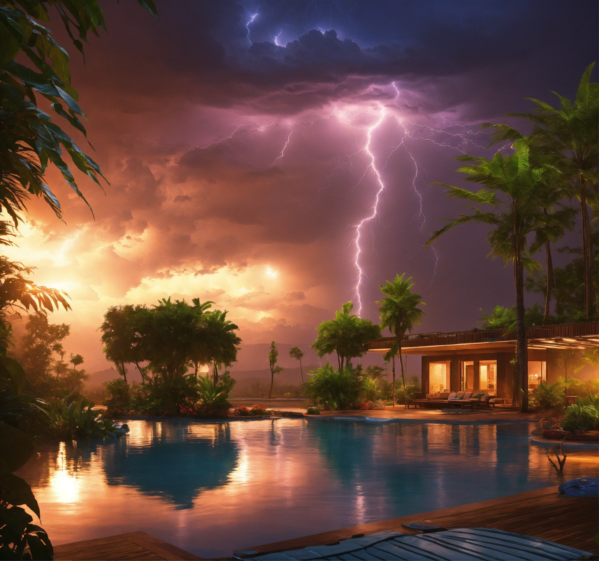 Please generate a lively picture of a high-tech oasis with a lightning storm and sun, make it heartwarming