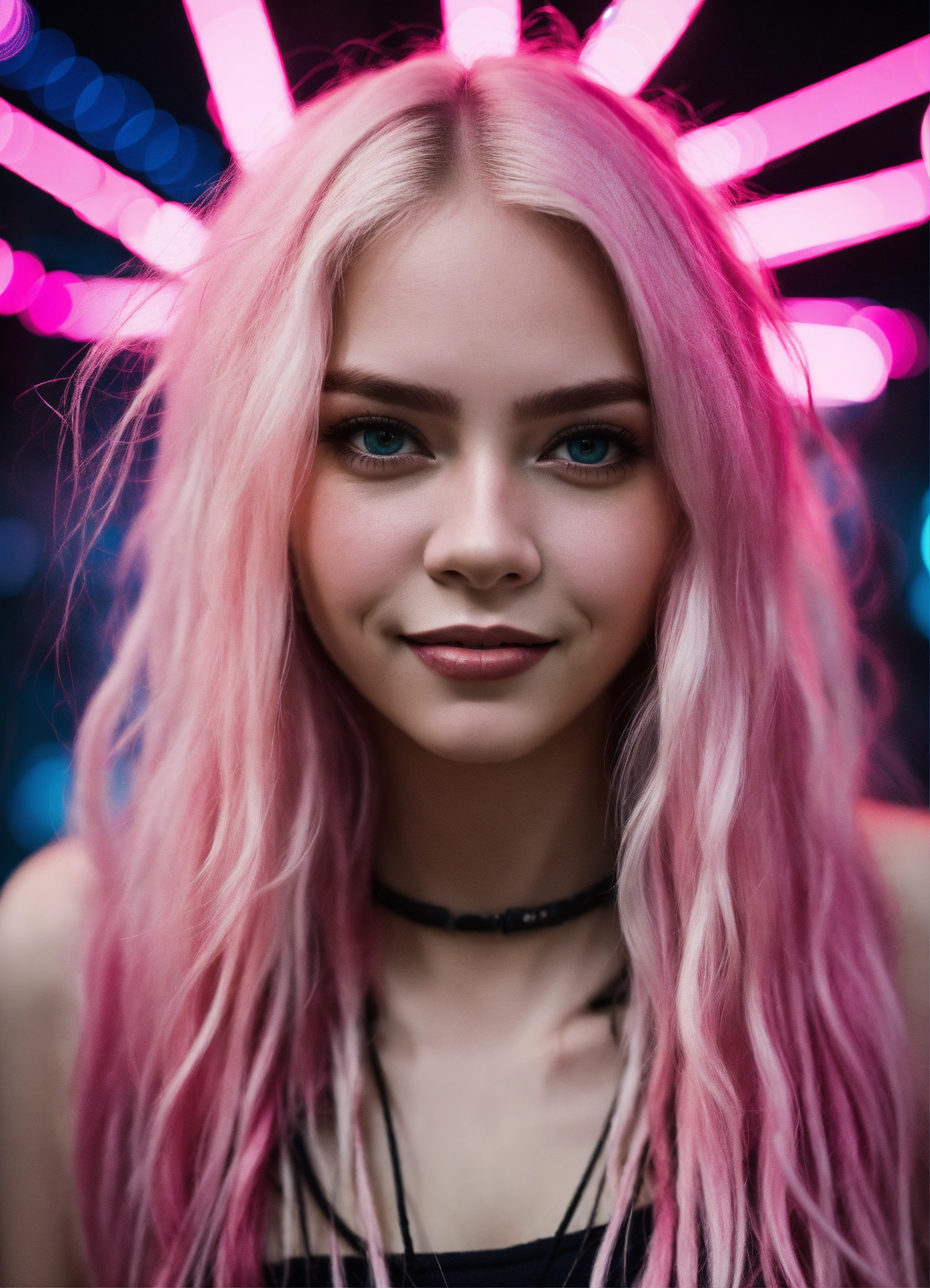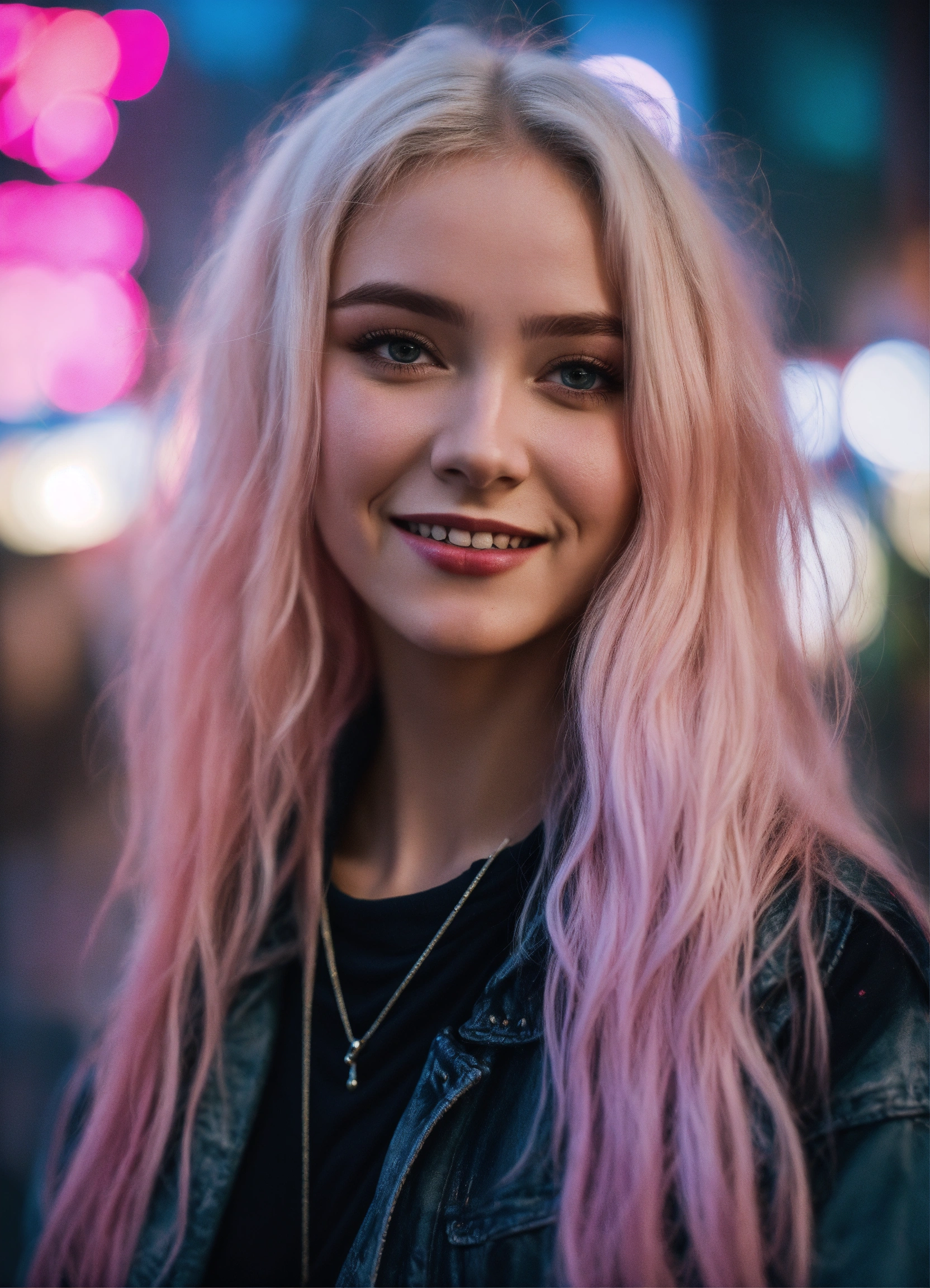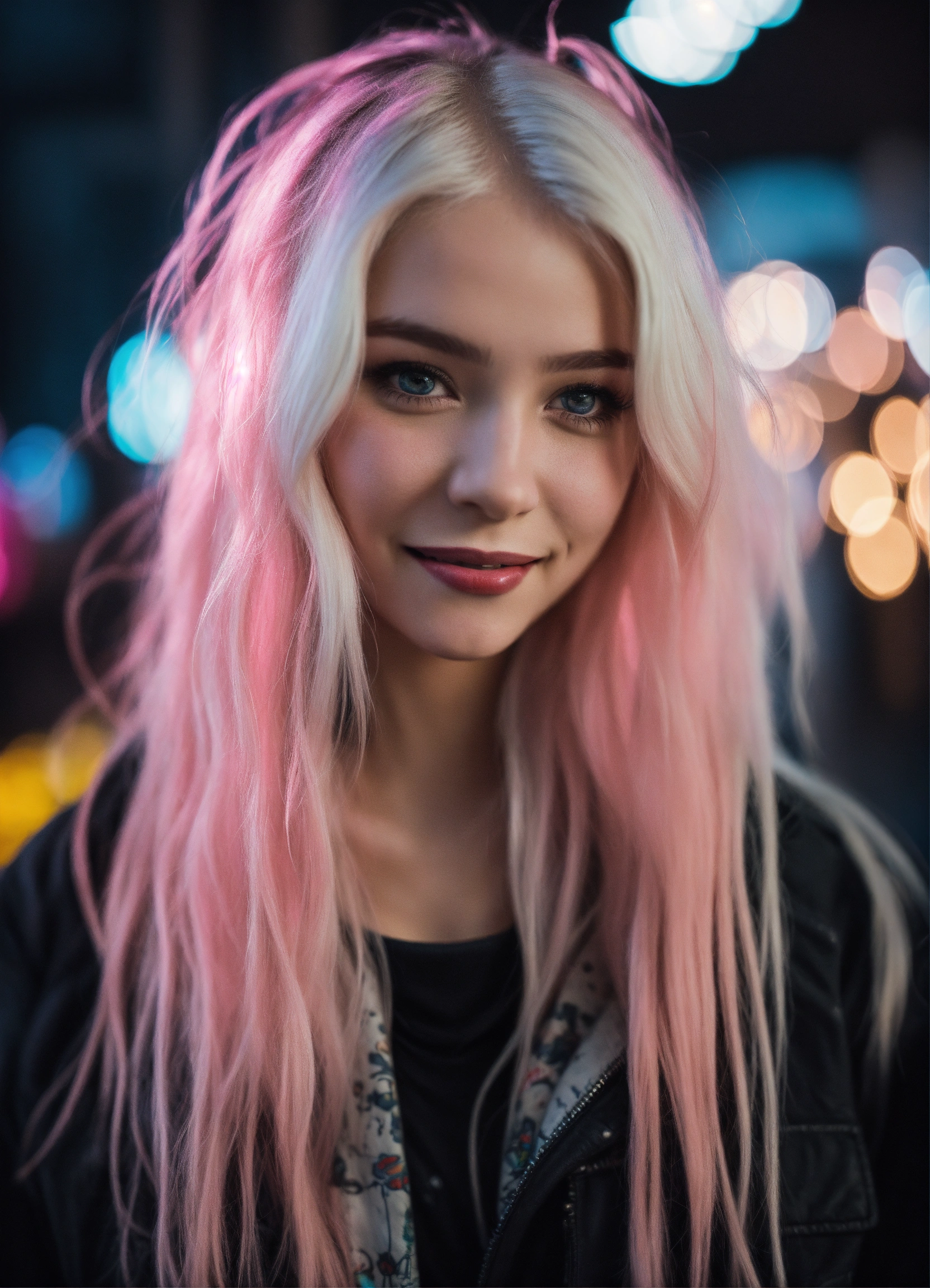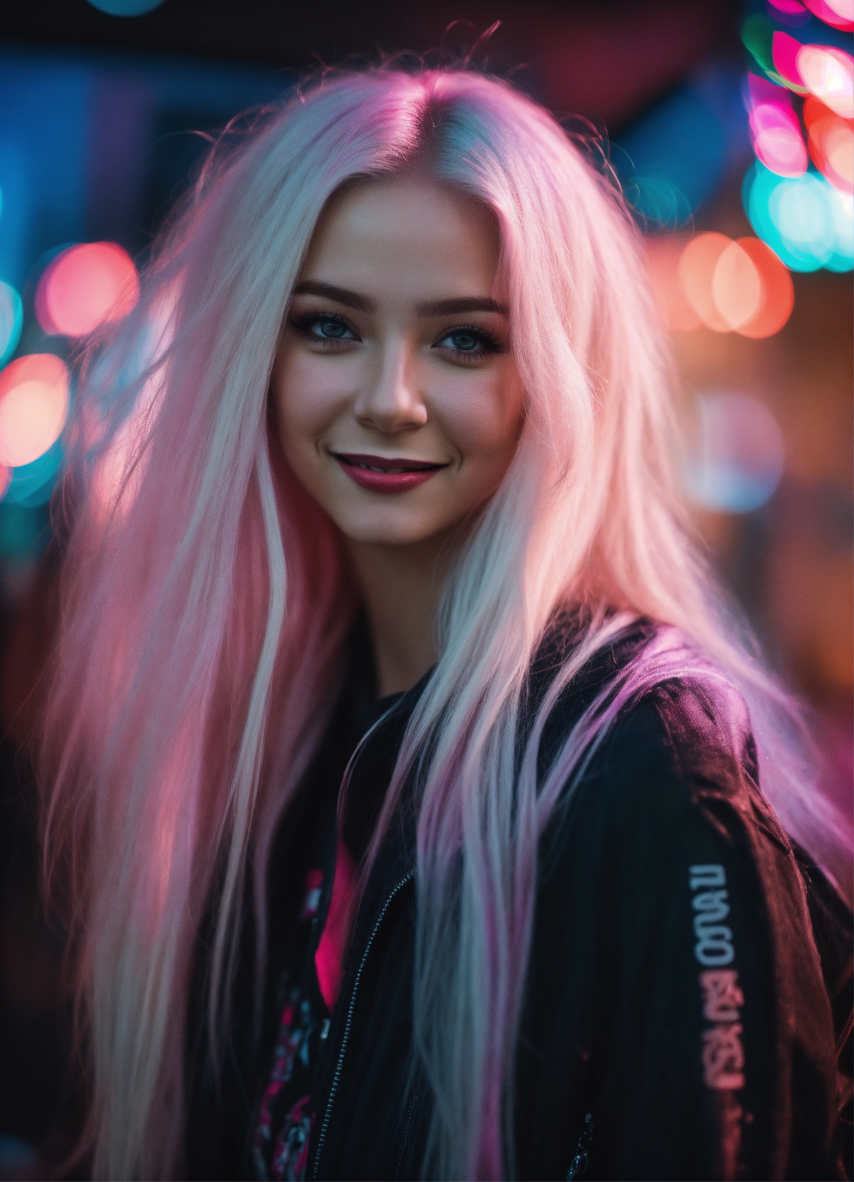 Highly detailed portrait of russian young woman 16 years old, crazy, long white hair, smile, pink eyes, black stweetwear, cyberpunk, cartoon realism, black, grunge aesthetic!!! bokeh