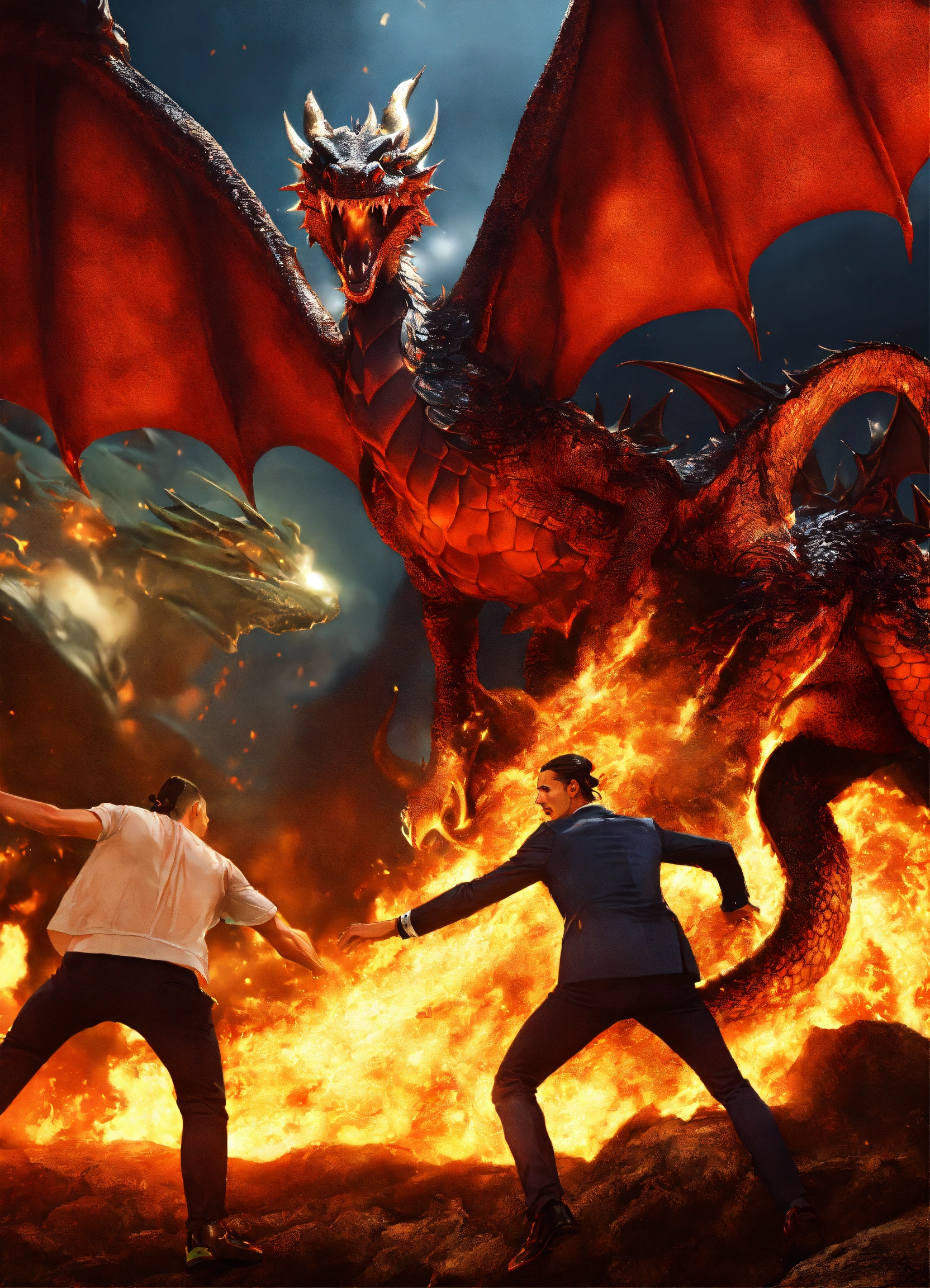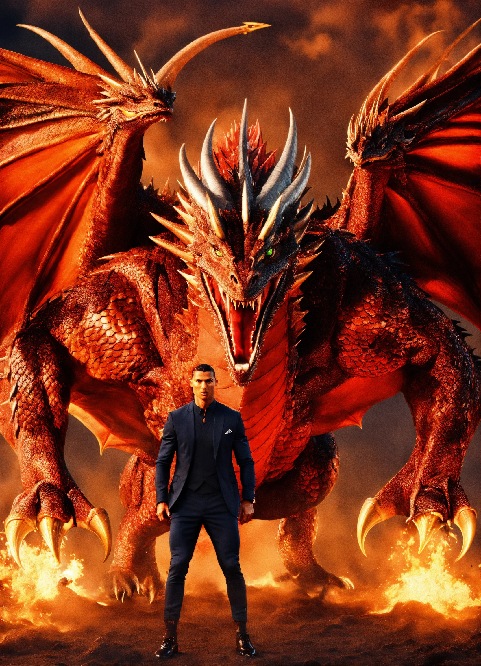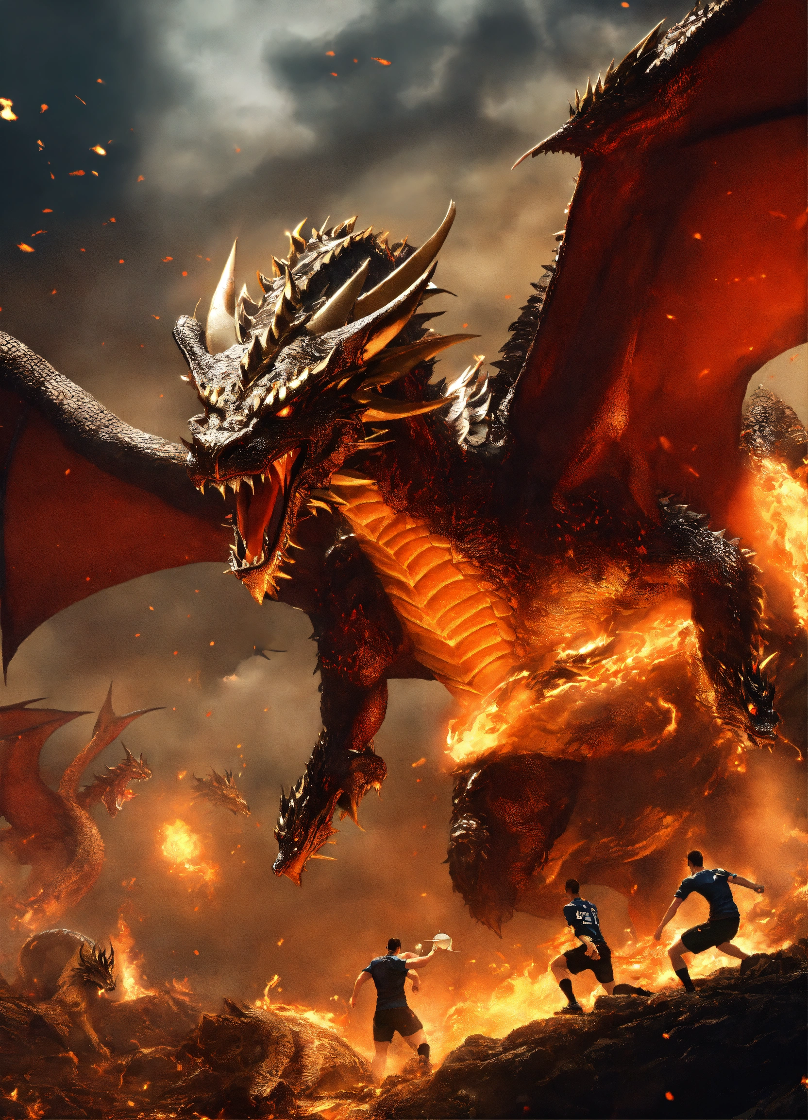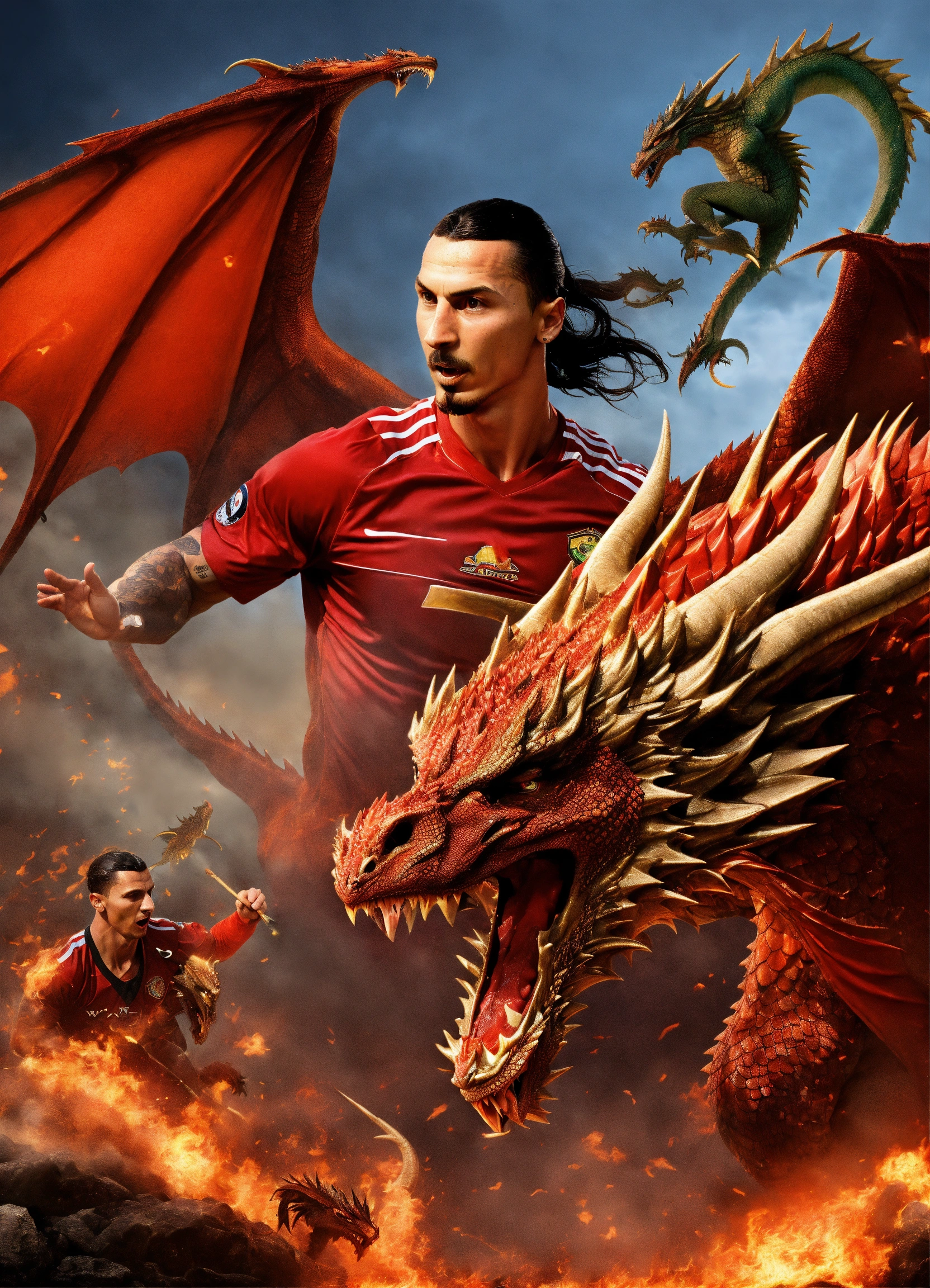 Zlatan ibrahimovic and christiano ronaldo surrounded by fierce dragons that are trying to kill zlatan and christiano