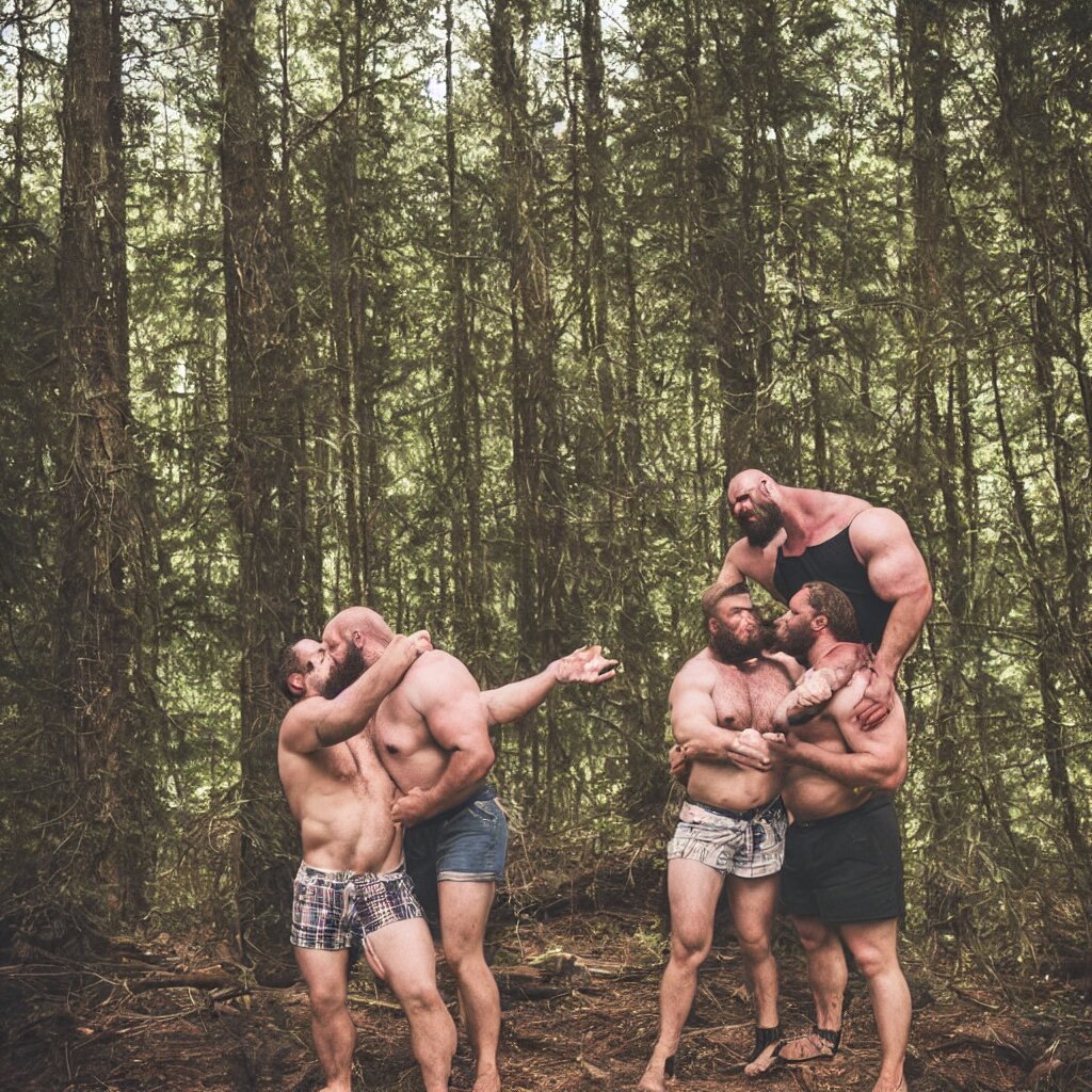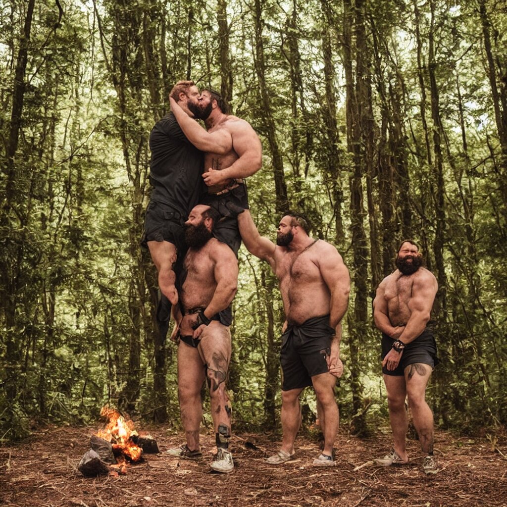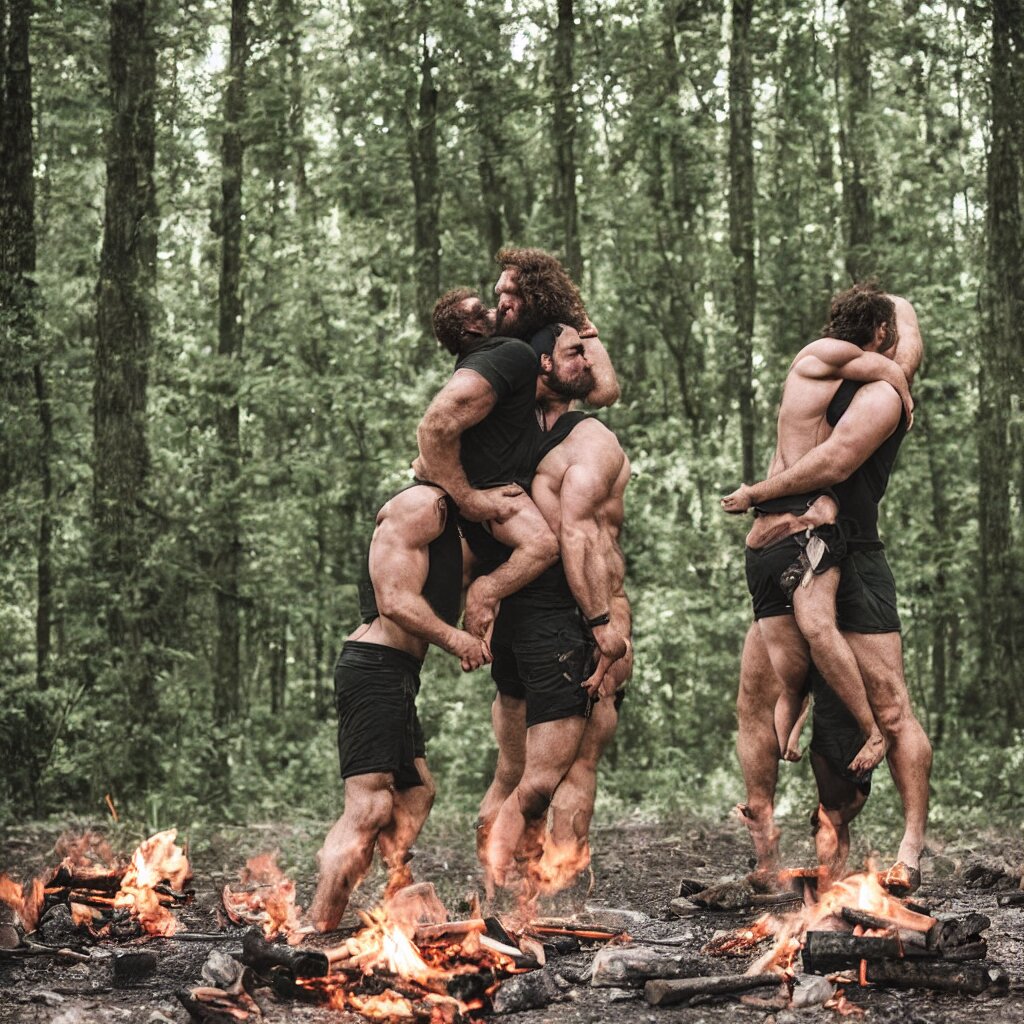 Two big hairy strongmen husbands in shorts in a forest, kissing around a campfire, daddy energy, wholesome, cute, love, photography, high details, epic, high resolution
