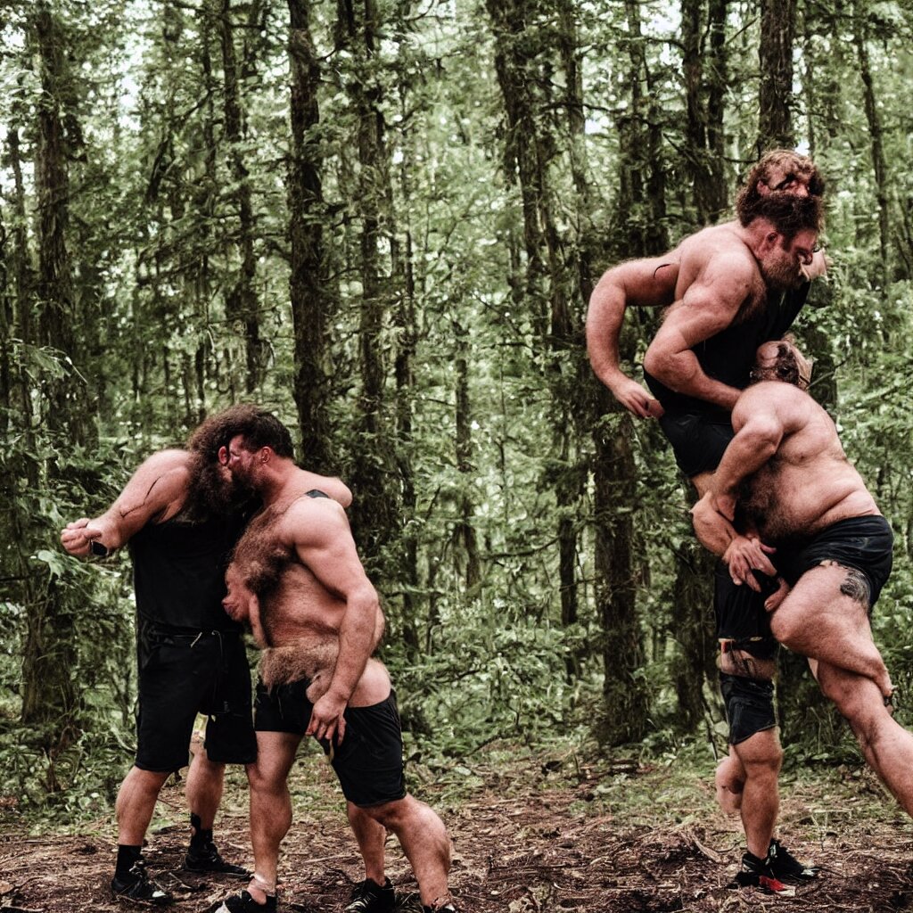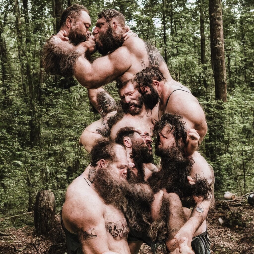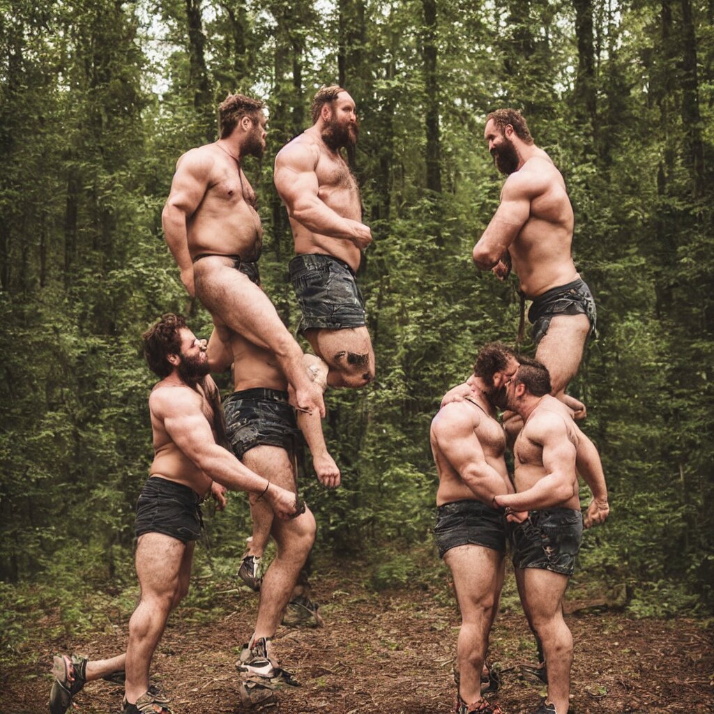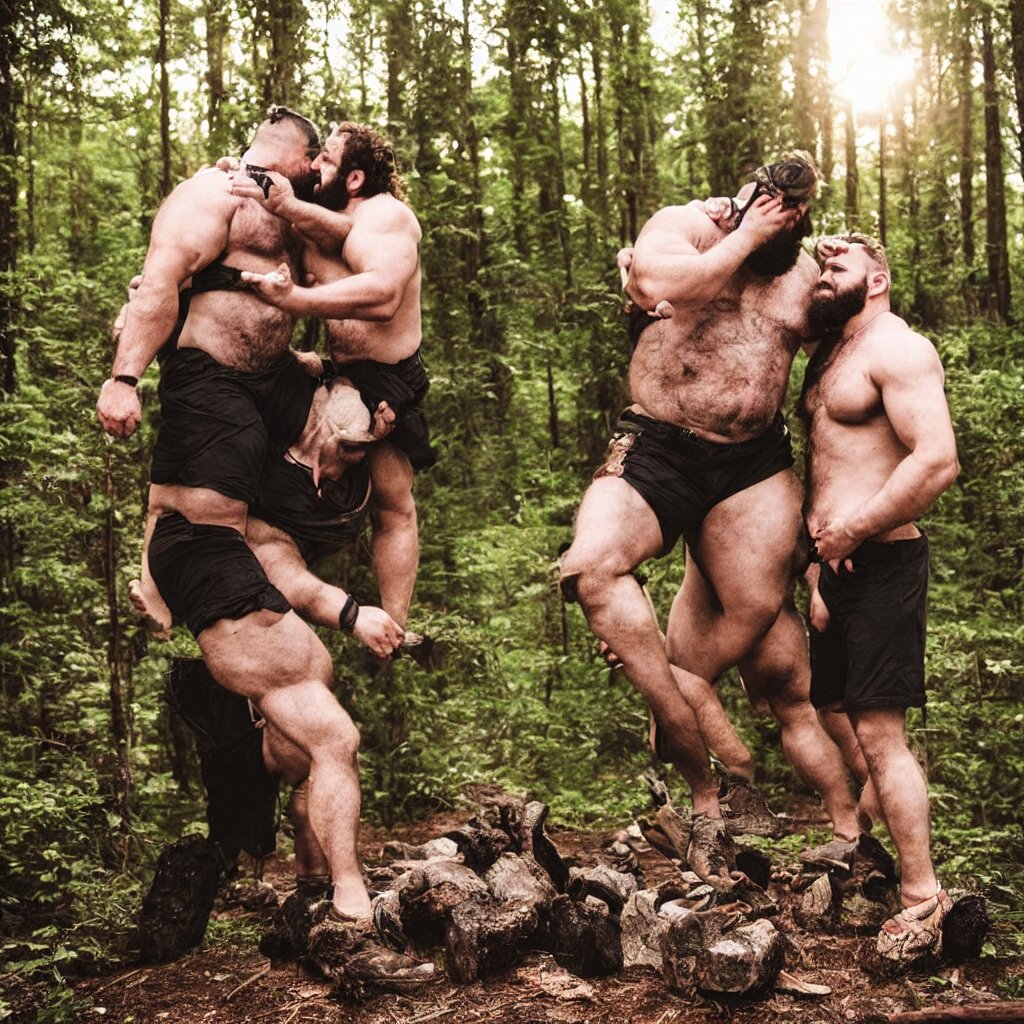 Two big hairy strongmen husbands in shorts in a forest, kissing around a campfire, daddy energy, wholesome, cute, love, photography, high details, epic, high resolution