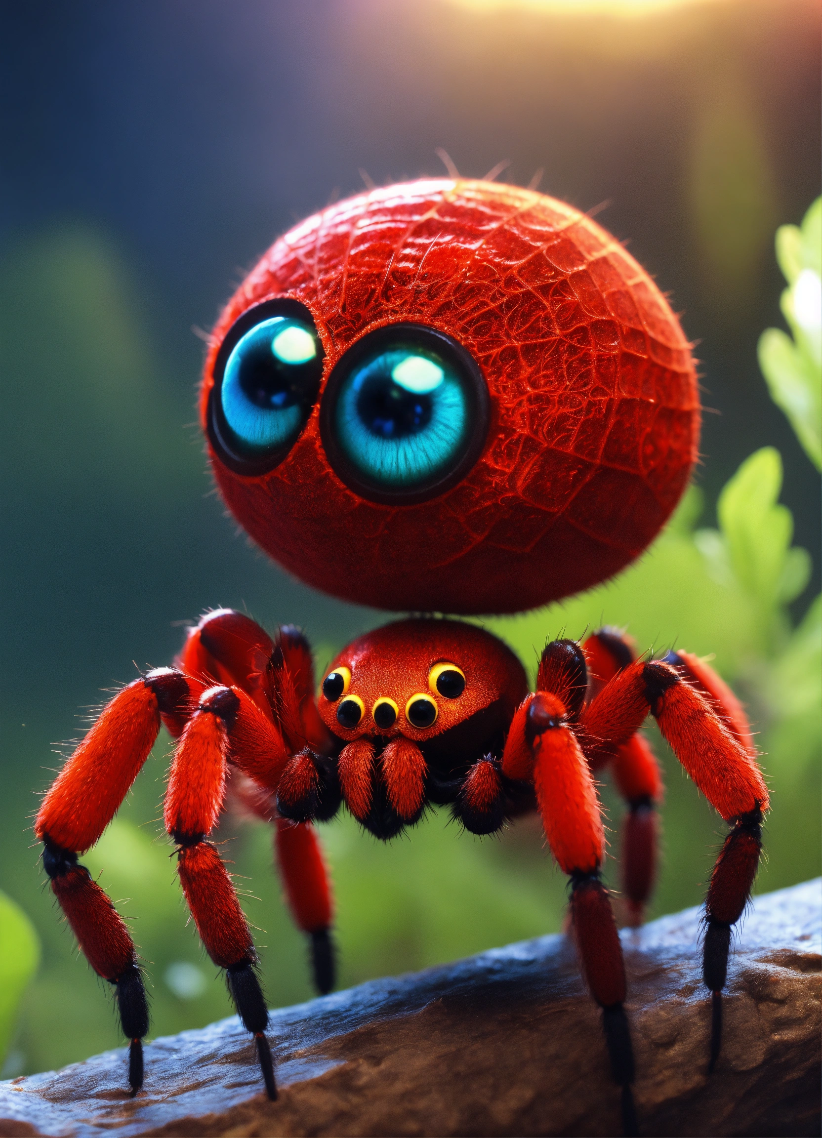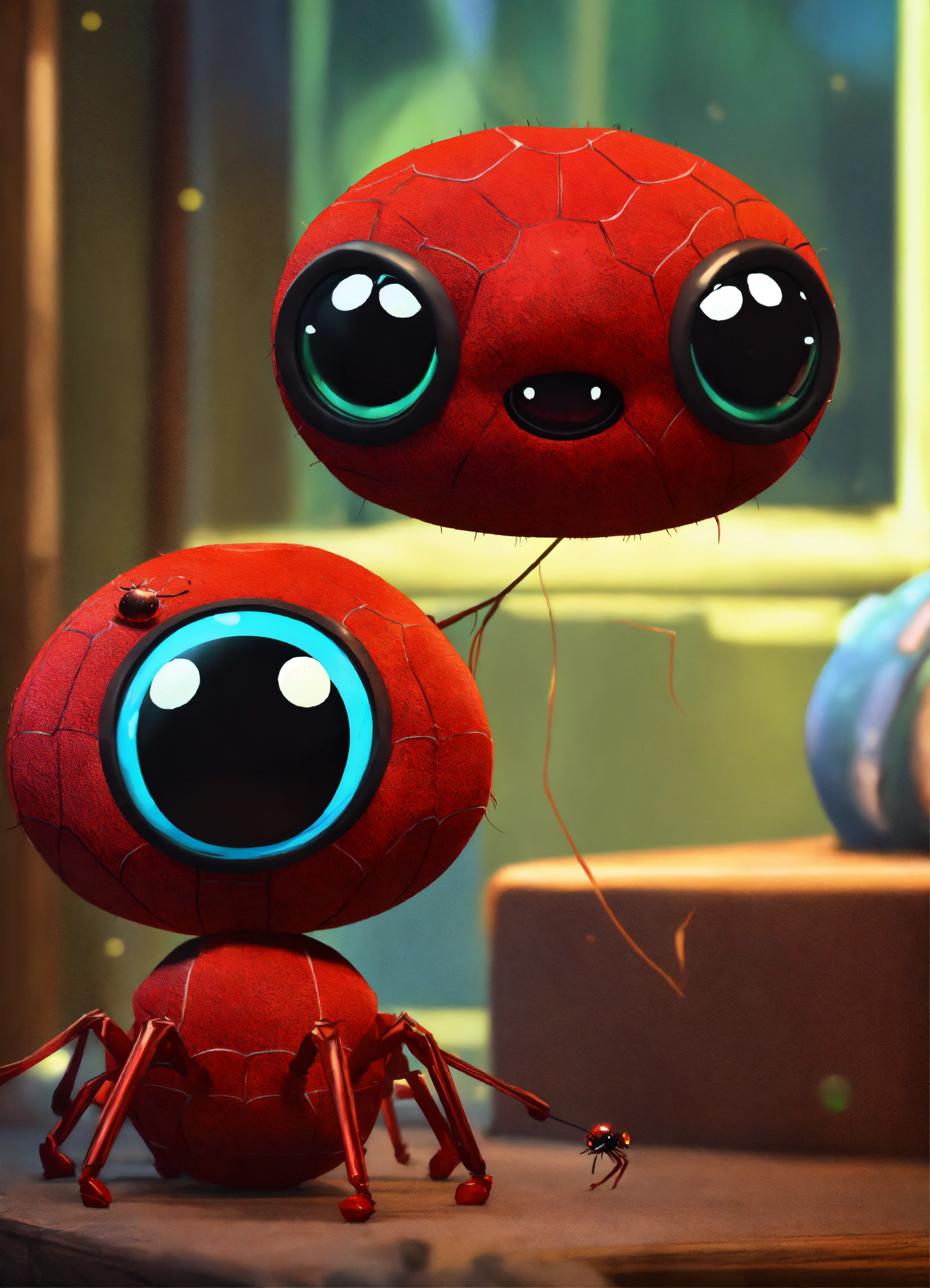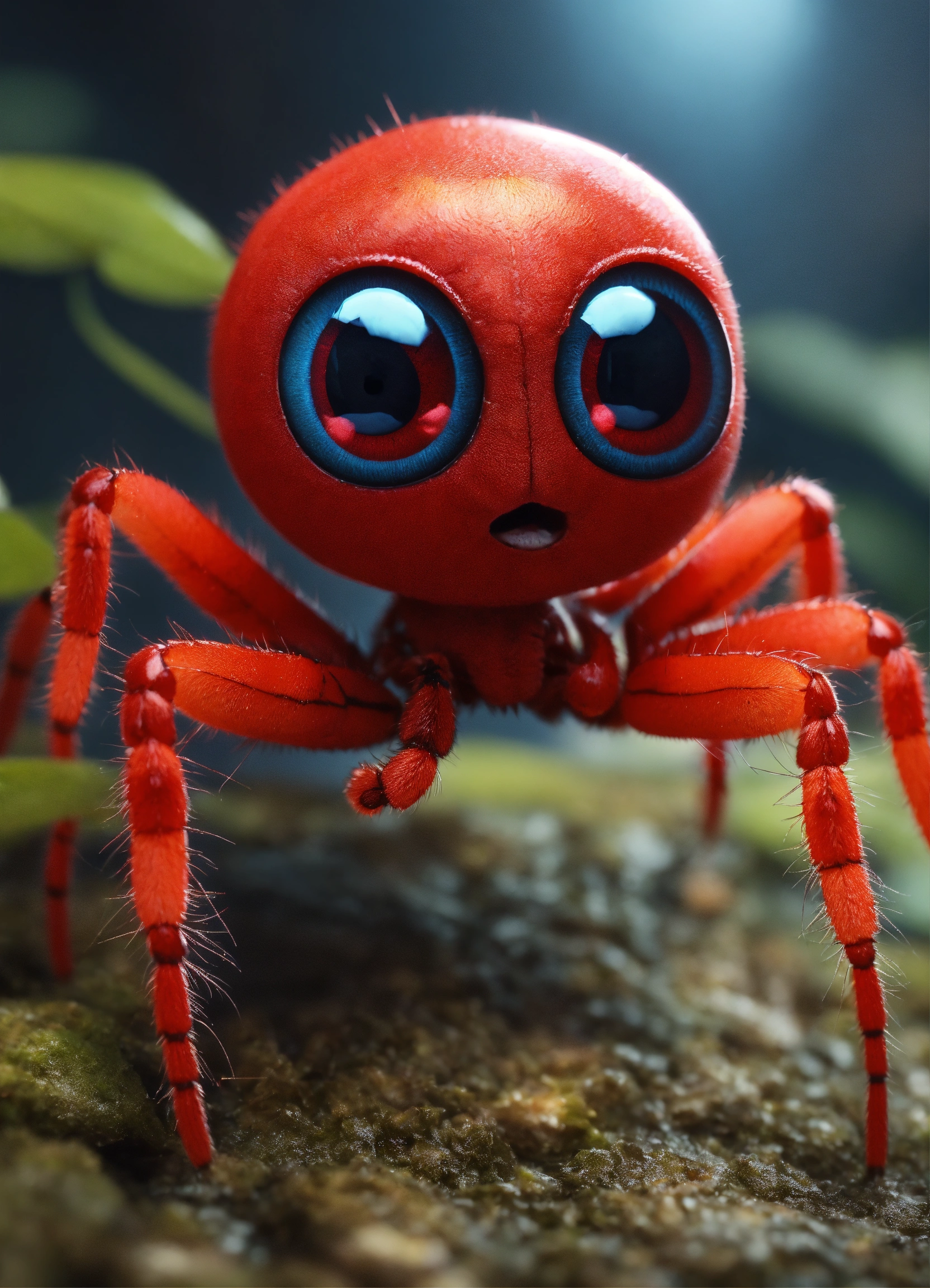 A cute all red baby spider with big eyes