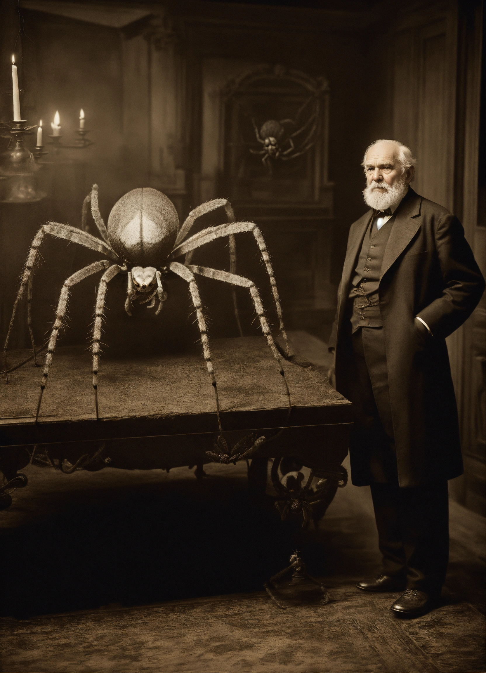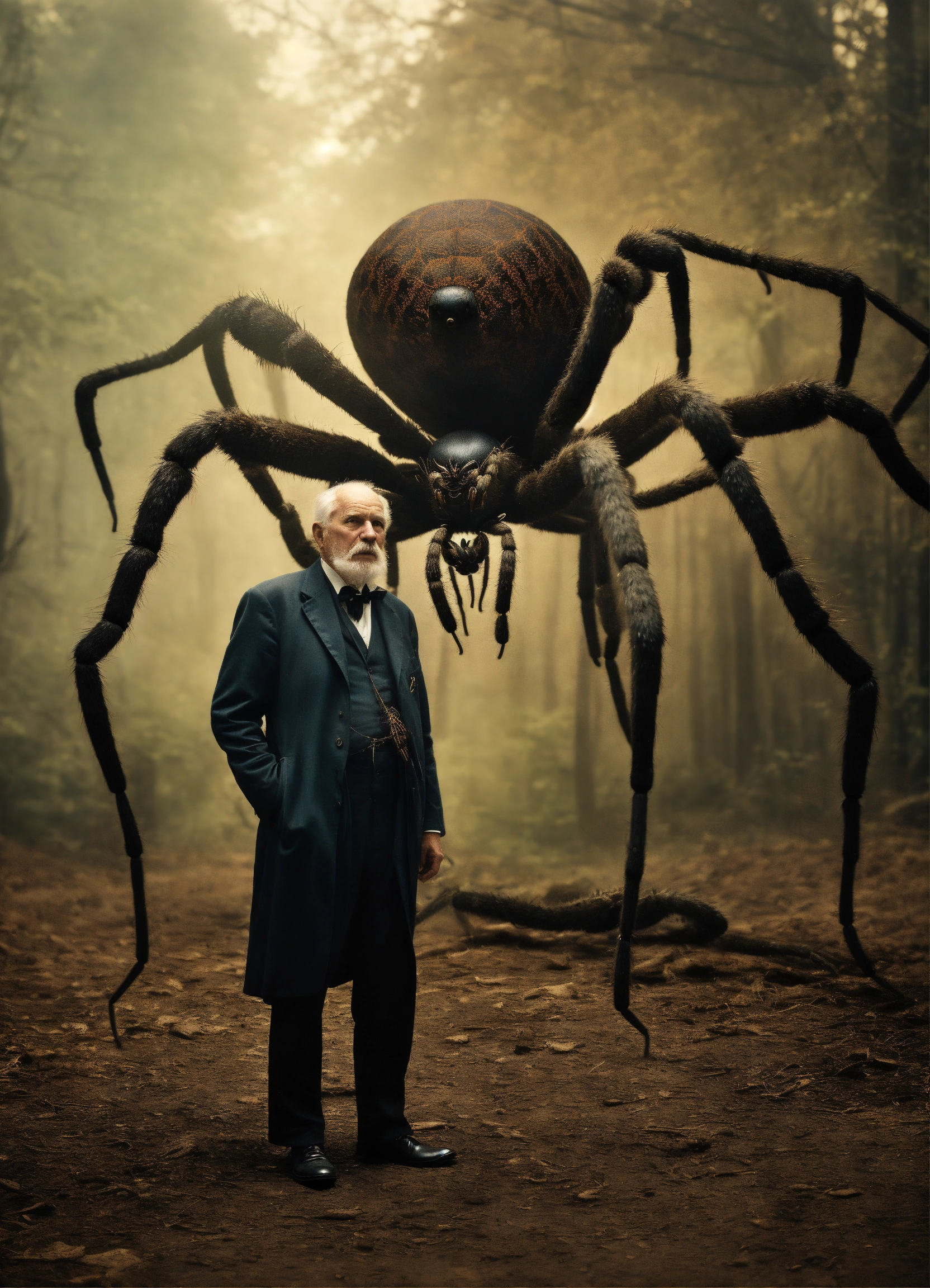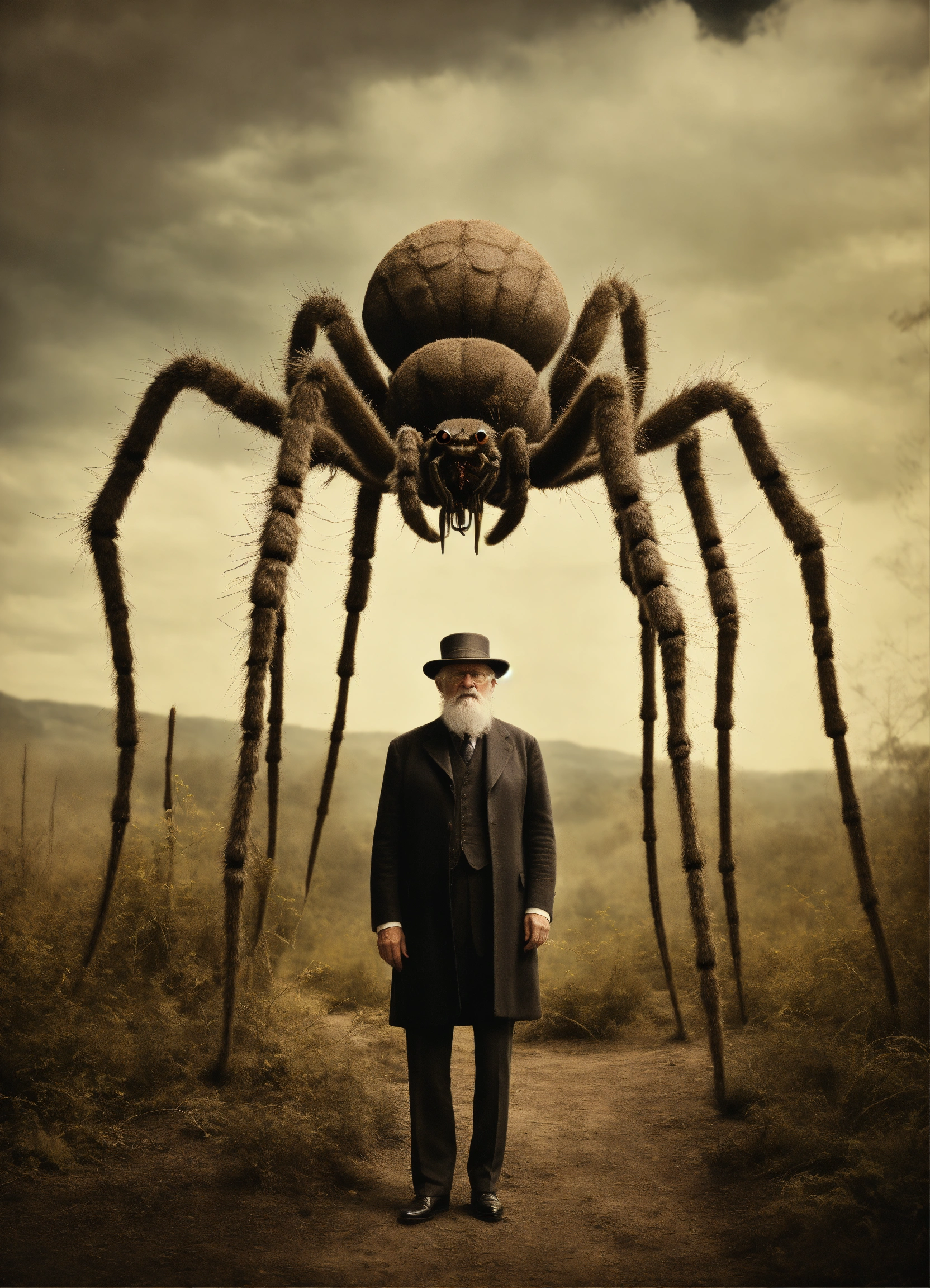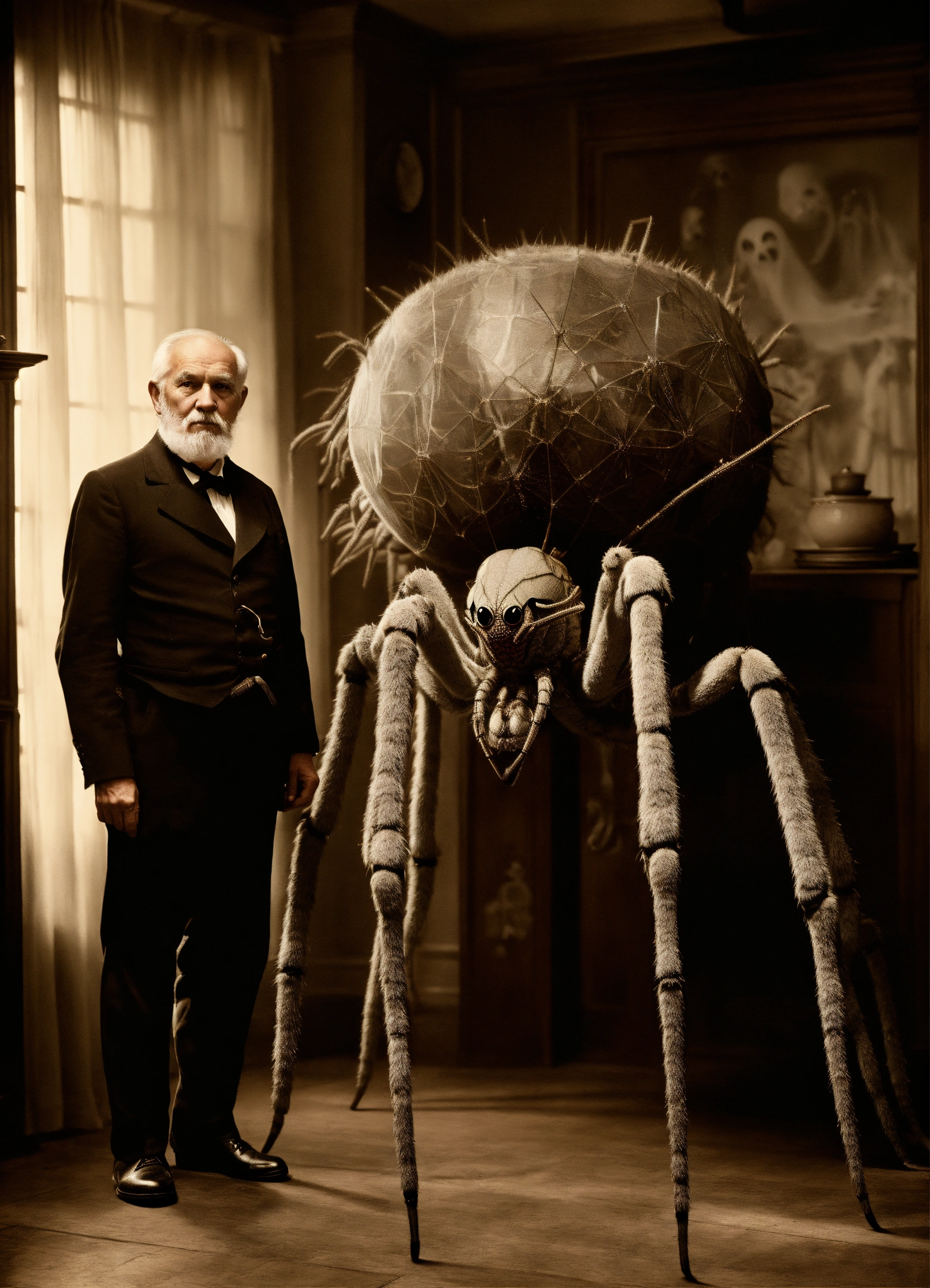 Old man standing next to a giant spider monster, in the style of contemporary vintage photography, necronomicon illustrations, tabletop photography, 1890, hyperrealistic animal portraits, ghostly presence, whirring contrivances