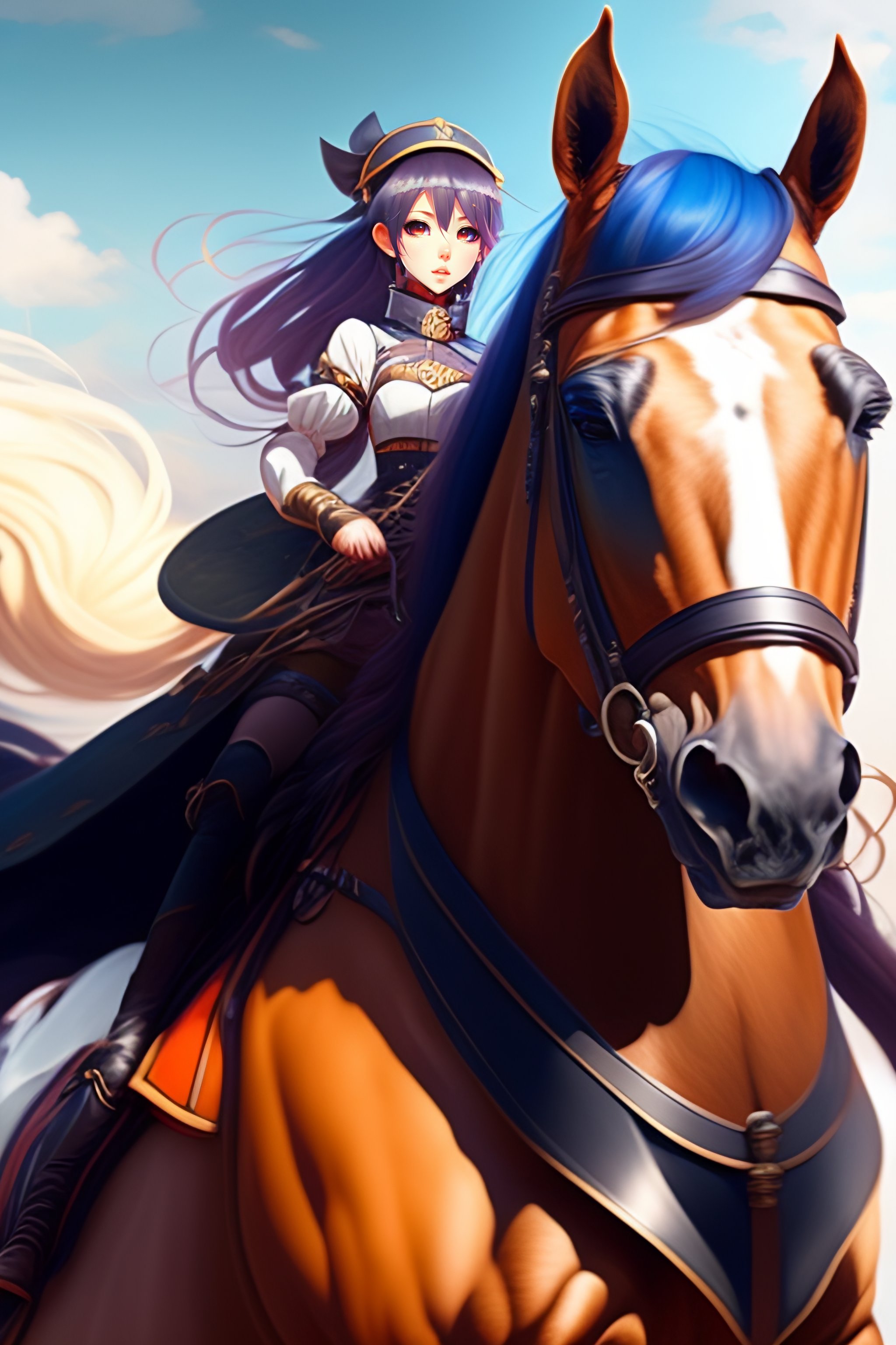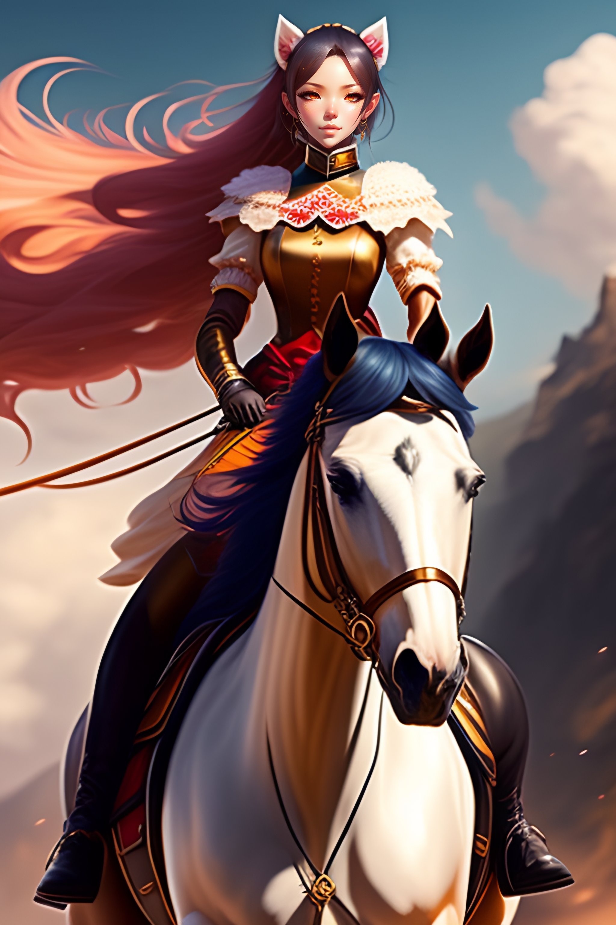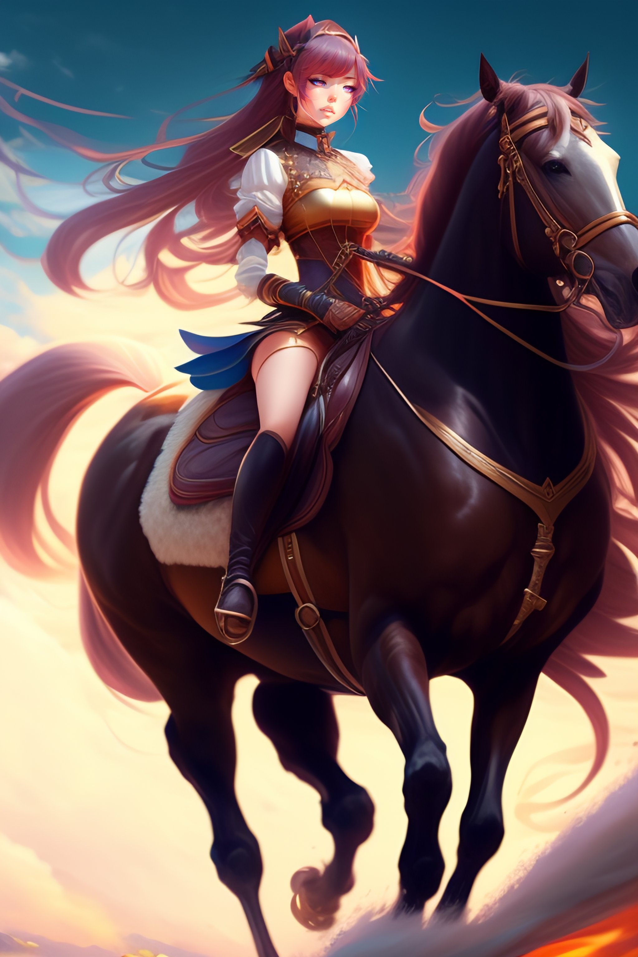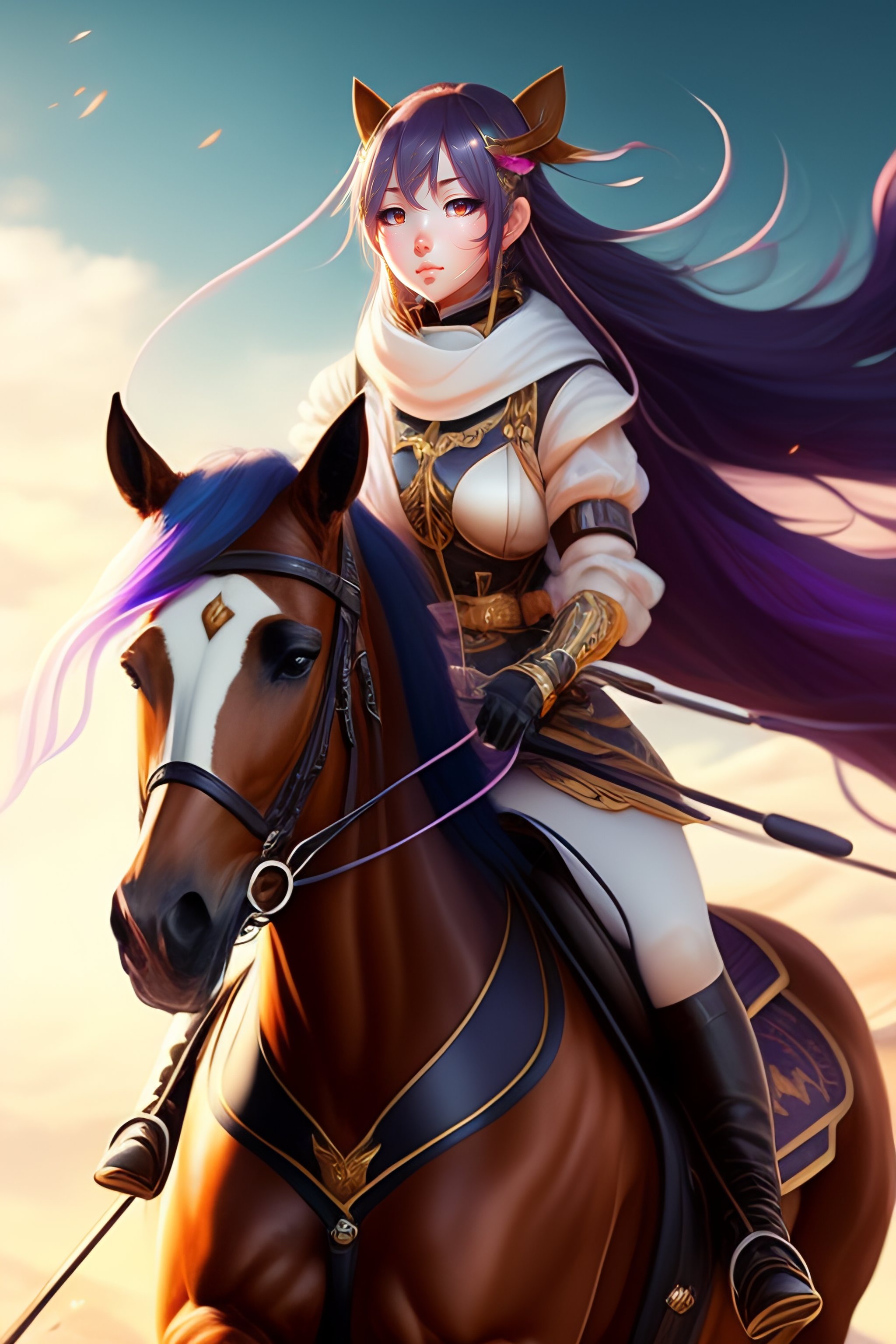 A very beautiful anime girl riding a horse, cinematic lightning, medium shot, mid-shot, highly detailed, trending on artstation, art by stanley artgerm lau, wlop, rossdraws, james jean, andrei riabovitchev, marc simonetti, and sakimichan