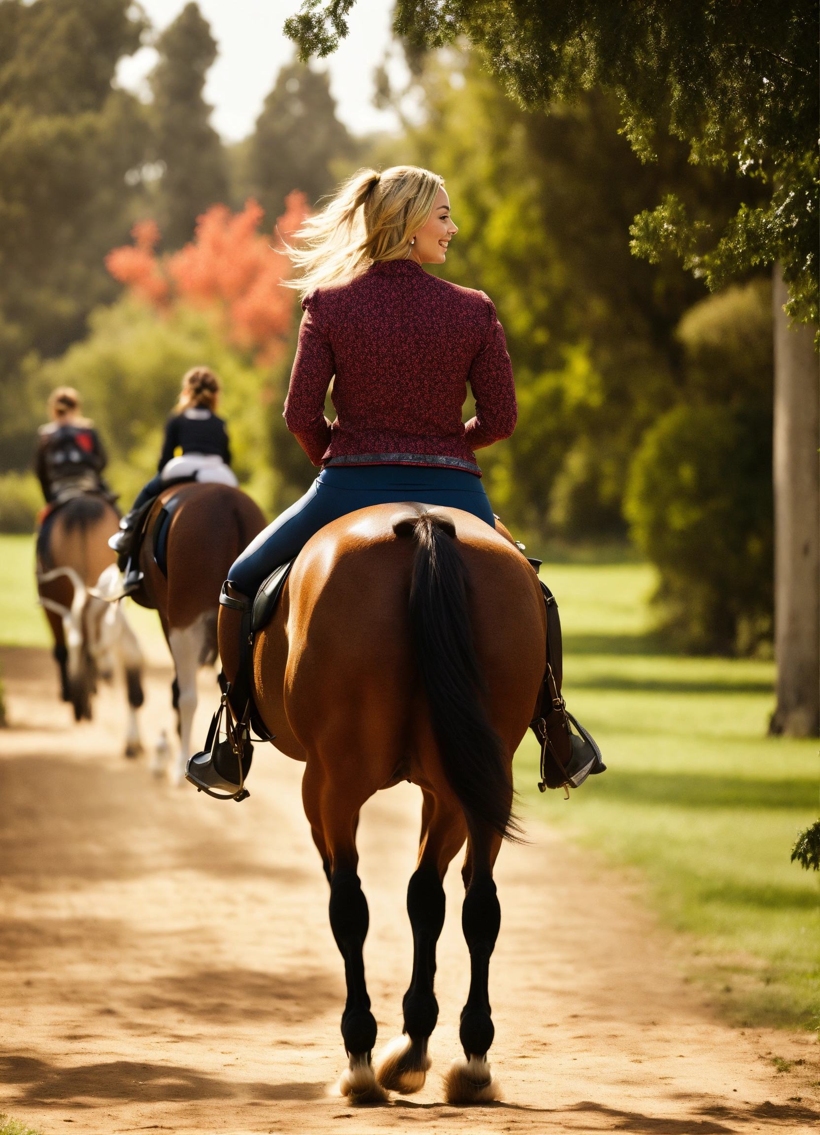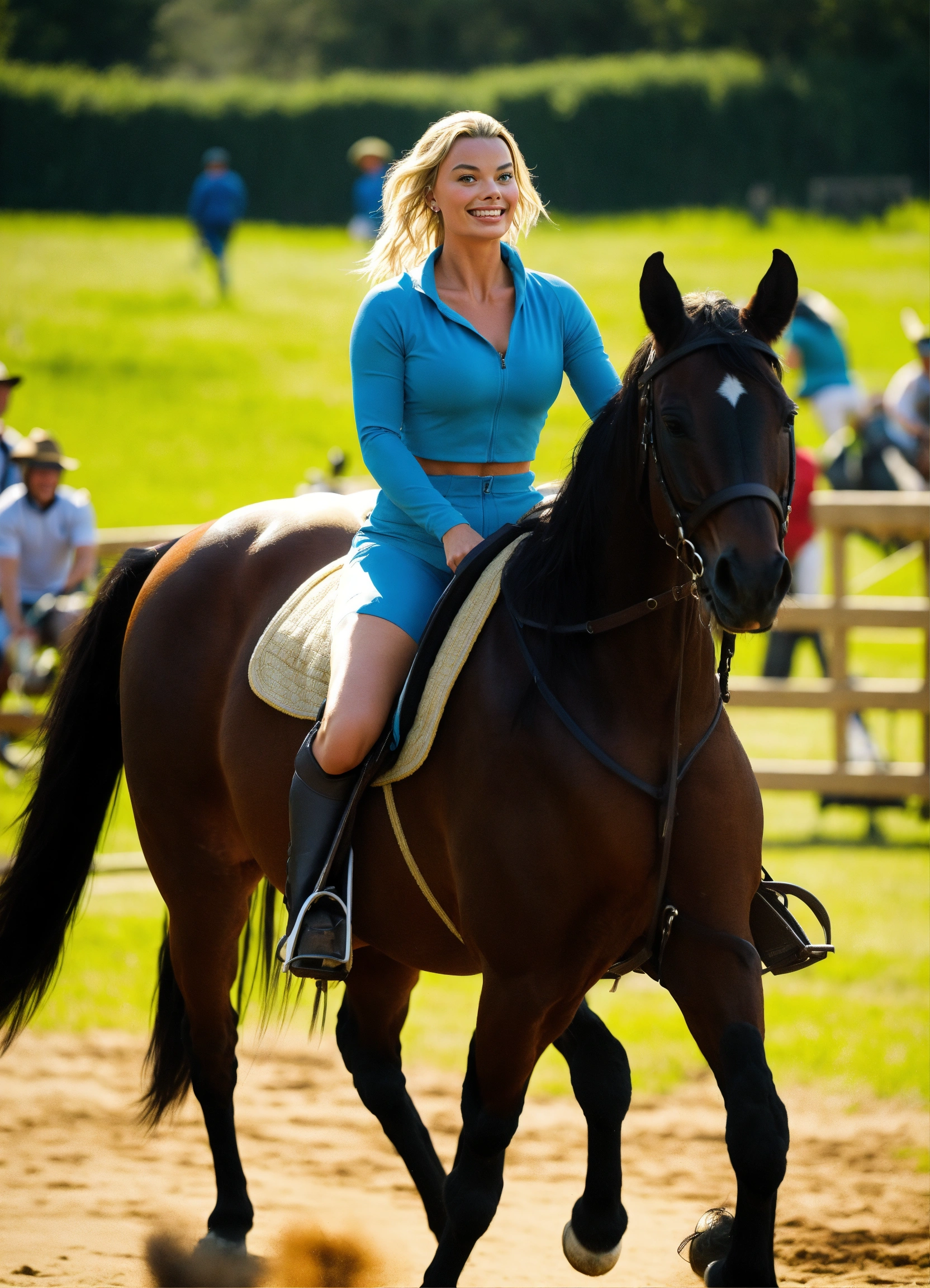 Margot robbie riding on horse, blonde hair, movie set, smiling face, black hair, free legs, plus size, exercise, workout, rear, from behind, backshot