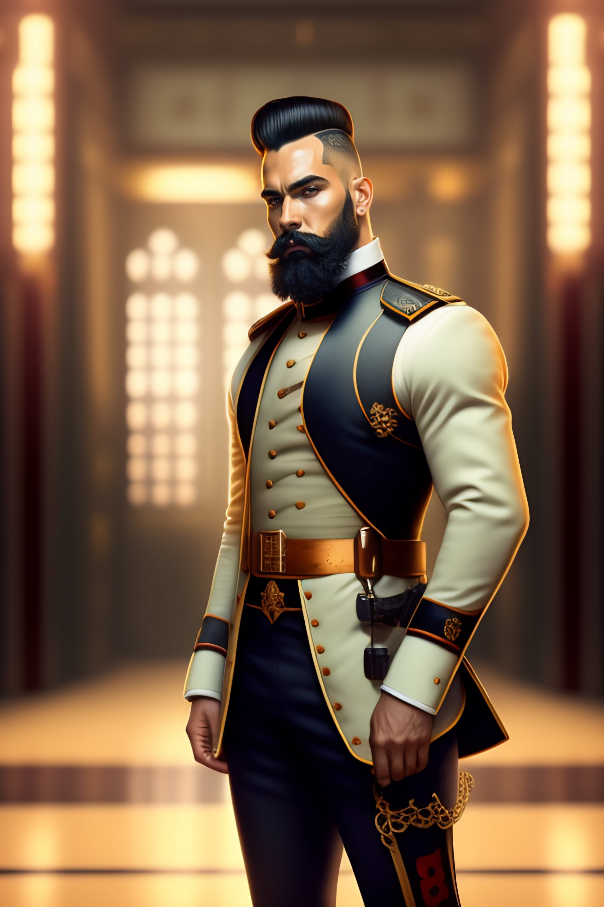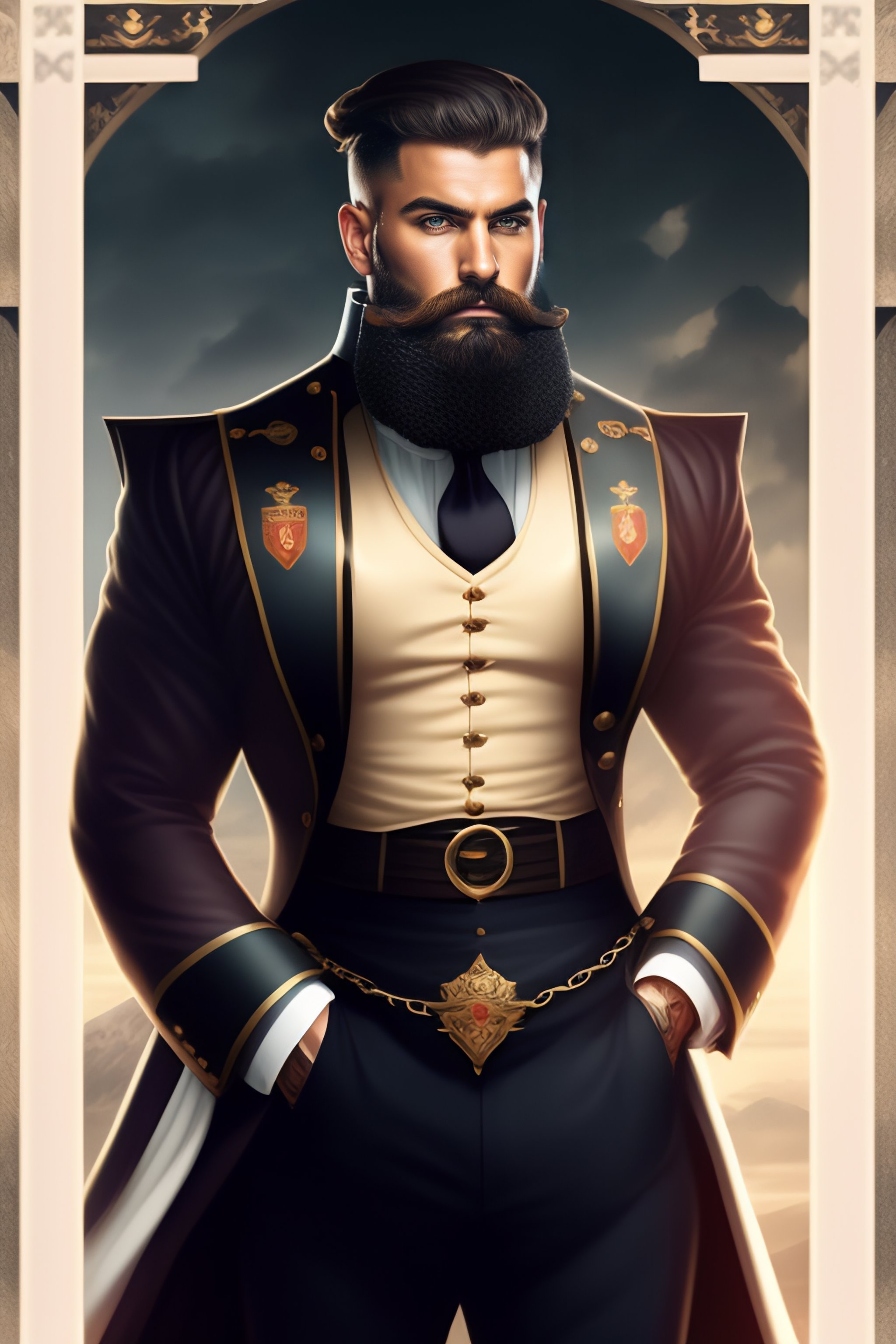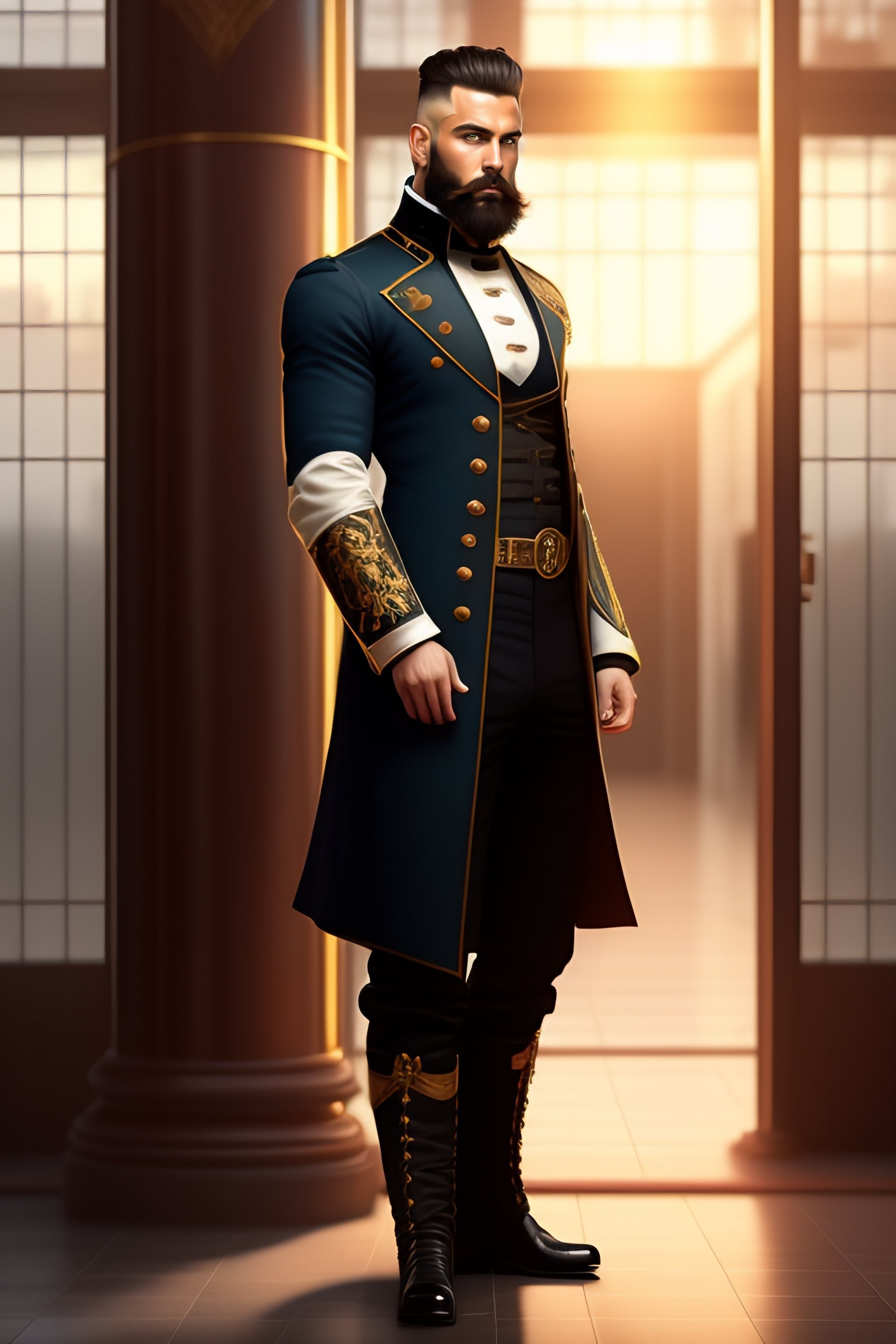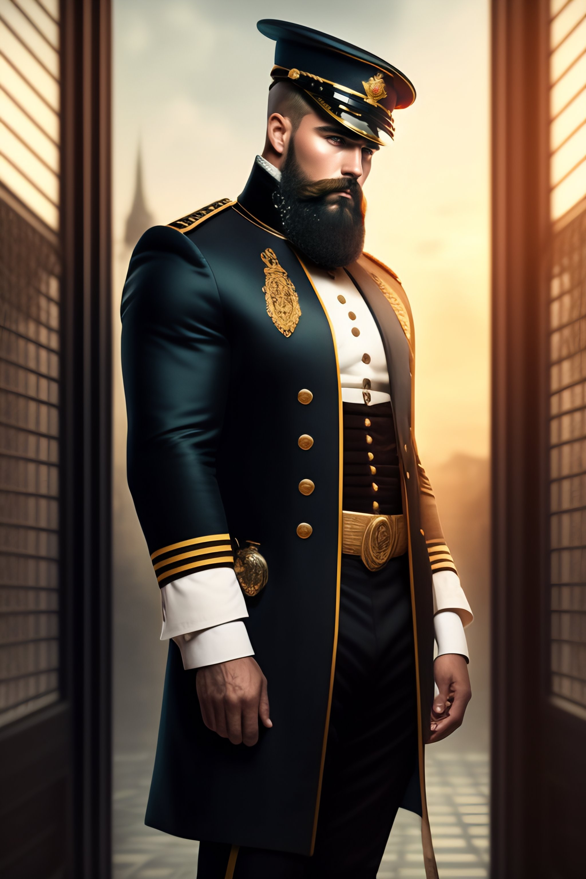 Fullbody image, wide view, european prison guard, standing, evil,fierce, holding handcuffs, with beard, he is in prison, victorian era, anime aesthetic