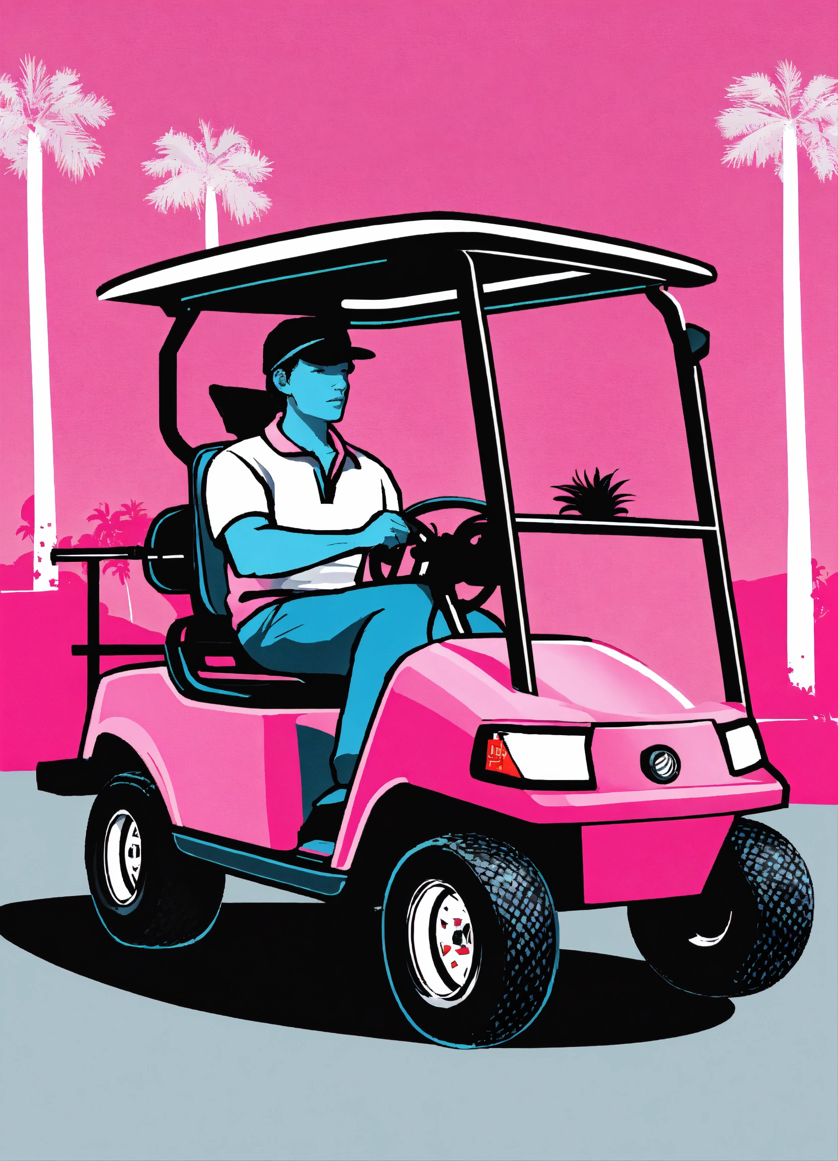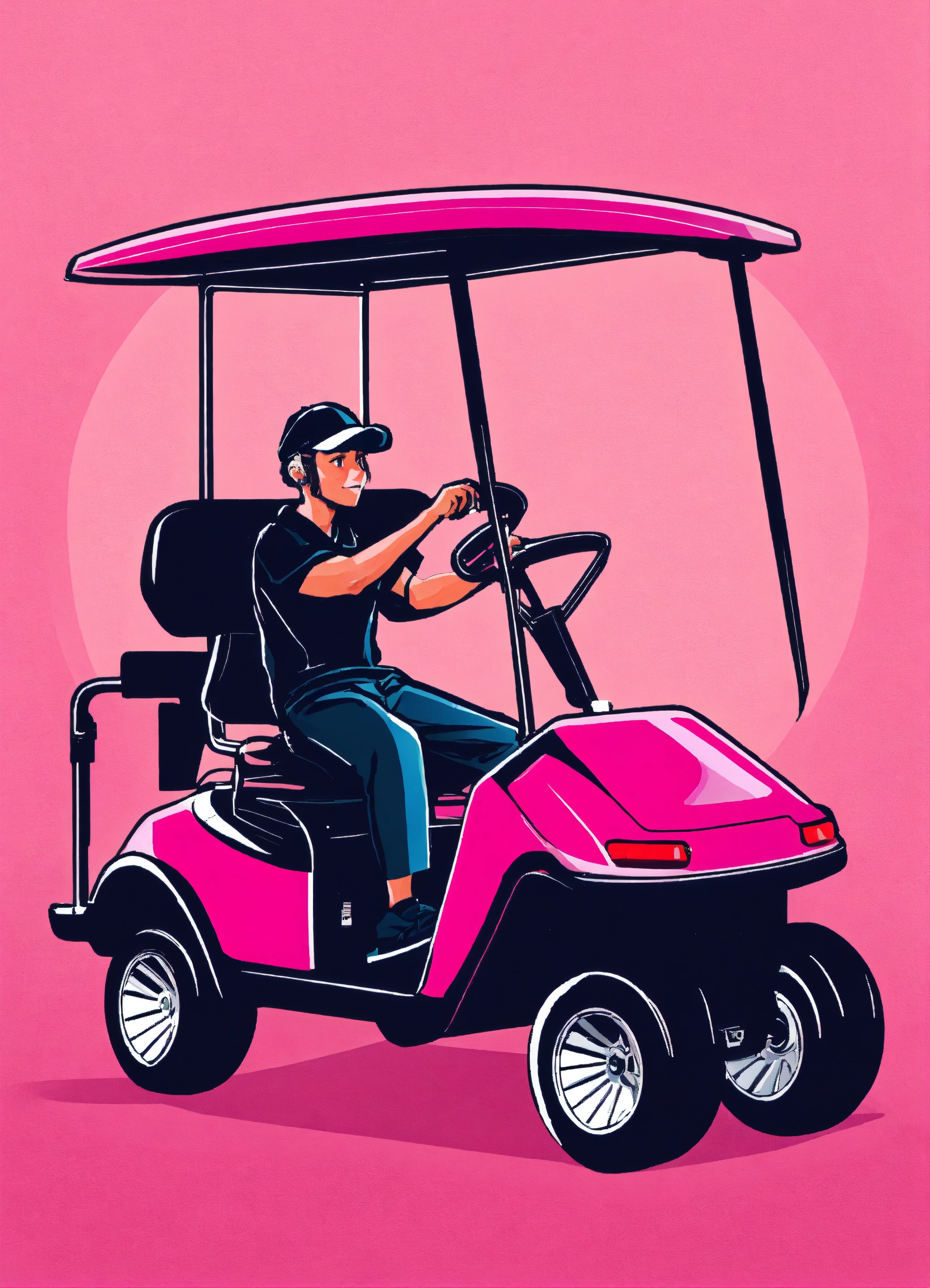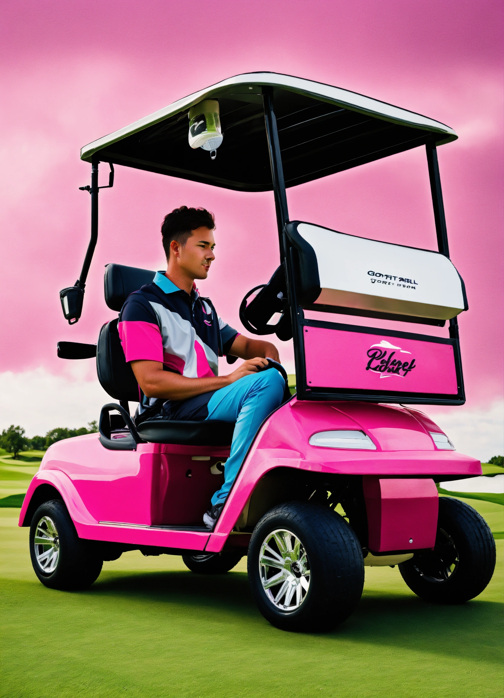 A golfer in a pink golf cart as a logo for the company name pink golf kart