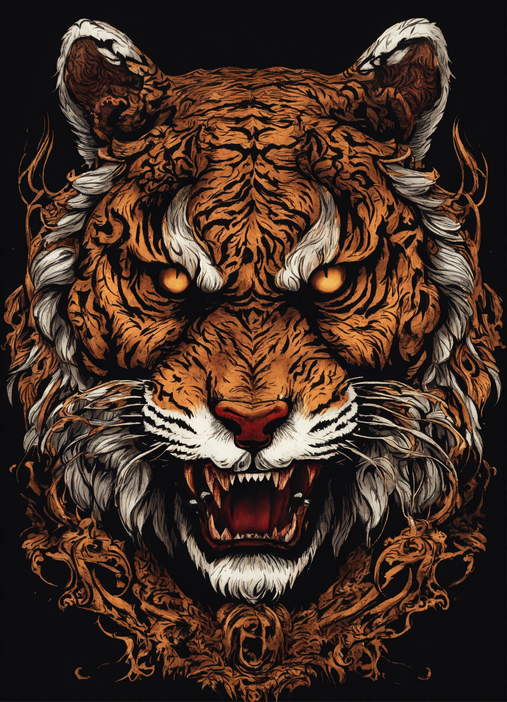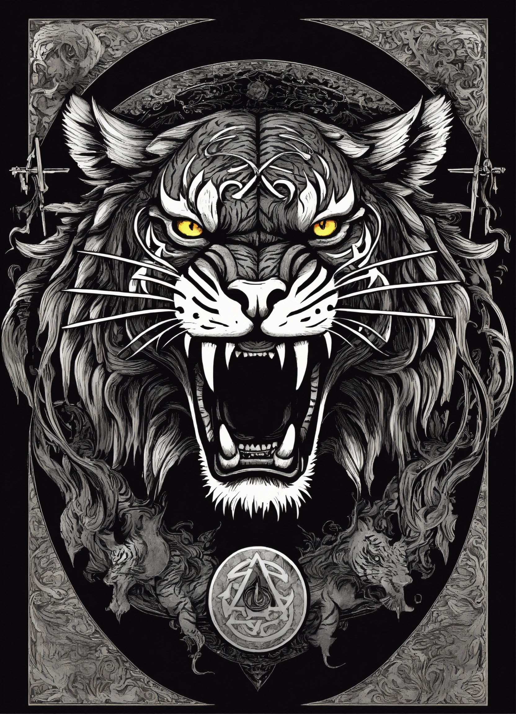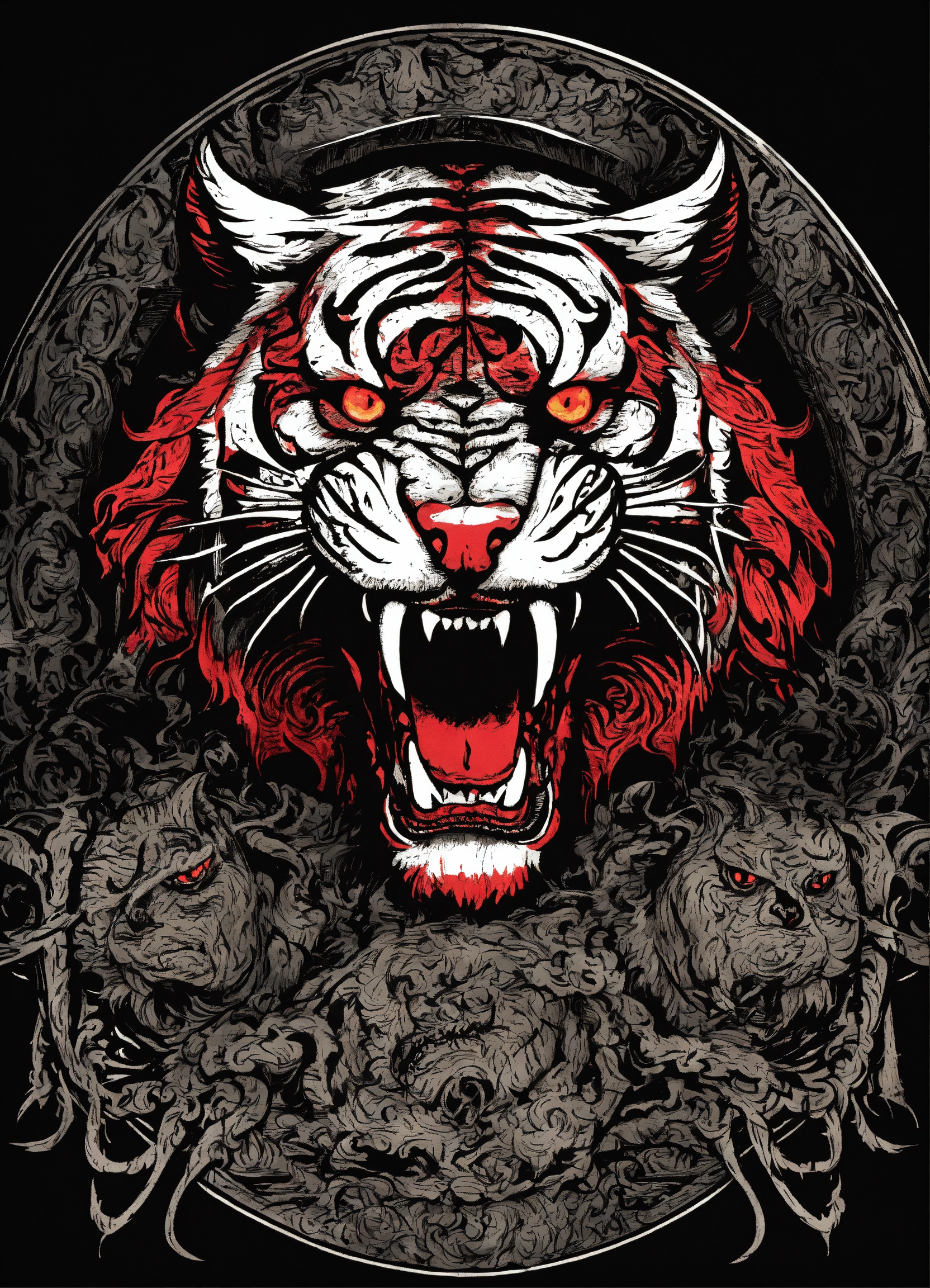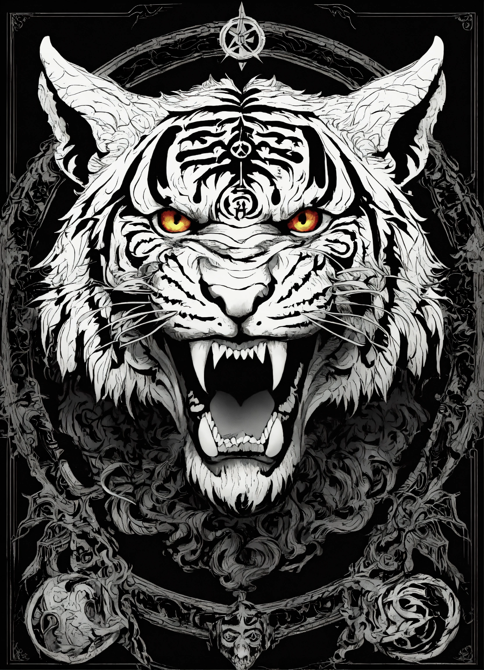 Gothic style, satanic symbols, angry curved tiger, strange, creepy, scary, thriller, fear, highly detailed, gothic style, tshirt design, black background