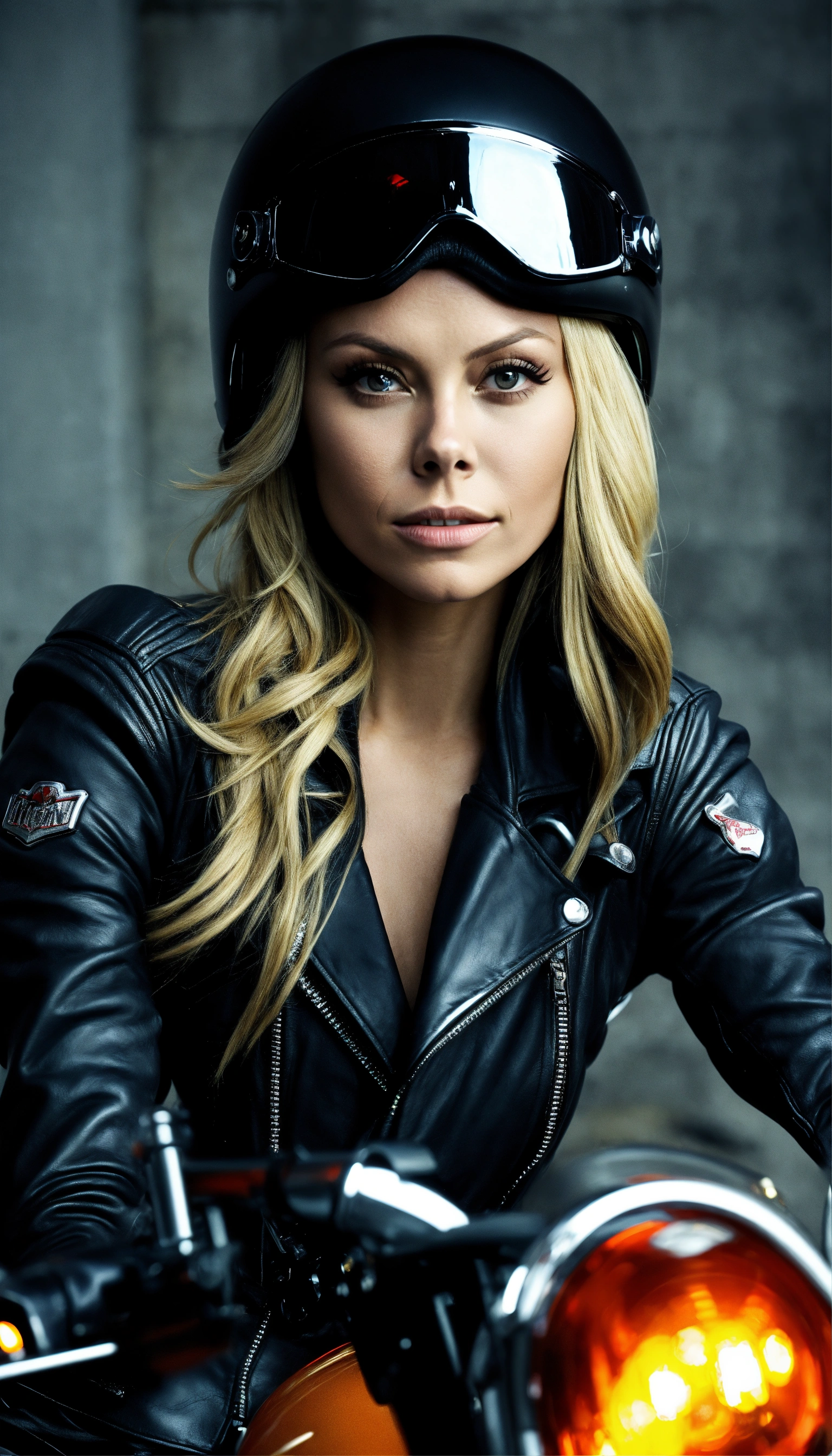 Laura vandervoort dressed as a motorcyclist