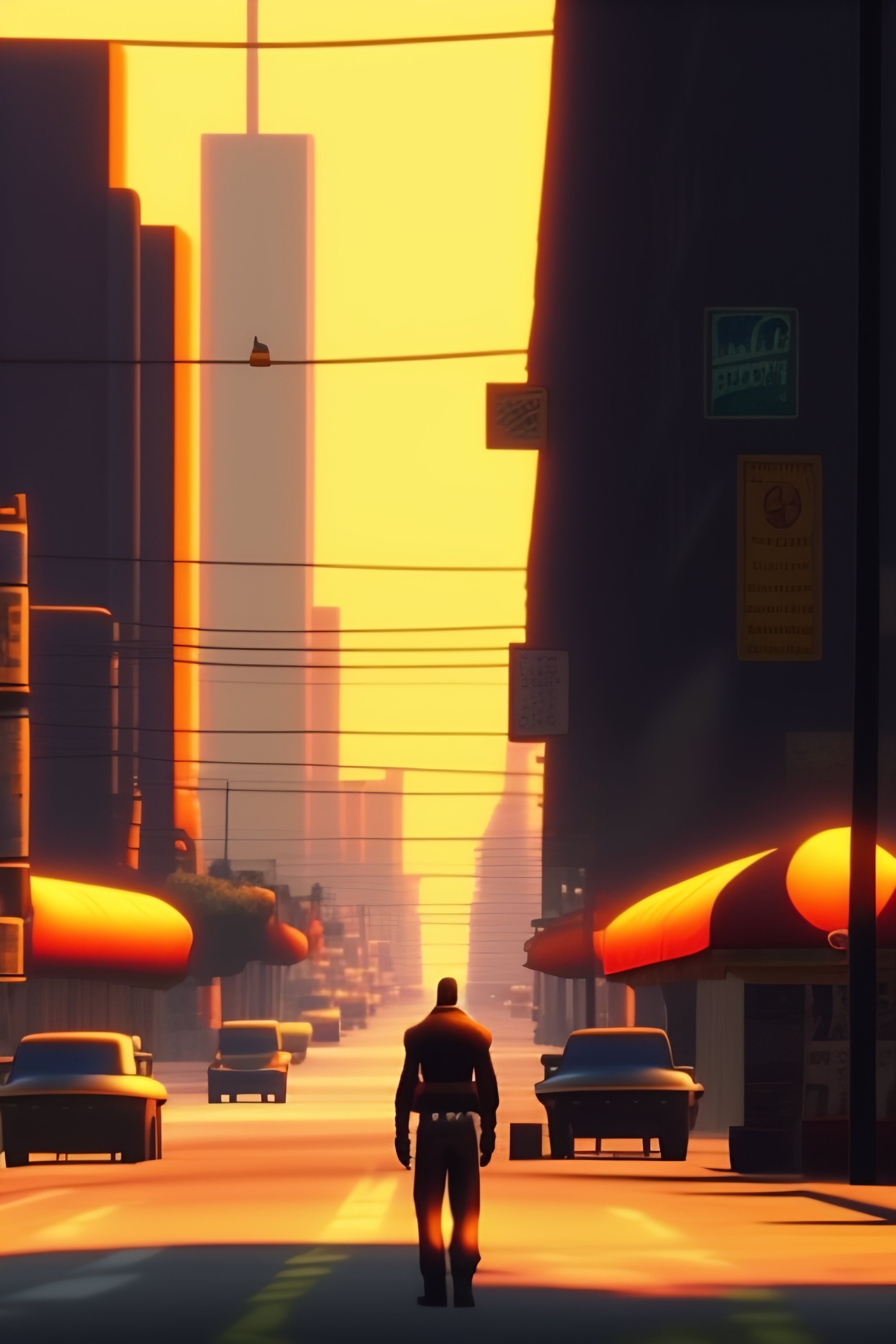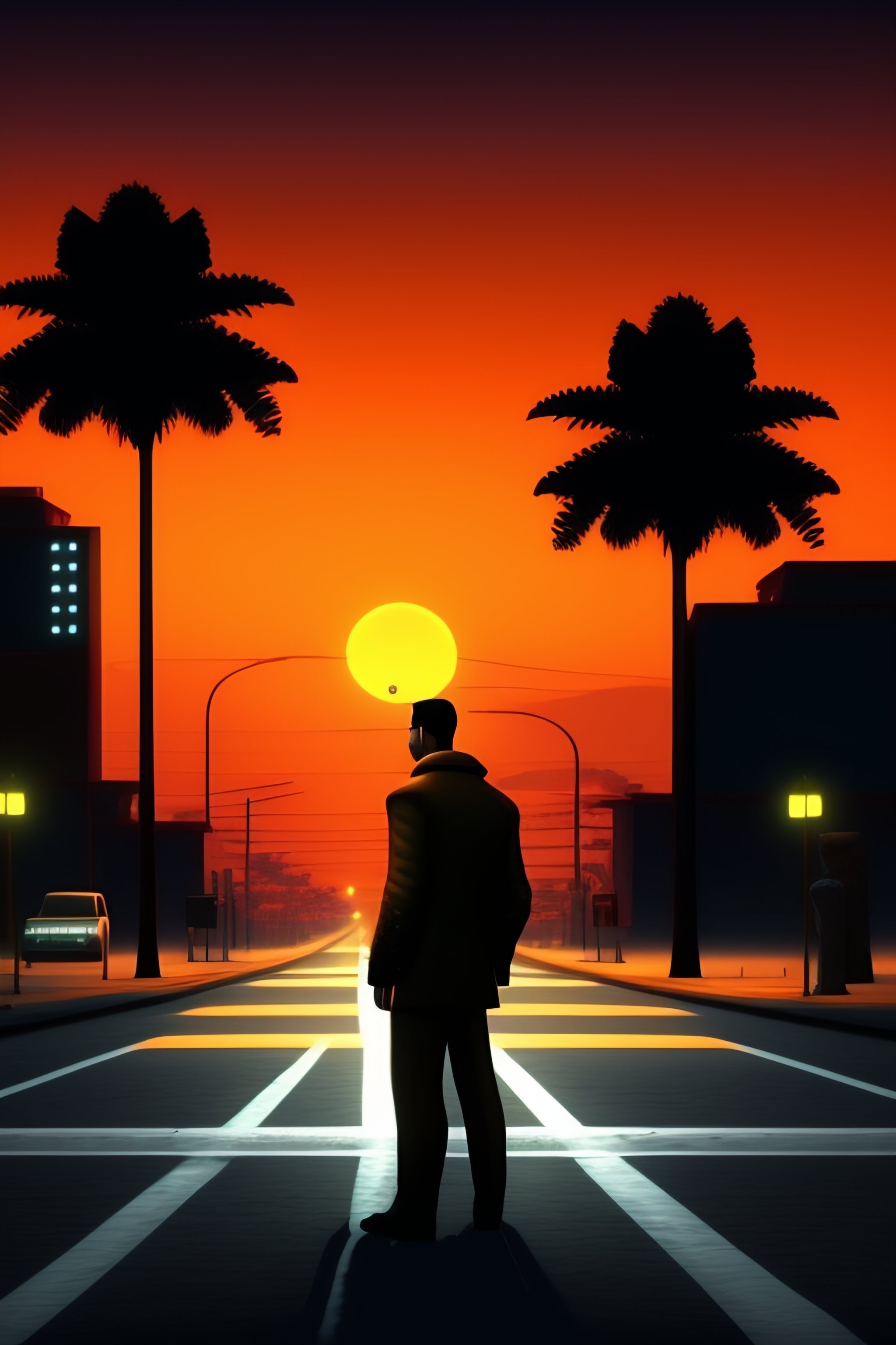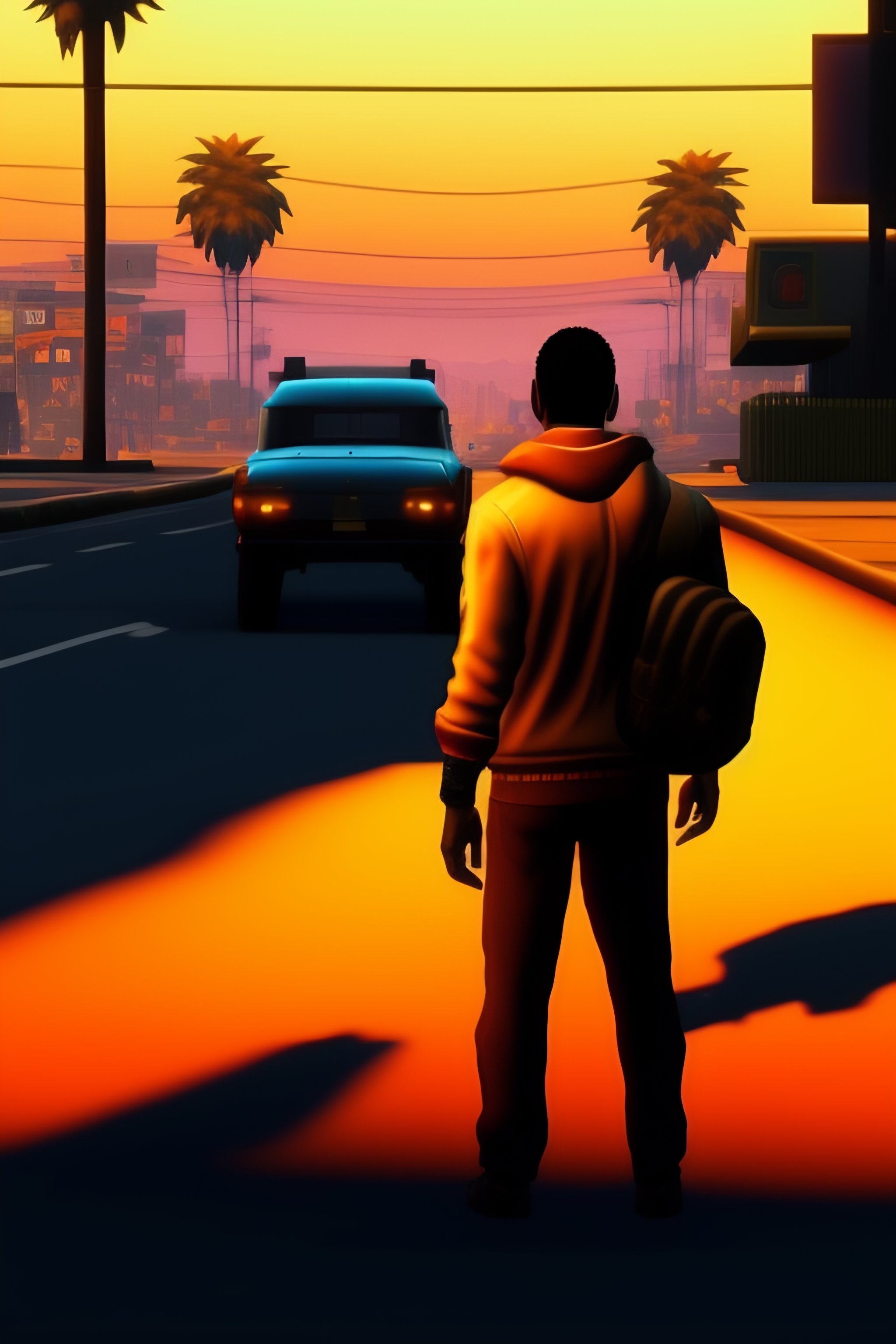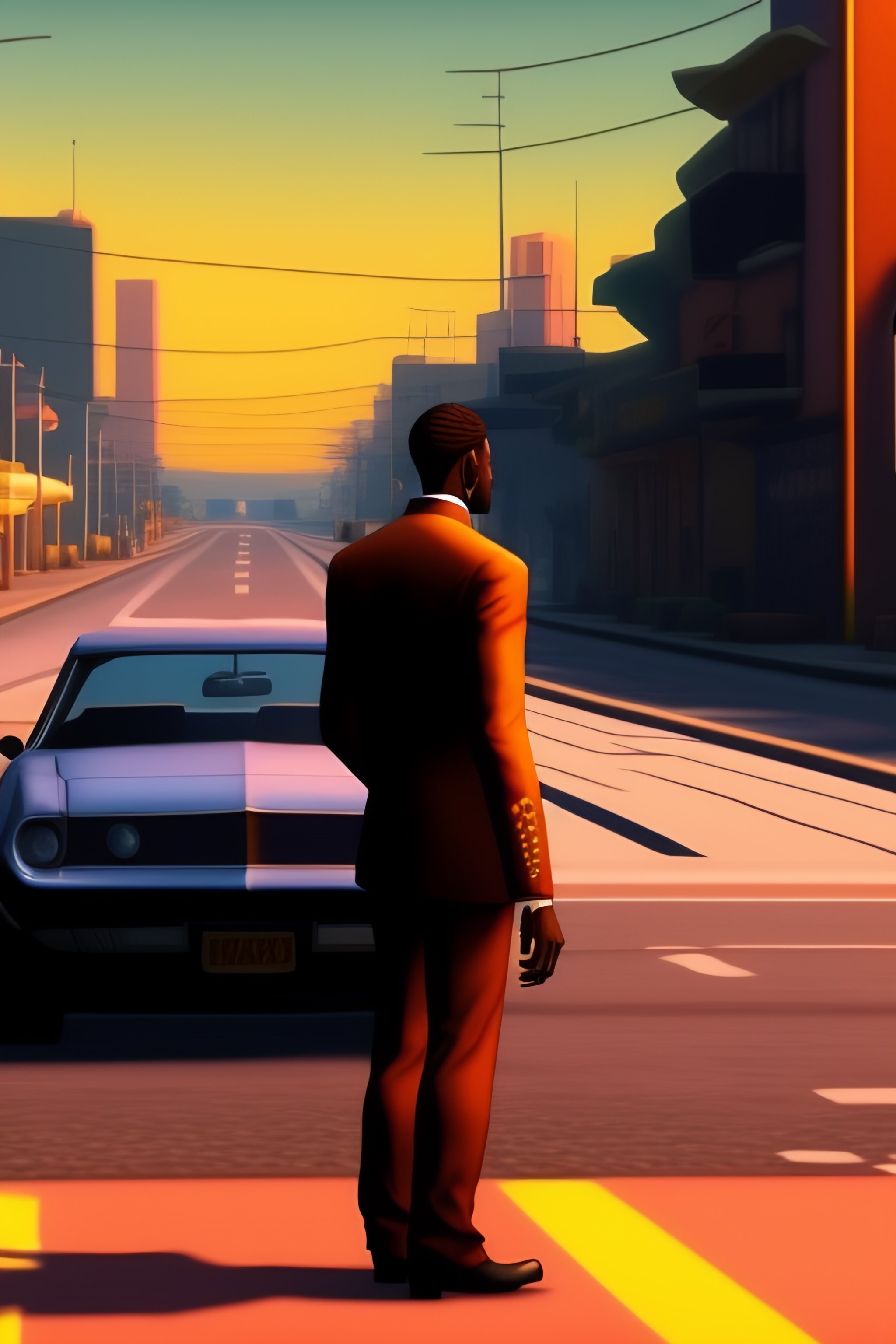 A man standing in the middle of a street, in los santos, screenshot from the ps2 version of gta san andreas, orange sky