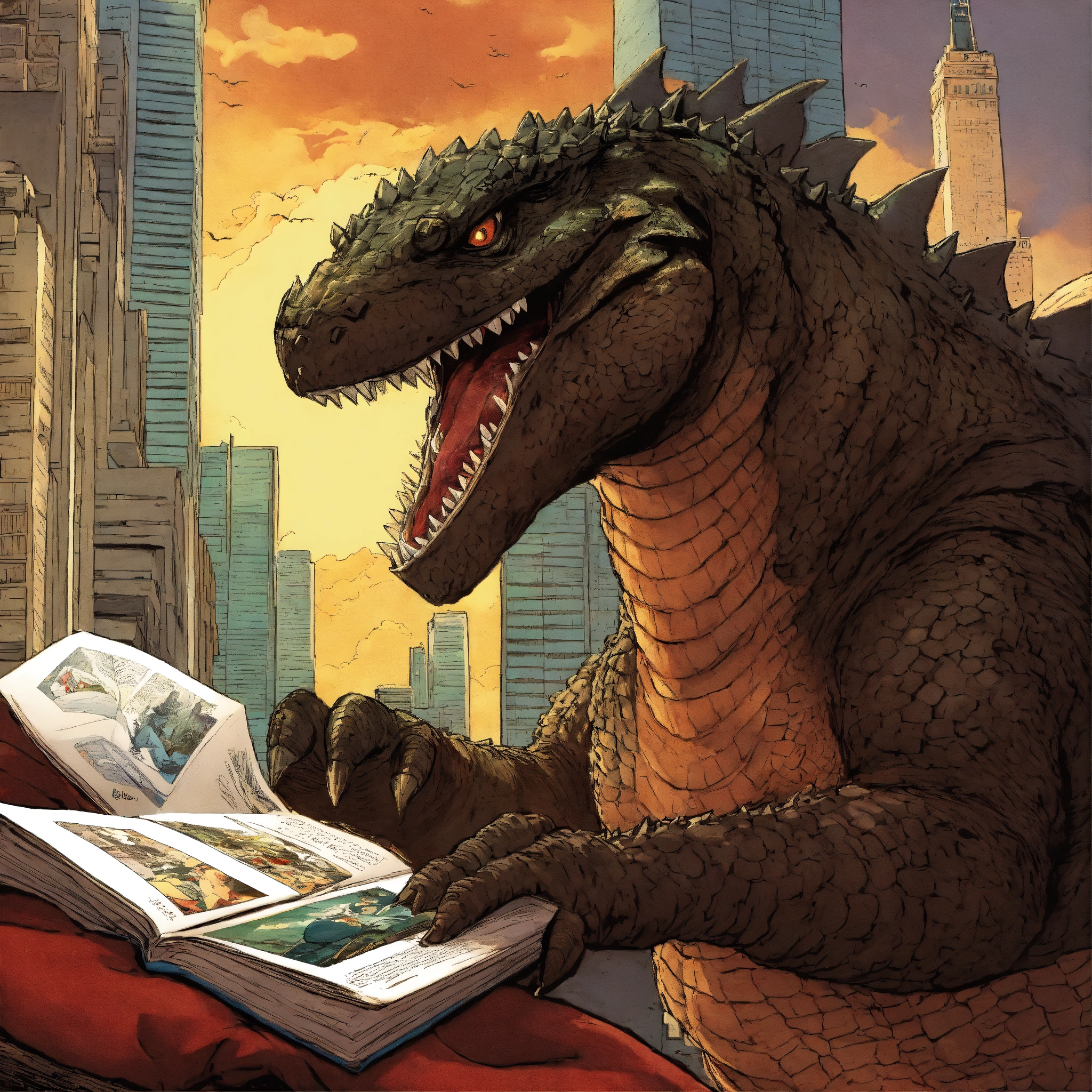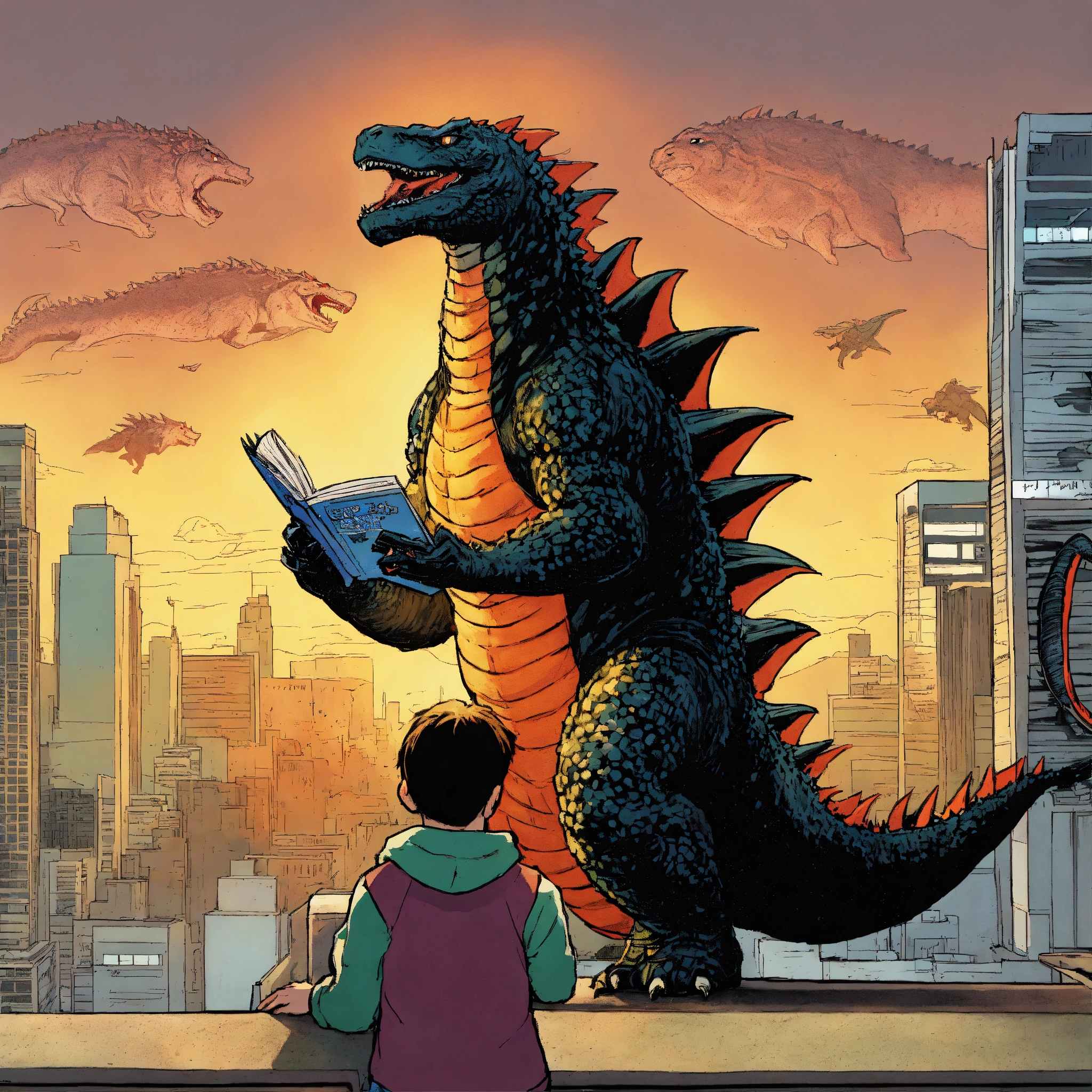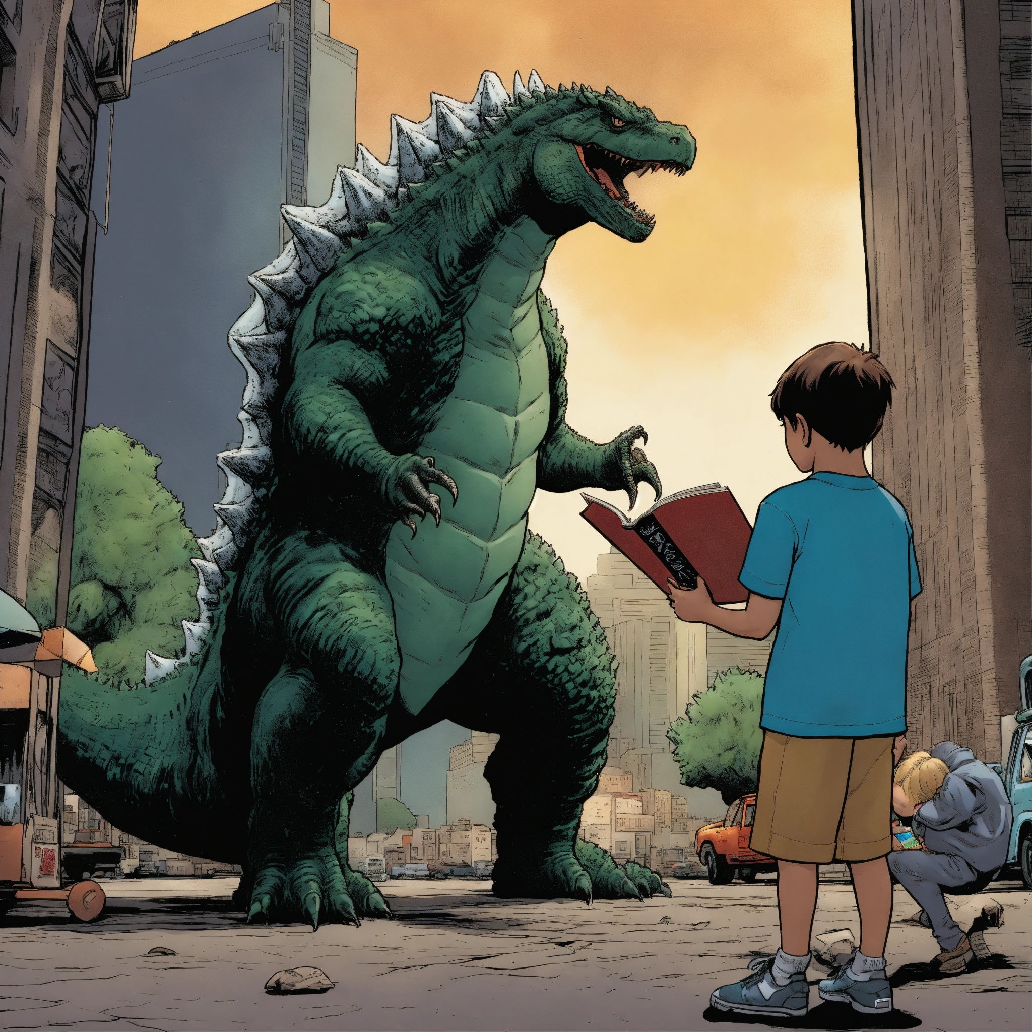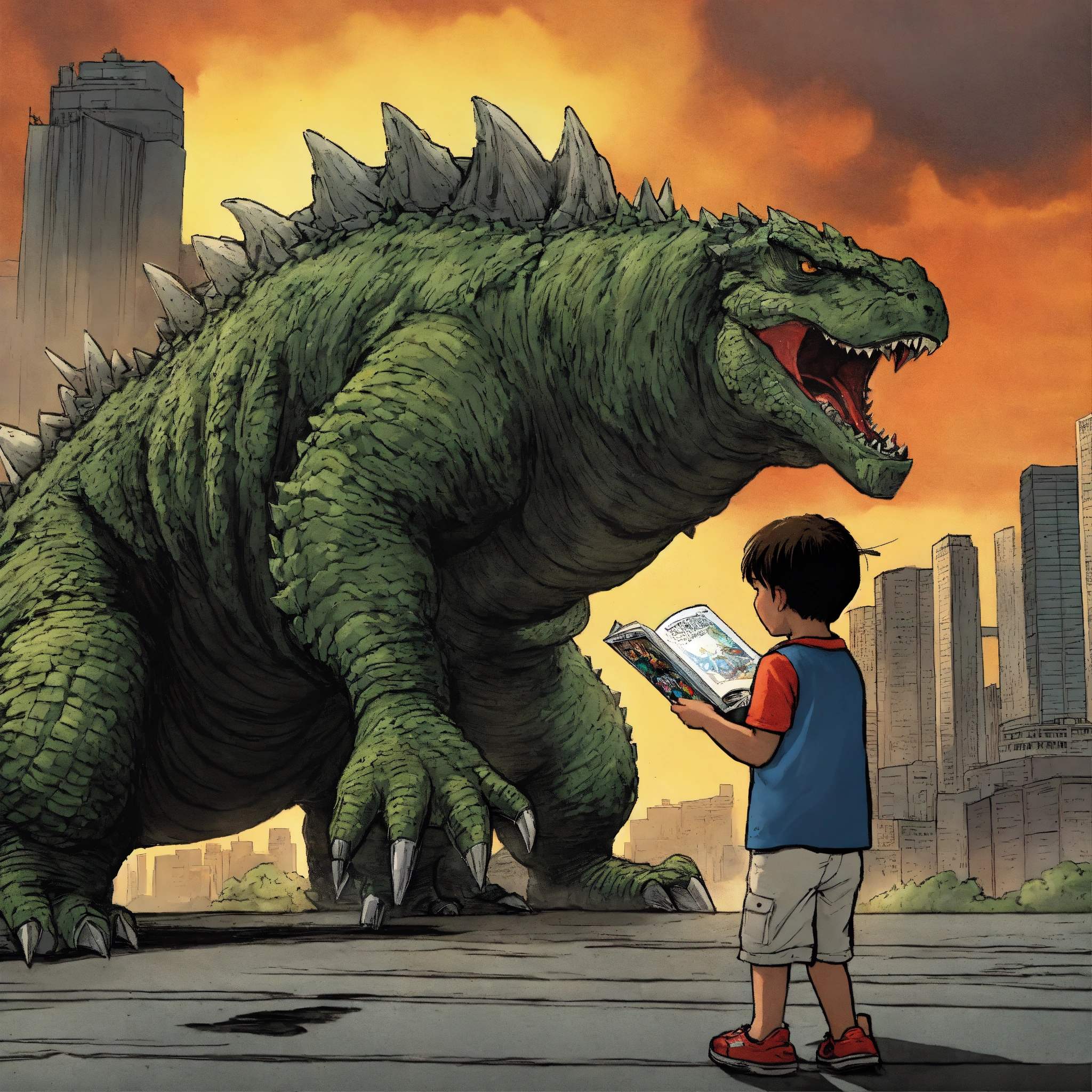 Kid reading a godzilla comic book coming to life