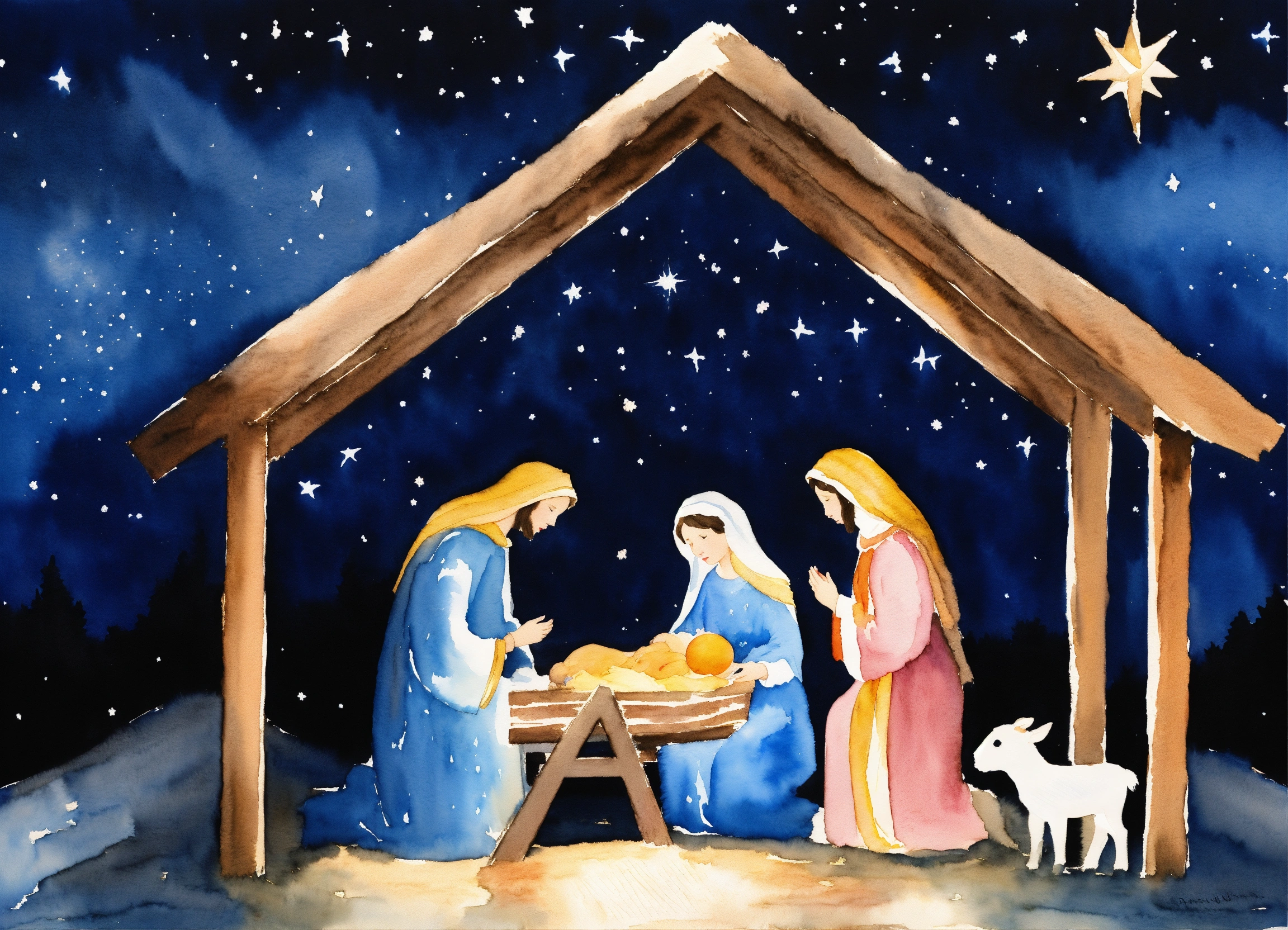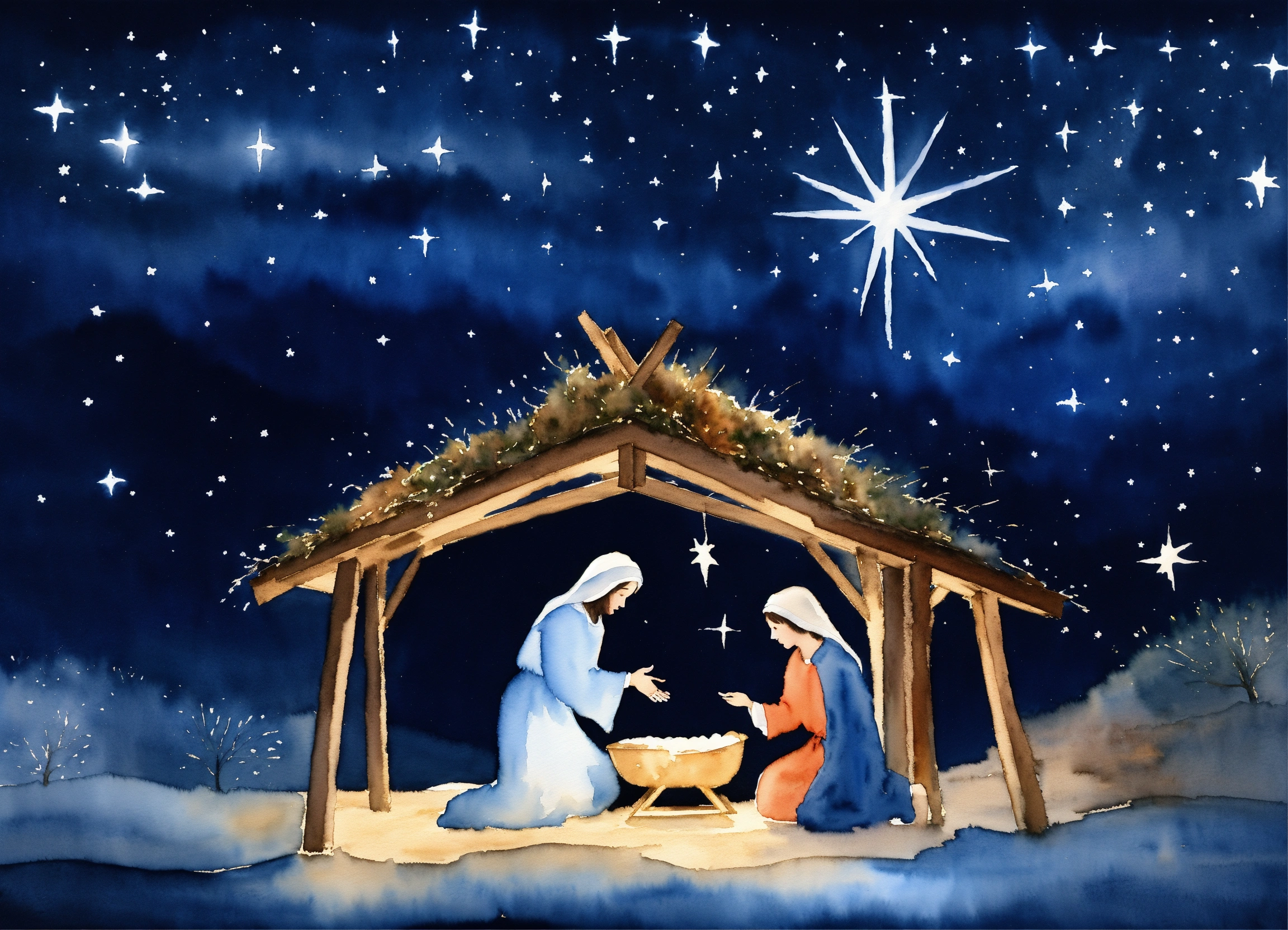 A watercolor of a traditional nativity scene with a dark blue starry sky in the background