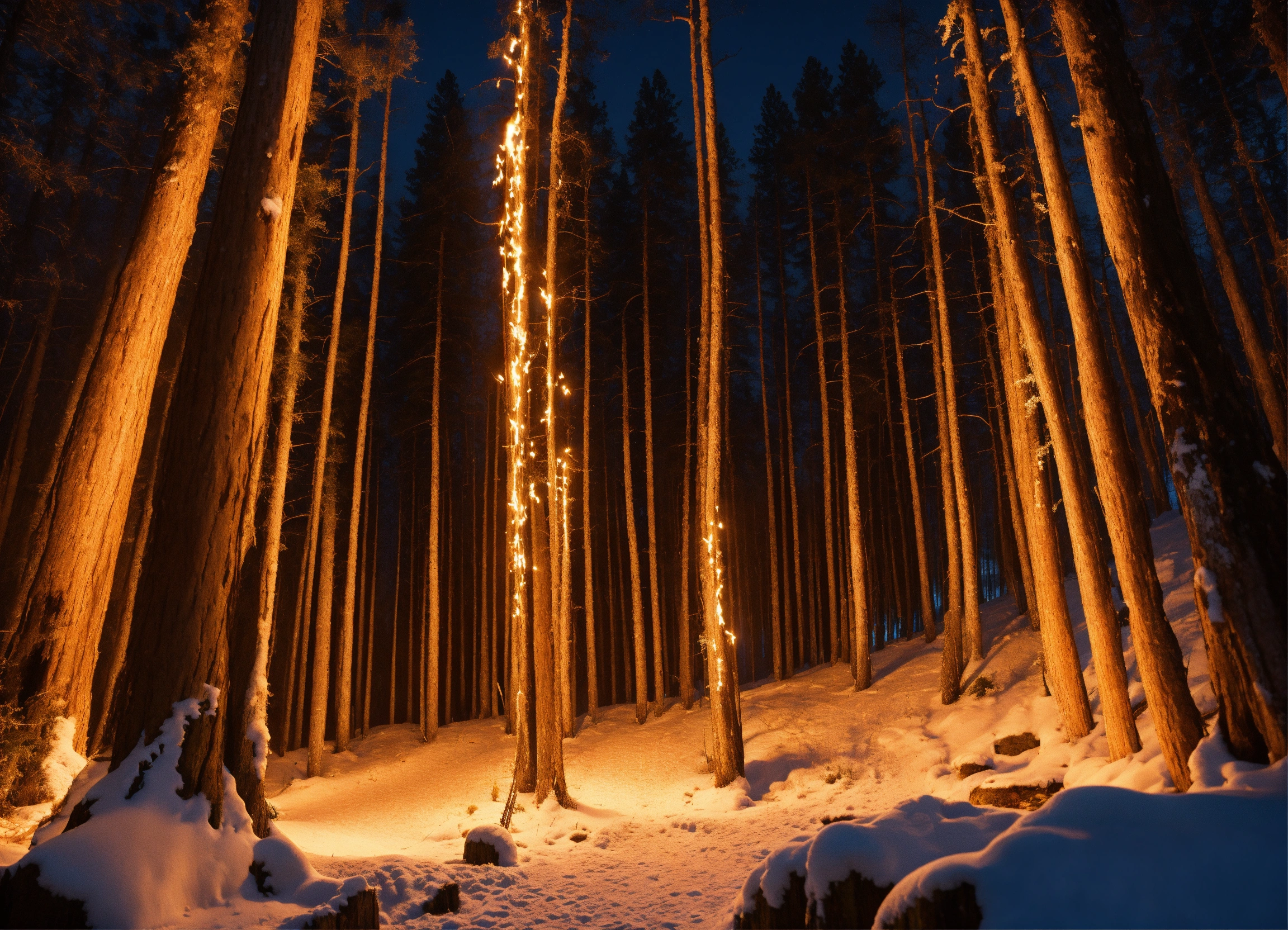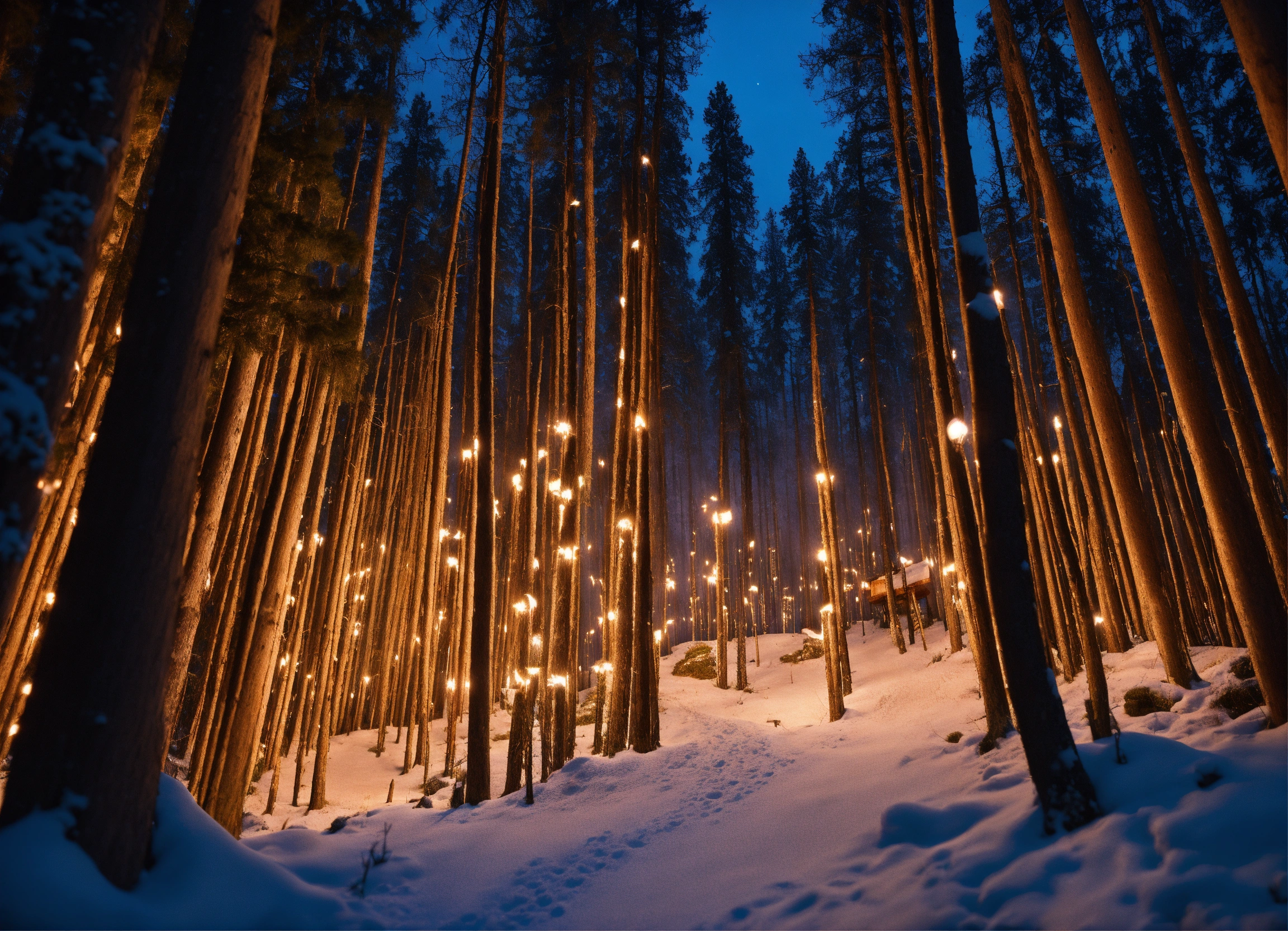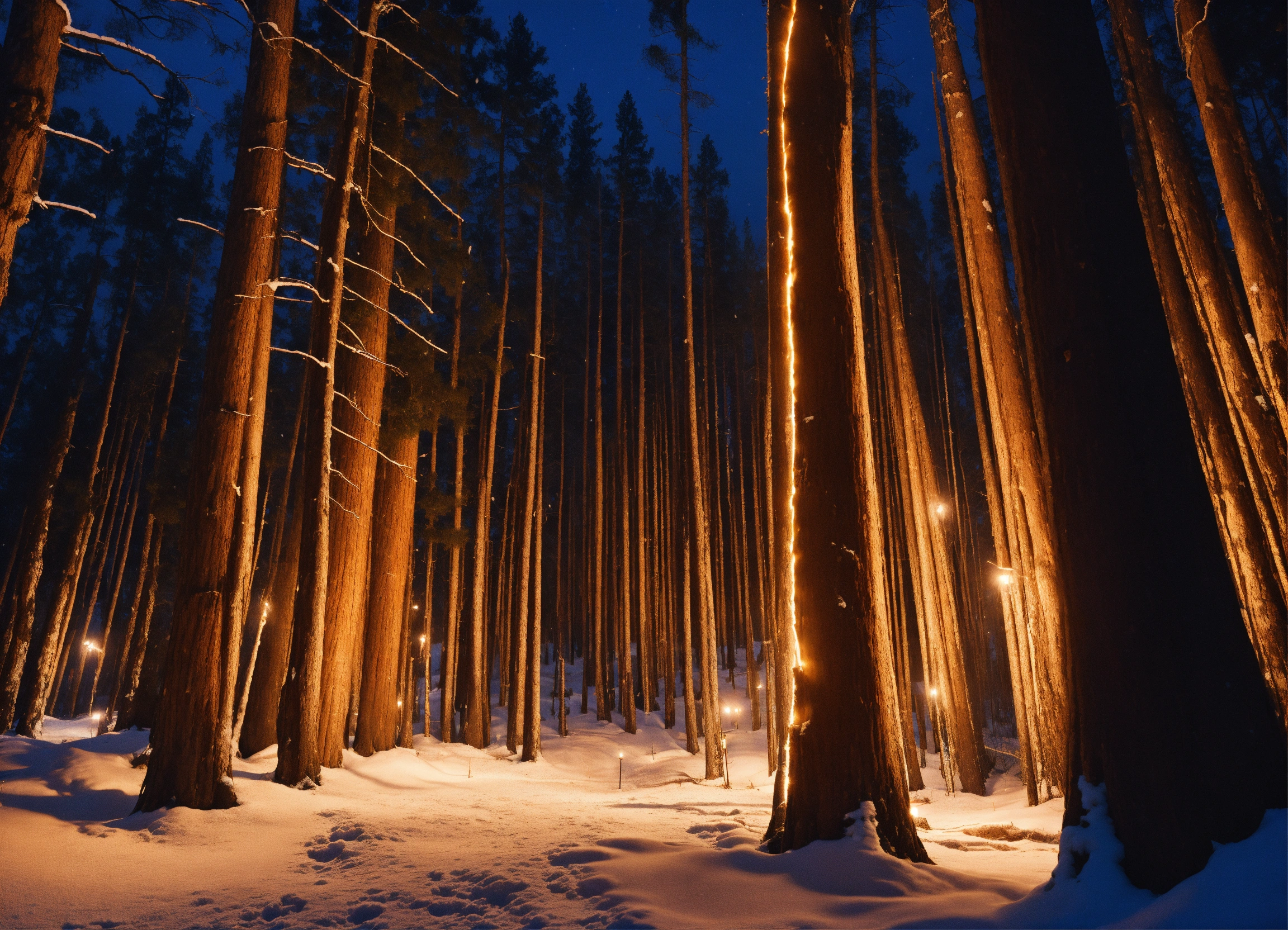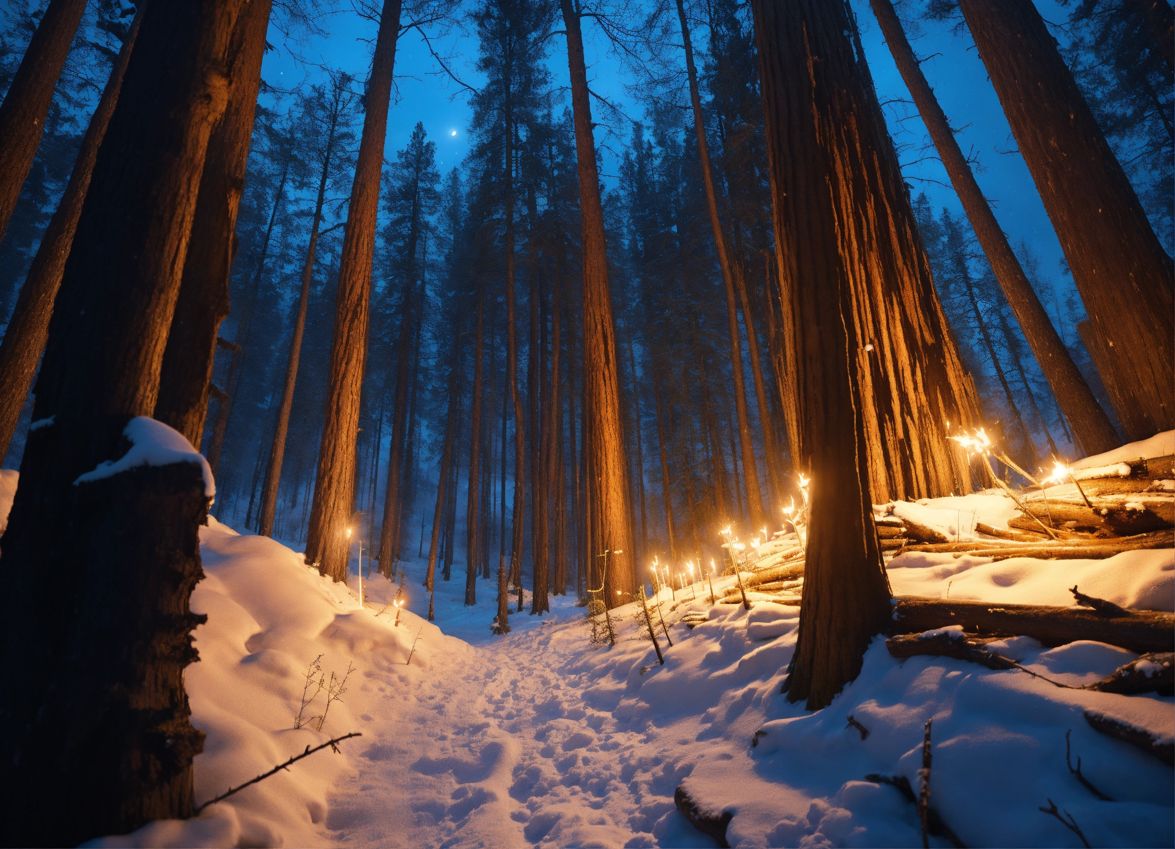 A realistic photo from a hill of a very high wall made of large vertical wooden trunks, with torches, in the middle of a snowy deadwood forest, at night, hyperdetailed, hyperrealistic, 8k