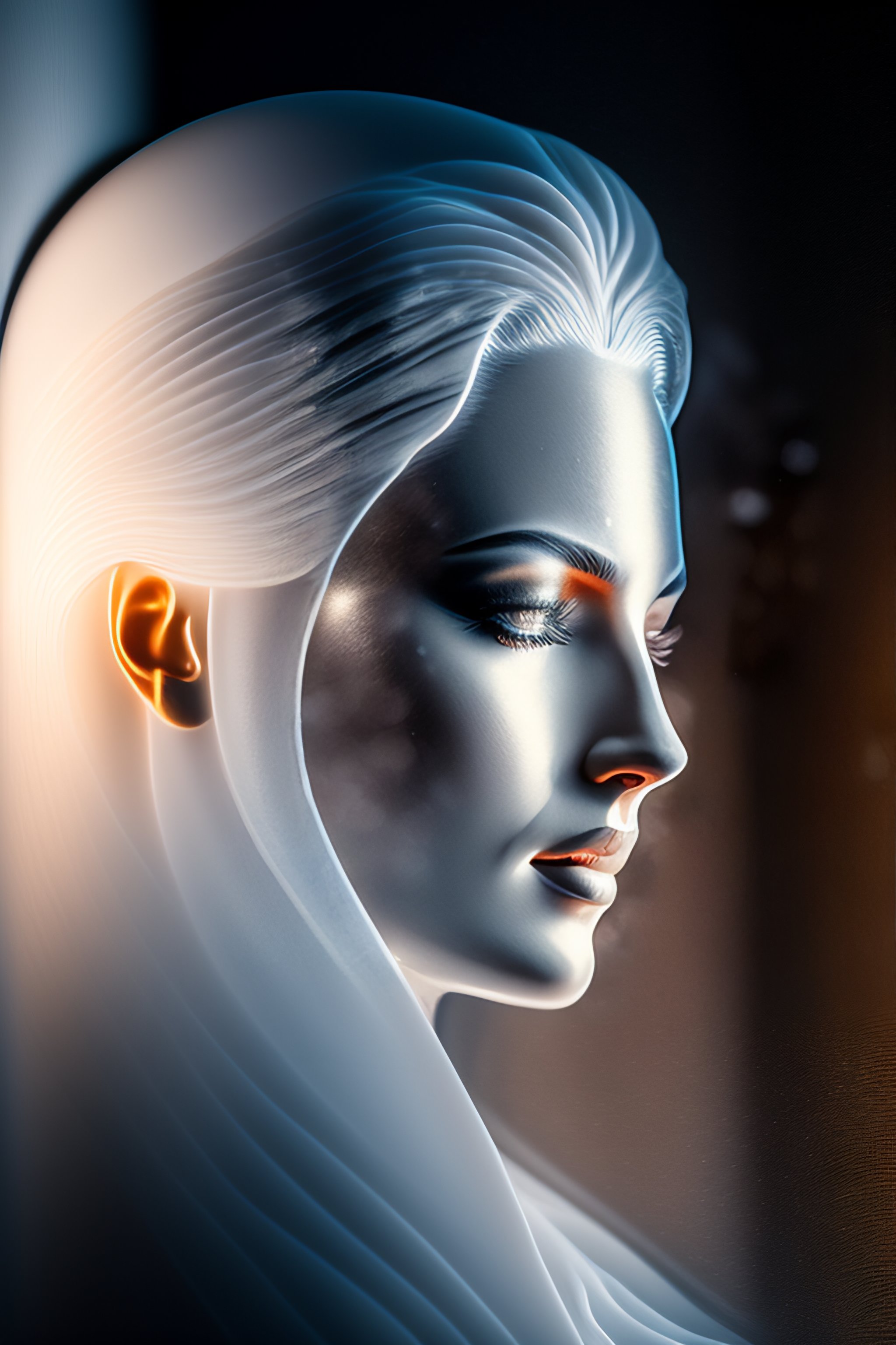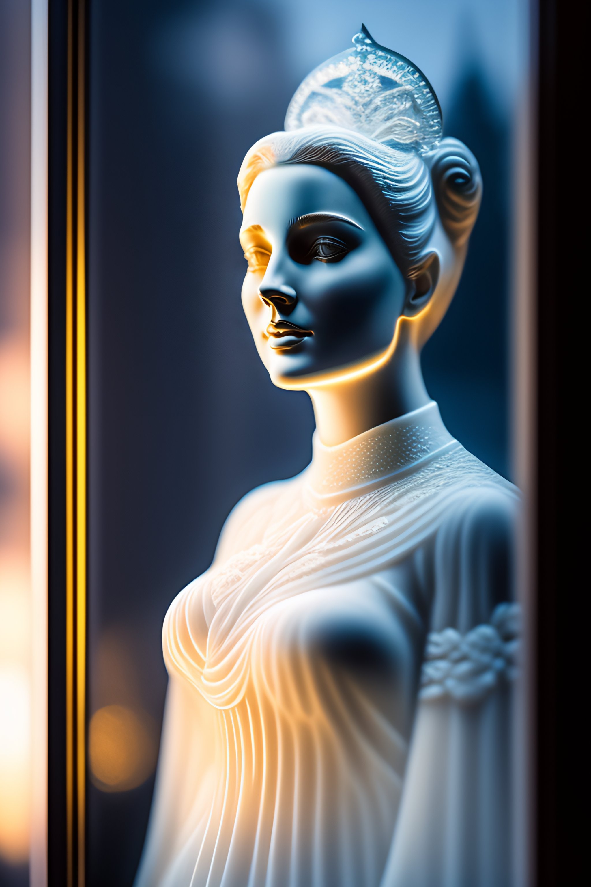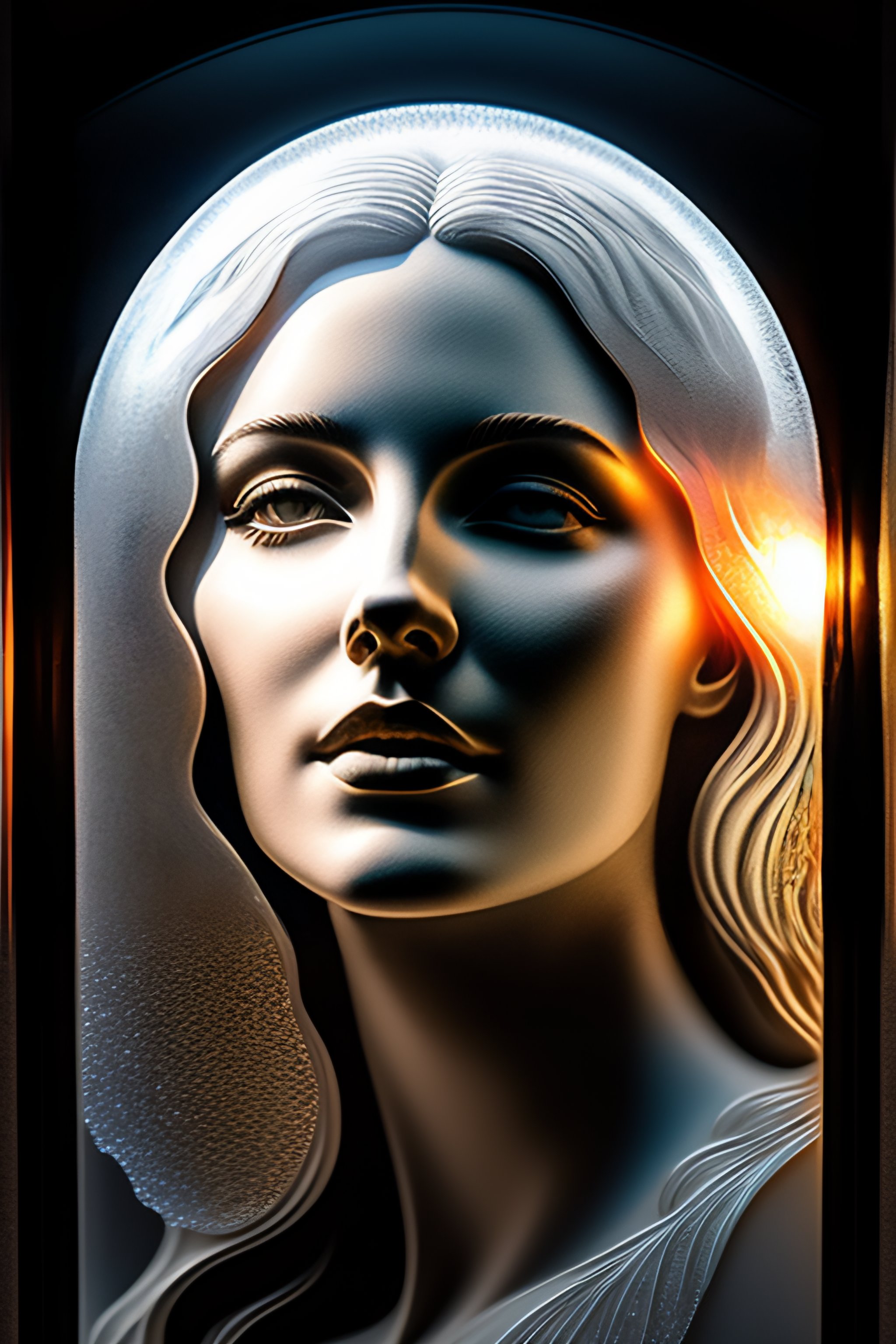 A frosted glass relief of a woman, natural etched glass, bottom lighting, light through glass, martin ansin, portrait, frosted glass window, etching, gothic art, ice on glass, volumetric lighting, extremely detailed goddess, natural carving