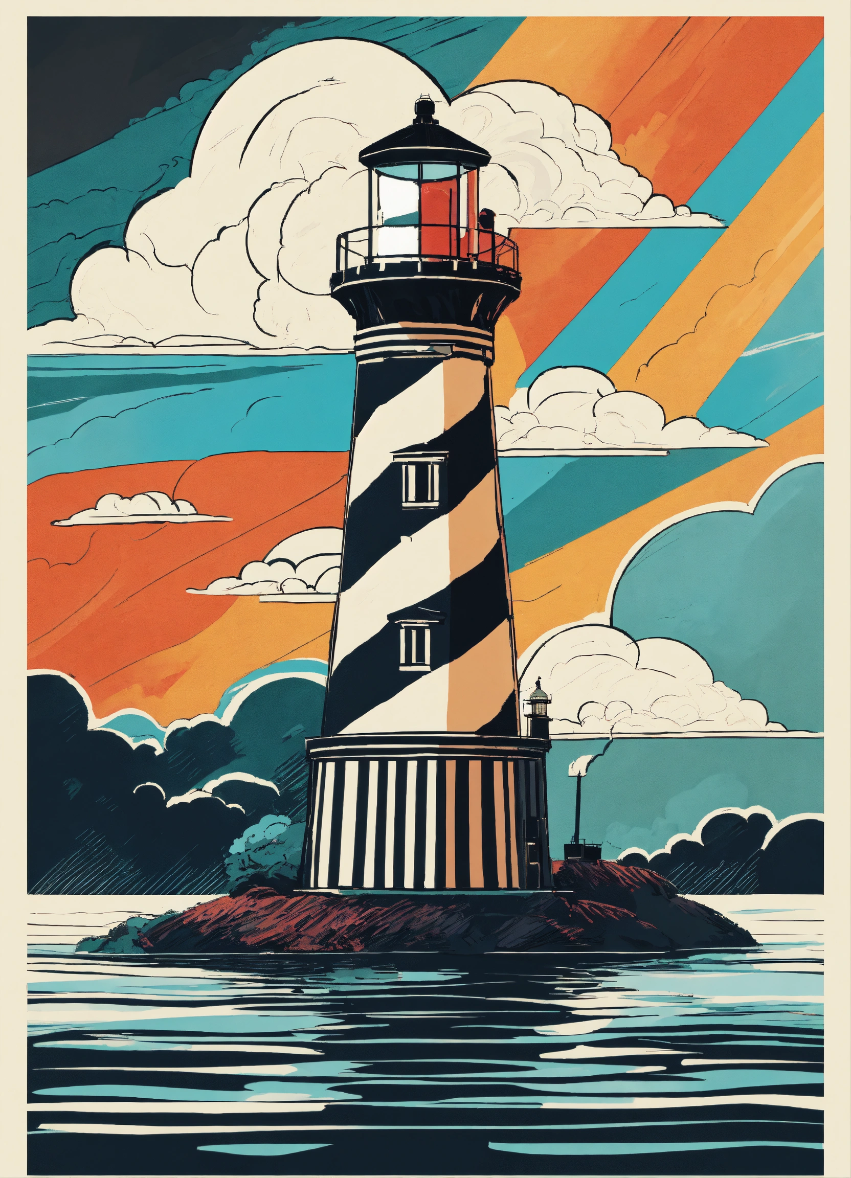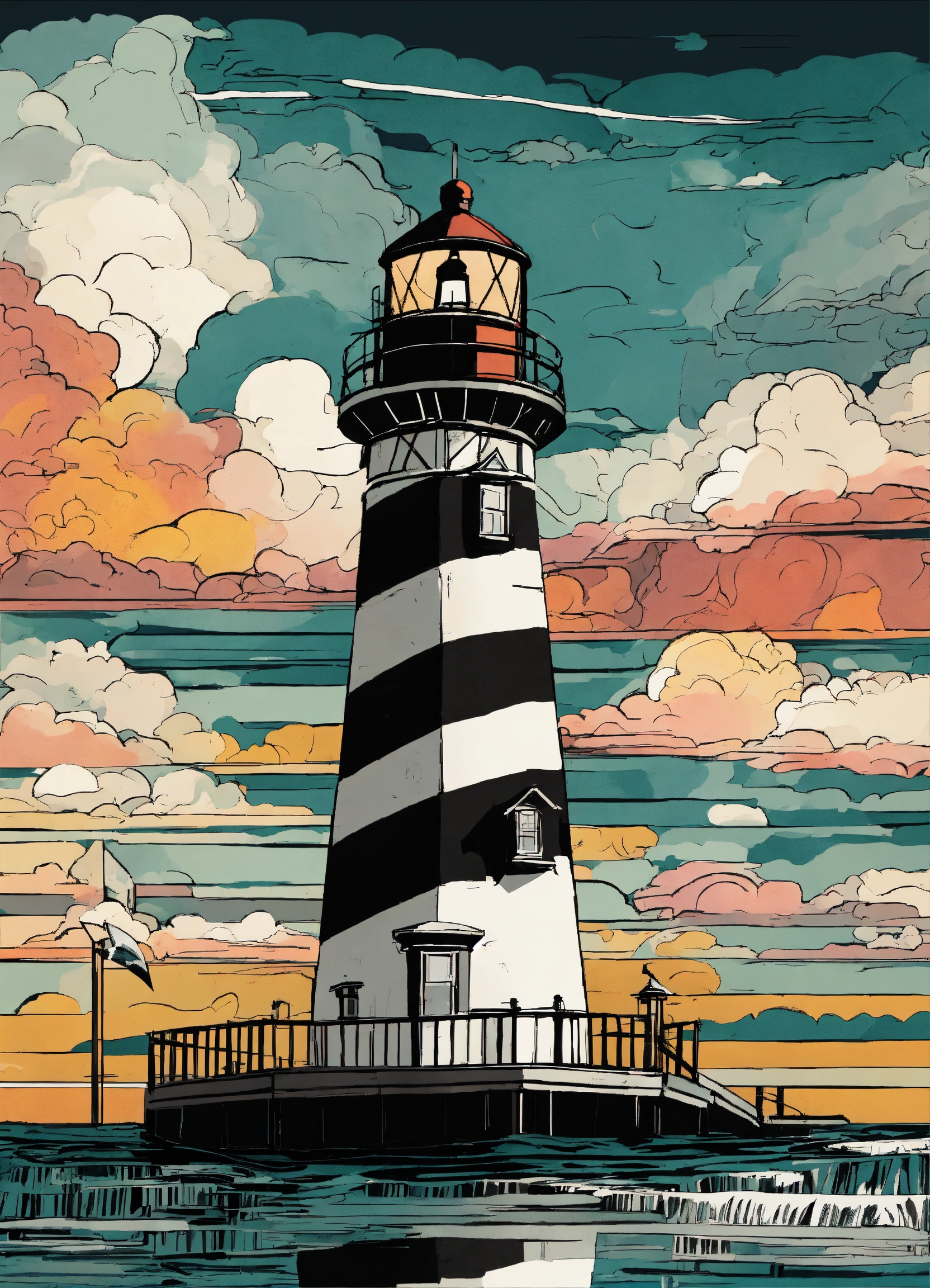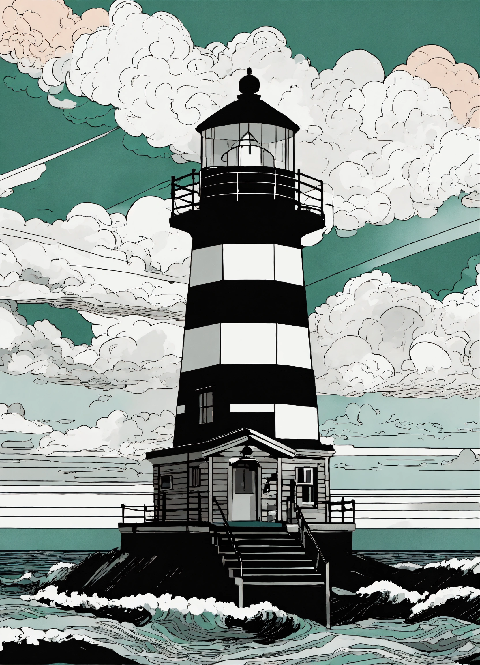 Off-center image, ultra detailed illustration of a black and white striped lighthouse, clouds, (analogous colors), inkpunk, strong outlines, art by mschiffer, bold traces, unframed, high contrast, vector, 32k resolution, best quality, flat colors, flat lights