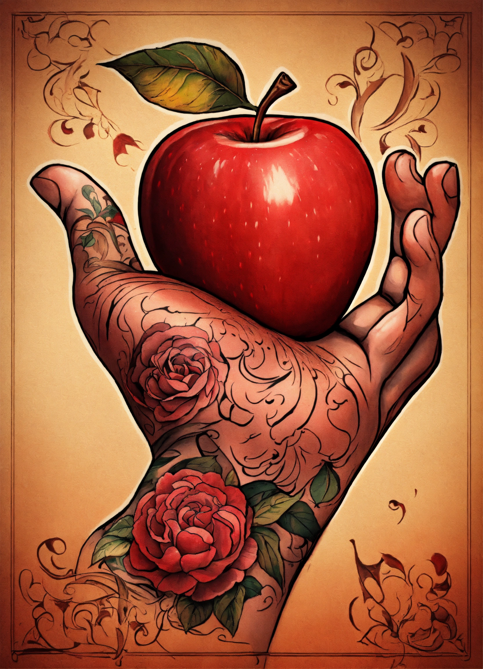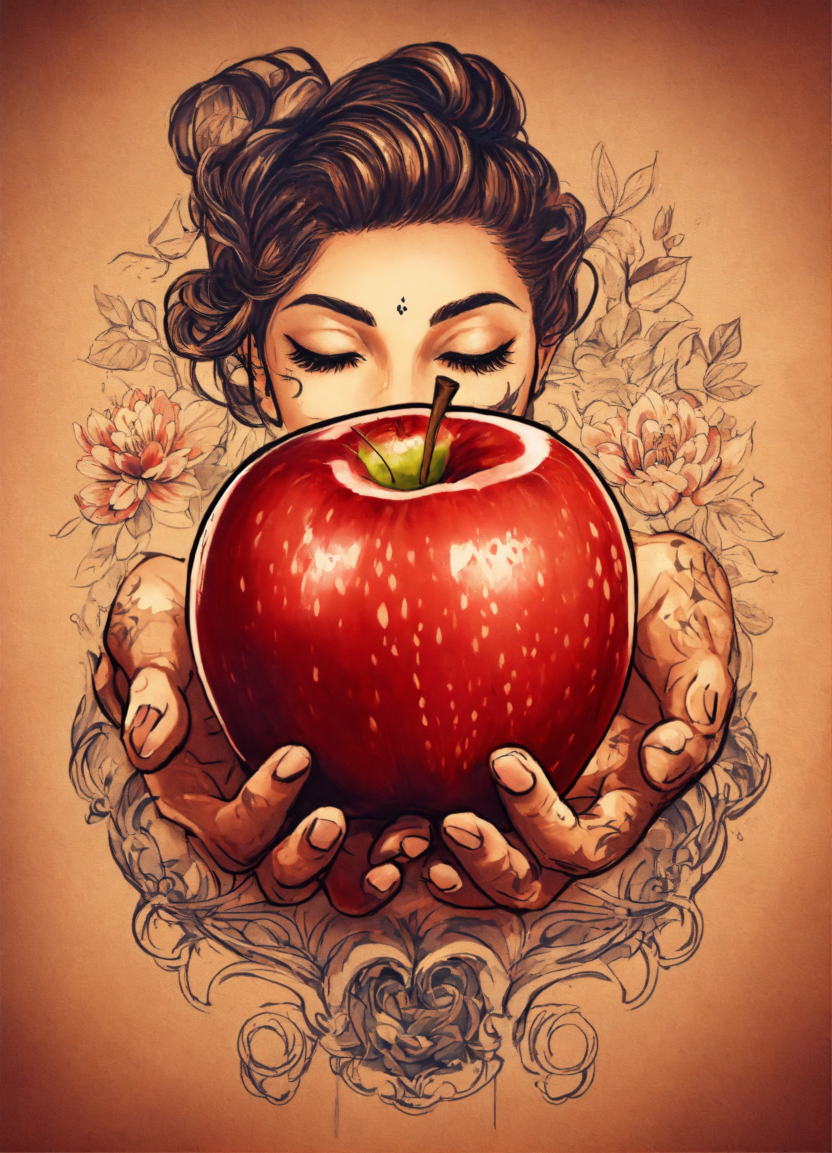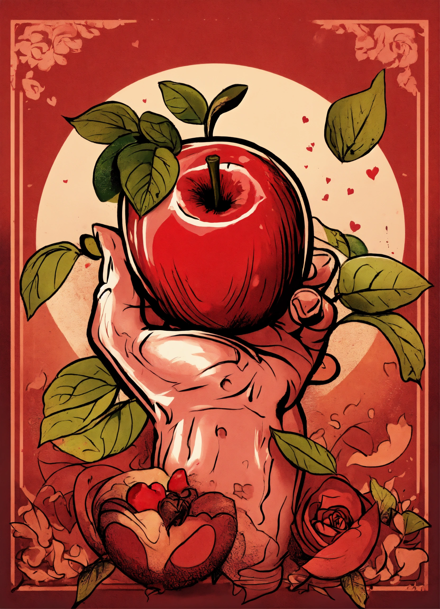 Tattoo style image of an red apple being squeezed by a large hand and the apple has an expression of love on its face