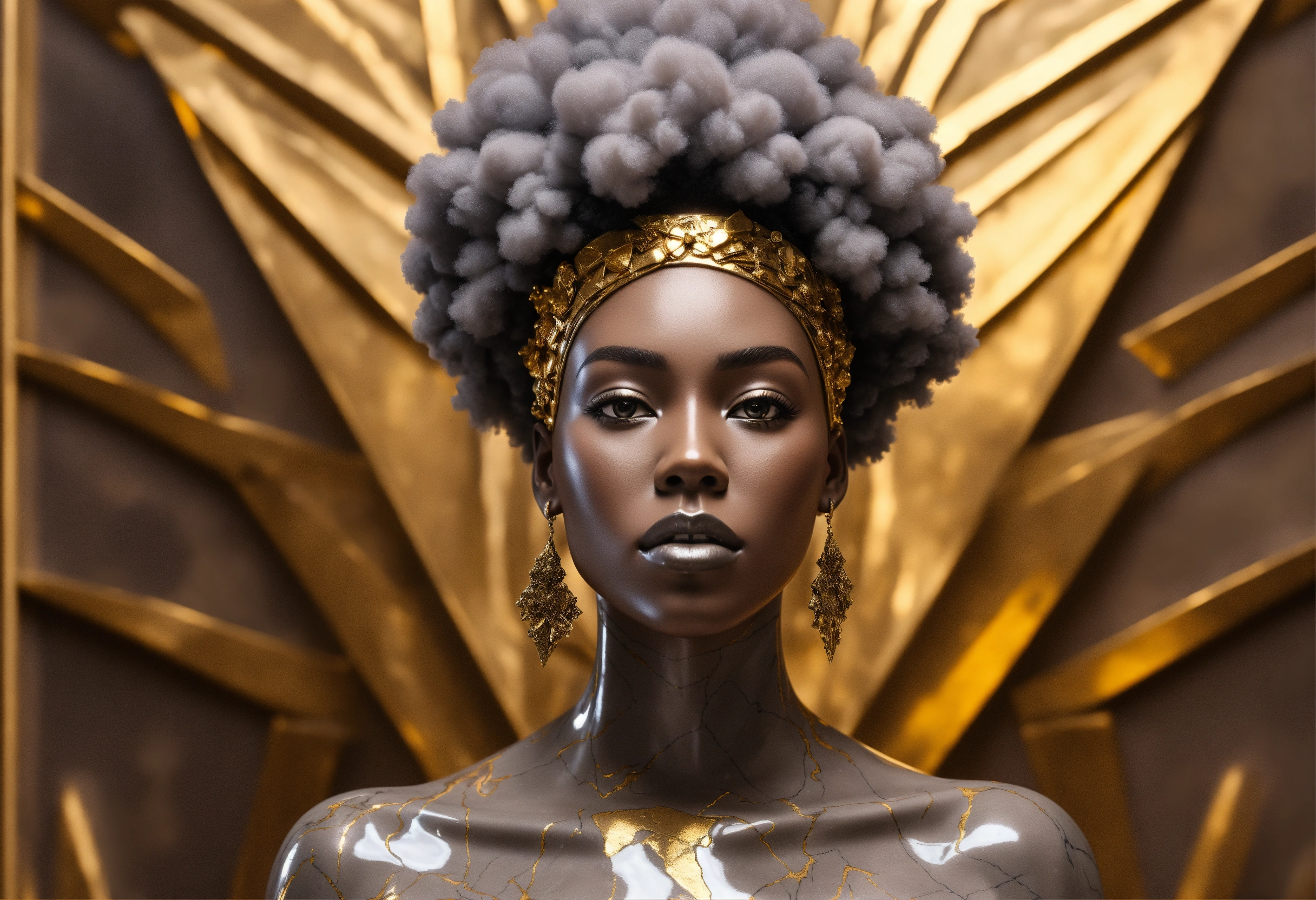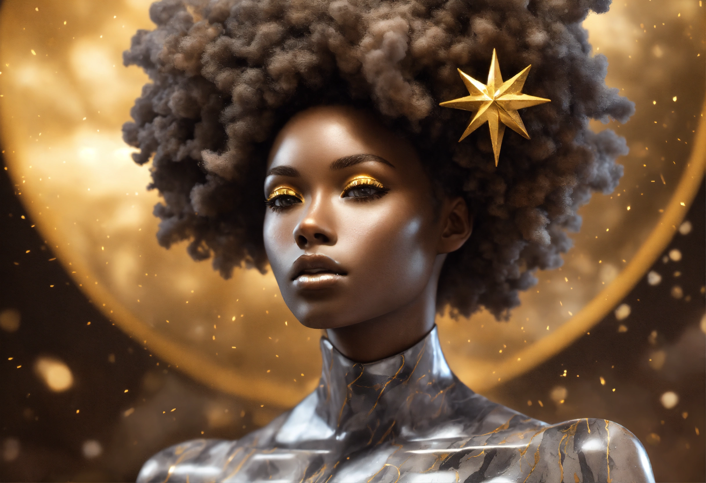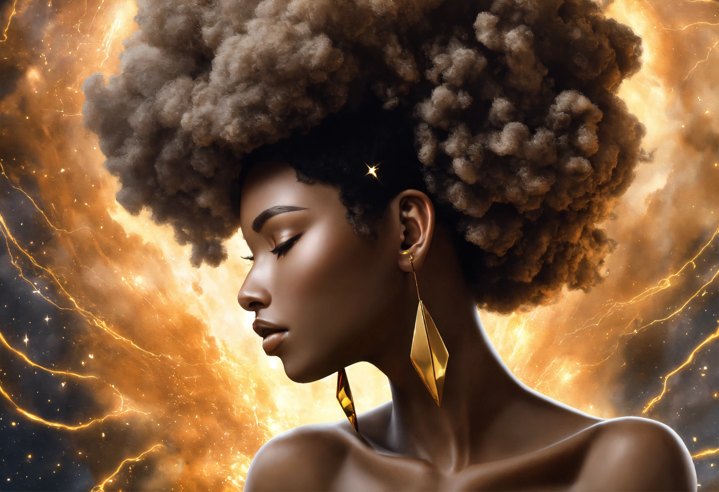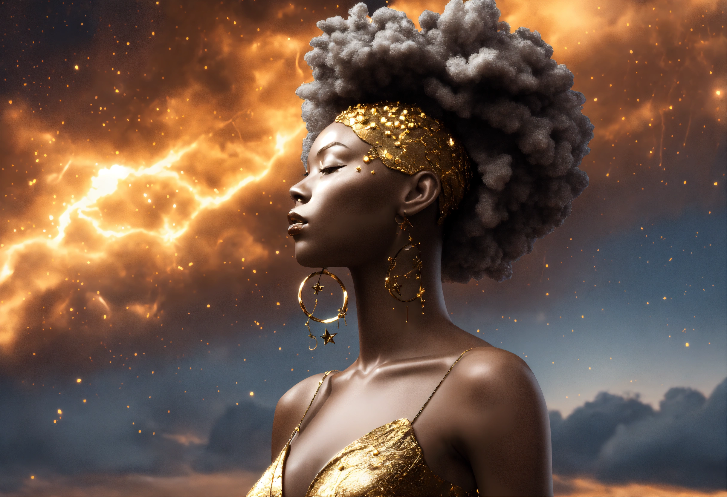 A 3d sculpted woman made of taupe and grey marble with gold veining skin with afrocentric features against a galaxy starburst, afro hair is made of grey and brown cumulus clouds streaked with silver lightning strikes throughout