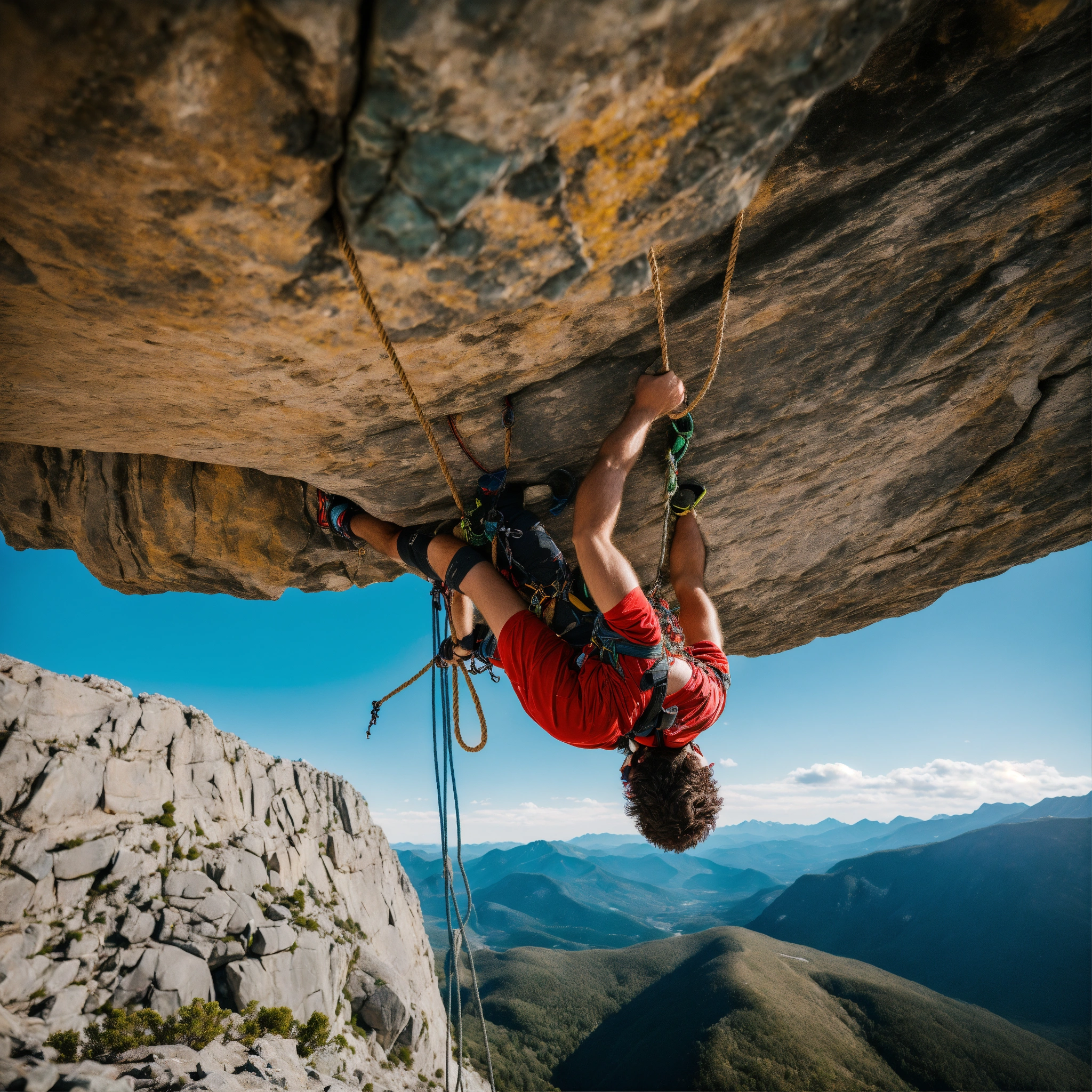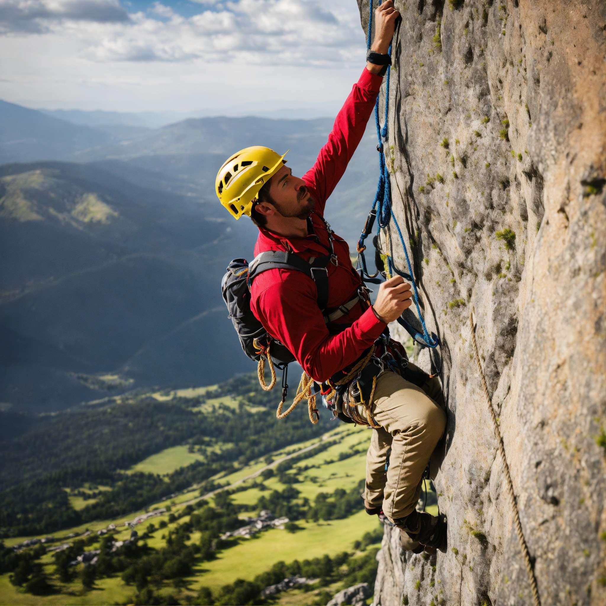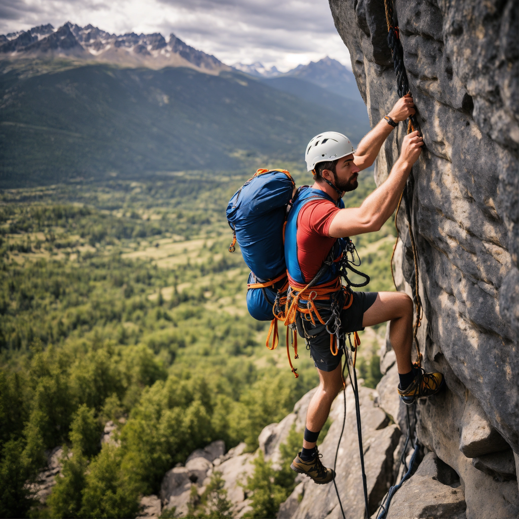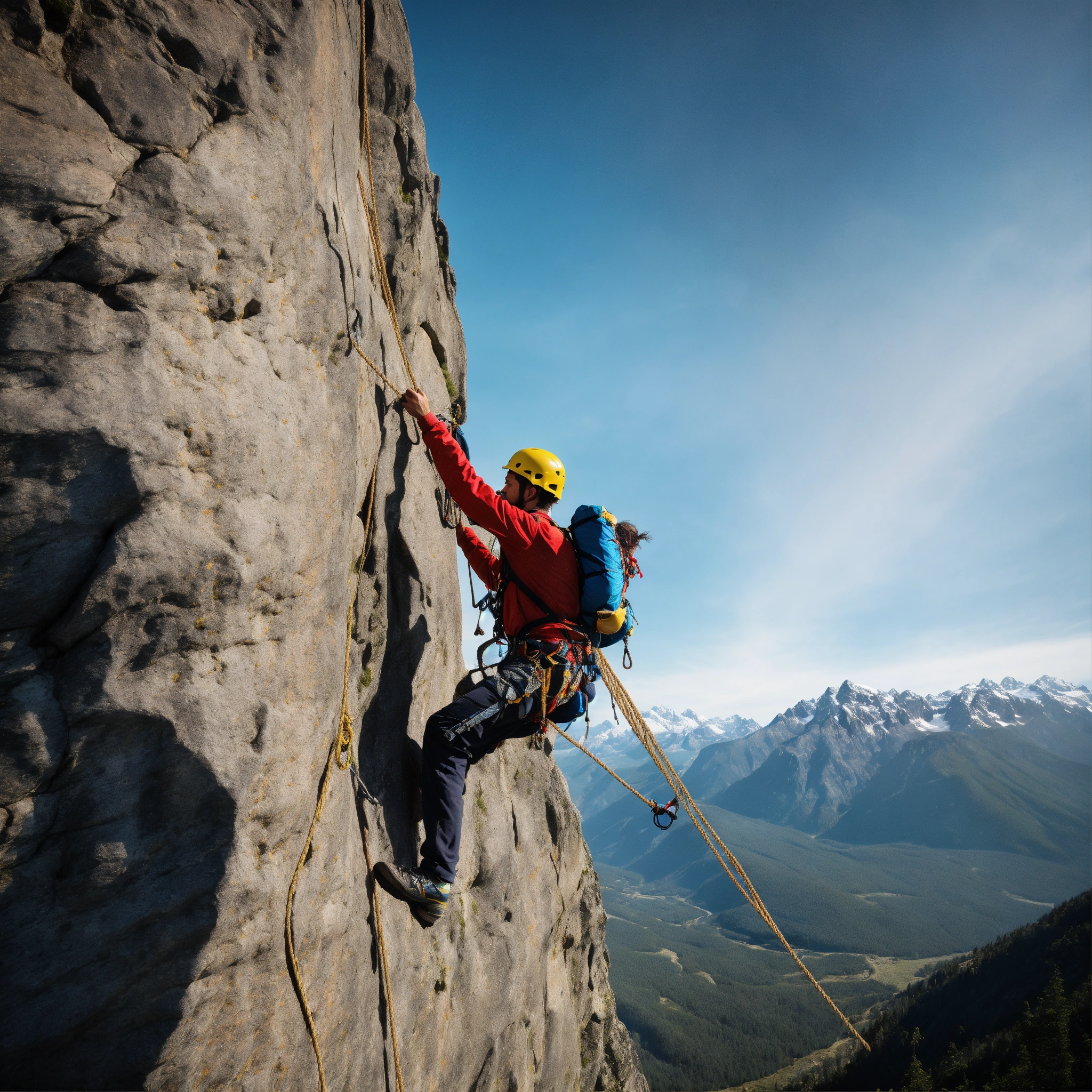 A photo of a man climbing a rock face, the man is wearing a harness and is using a rope to climb, the background is a beautiful mountain landscape