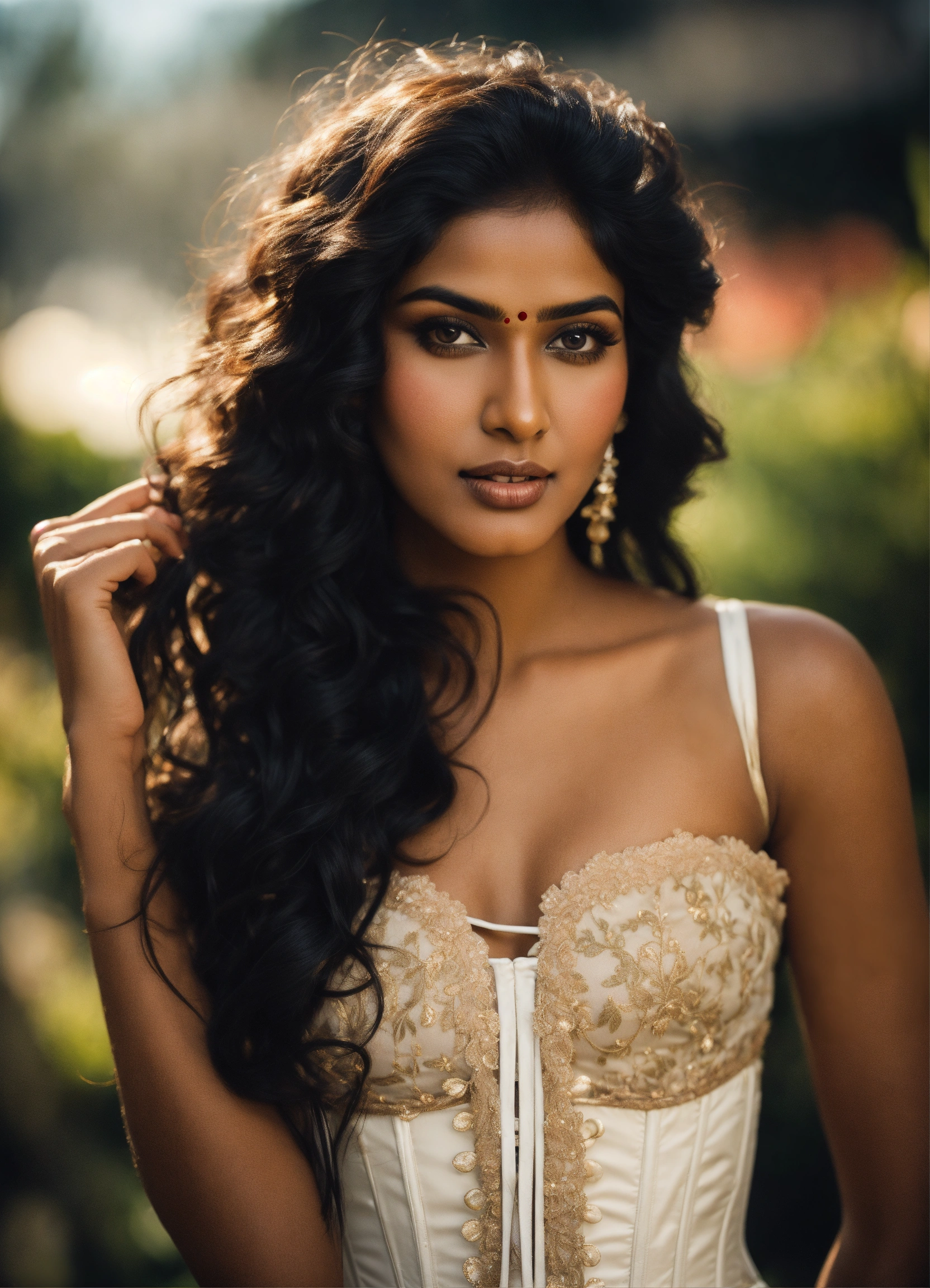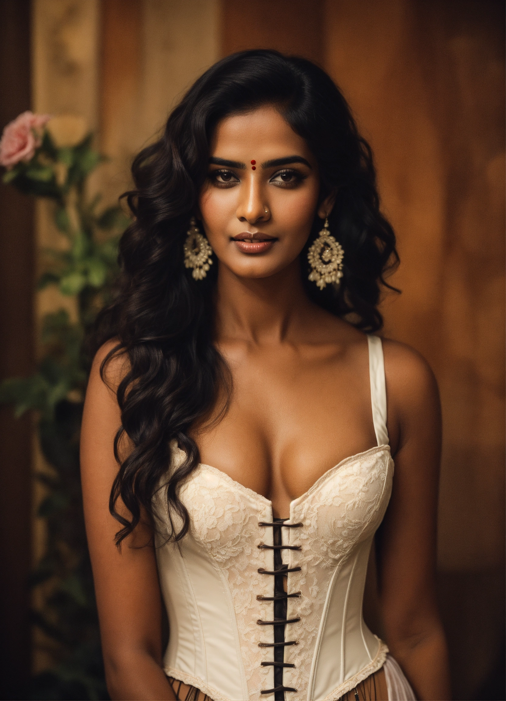 A beautiful indian woman with medium brown skin, a long nose, and long black wavy hair, in a white corset
