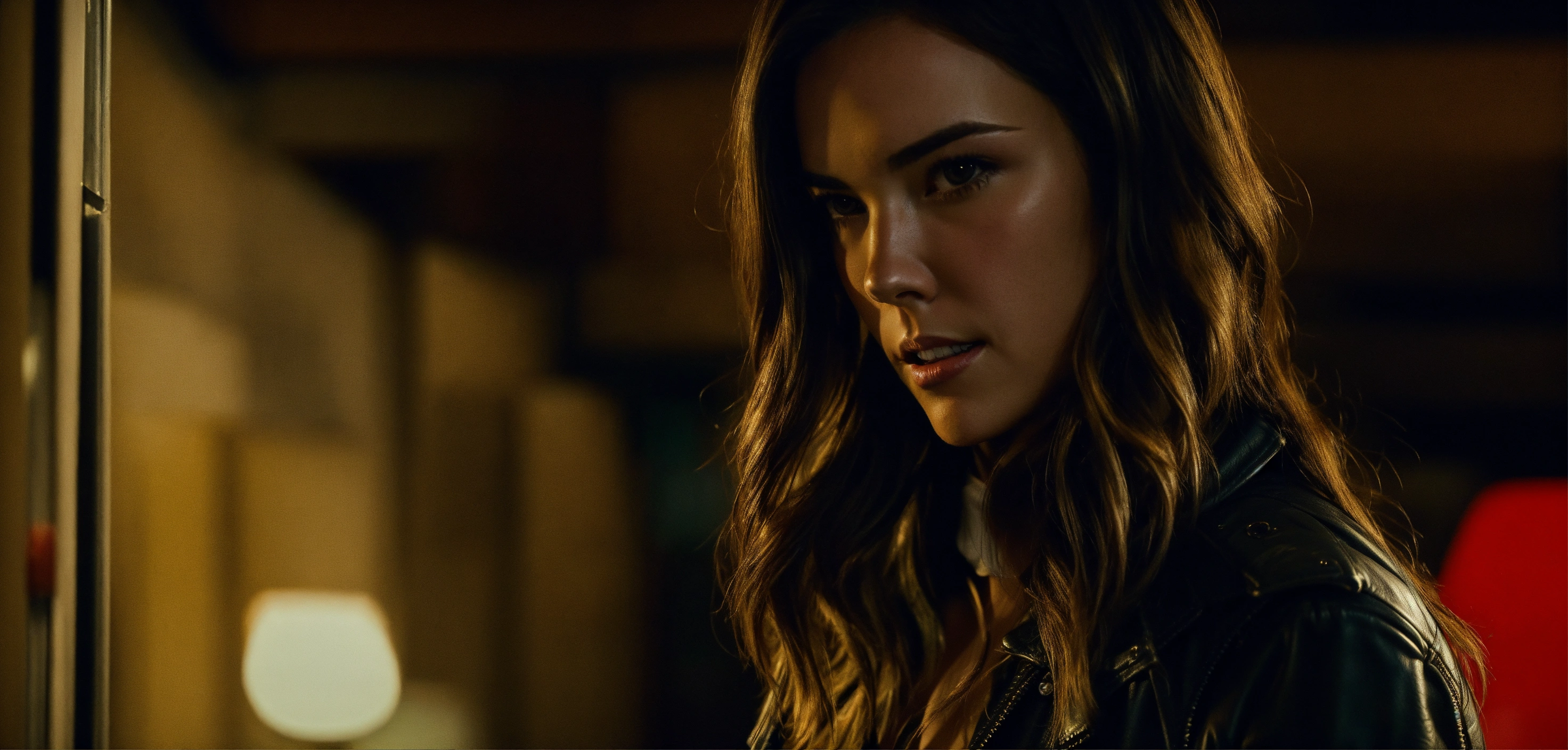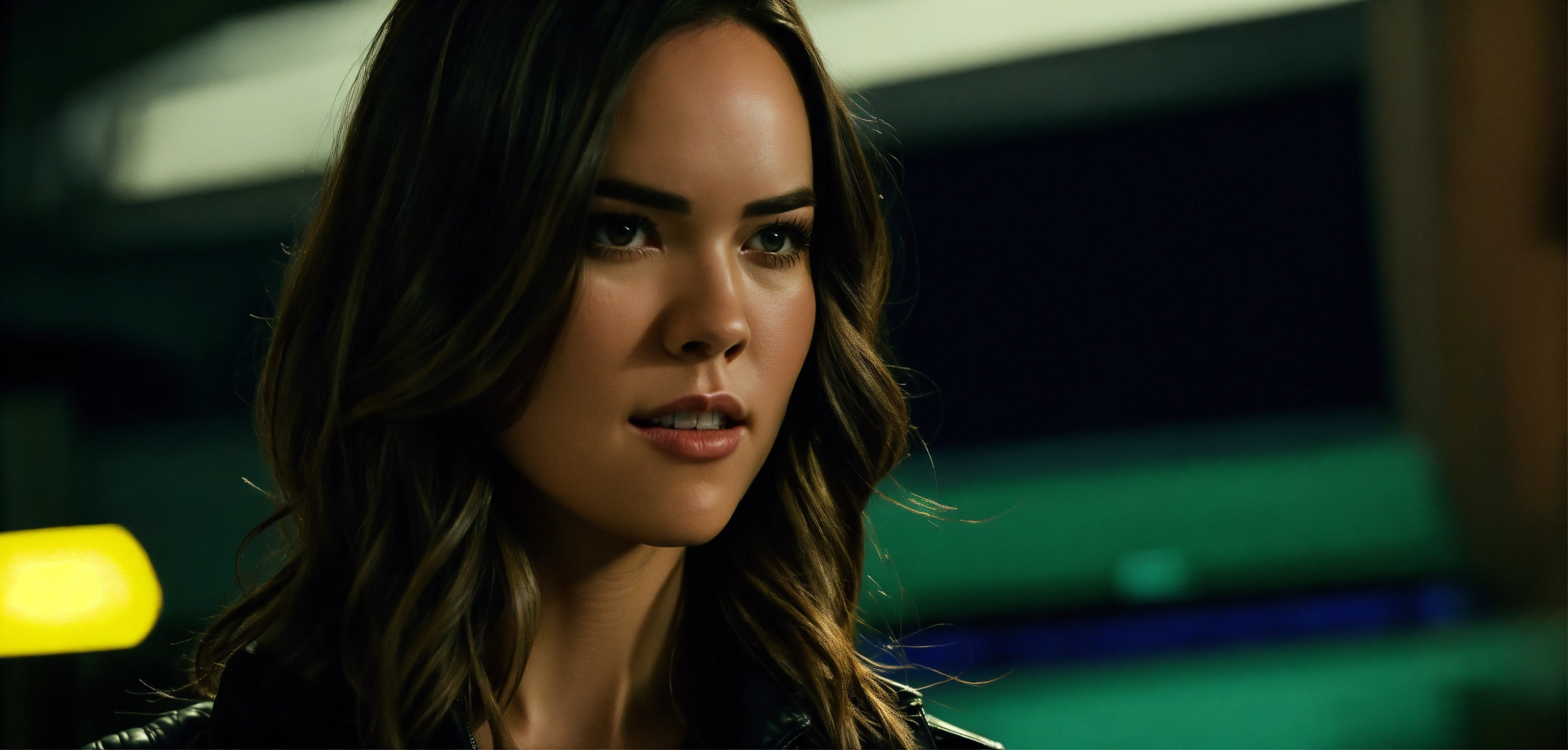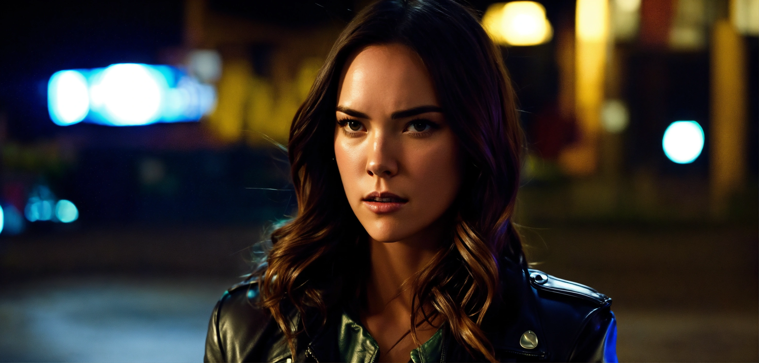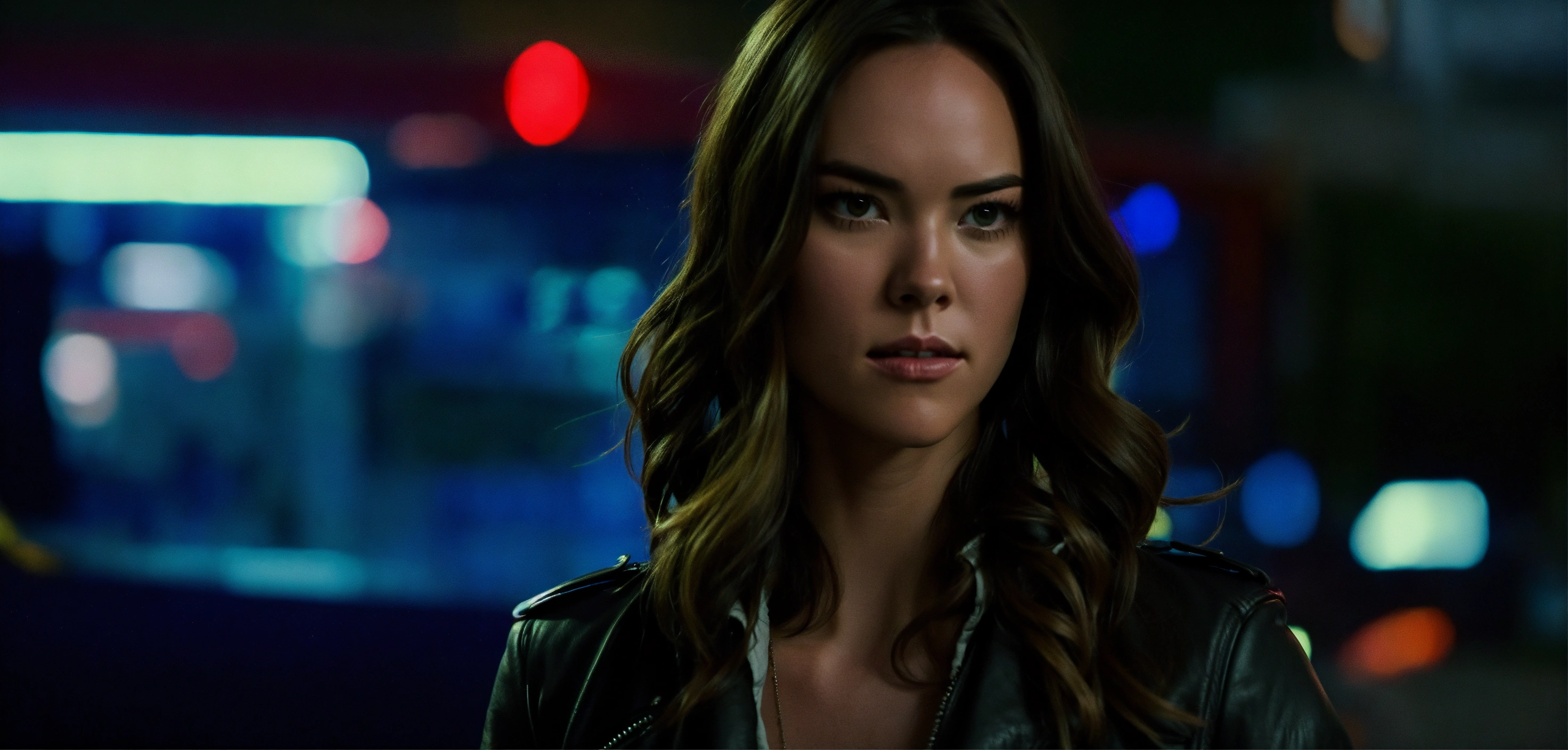Very beautiful 30 years old odette annable, cute big hazel eyes, long hair, thrilling crime scene investigator, night, city, life-or-death situation, leather jacket, cinematic, realistic walk, closed mouth serious face arrow tv show
