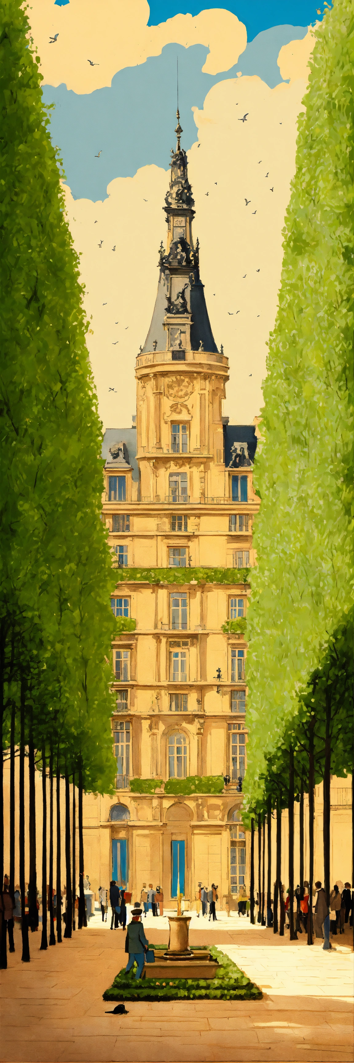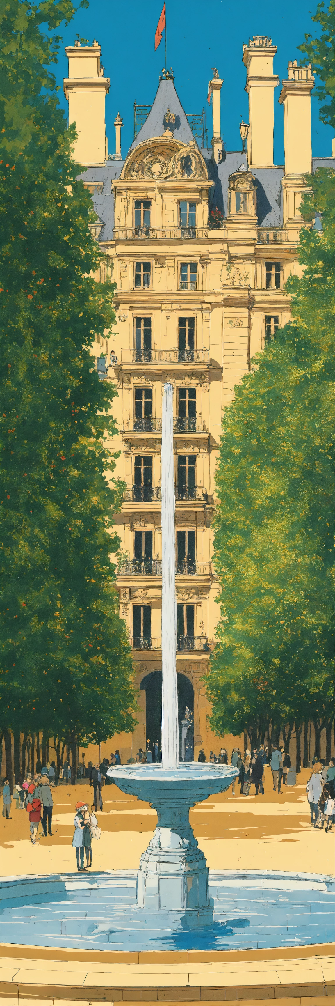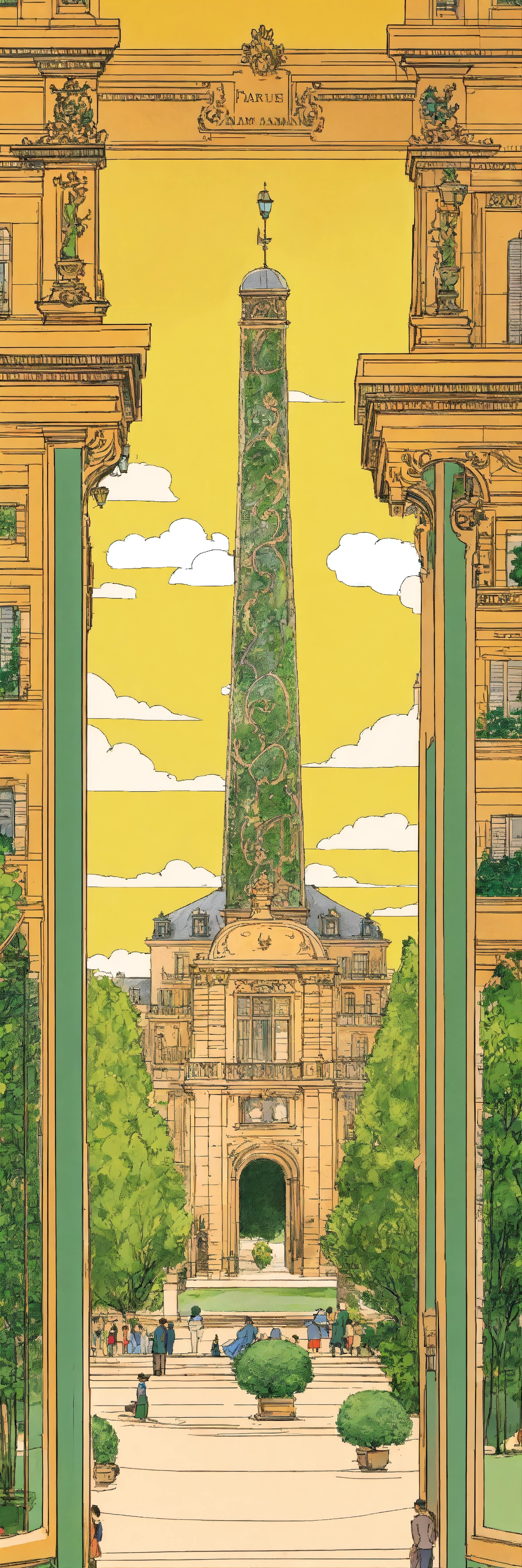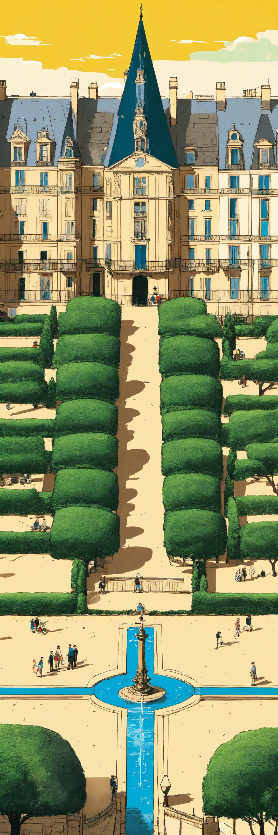 Haussmanian skyscraper, place de vosges, jardins de luxembourg tuilleries palais royale, fountain, maze, herge illustration