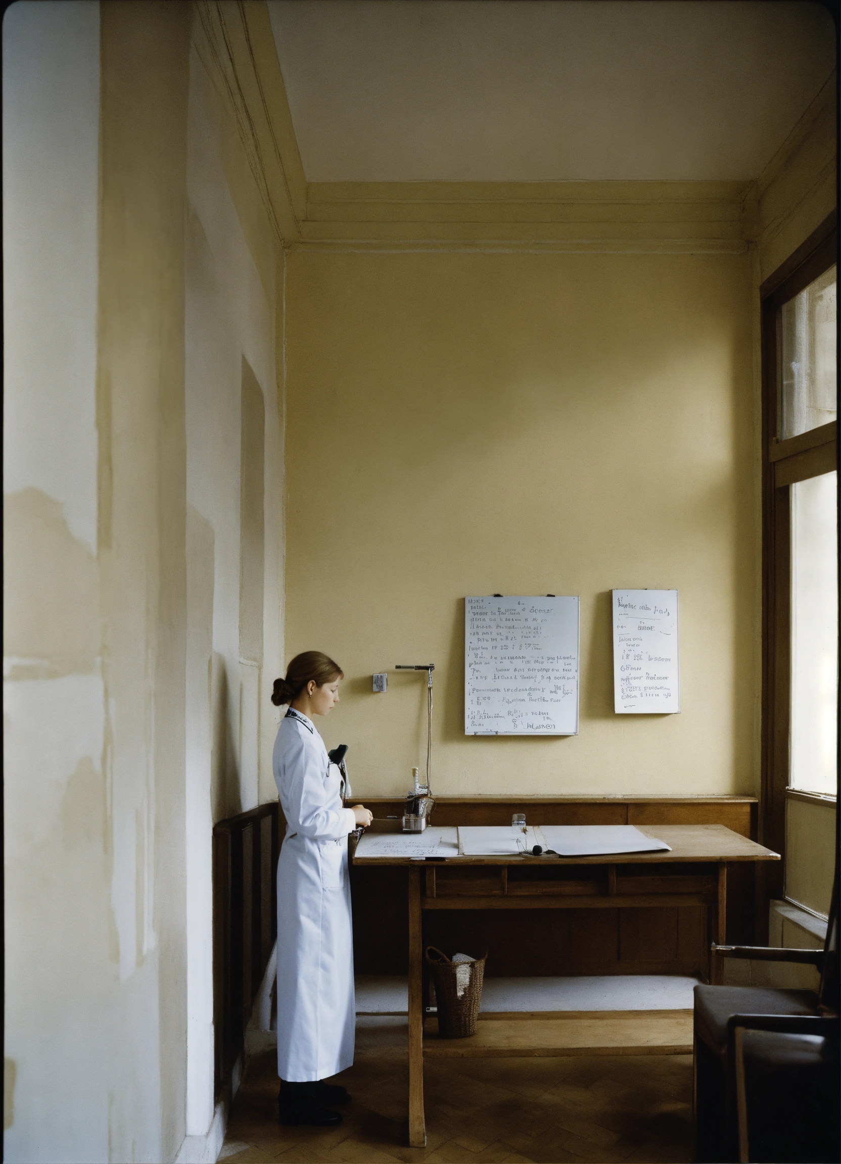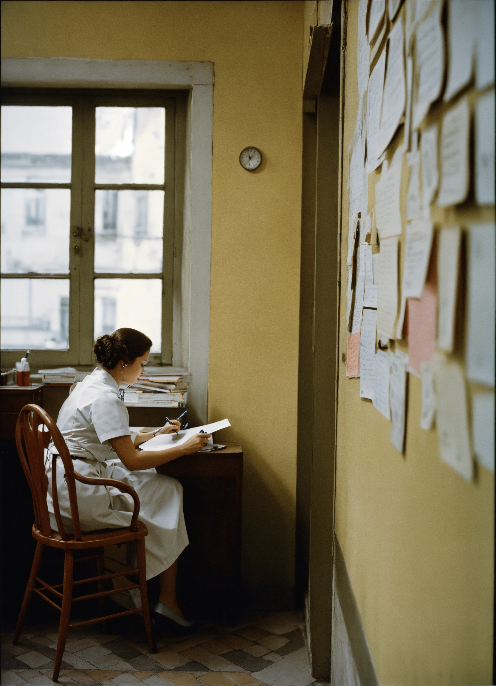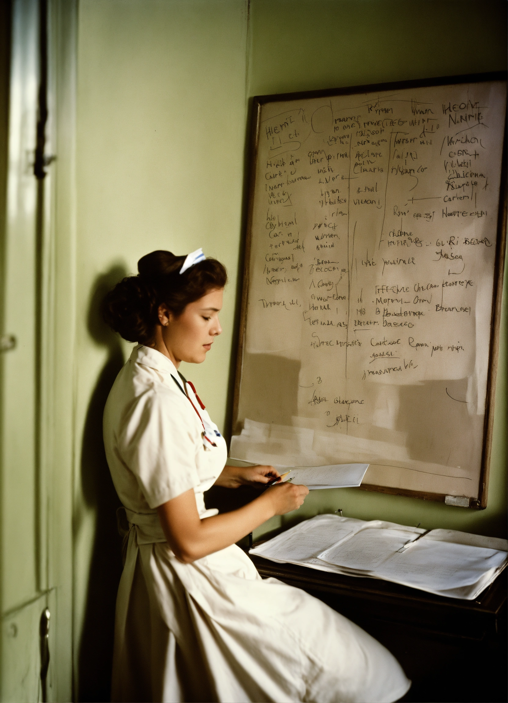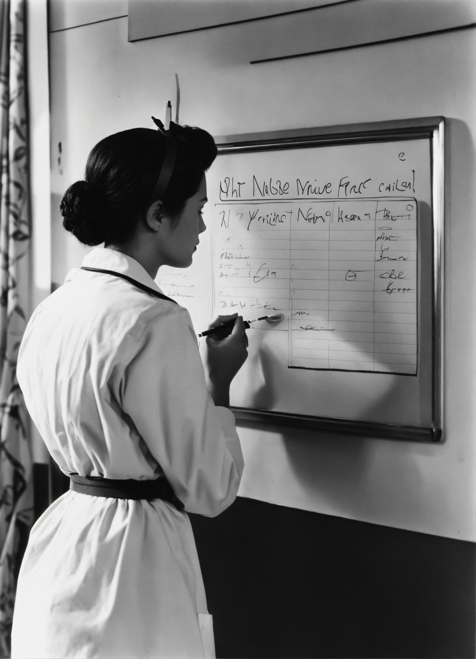 Macro shot, dynamic frontal standard viewpoint, nurse writing on a small white board on the wall by henri cartier-bresson