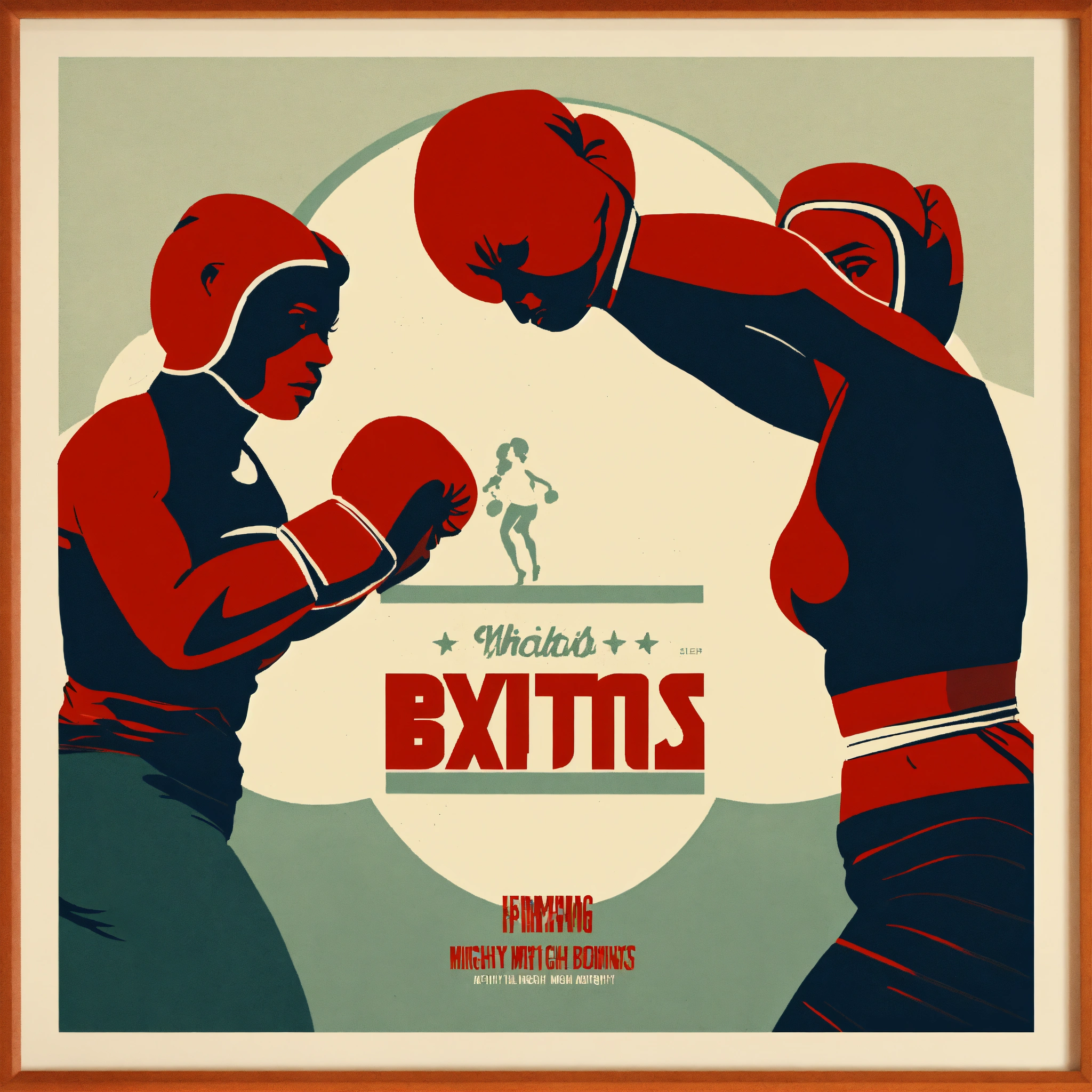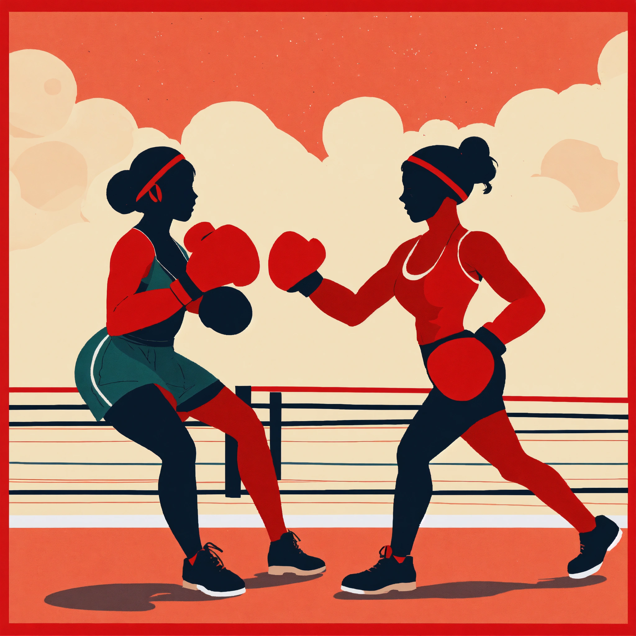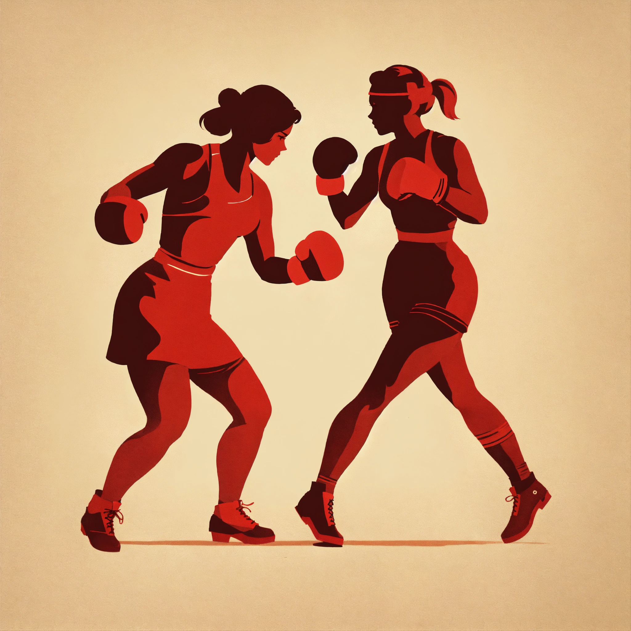 A minimalist symbol for a show about women boxing, called "mighty atoms". set in modern days, with 50s references. silhouettes of women boxing and big red boxing gloves