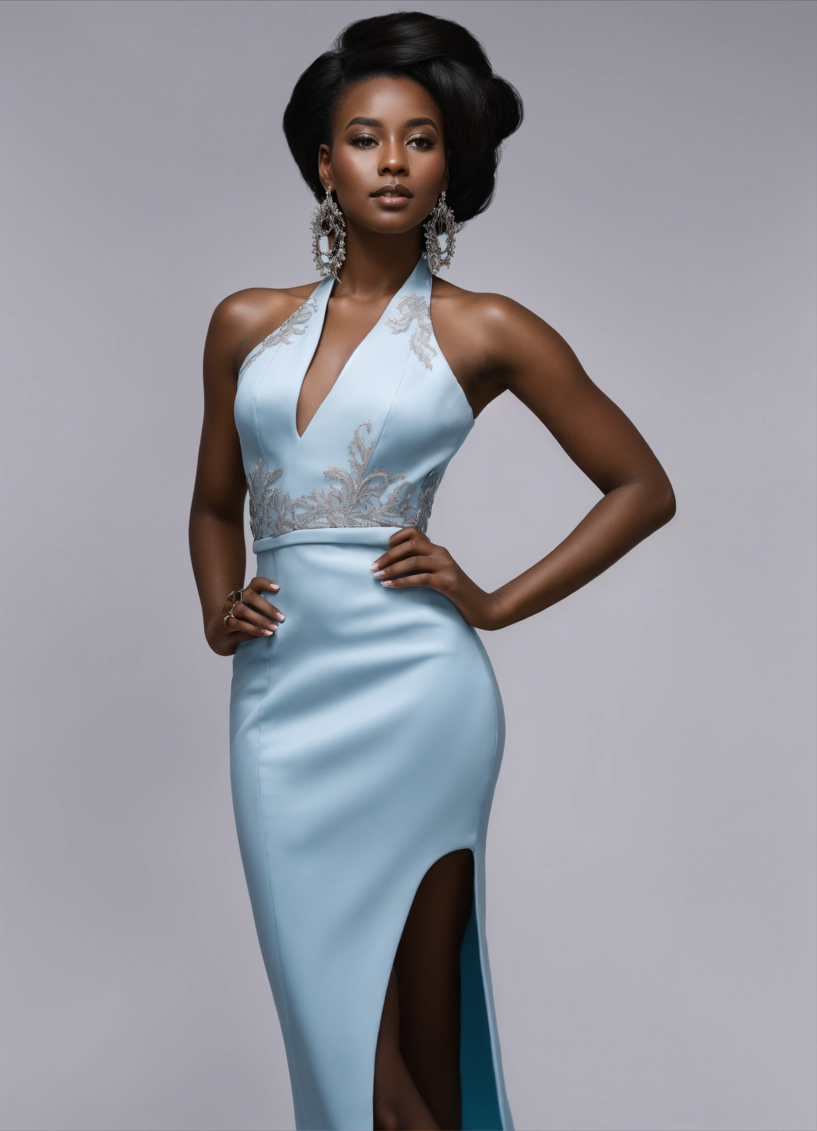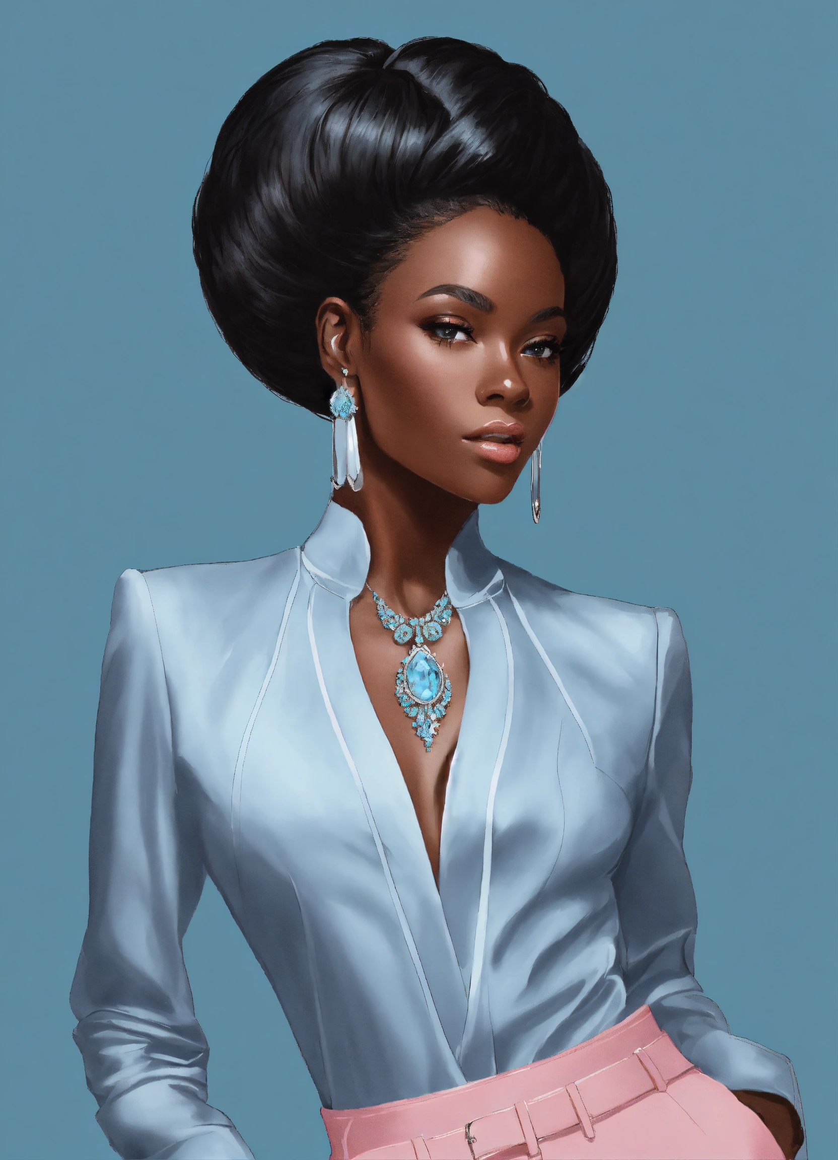 Beautiful dark skin black business woman wearing stylish haute couture outfit in baby blue and baby pink clothes, silver stiletto heels, detailed line art, fine details, no background, full body view, top of hair, top of head to toe, center, solid white background, greg rutkowski