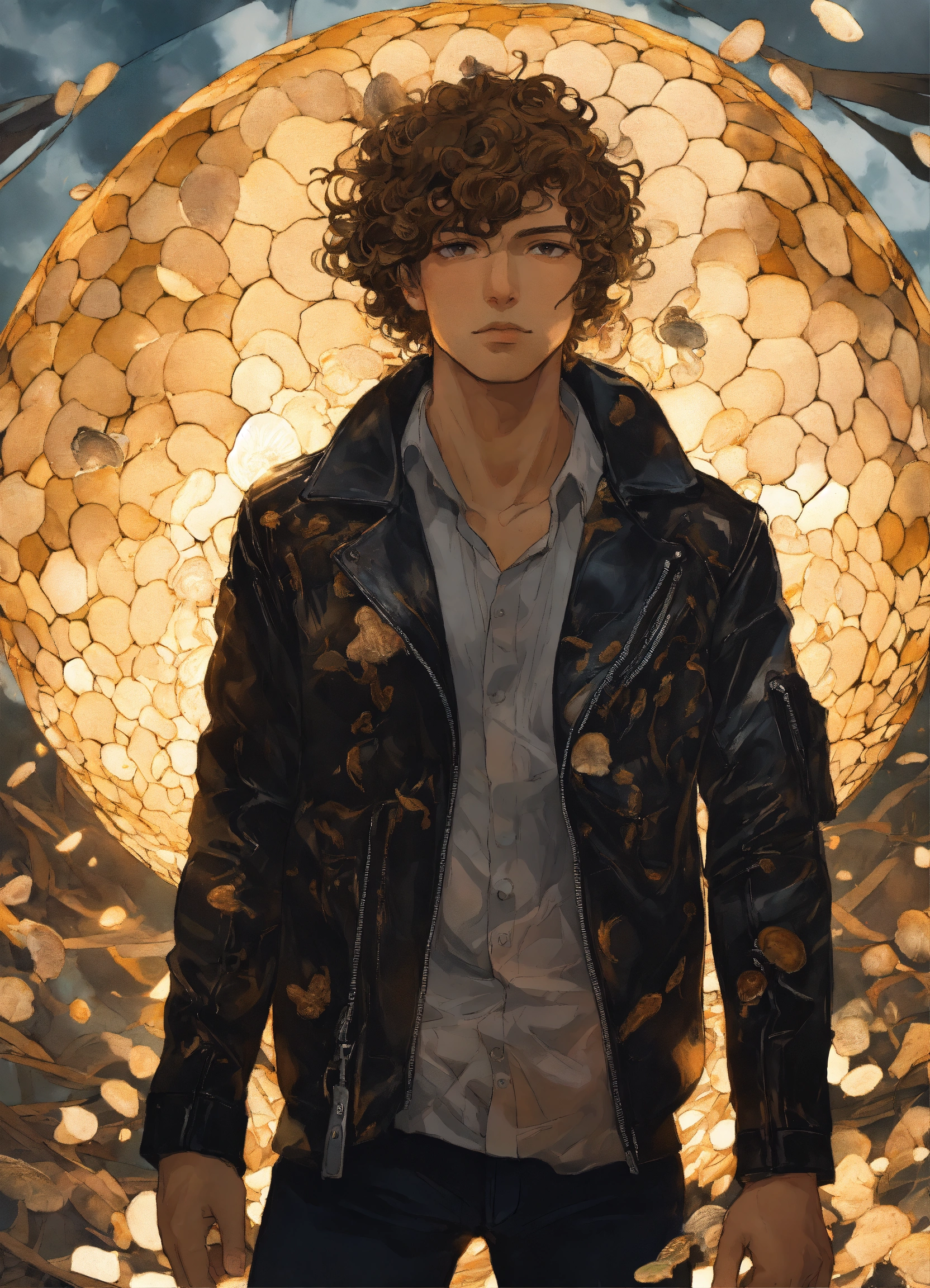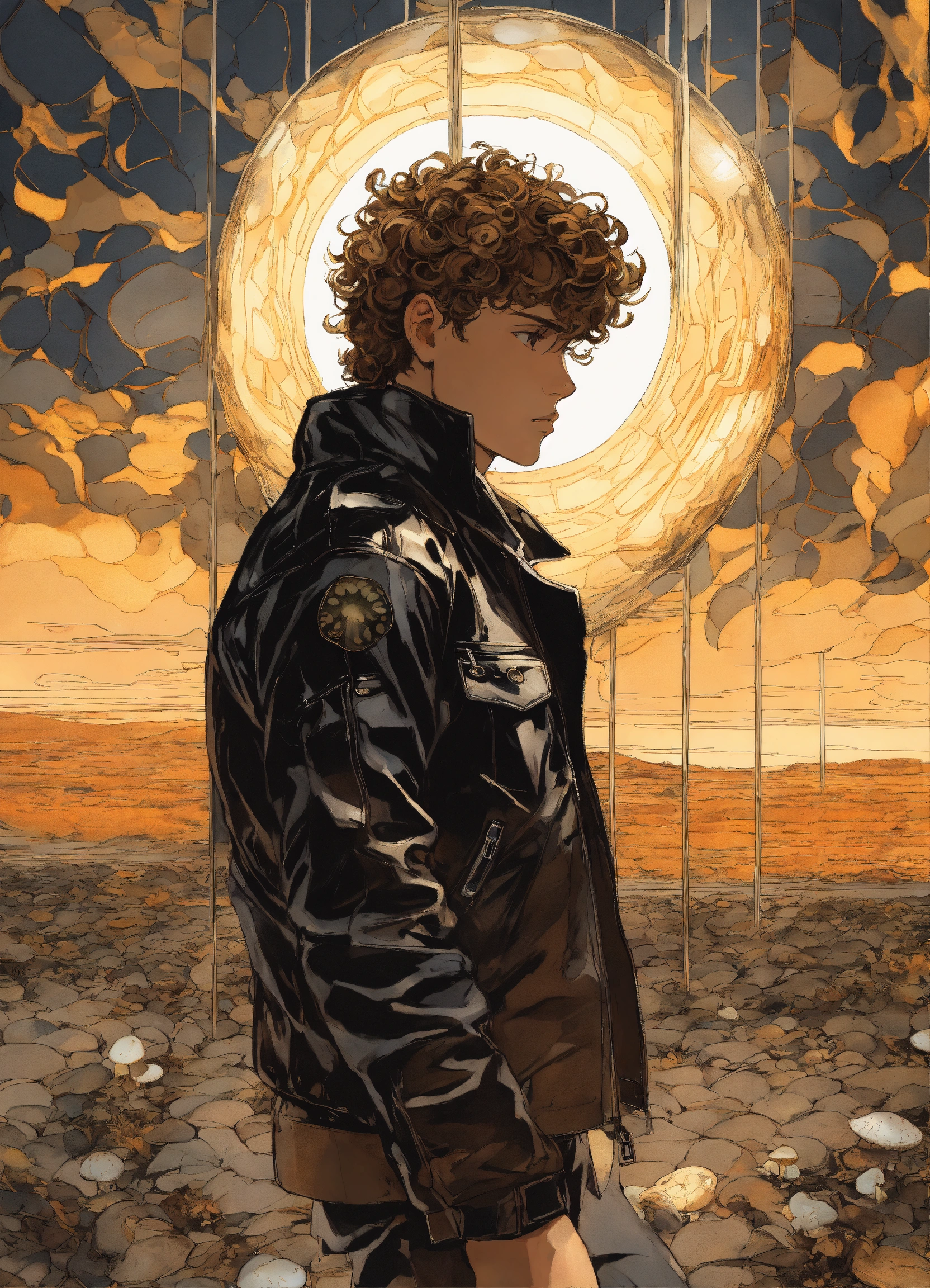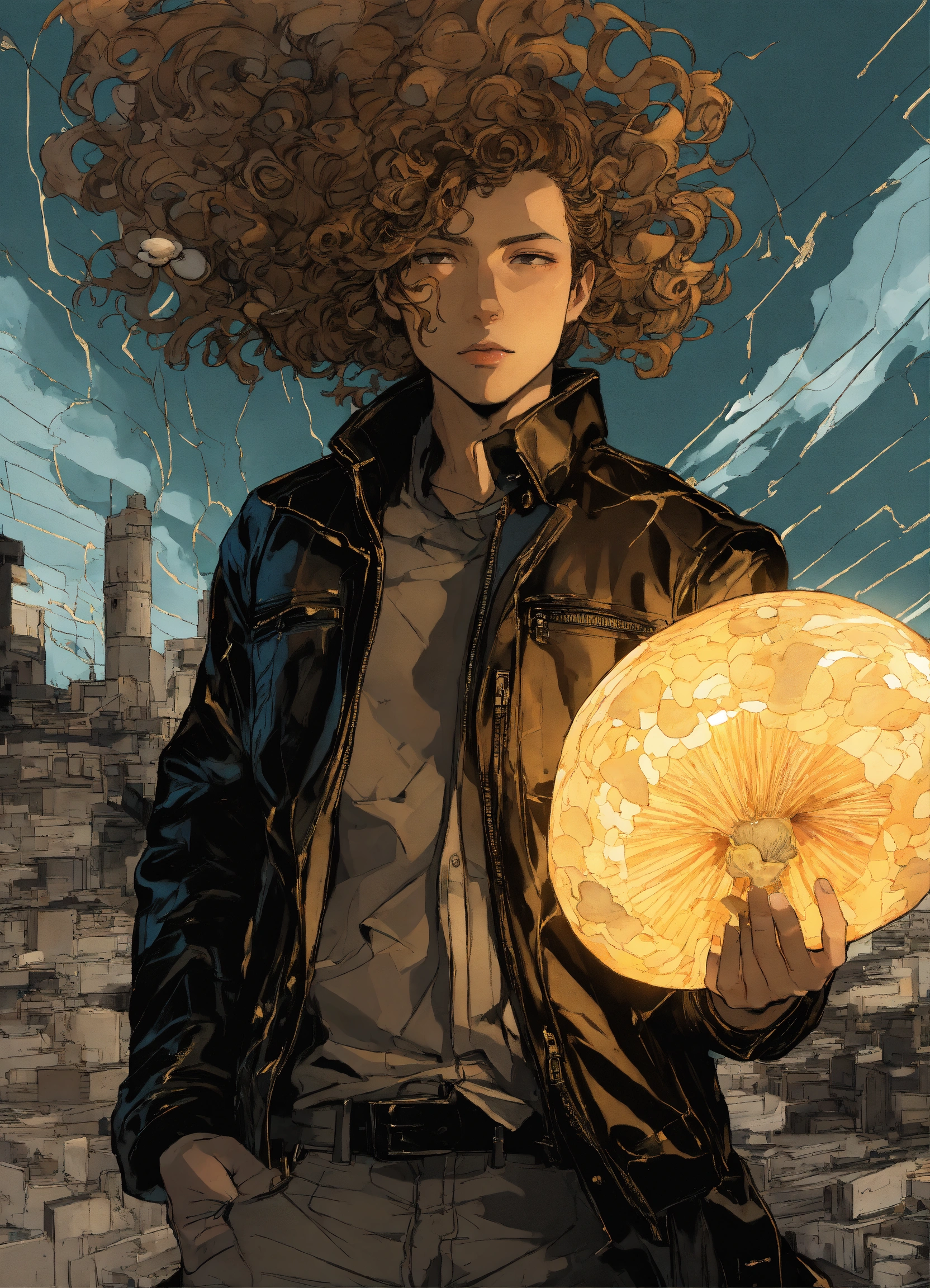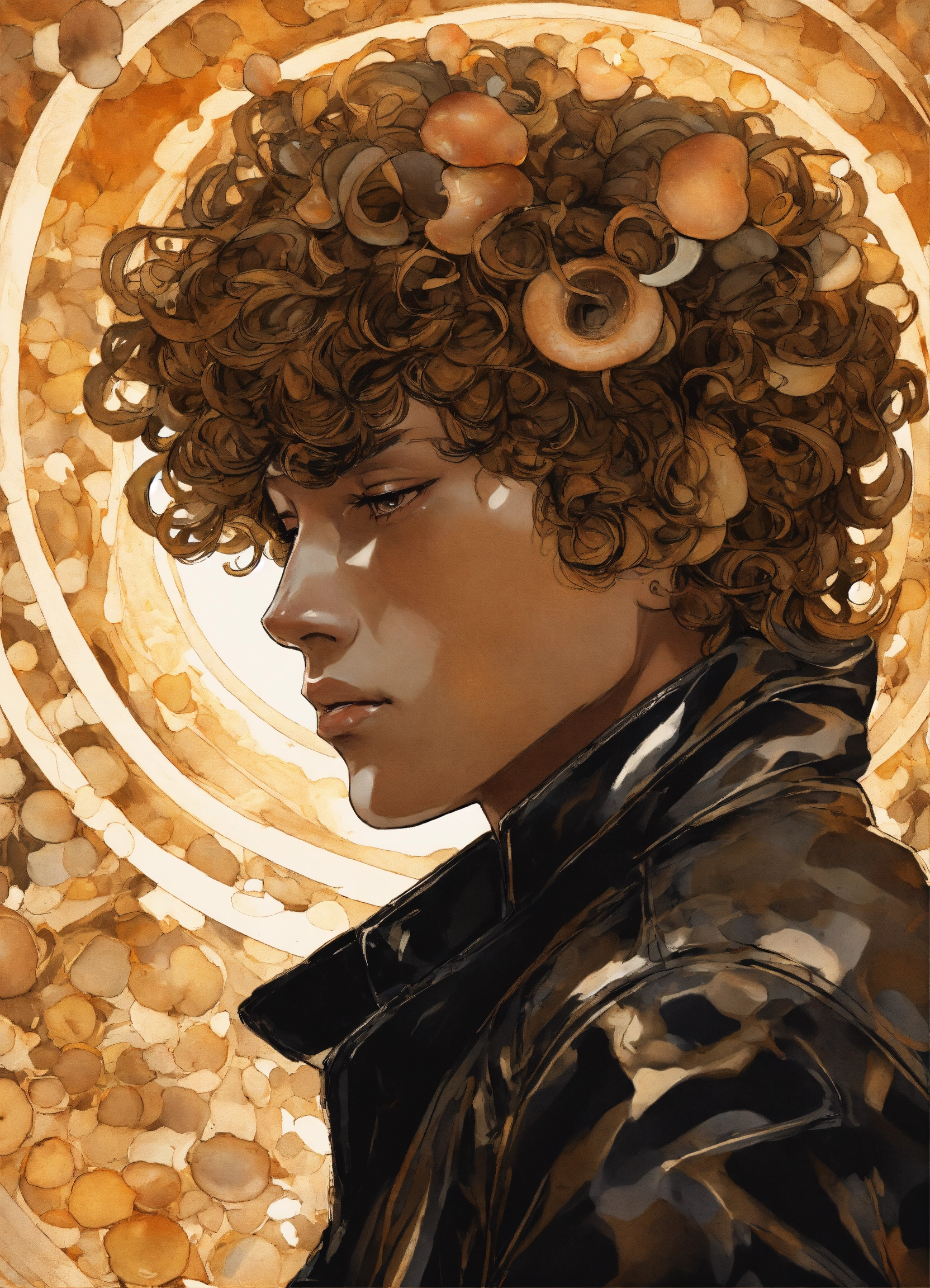 A portrait. a samari curly sandy brown hair in a black leather jacket swirling into the landscape. holding a mushroom the light beams illuminate his face. tessellation, fibonacci sequence, yoji shinkawa, kintsugi, comic book, heavy outline
