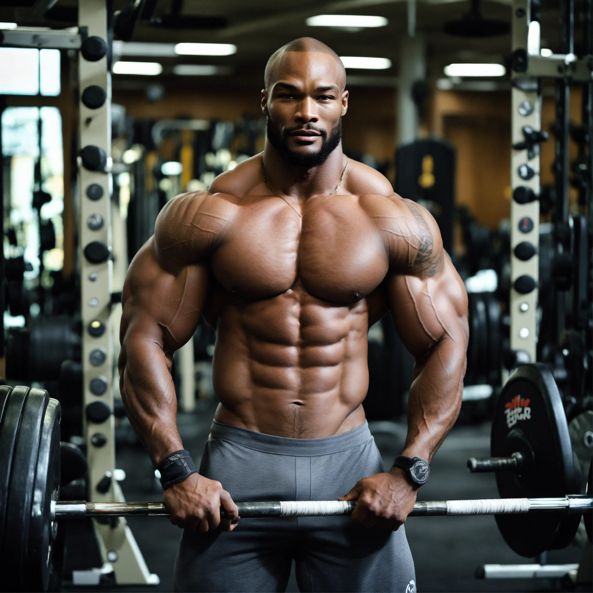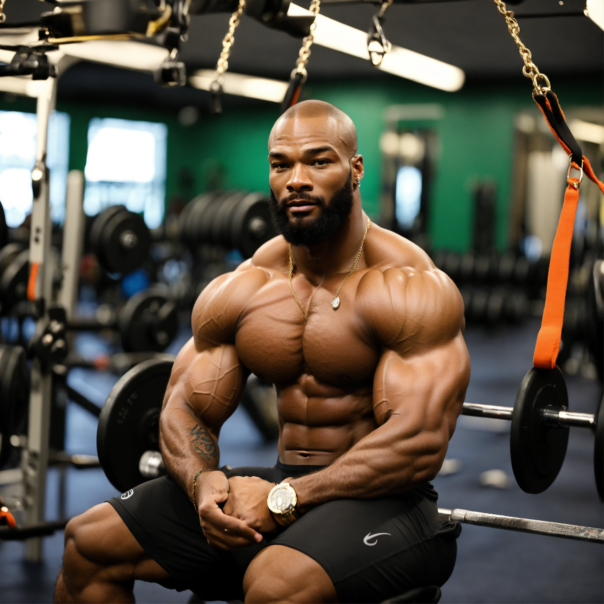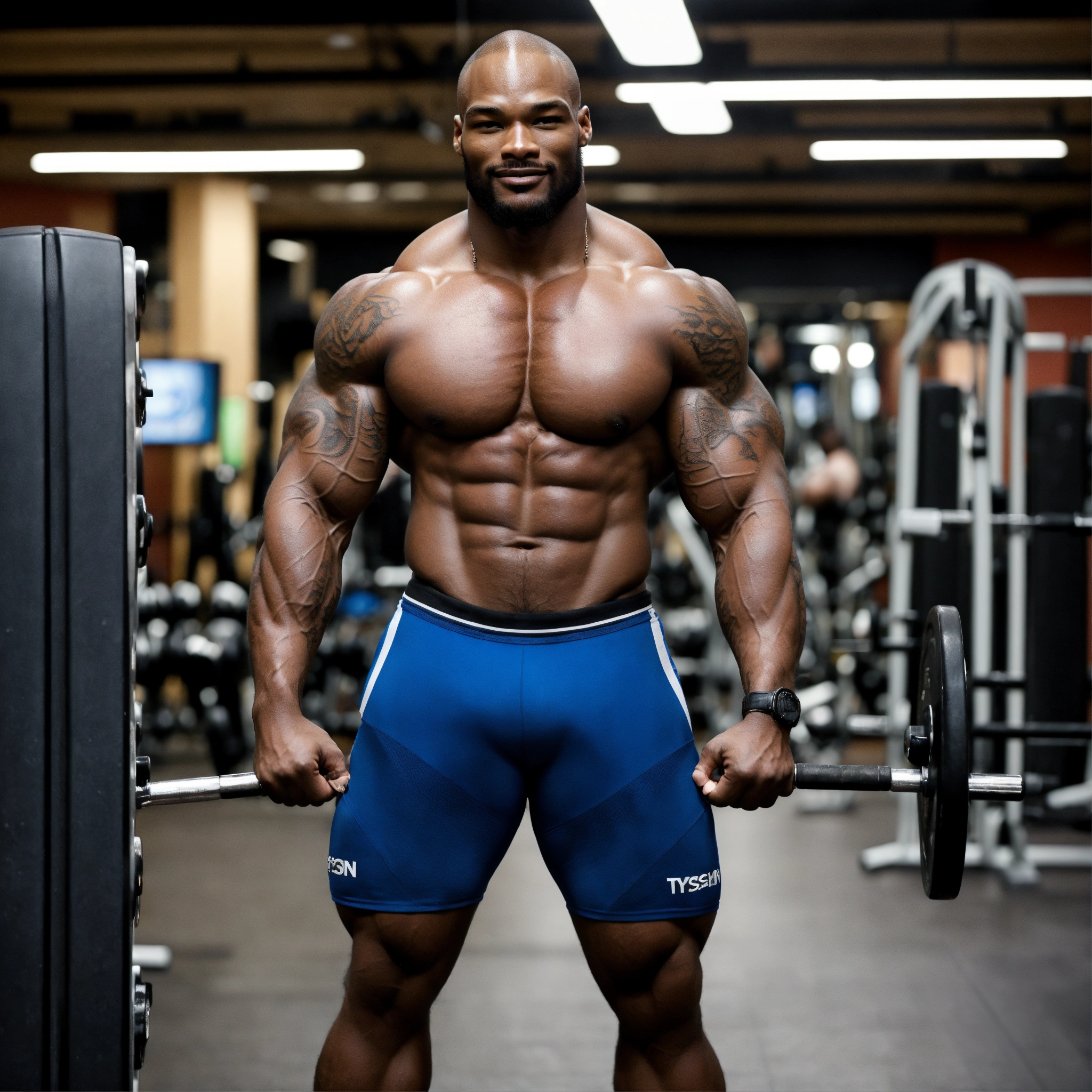 30-year-old hairy man with big muscles, tyson beckford, big bodybuilder, body like a wrestler, at the gym