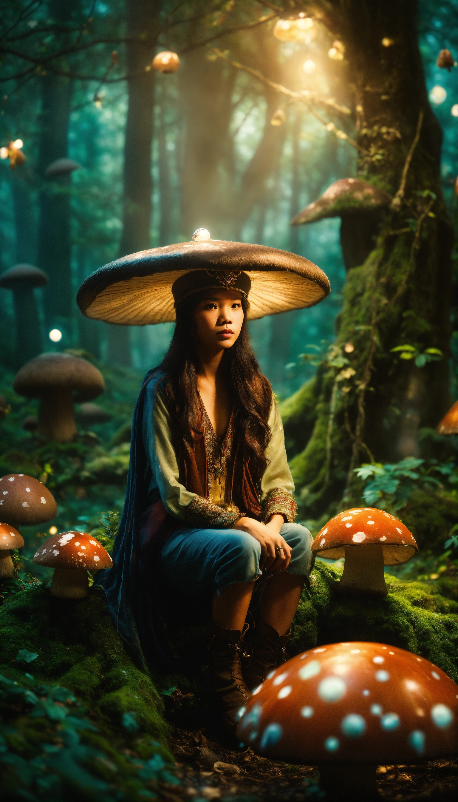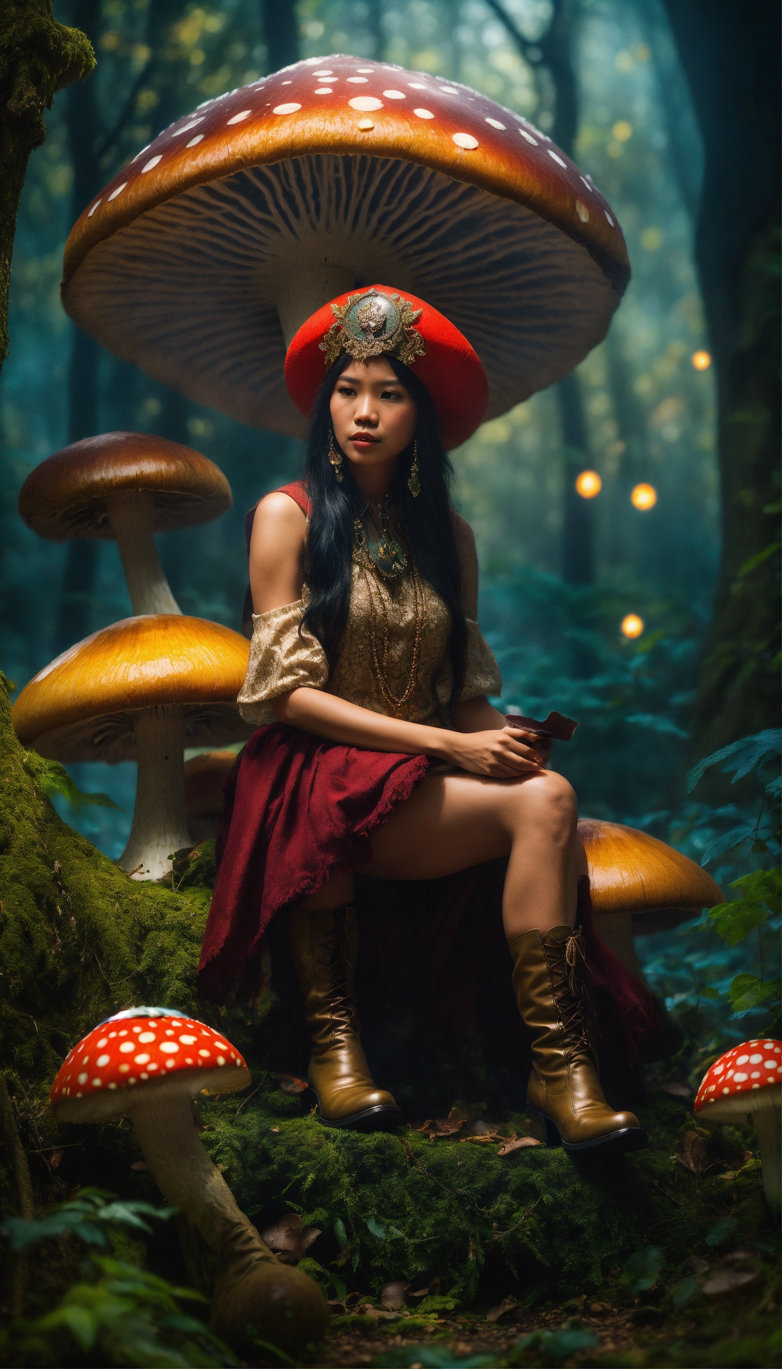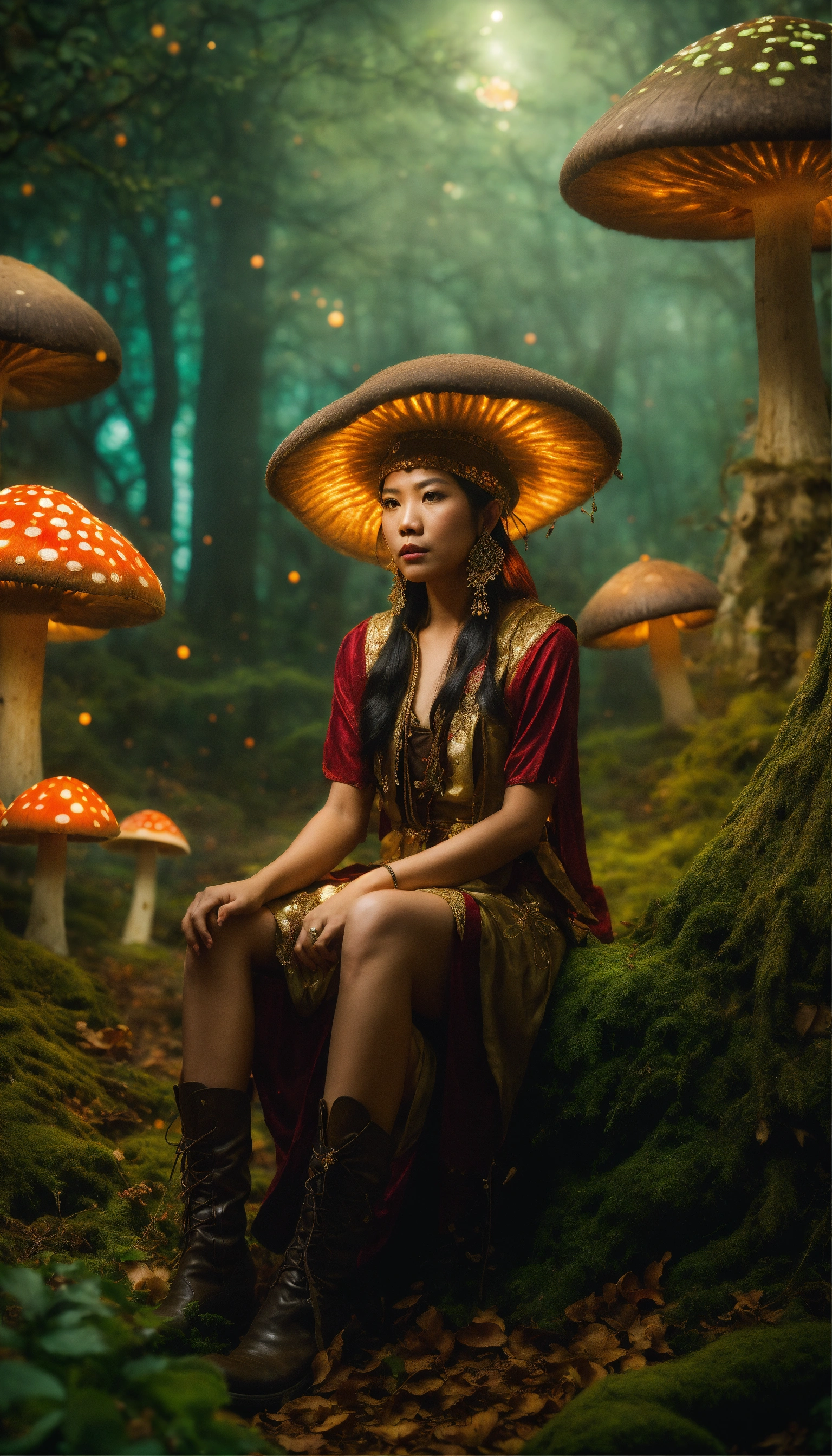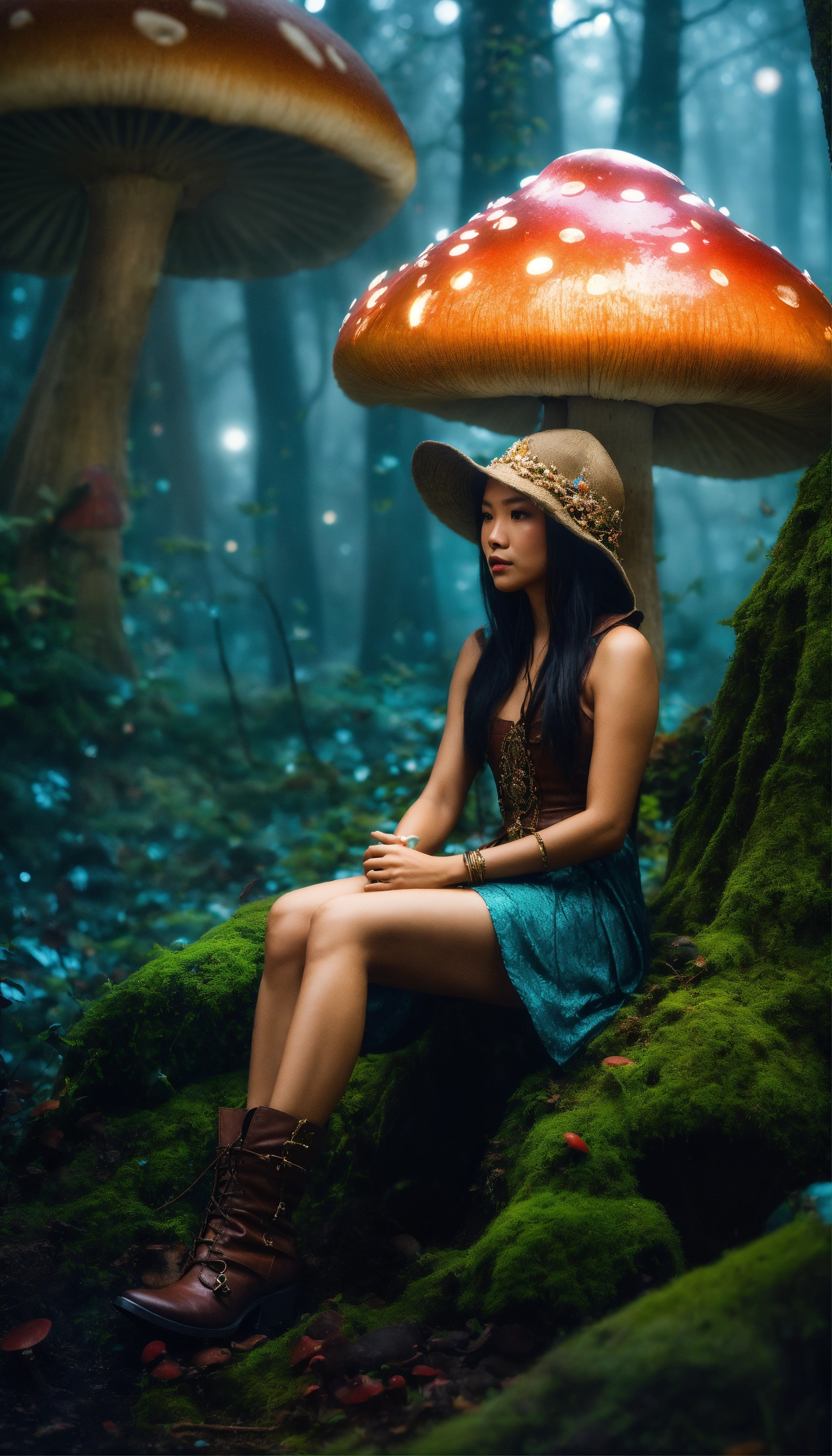 Enchanted tikbalang, wearing a salukot hat, wearing pointed boots, sitting in an enchanted forest, with big mushrooms surrounded the place, night light, foggy weather, intricate, fantasy, with orbs of light, with fairy's on background, trees, and other mythical creature from philippines, cinematic