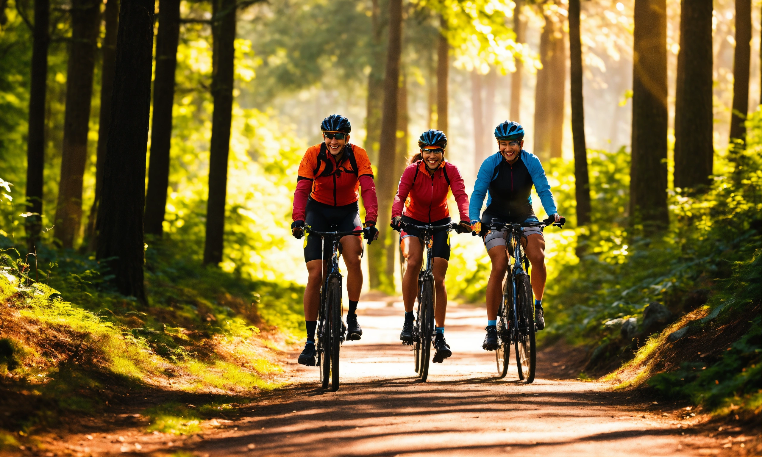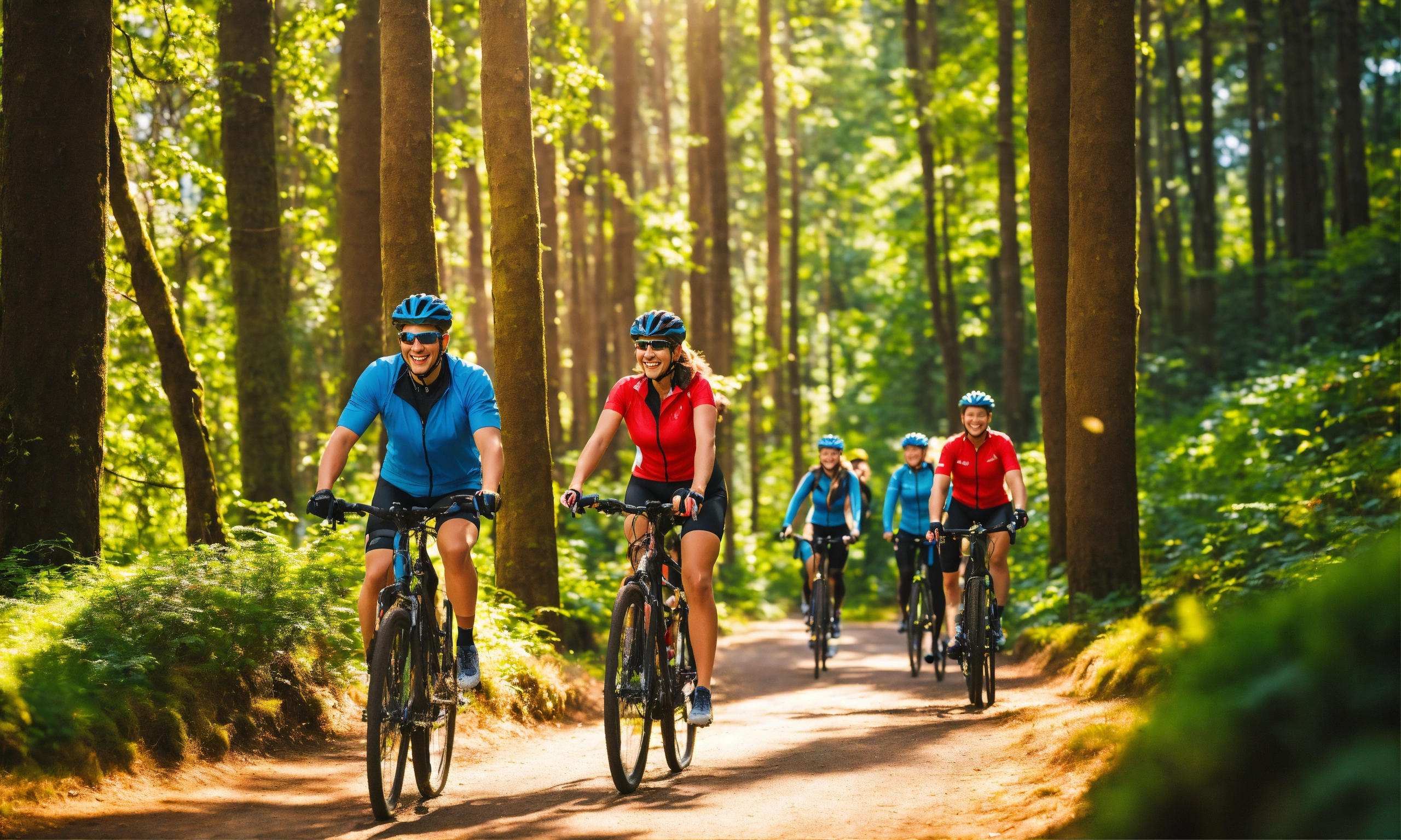 A vibrant candid photo of three men and two women cycling together in a scenic forest. they smile and motivate each other, depicting hard work and teamwork on a sunny day. one woman reaches down to help a friend up. the photo captures the essence of community and perseverance.