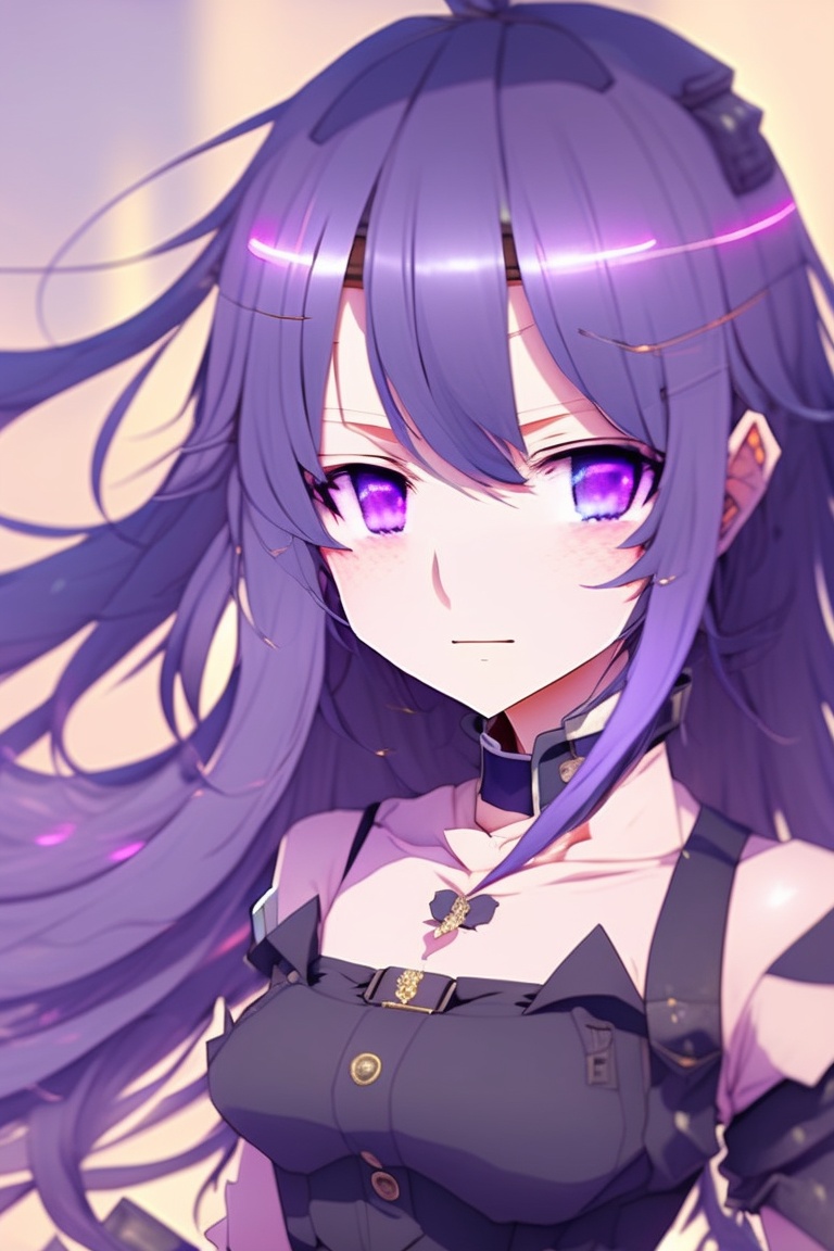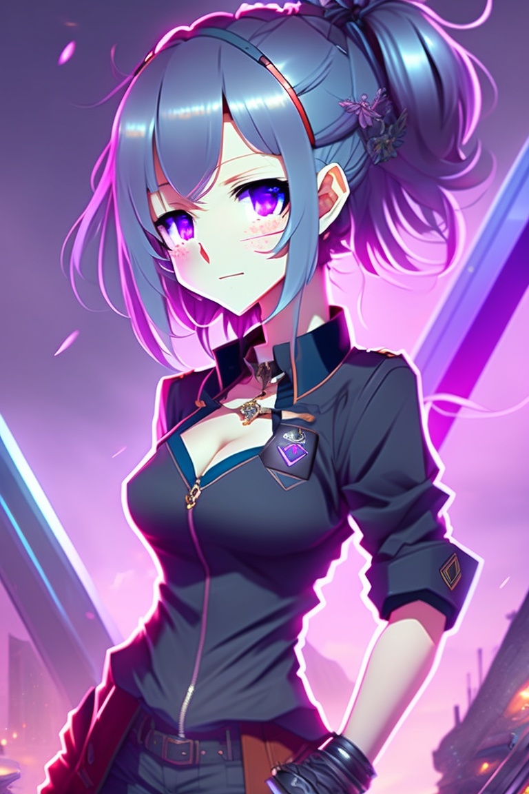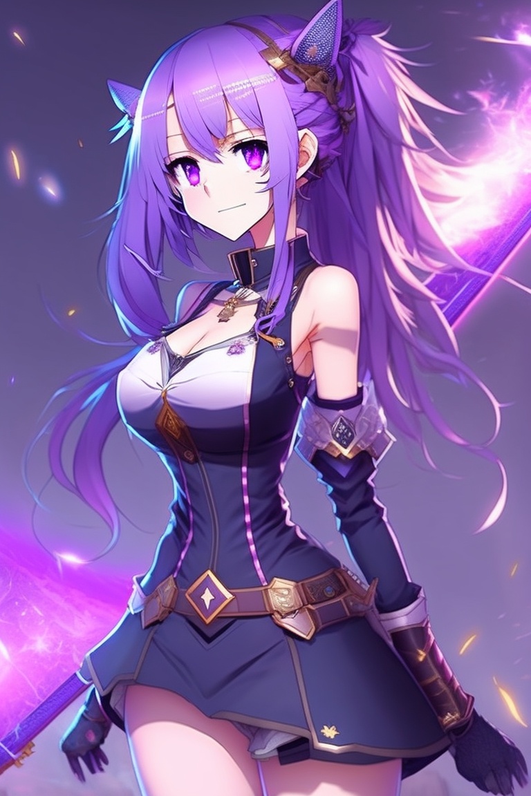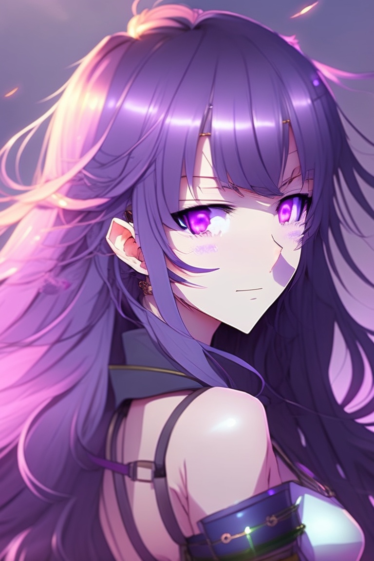 A anime girl with bright purple eyes and a sinister smile. make a girl in a certain pose with a saw, while the graphics should be in anime style. should be drunk