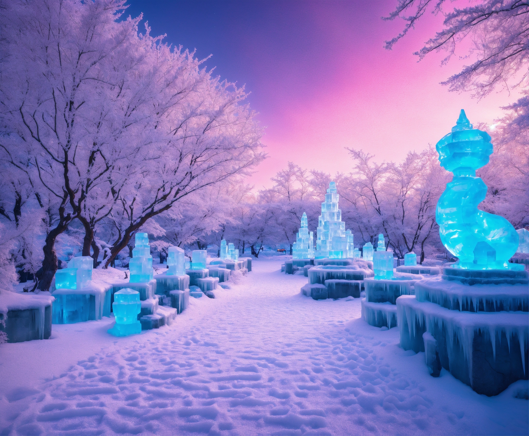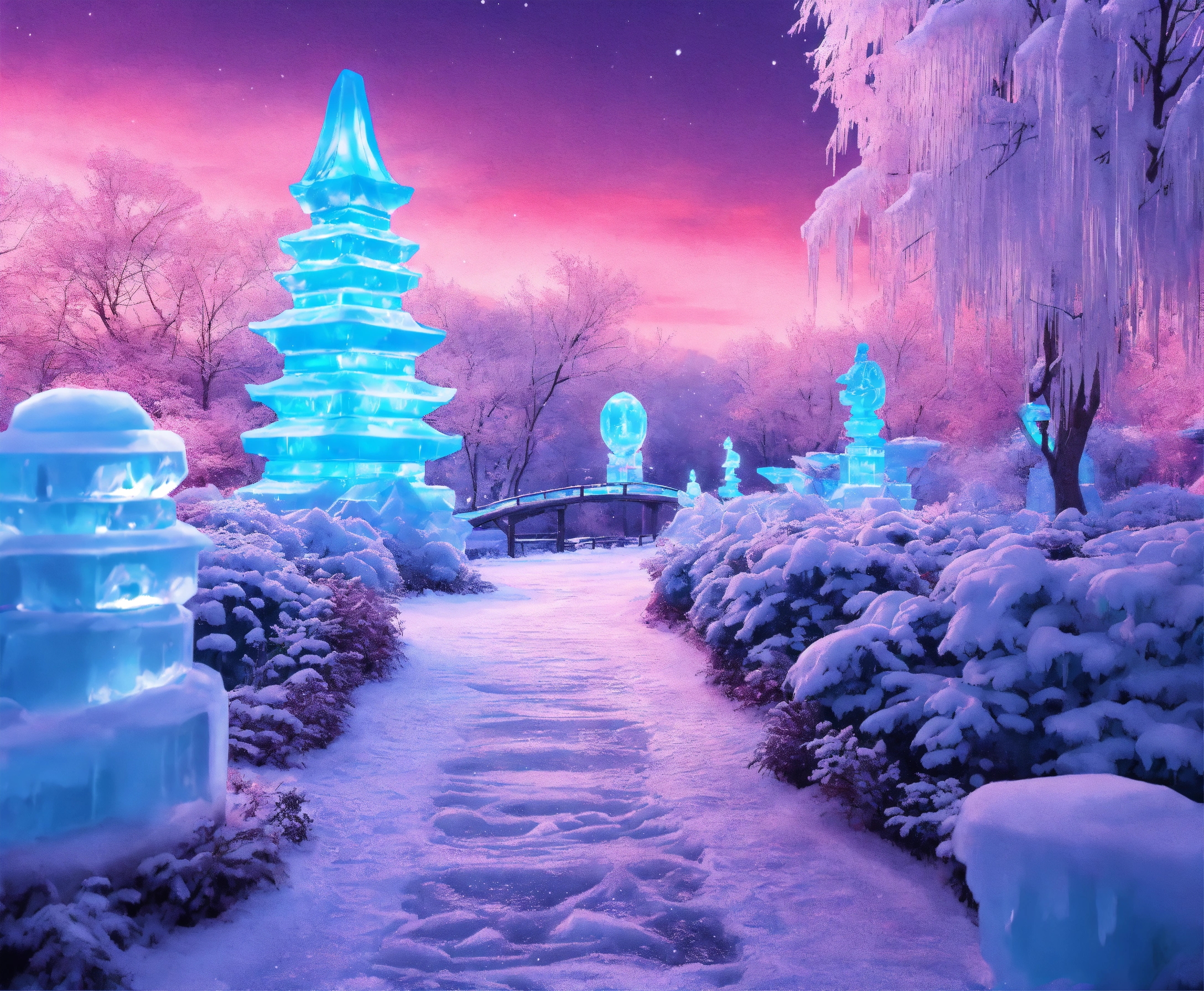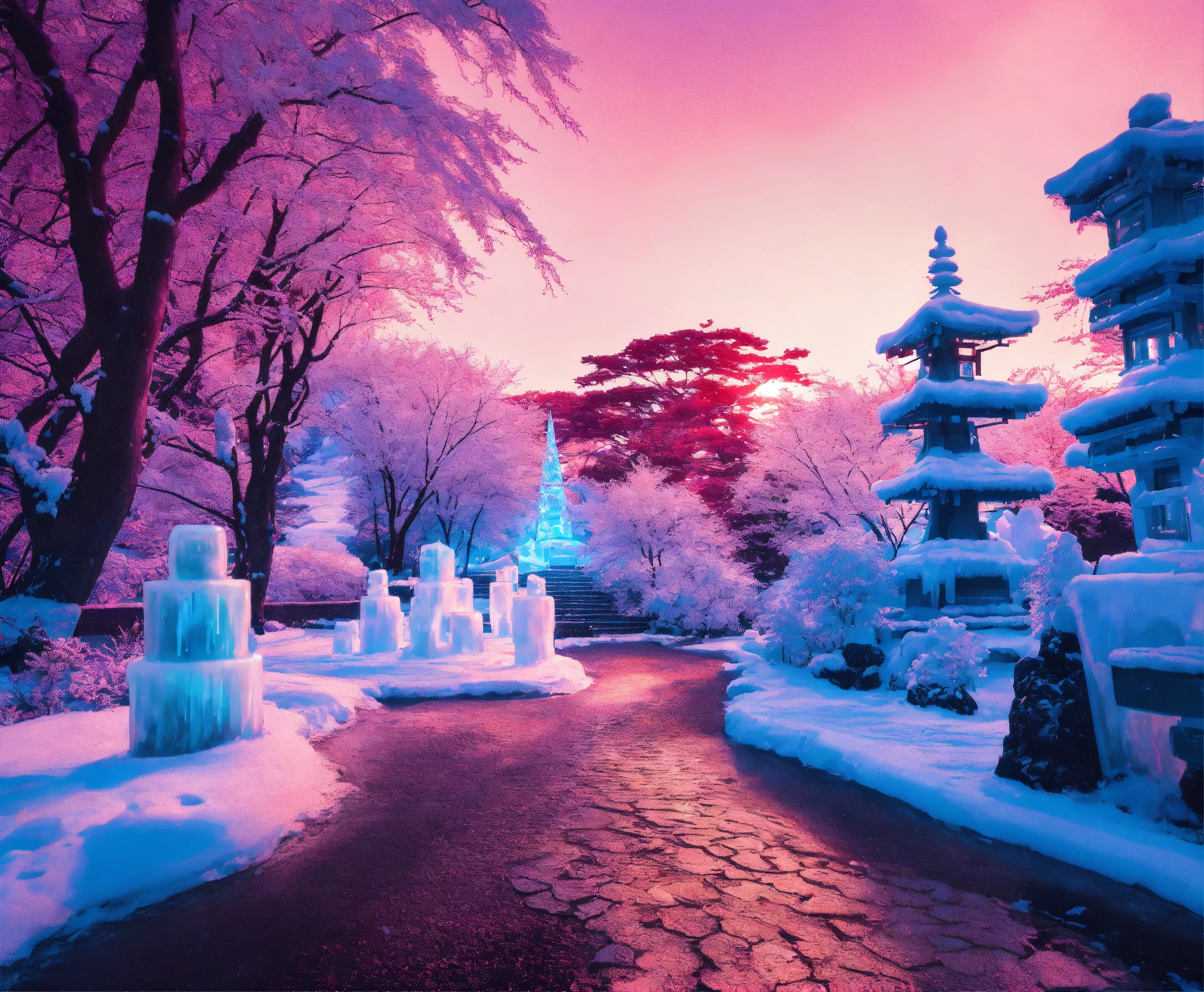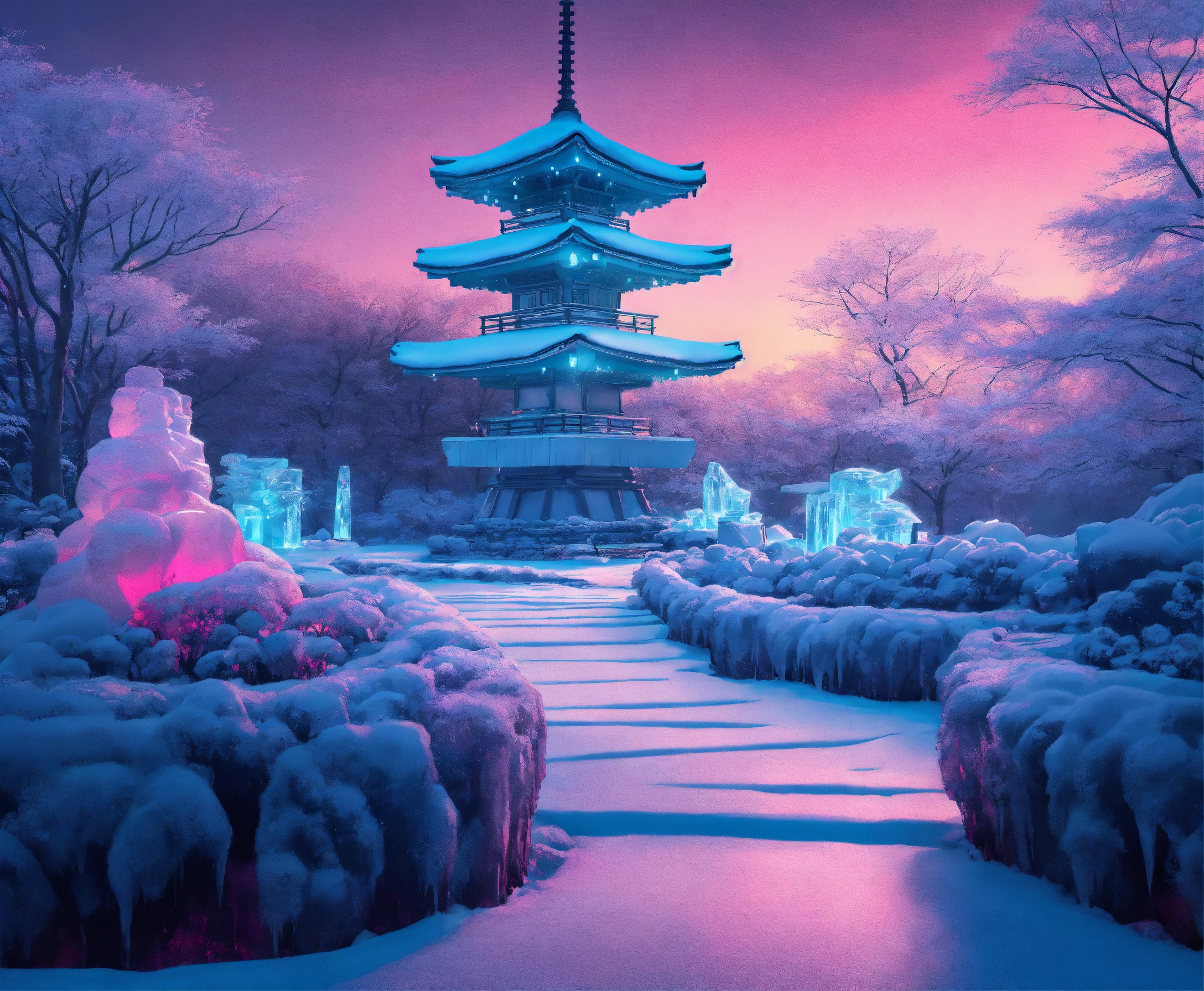 Path with ice statues in a winter magical ice world japan garden in synthwave style