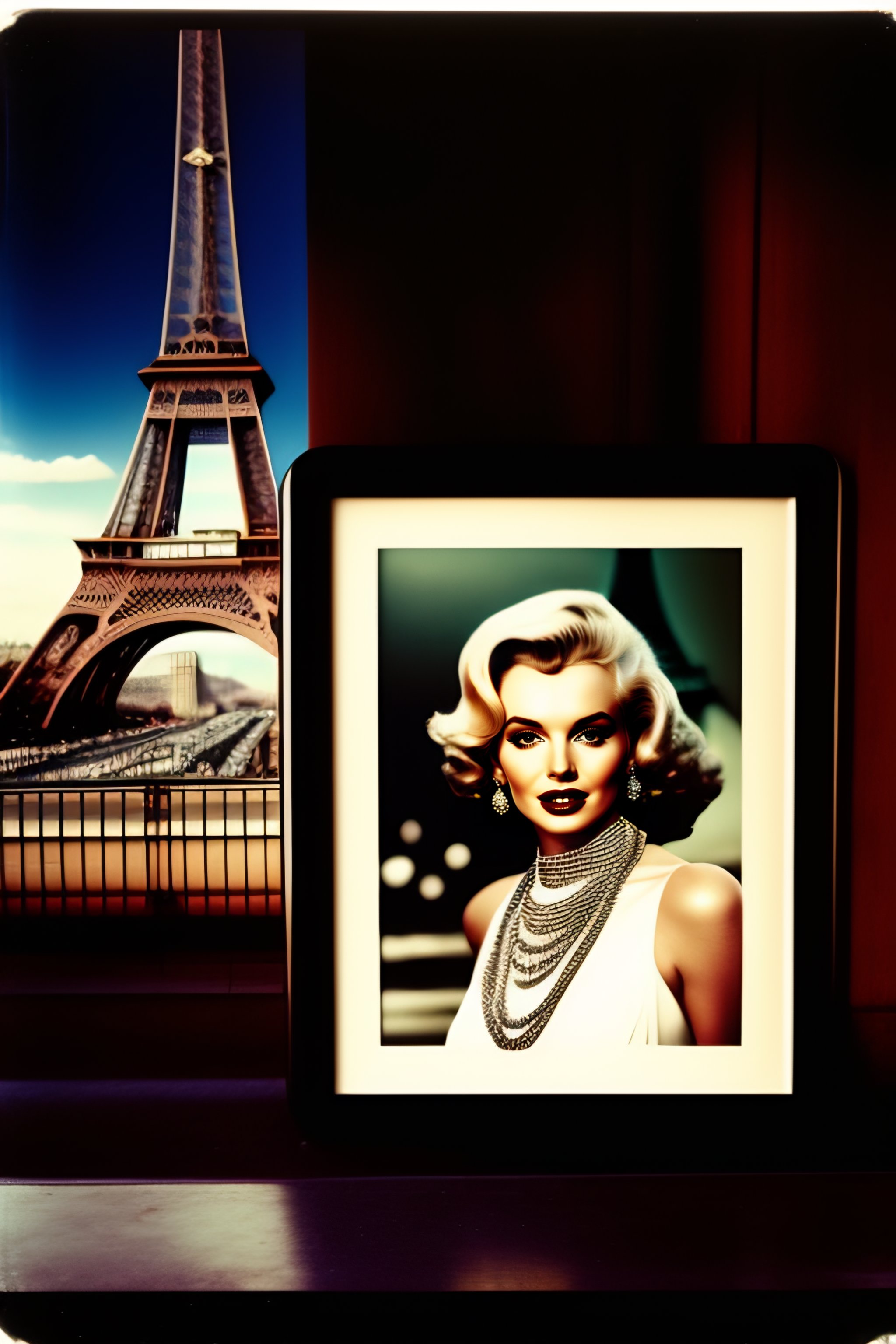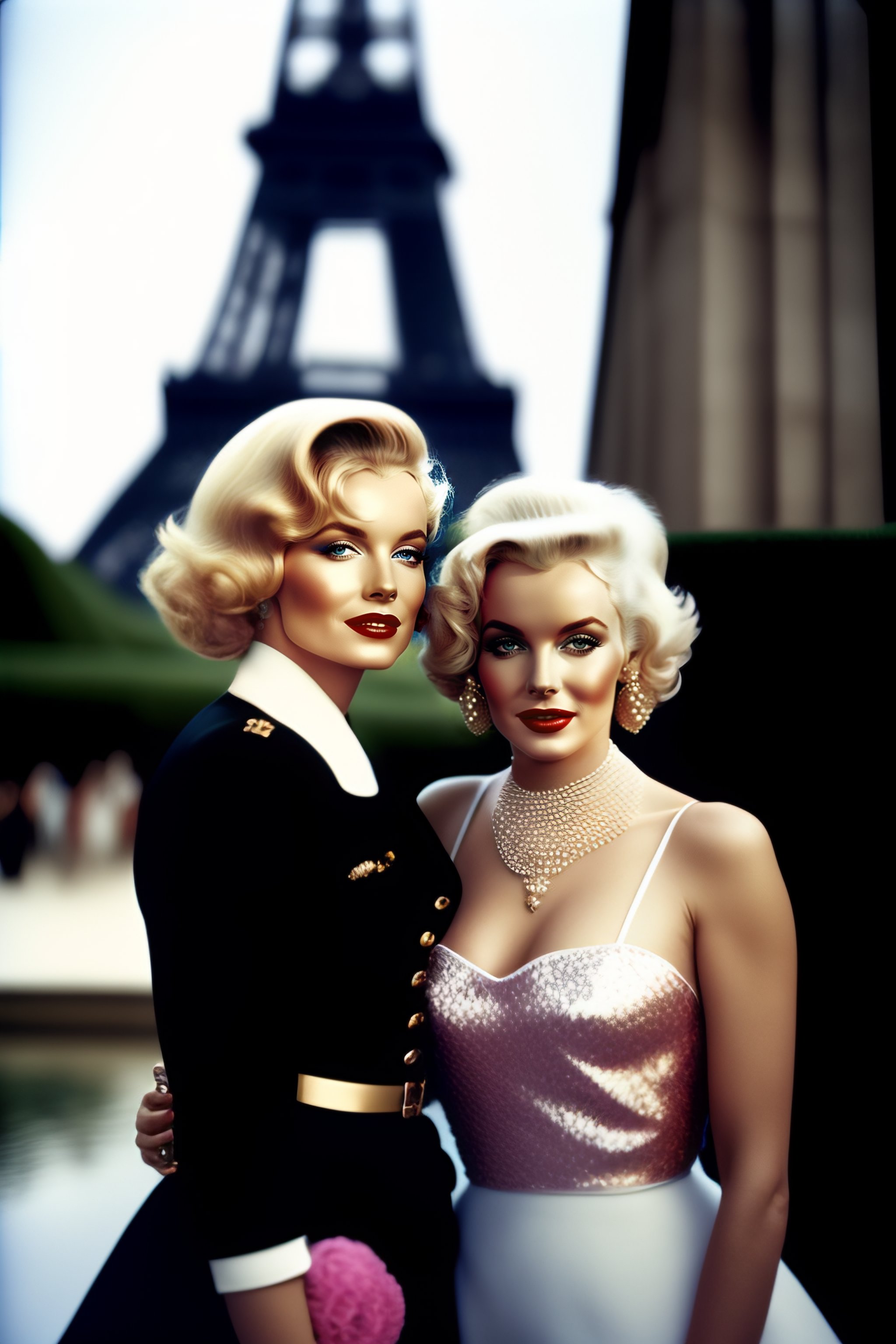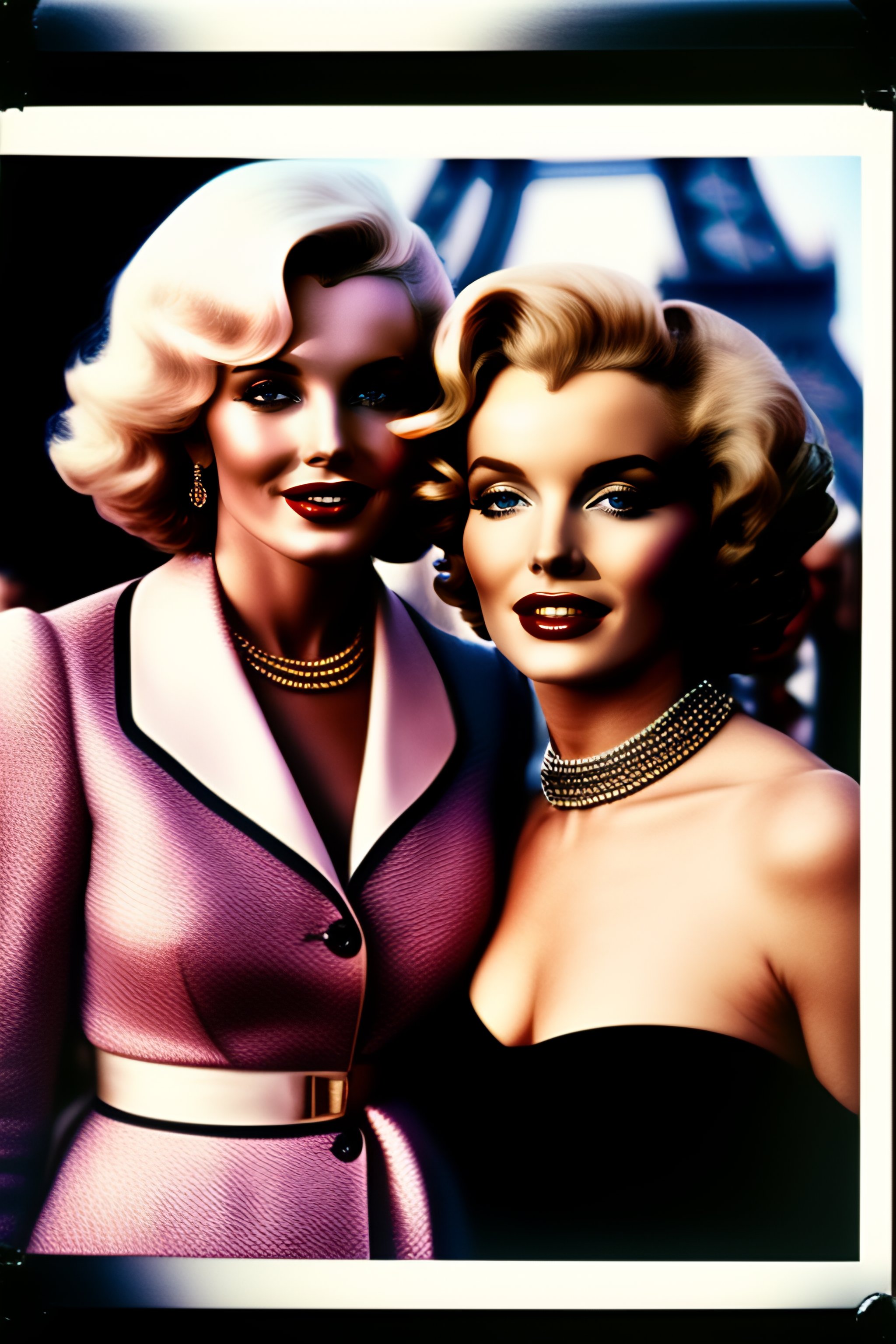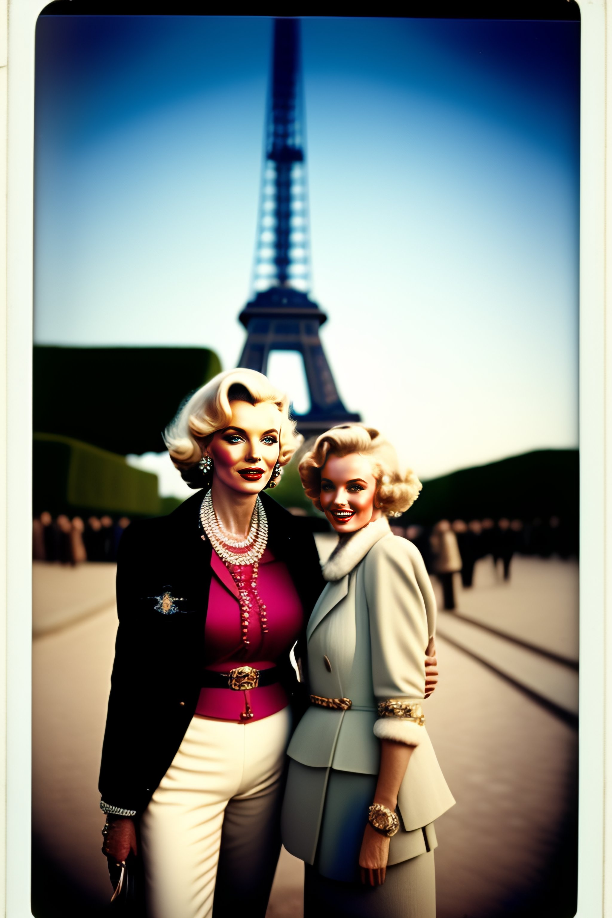 Portrait of marylin monroe posing with coco chanel in front of the eiffel tower in paris, color polaroid, historic photo